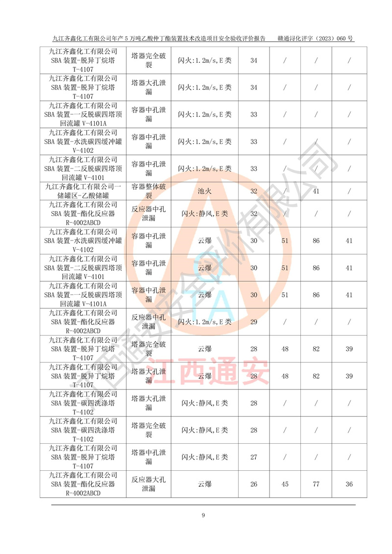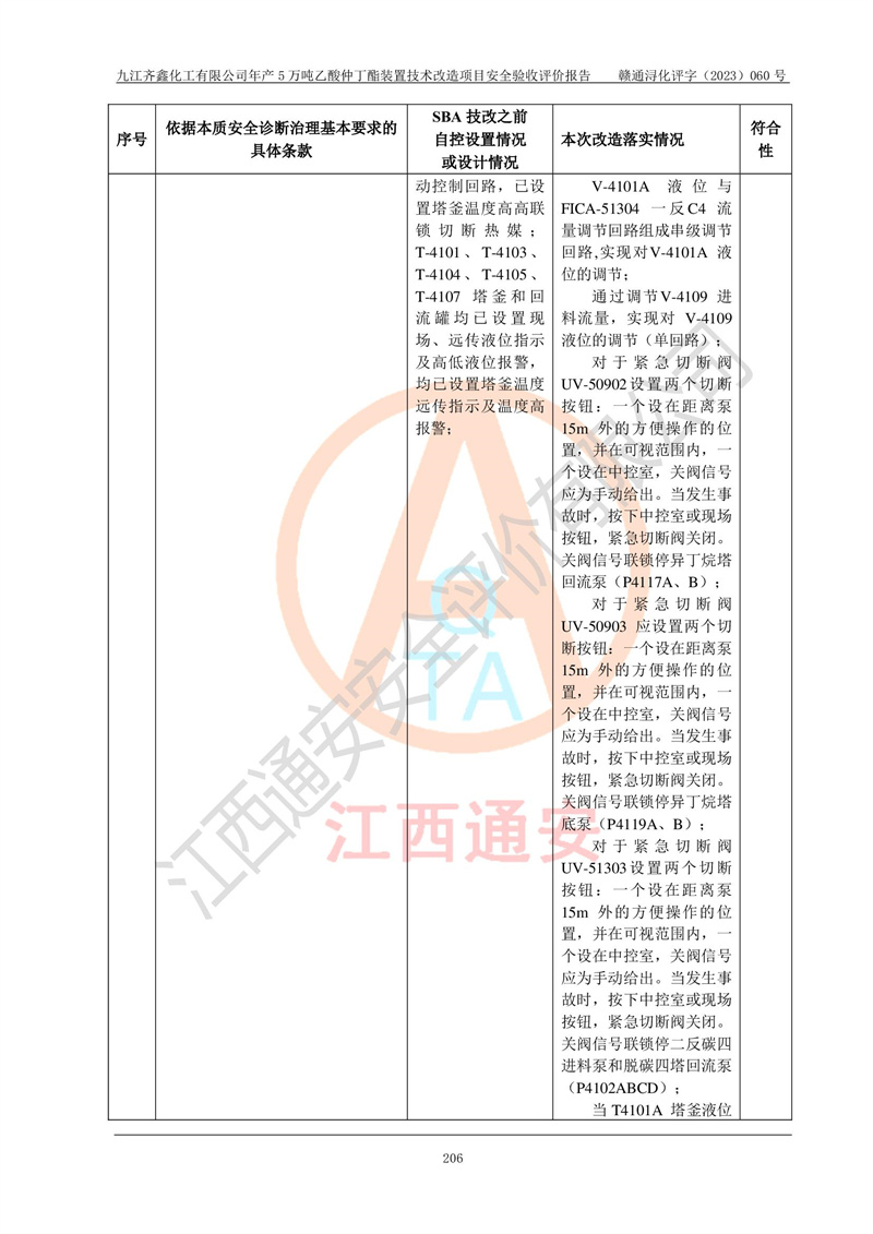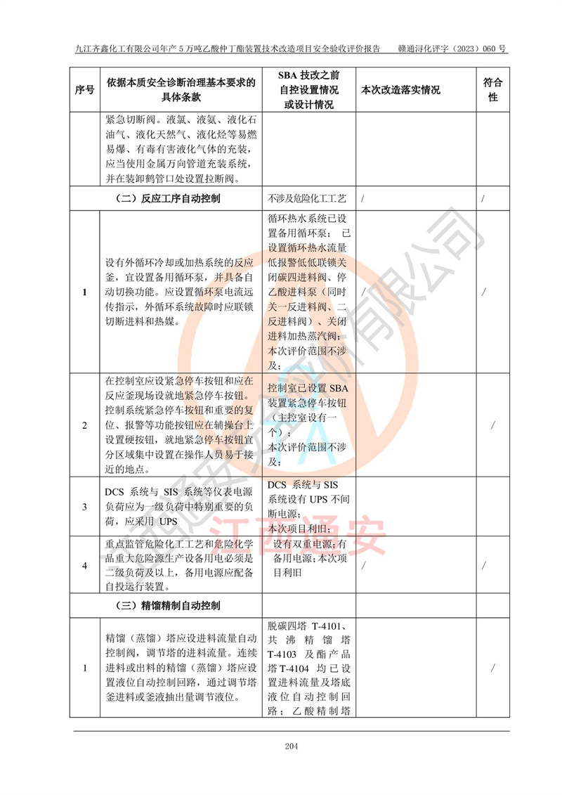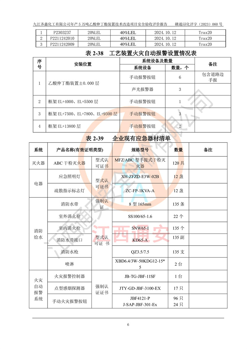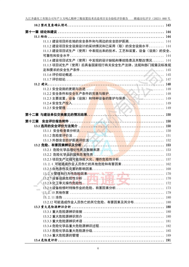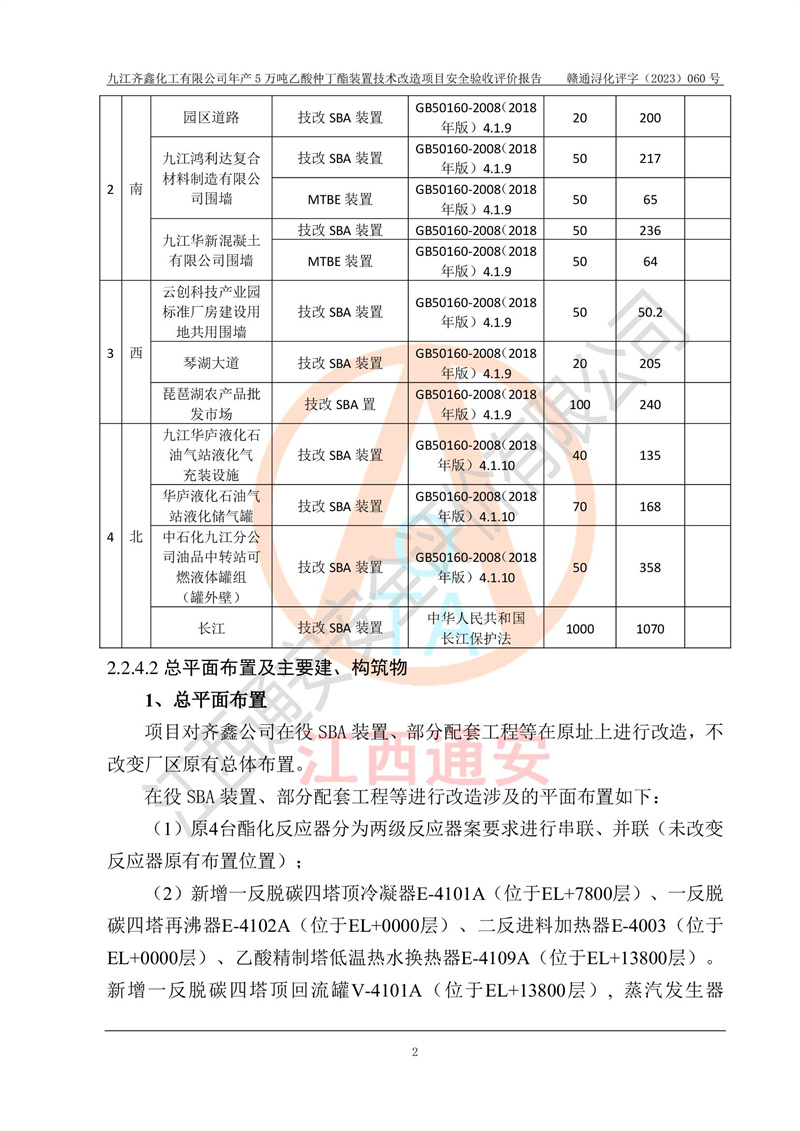 評(píng)價(jià)報(bào)告名稱 | 九江齊鑫化工有限公司年產(chǎn)5萬噸乙酸仲丁酯裝置技術(shù)改造項(xiàng)目安全驗(yàn)收評(píng)價(jià)報(bào)告 | ||||