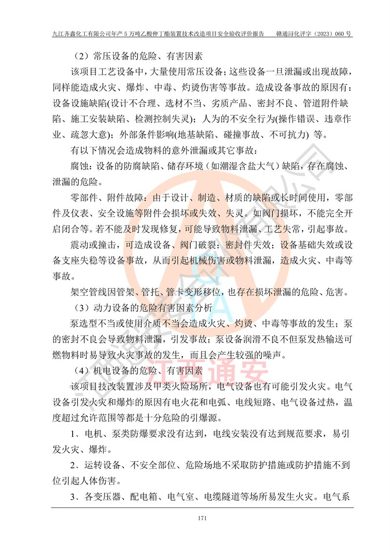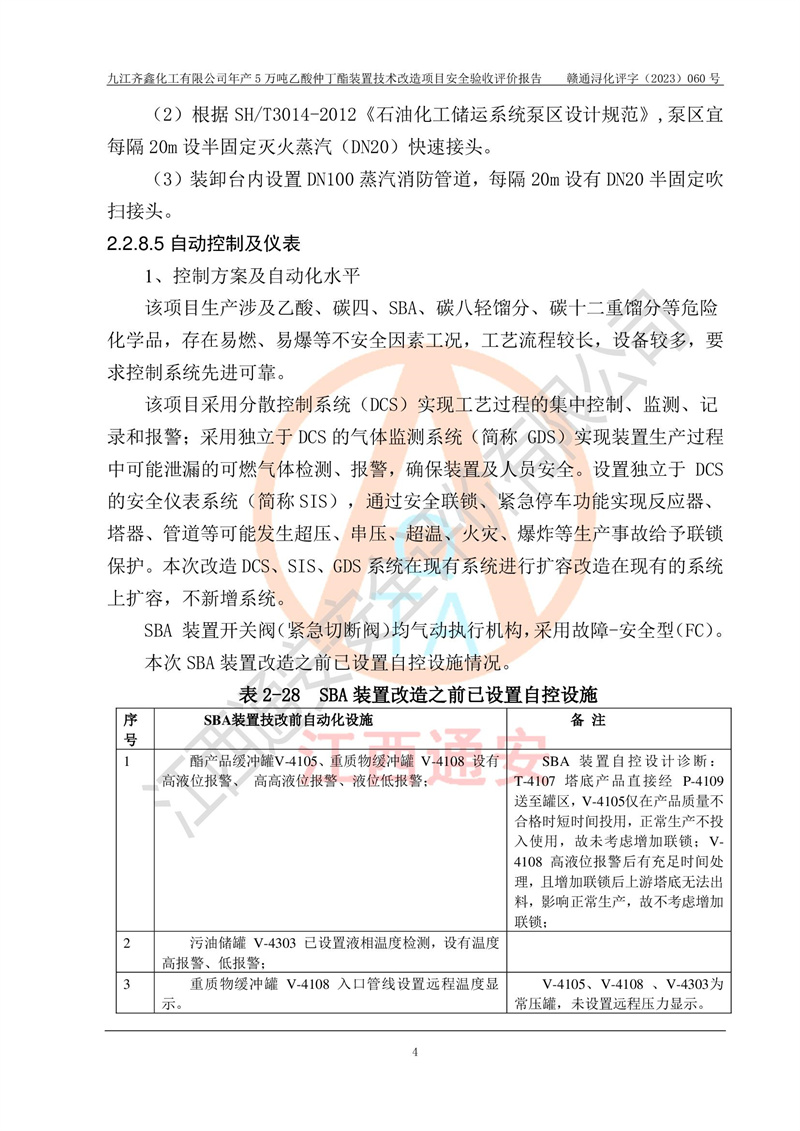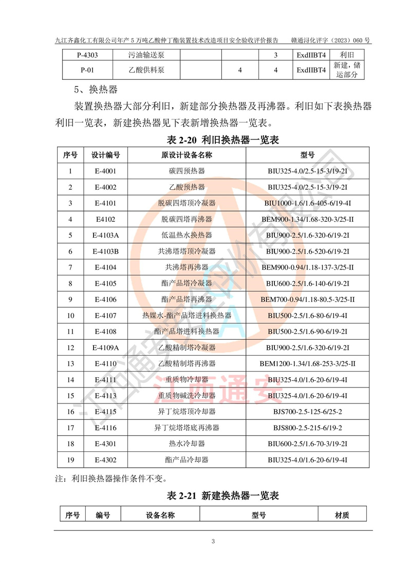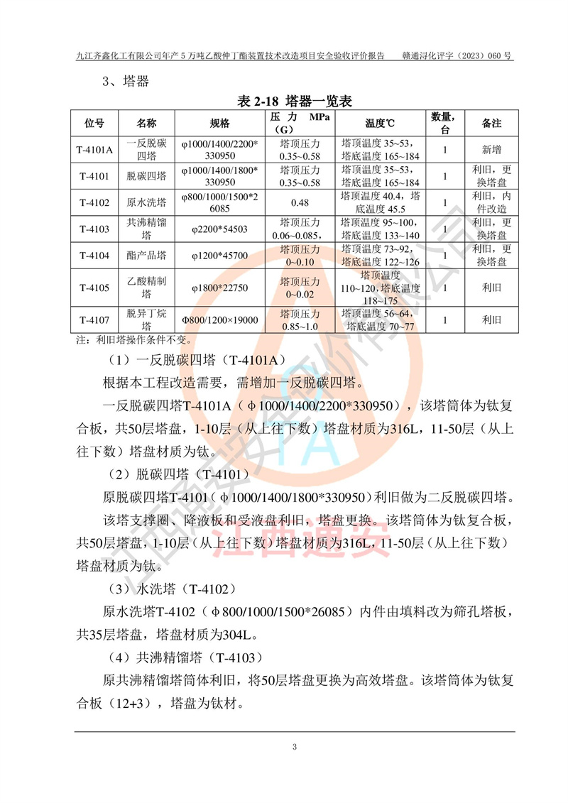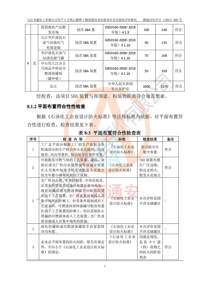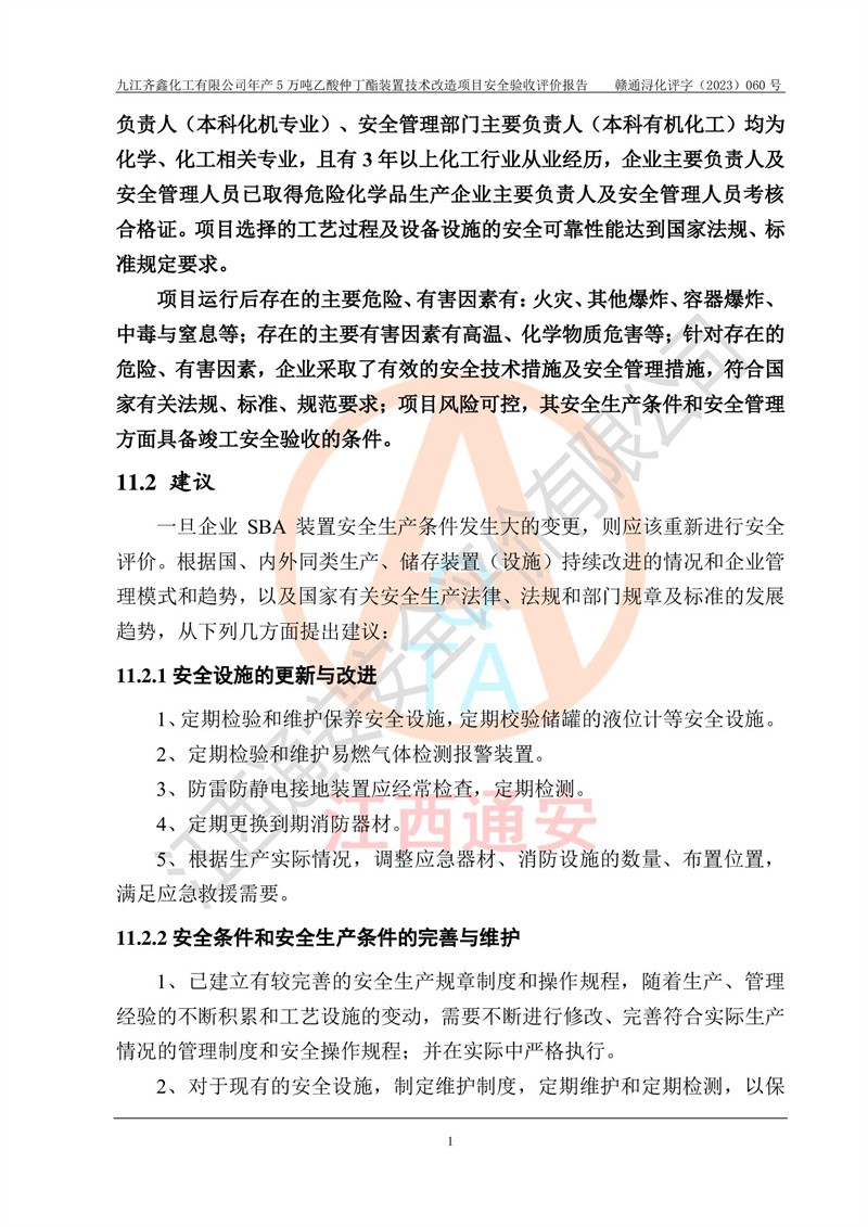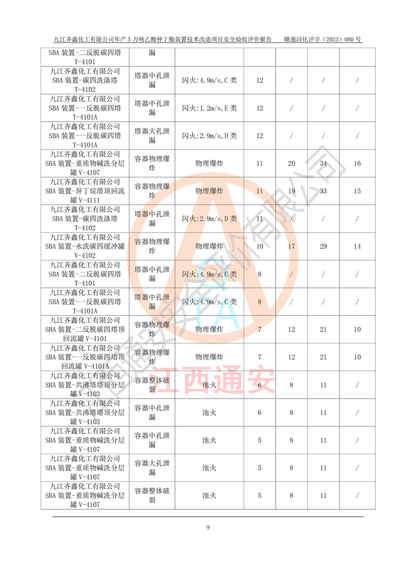 評(píng)價(jià)報(bào)告名稱 | 九江齊鑫化工有限公司年產(chǎn)5萬噸乙酸仲丁酯裝置技術(shù)改造項(xiàng)目安全驗(yàn)收評(píng)價(jià)報(bào)告 | ||||