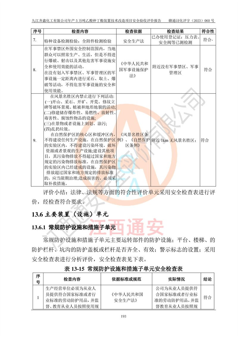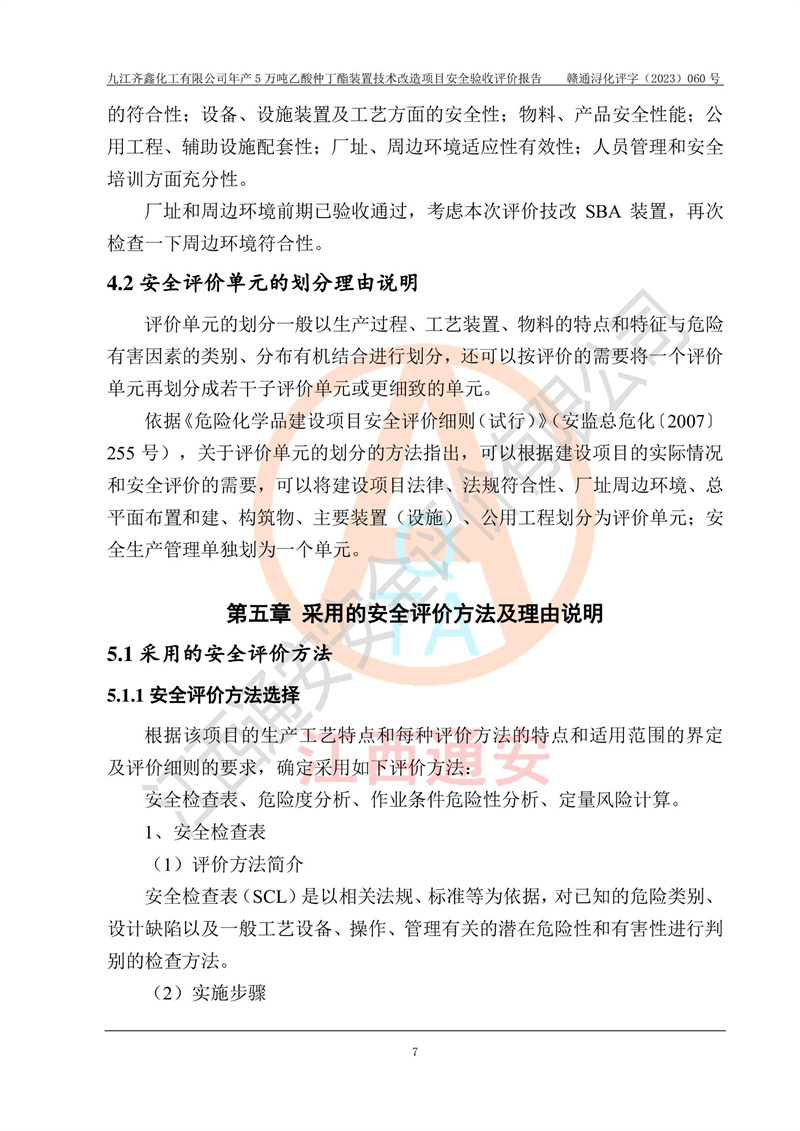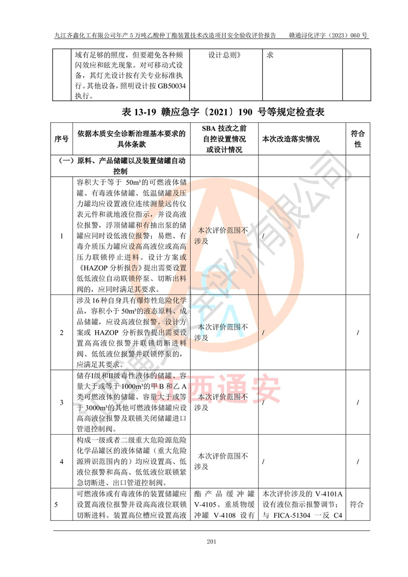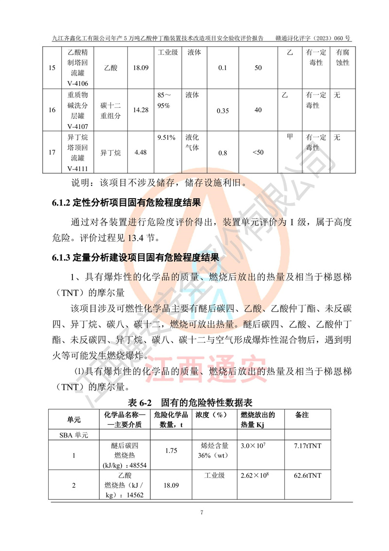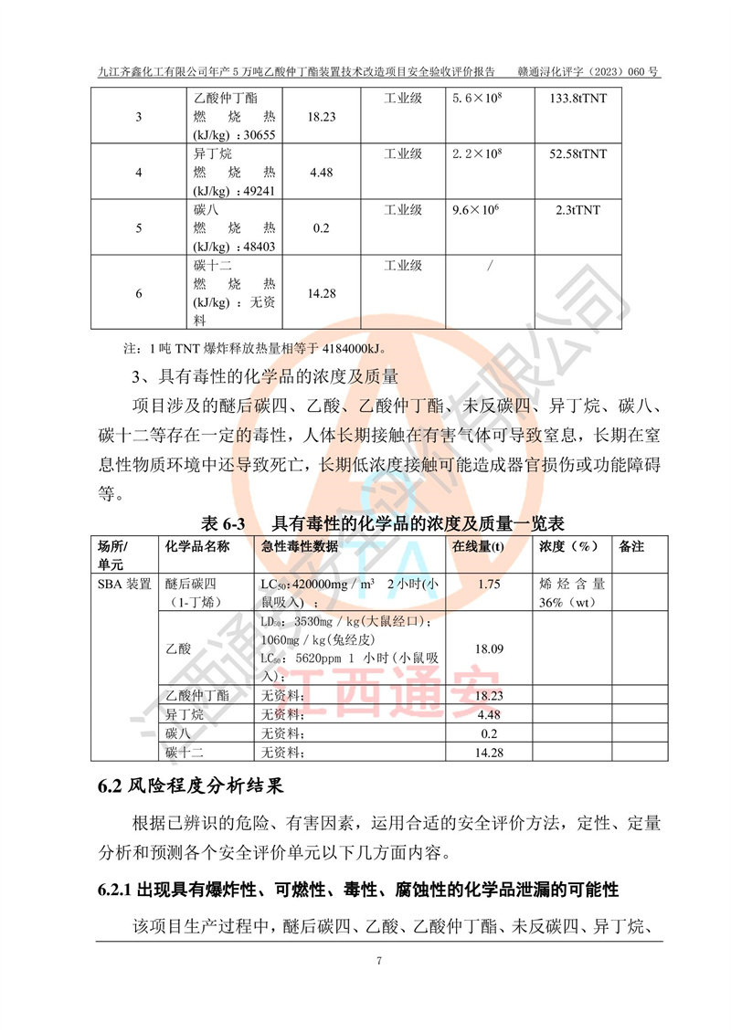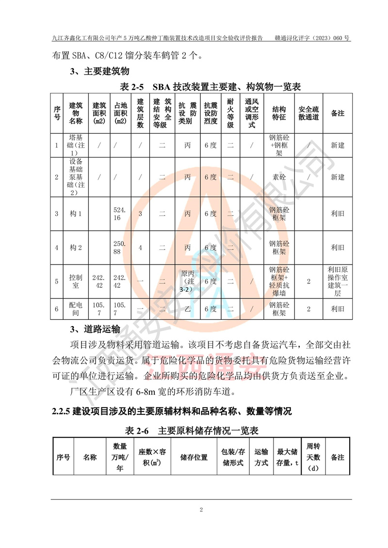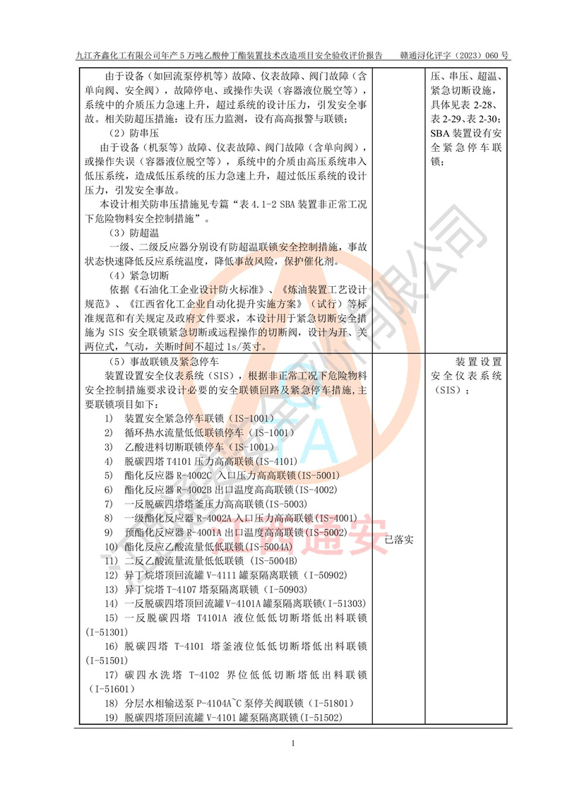 評(píng)價(jià)報(bào)告名稱 | 九江齊鑫化工有限公司年產(chǎn)5萬噸乙酸仲丁酯裝置技術(shù)改造項(xiàng)目安全驗(yàn)收評(píng)價(jià)報(bào)告 | ||||
