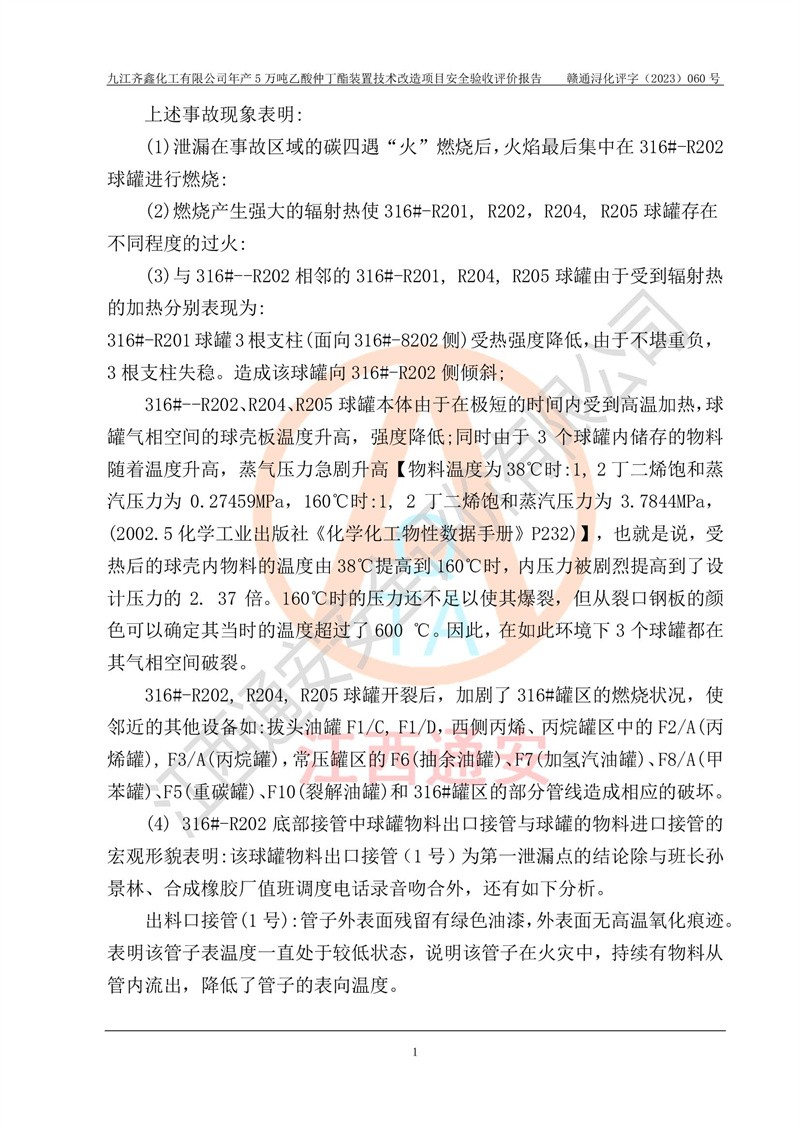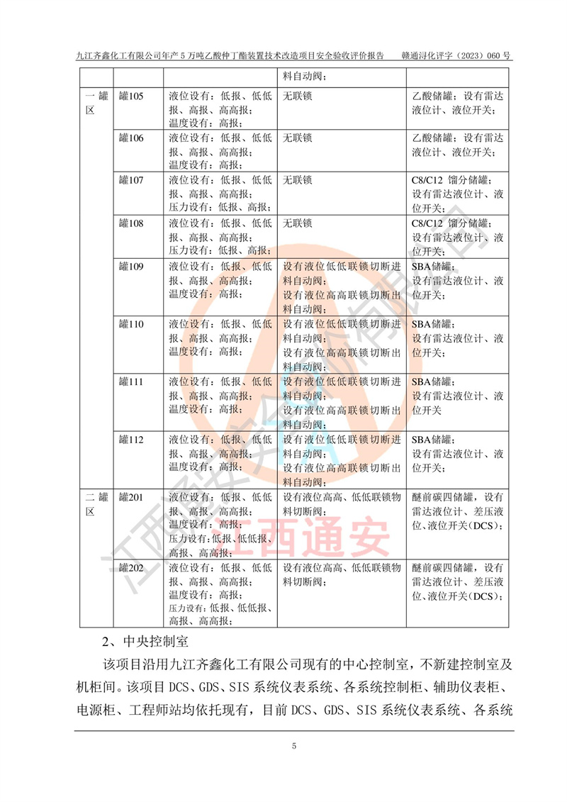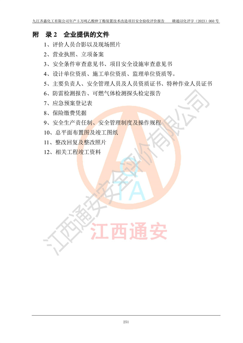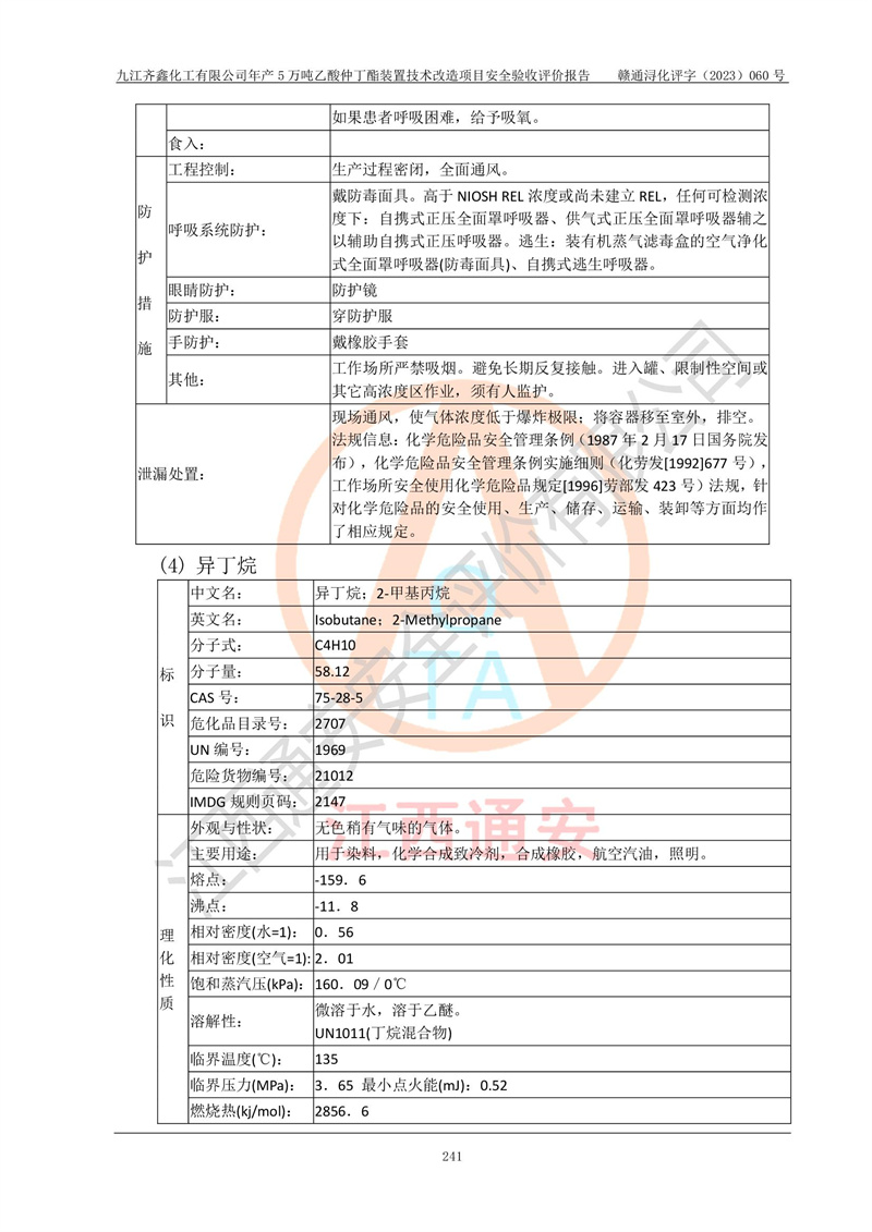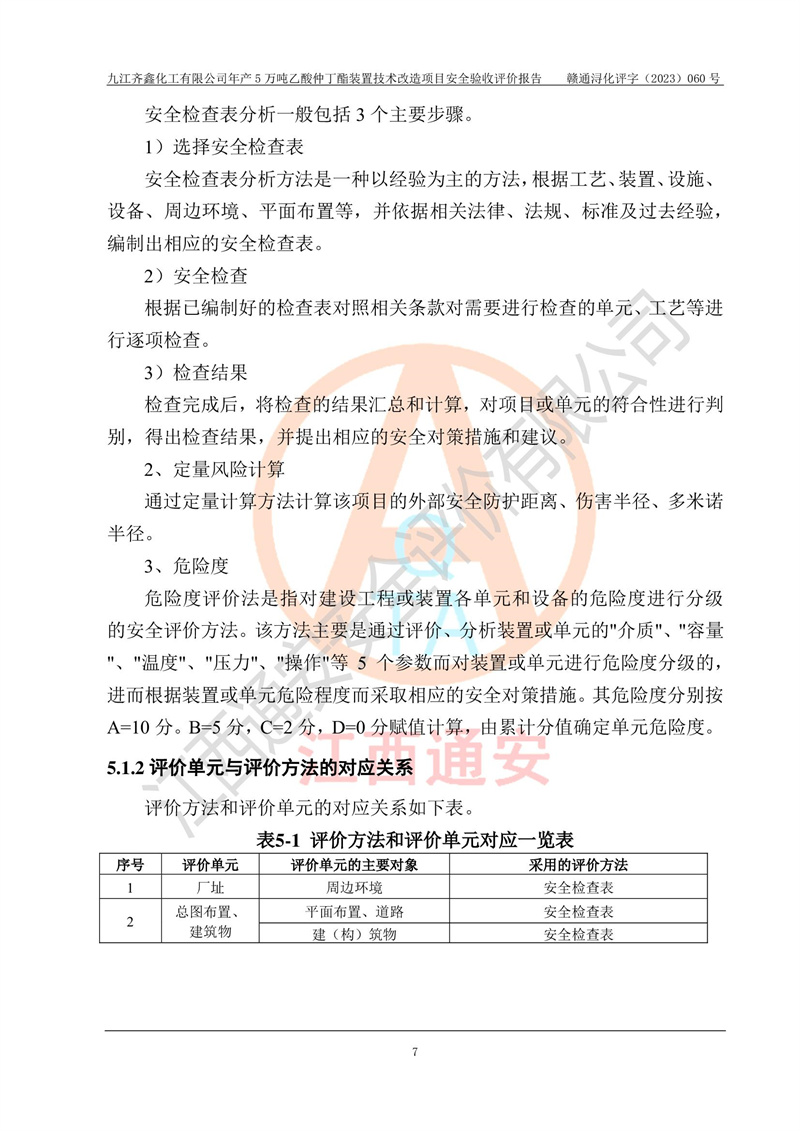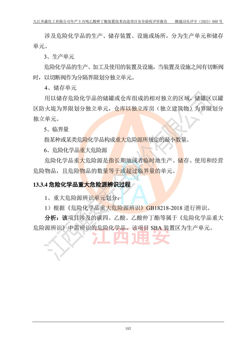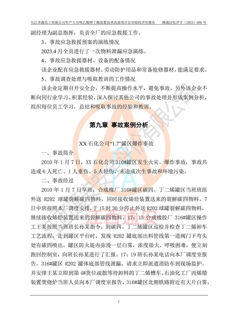 評(píng)價(jià)報(bào)告名稱 | 九江齊鑫化工有限公司年產(chǎn)5萬噸乙酸仲丁酯裝置技術(shù)改造項(xiàng)目安全驗(yàn)收評(píng)價(jià)報(bào)告 | ||||
