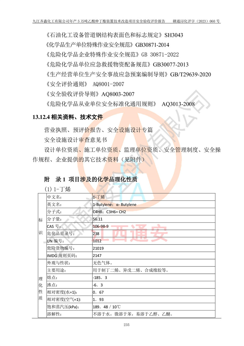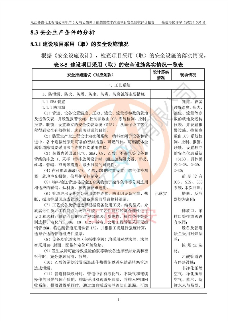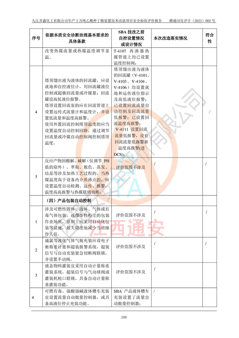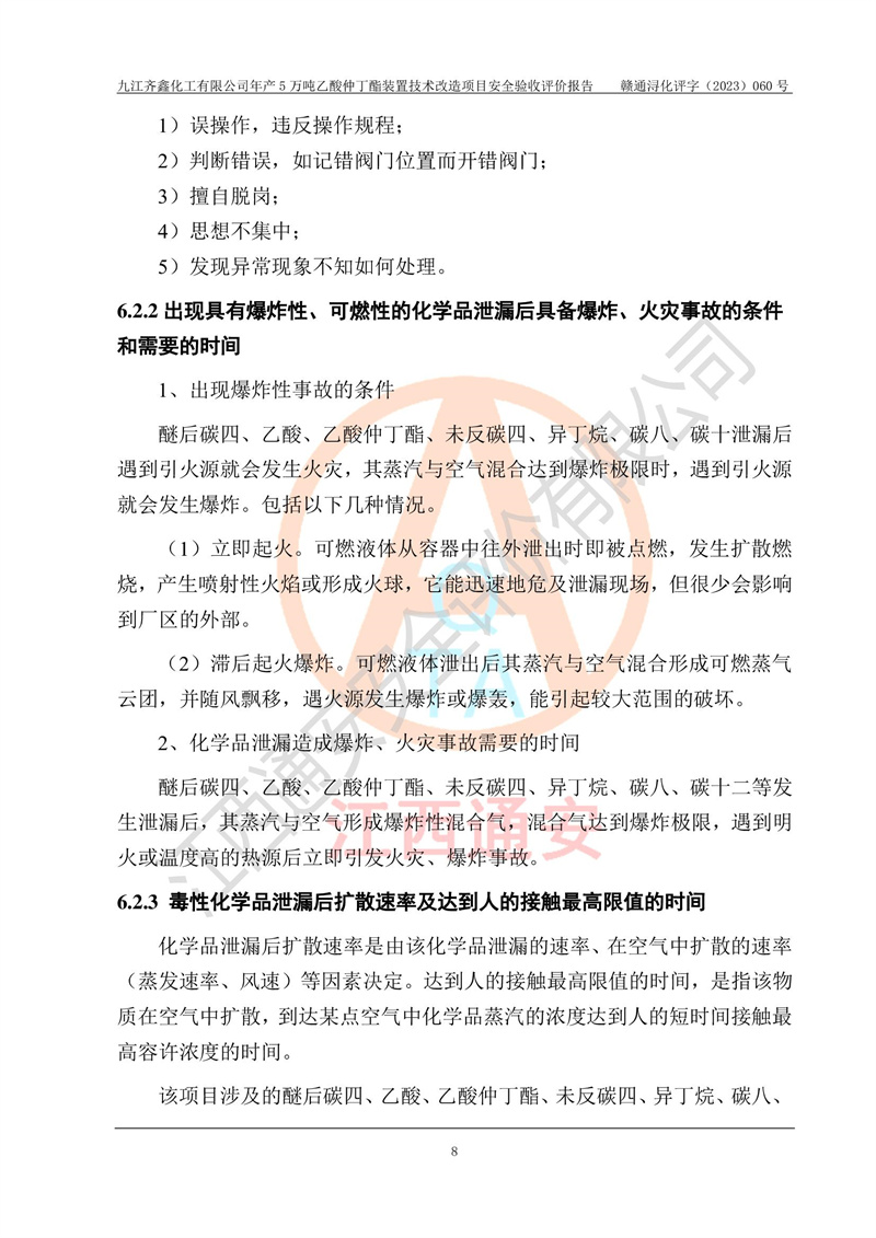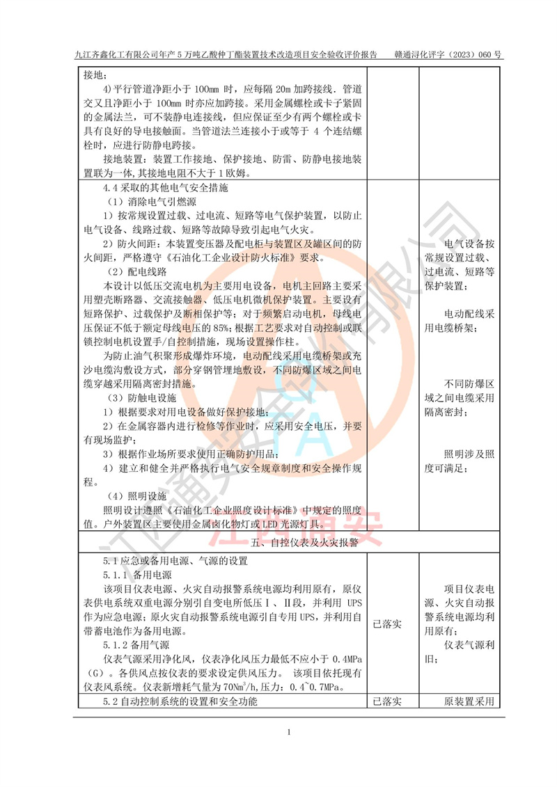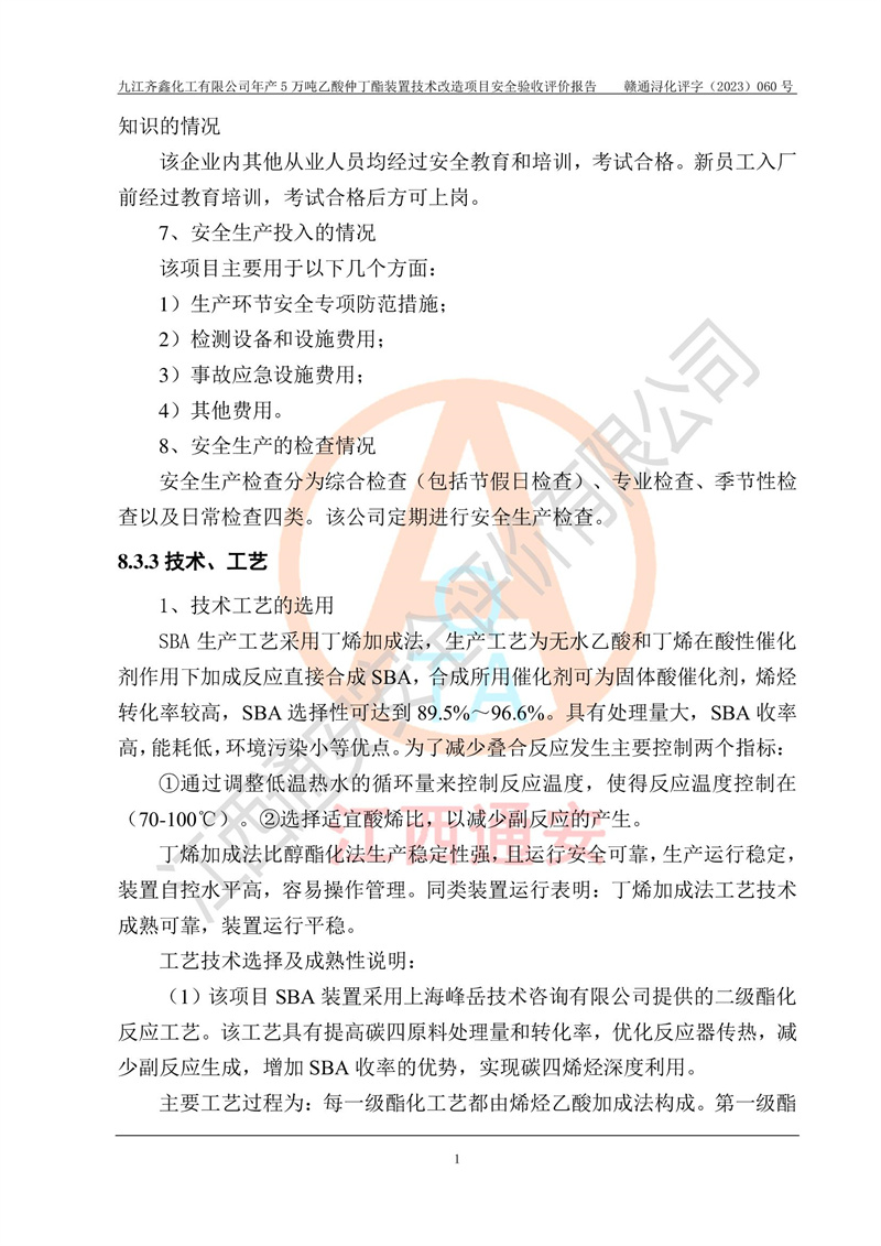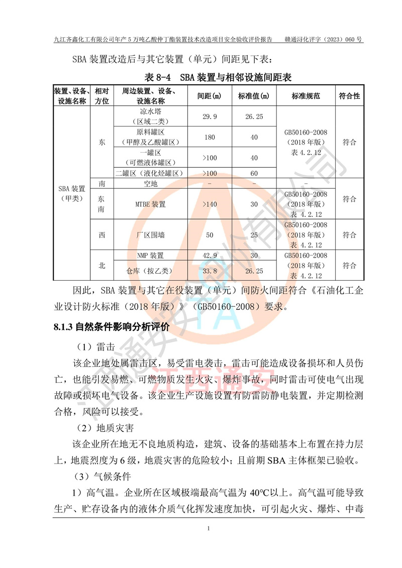 評(píng)價(jià)報(bào)告名稱 | 九江齊鑫化工有限公司年產(chǎn)5萬噸乙酸仲丁酯裝置技術(shù)改造項(xiàng)目安全驗(yàn)收評(píng)價(jià)報(bào)告 | ||||
