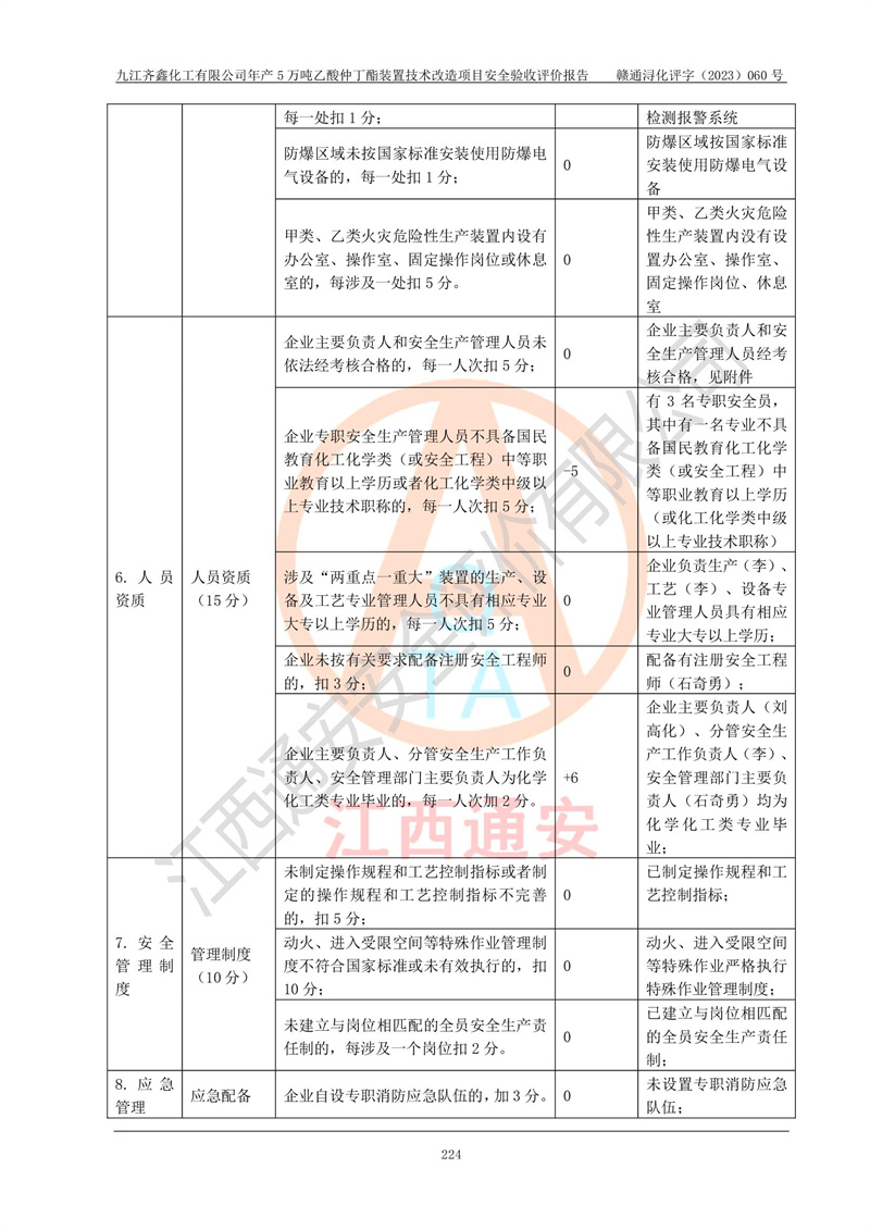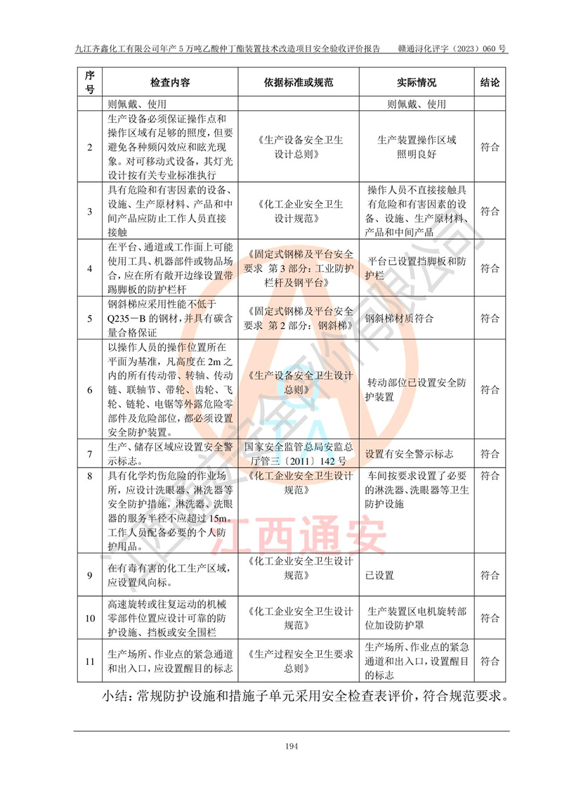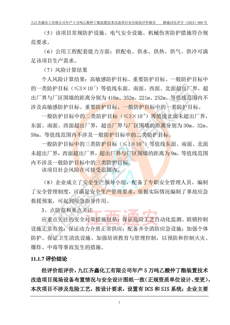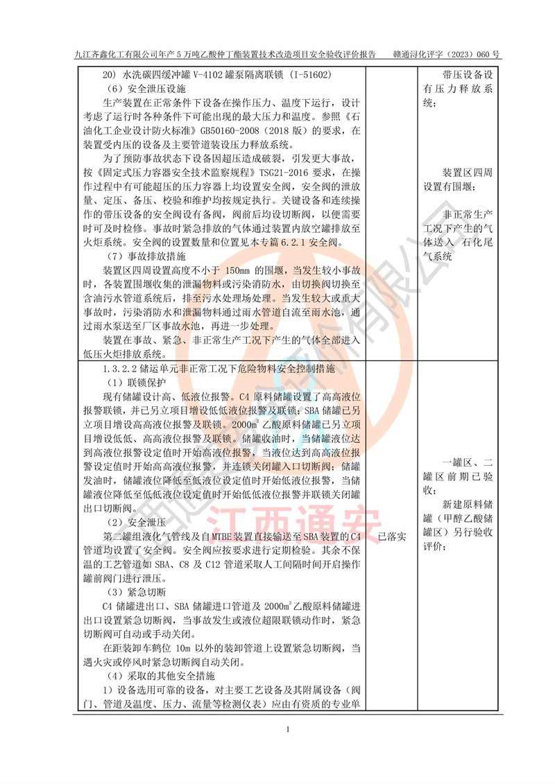 評(píng)價(jià)結(jié)論 | 經(jīng)評(píng)價(jià)組評(píng)價(jià),九江齊鑫化工有限公司年產(chǎn)5萬噸乙酸仲丁酯裝置技術(shù)改造項(xiàng)目現(xiàn)場(chǎng)設(shè)備布置情況與安全設(shè)計(jì)圖紙一致(正規(guī)資質(zhì)單位設(shè)計(jì)、變更),本次項(xiàng)目不涉及危險(xiǎn)工藝,按設(shè)計(jì)要求,設(shè)置有DCS和SIS系統(tǒng);企業(yè)主要負(fù)責(zé)人(本科化機(jī)專業(yè))、安全管理部門主要負(fù)責(zé)人(本科有機(jī)化工)均為化學(xué)、化工相關(guān)專業(yè),且有3年以上化工行業(yè)從業(yè)經(jīng)歷,企業(yè)主要負(fù)責(zé)人及安全管理人員已取得危險(xiǎn)化學(xué)品生產(chǎn)企業(yè)主要負(fù)責(zé)人及安全管理人員考核合格證。項(xiàng)目選擇的工藝過程及設(shè)備設(shè)施的安全可靠性能達(dá)到**法規(guī)、標(biāo)準(zhǔn)規(guī)定要求。 項(xiàng)目運(yùn)行后存在的主要危險(xiǎn)、有害因素有:火災(zāi)、其他爆炸、容器爆炸、中毒與窒息等;存在的主要有害因素有高溫、化學(xué)物質(zhì)危害等;針對(duì)存在的危險(xiǎn)、有害因素,企業(yè)采取了**的安全技術(shù)措施及安全管理措施,符合**有關(guān)法規(guī)、標(biāo)準(zhǔn)、規(guī)范要求;項(xiàng)目風(fēng)險(xiǎn)可控,其安全生產(chǎn)條件和安全管理方面具備竣工安全驗(yàn)收的條件。 | ||||