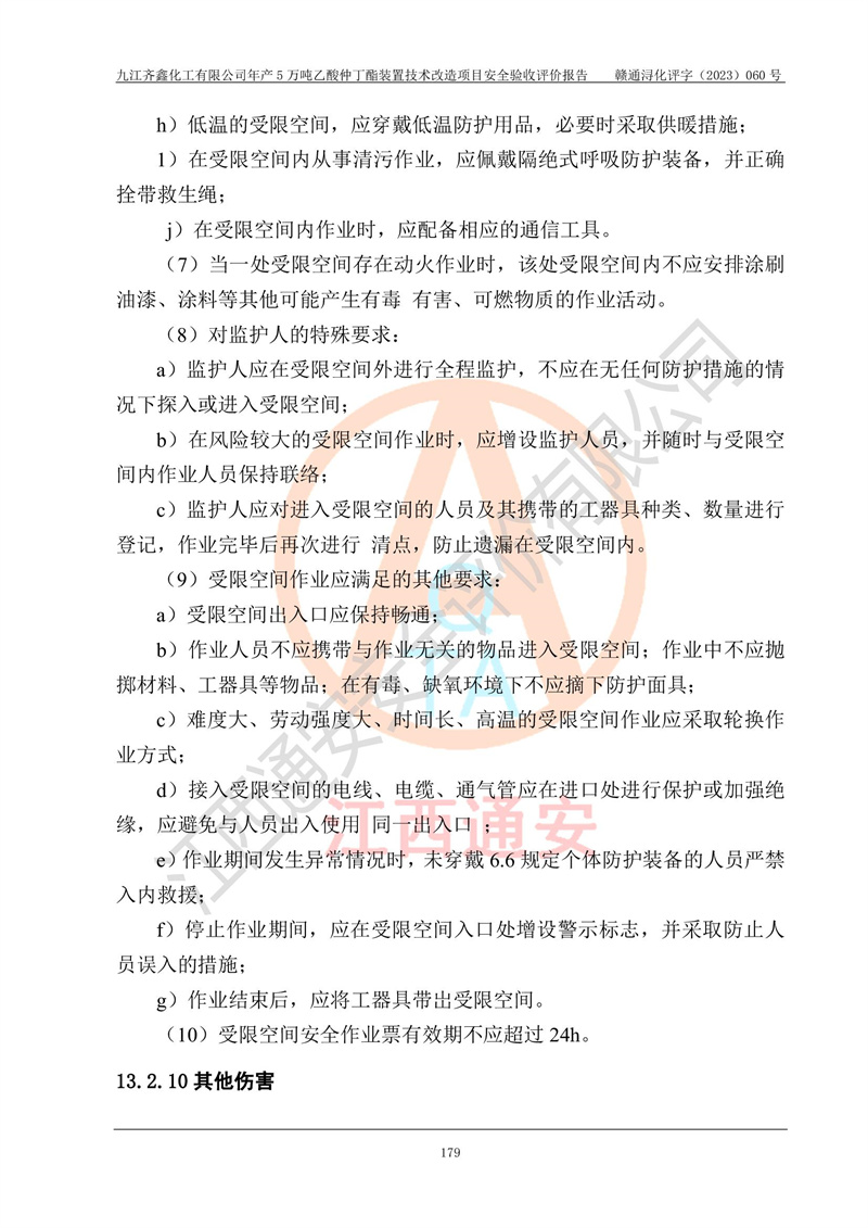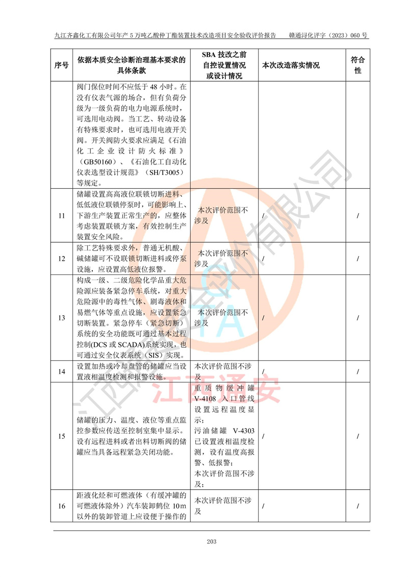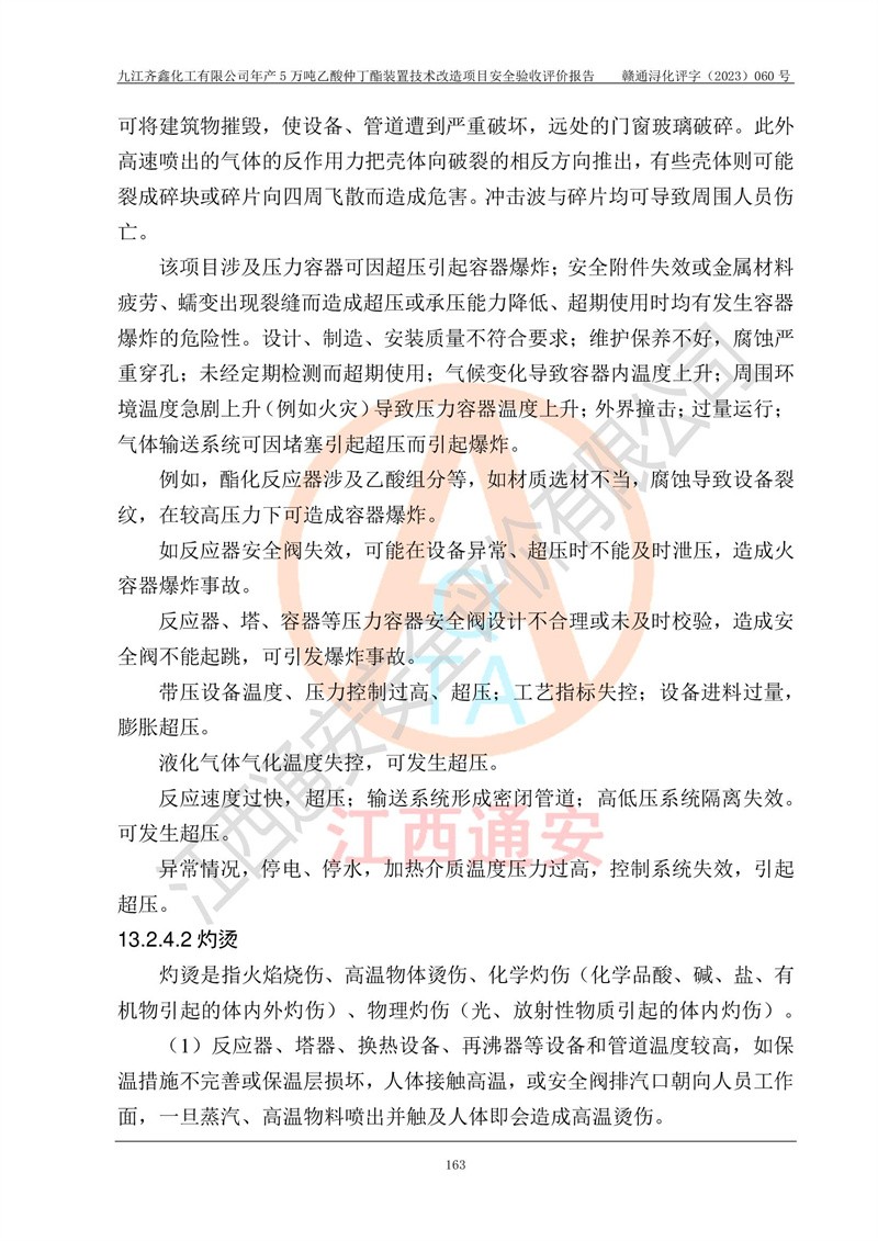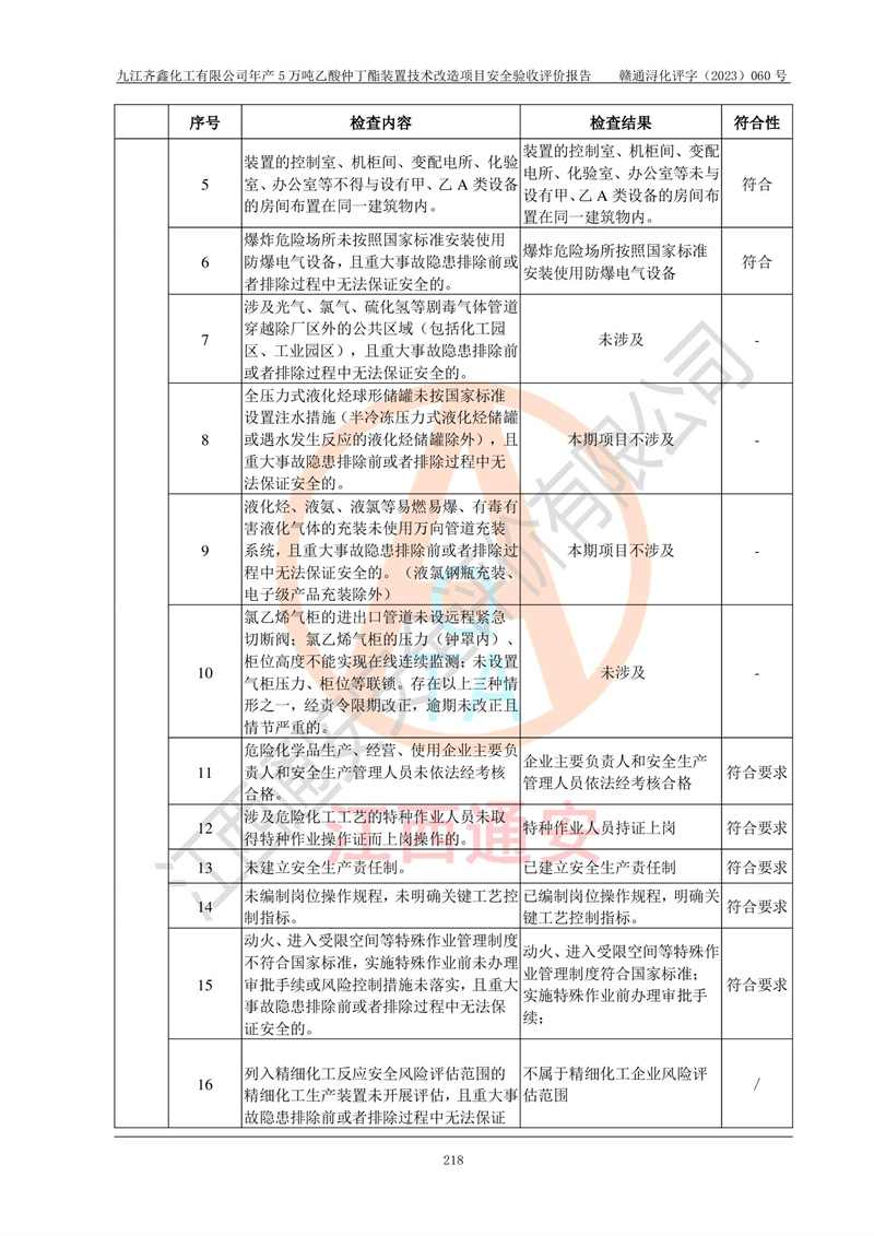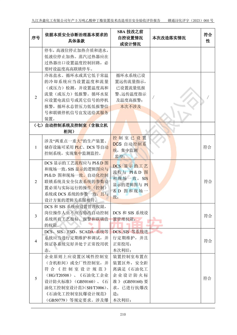 評(píng)價(jià)結(jié)論 | 經(jīng)評(píng)價(jià)組評(píng)價(jià),九江齊鑫化工有限公司年產(chǎn)5萬噸乙酸仲丁酯裝置技術(shù)改造項(xiàng)目現(xiàn)場(chǎng)設(shè)備布置情況與安全設(shè)計(jì)圖紙一致(正規(guī)資質(zhì)單位設(shè)計(jì)、變更),本次項(xiàng)目不涉及危險(xiǎn)工藝,按設(shè)計(jì)要求,設(shè)置有DCS和SIS系統(tǒng);企業(yè)主要負(fù)責(zé)人(本科化機(jī)專業(yè))、安全管理部門主要負(fù)責(zé)人(本科有機(jī)化工)均為化學(xué)、化工相關(guān)專業(yè),且有3年以上化工行業(yè)從業(yè)經(jīng)歷,企業(yè)主要負(fù)責(zé)人及安全管理人員已取得危險(xiǎn)化學(xué)品生產(chǎn)企業(yè)主要負(fù)責(zé)人及安全管理人員考核合格證。項(xiàng)目選擇的工藝過程及設(shè)備設(shè)施的安全可靠性能達(dá)到**法規(guī)、標(biāo)準(zhǔn)規(guī)定要求。 項(xiàng)目運(yùn)行后存在的主要危險(xiǎn)、有害因素有:火災(zāi)、其他爆炸、容器爆炸、中毒與窒息等;存在的主要有害因素有高溫、化學(xué)物質(zhì)危害等;針對(duì)存在的危險(xiǎn)、有害因素,企業(yè)采取了**的安全技術(shù)措施及安全管理措施,符合**有關(guān)法規(guī)、標(biāo)準(zhǔn)、規(guī)范要求;項(xiàng)目風(fēng)險(xiǎn)可控,其安全生產(chǎn)條件和安全管理方面具備竣工安全驗(yàn)收的條件。 | ||||