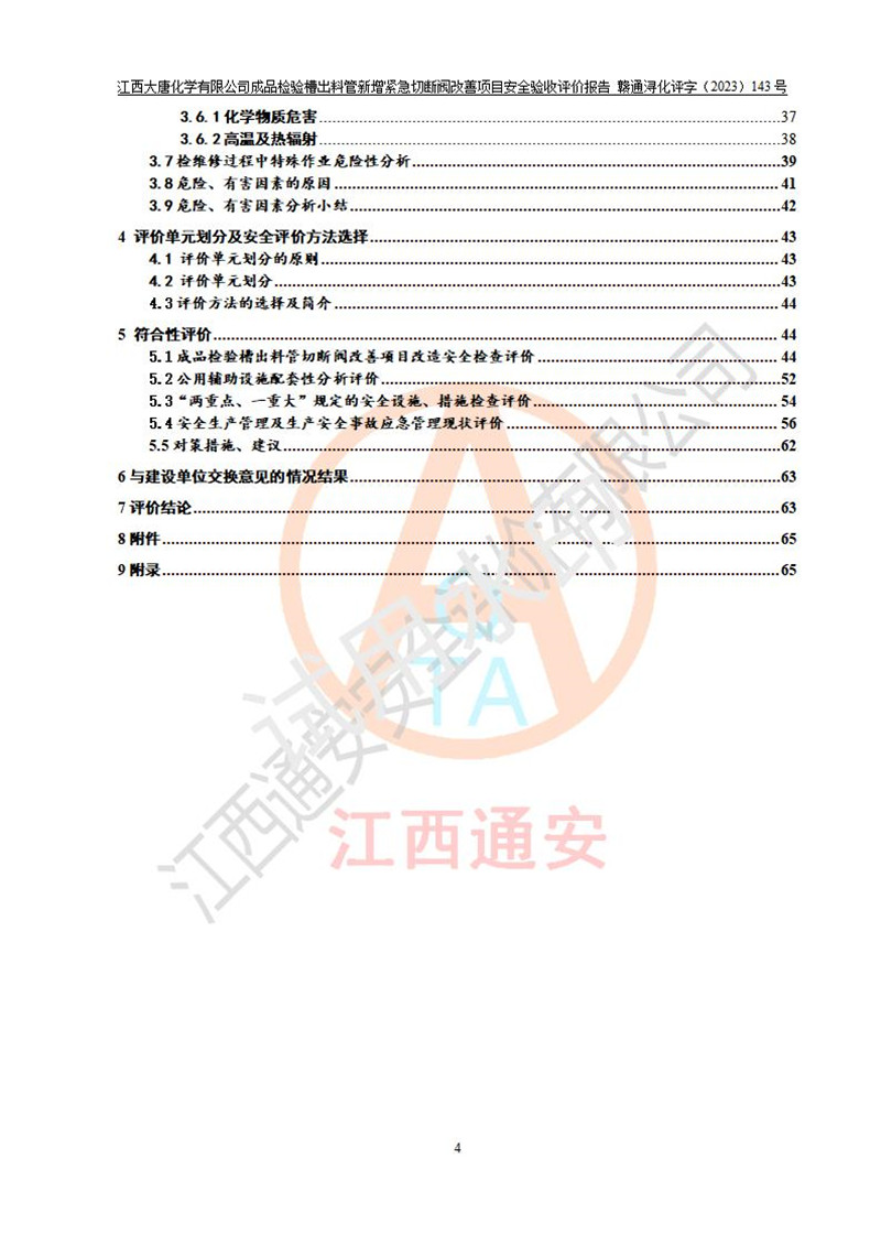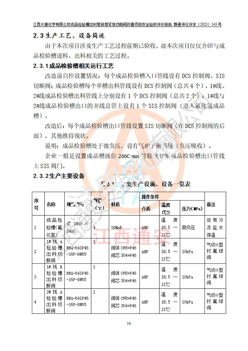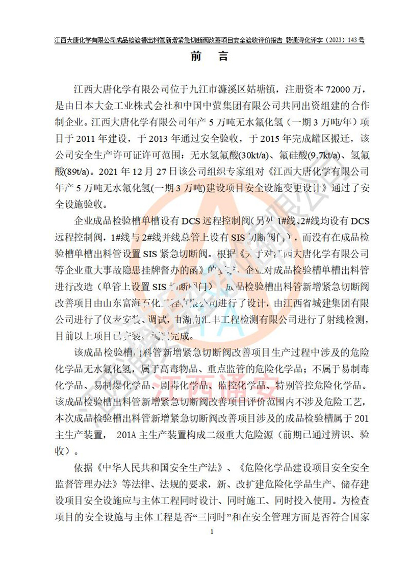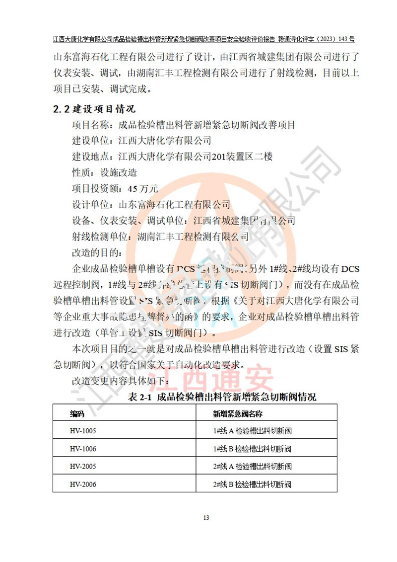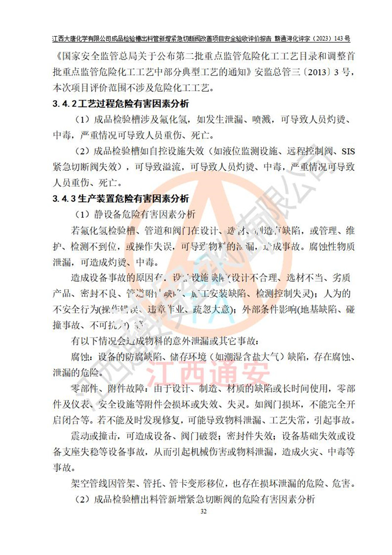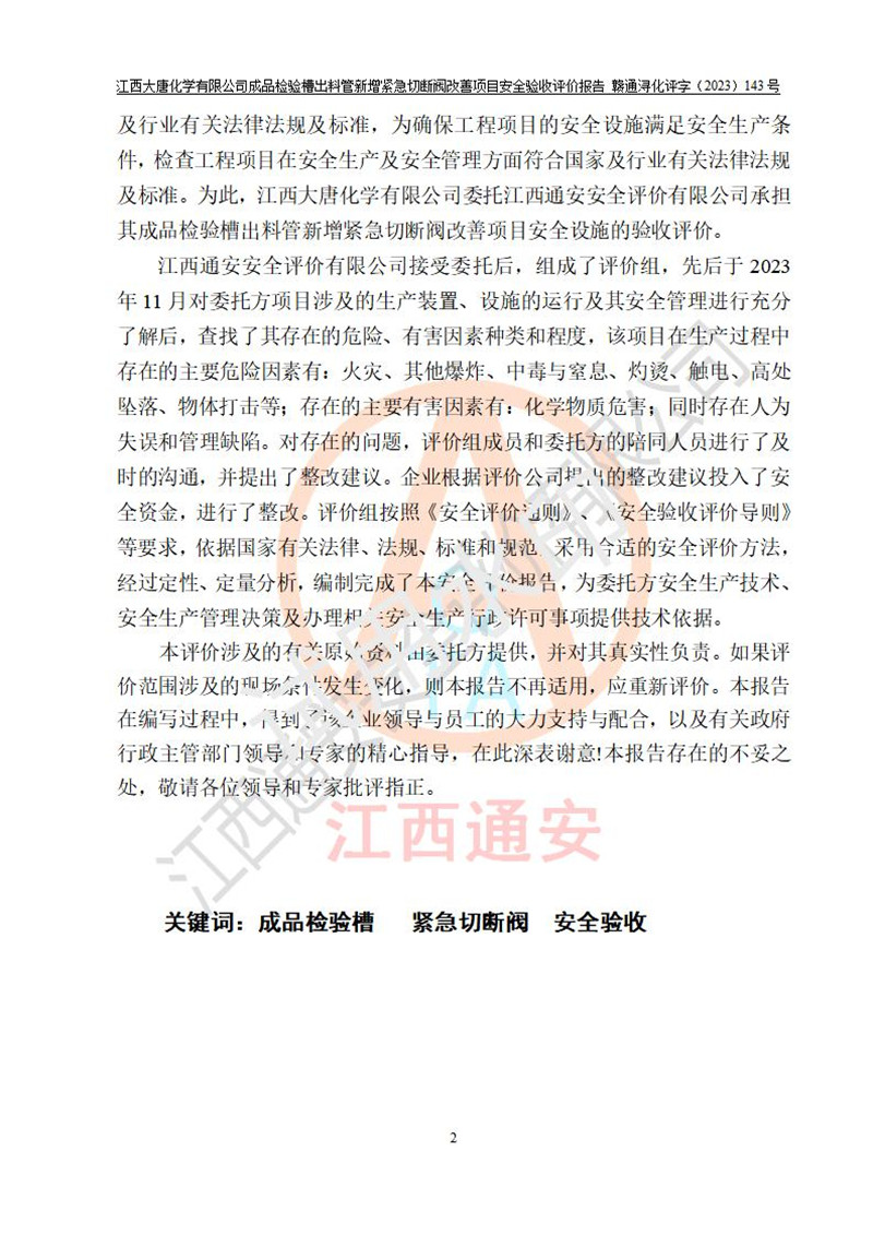 評價報告名稱 | 江西大唐化學(xué)有限公司成品檢驗槽出料管新增緊急切斷閥改善項目安全驗收評價報告 | ||||