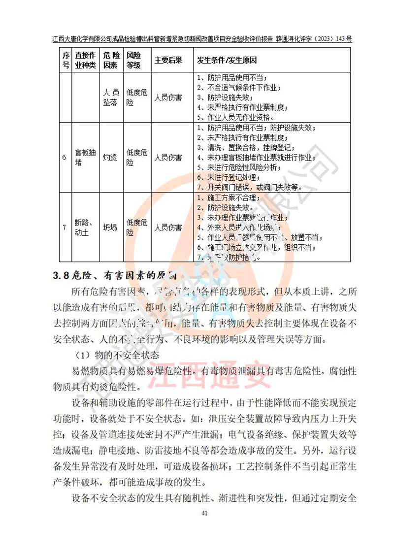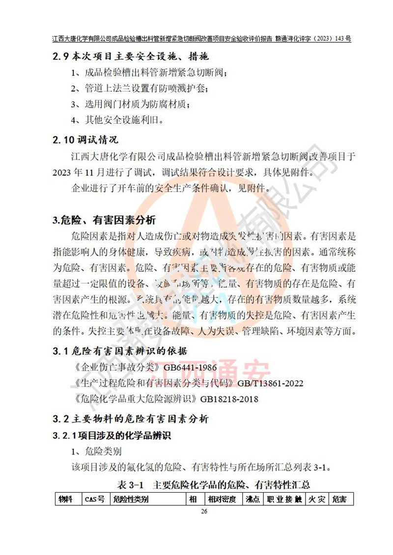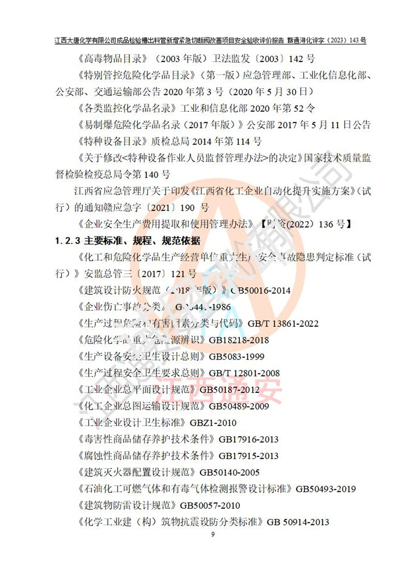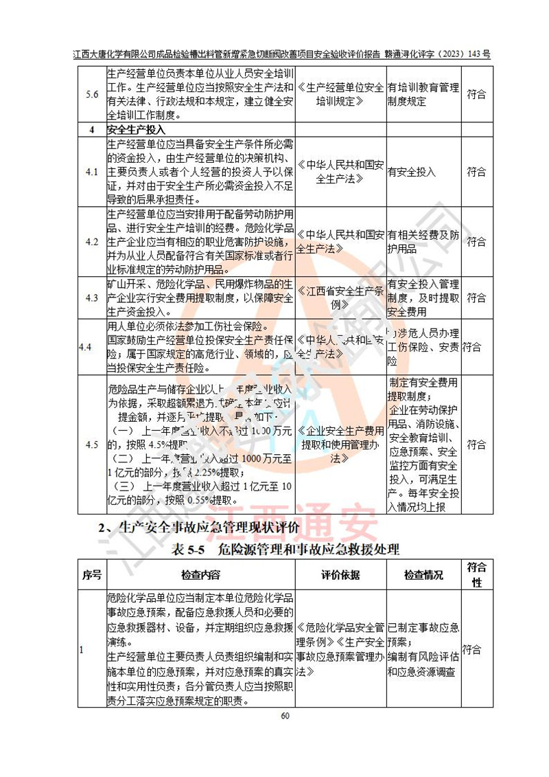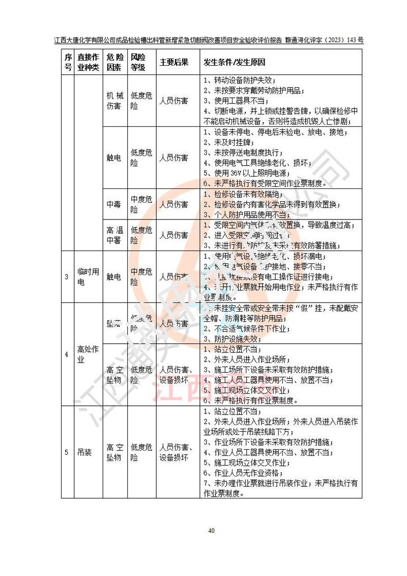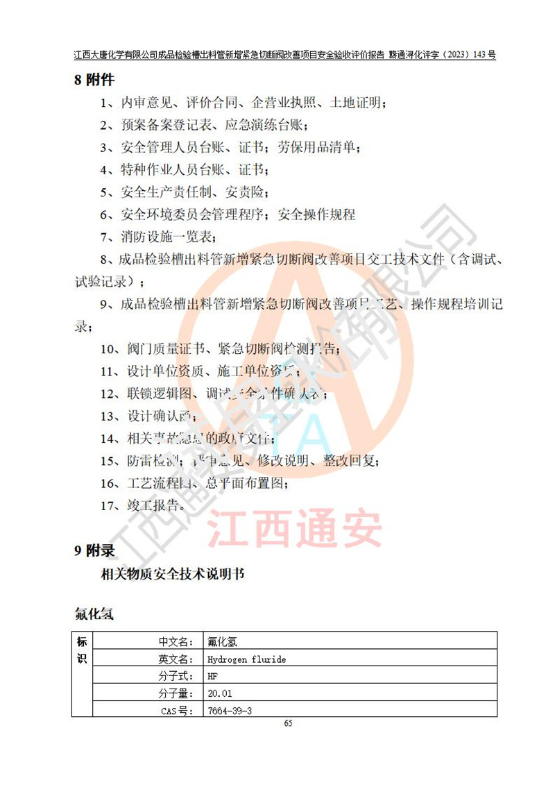 評價報告名稱 | 江西大唐化學(xué)有限公司成品檢驗槽出料管新增緊急切斷閥改善項目安全驗收評價報告 | ||||