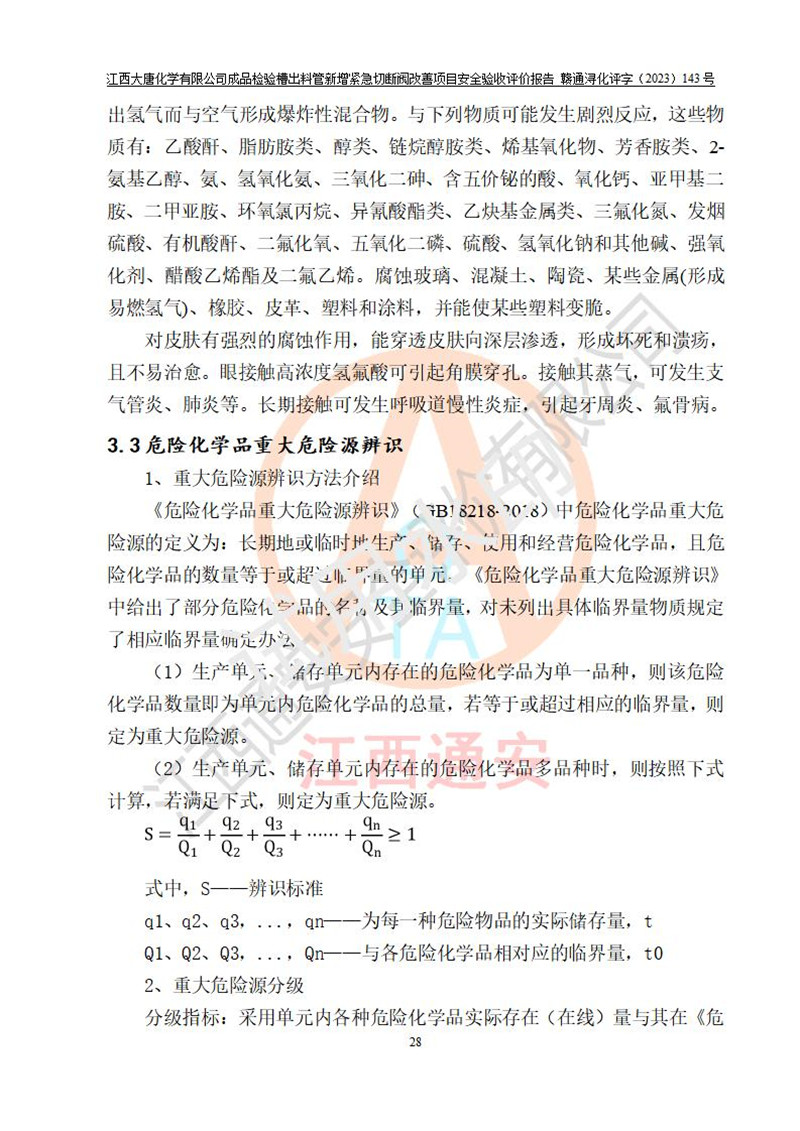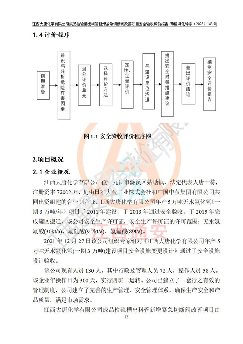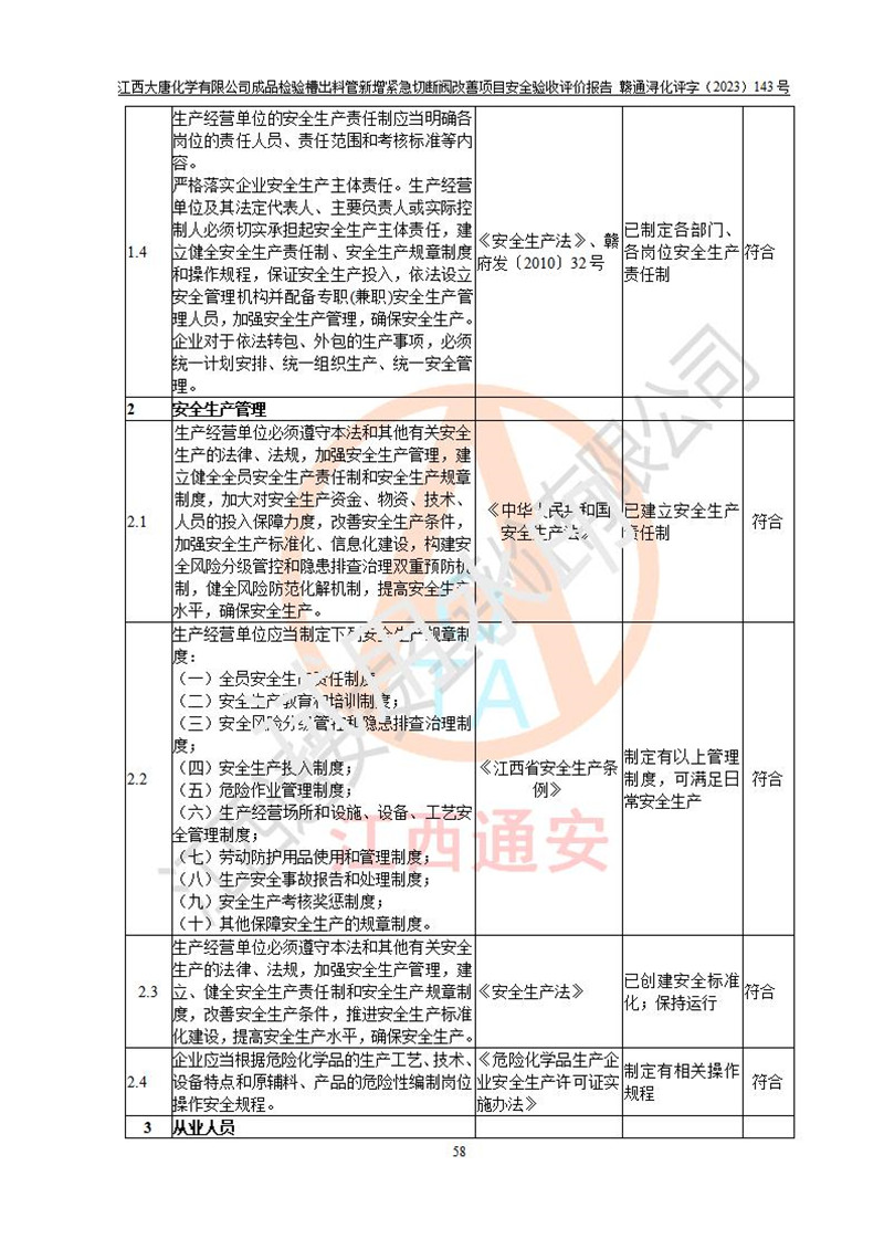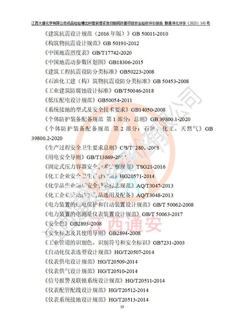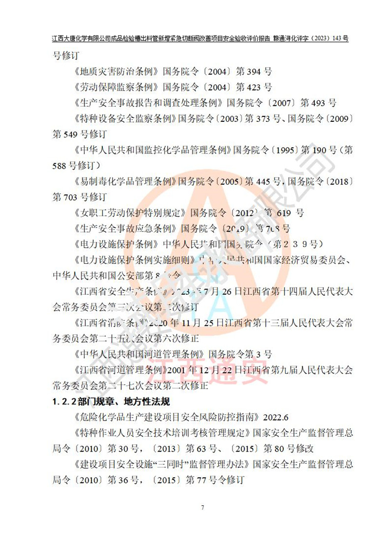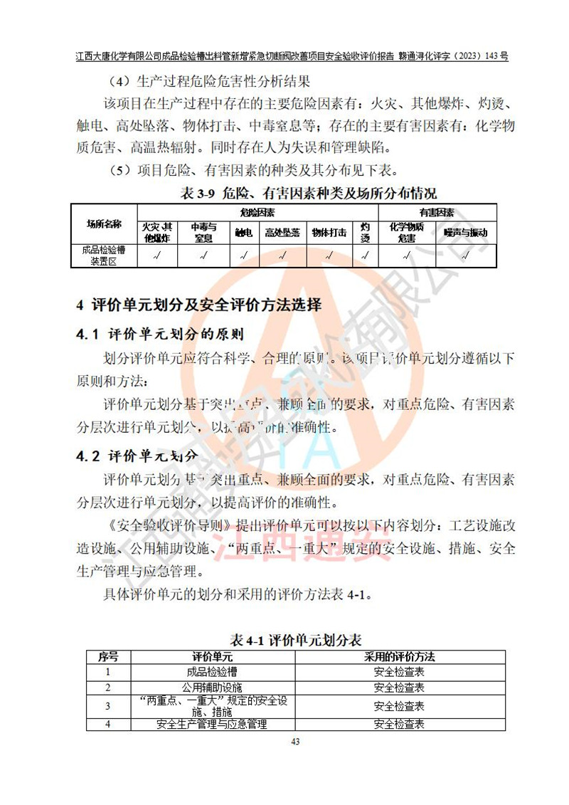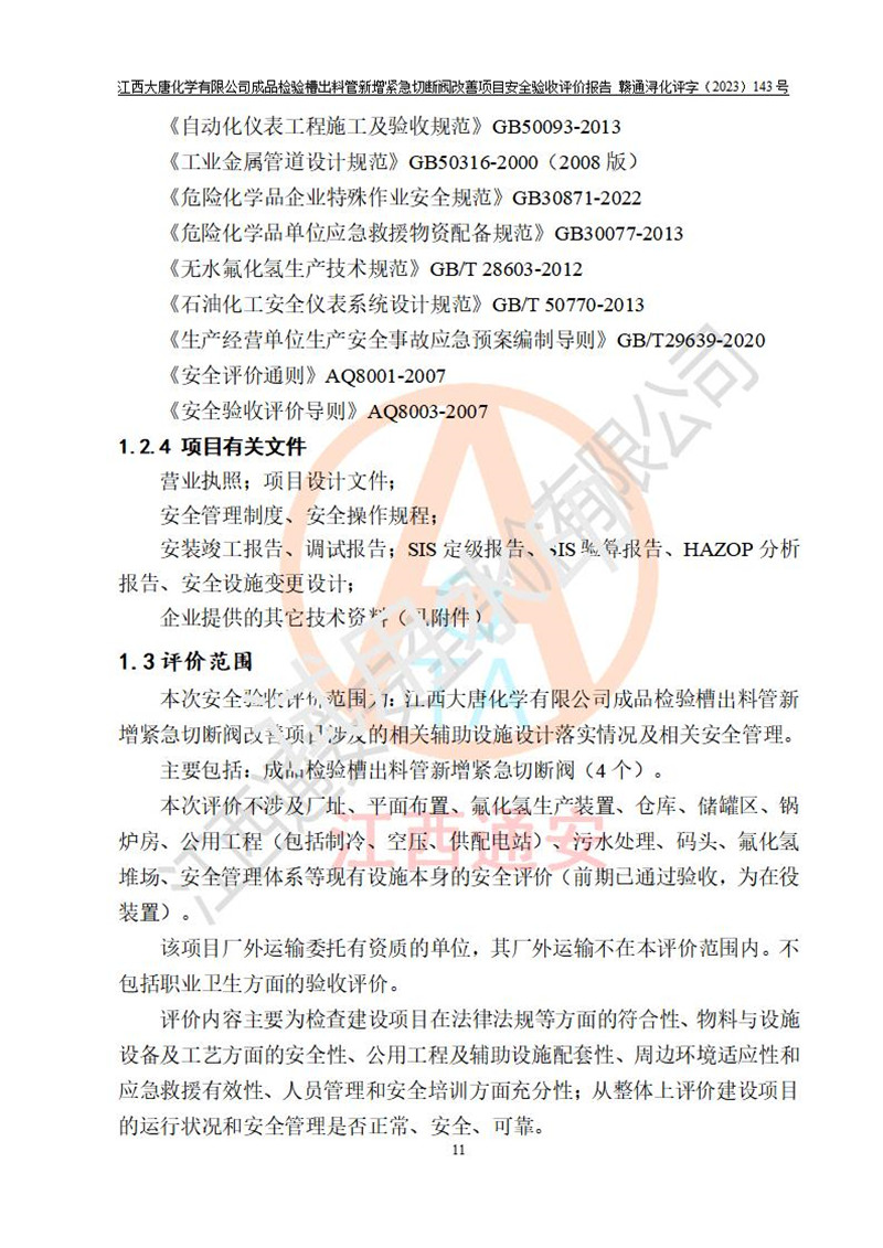 評價報告名稱 | 江西大唐化學(xué)有限公司成品檢驗槽出料管新增緊急切斷閥改善項目安全驗收評價報告 | ||||
