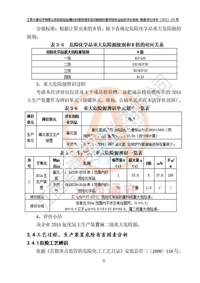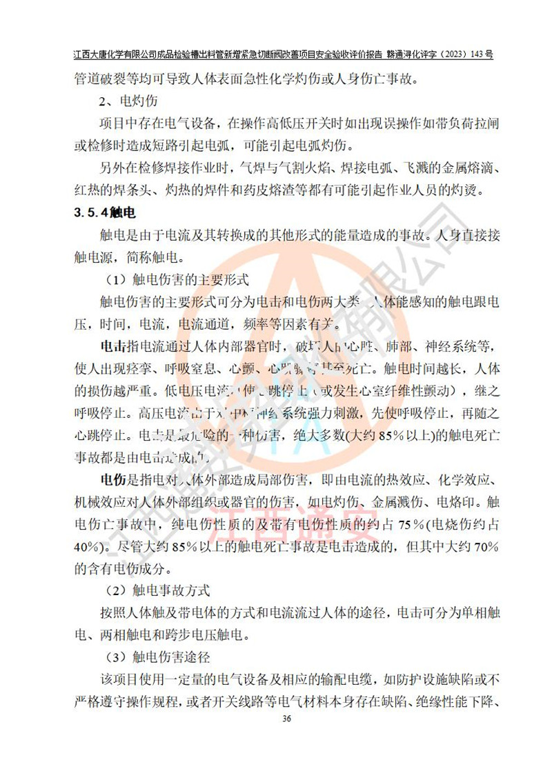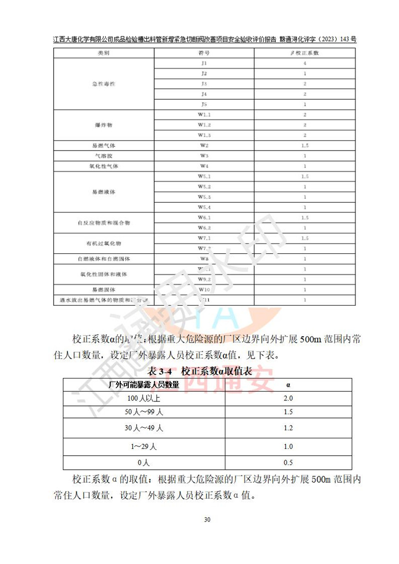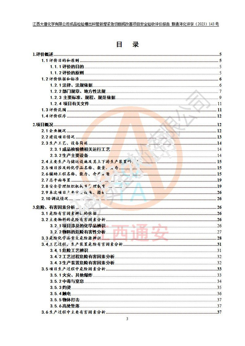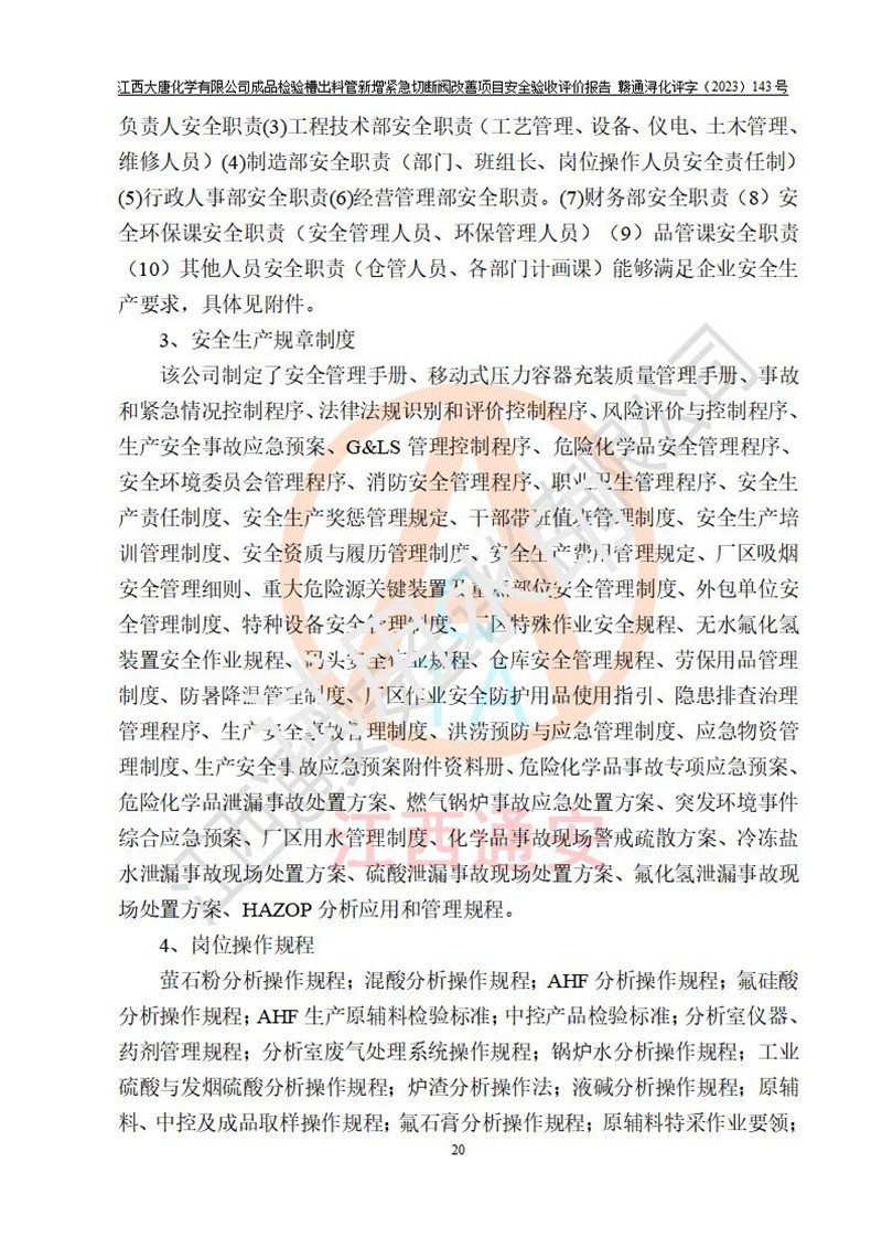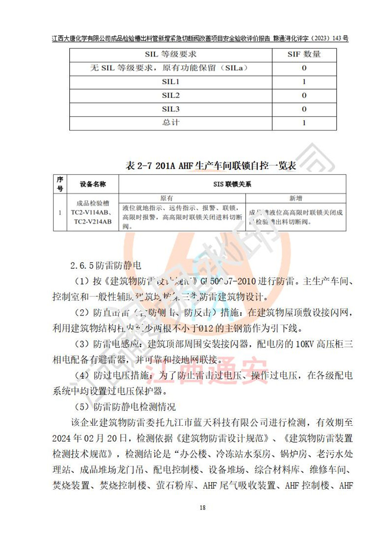 評價報告名稱 | 江西大唐化學(xué)有限公司成品檢驗槽出料管新增緊急切斷閥改善項目安全驗收評價報告 | ||||