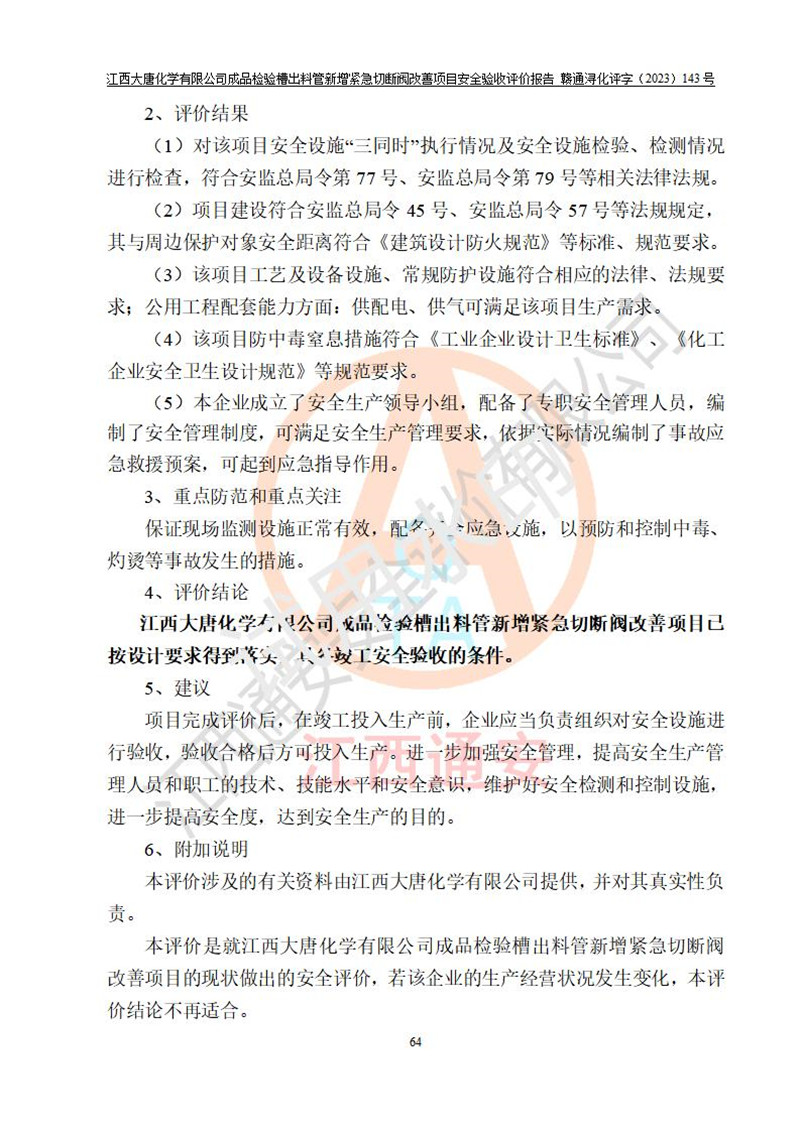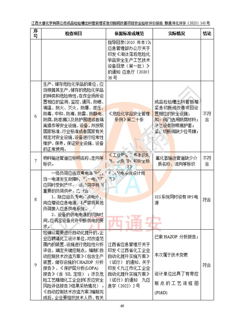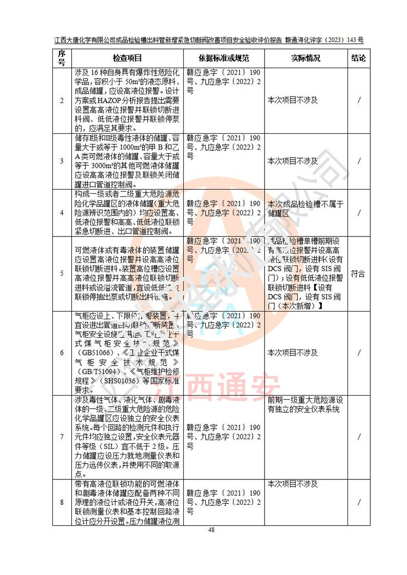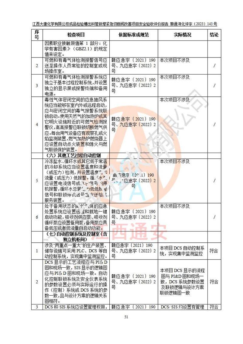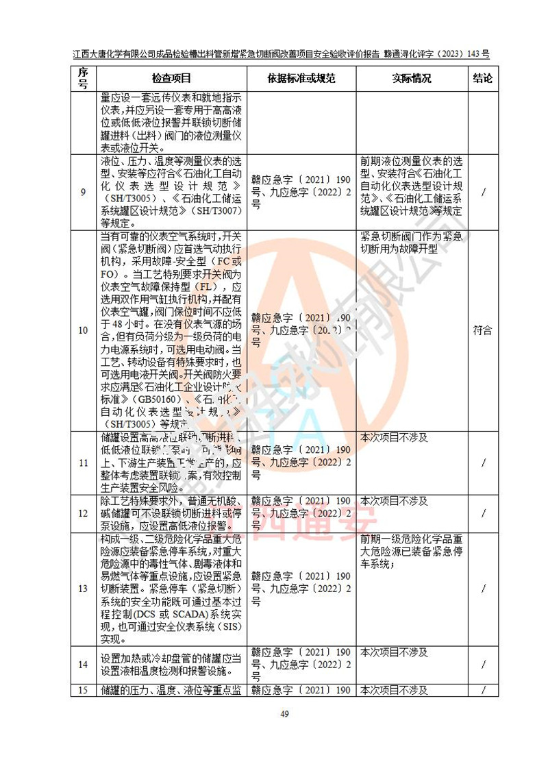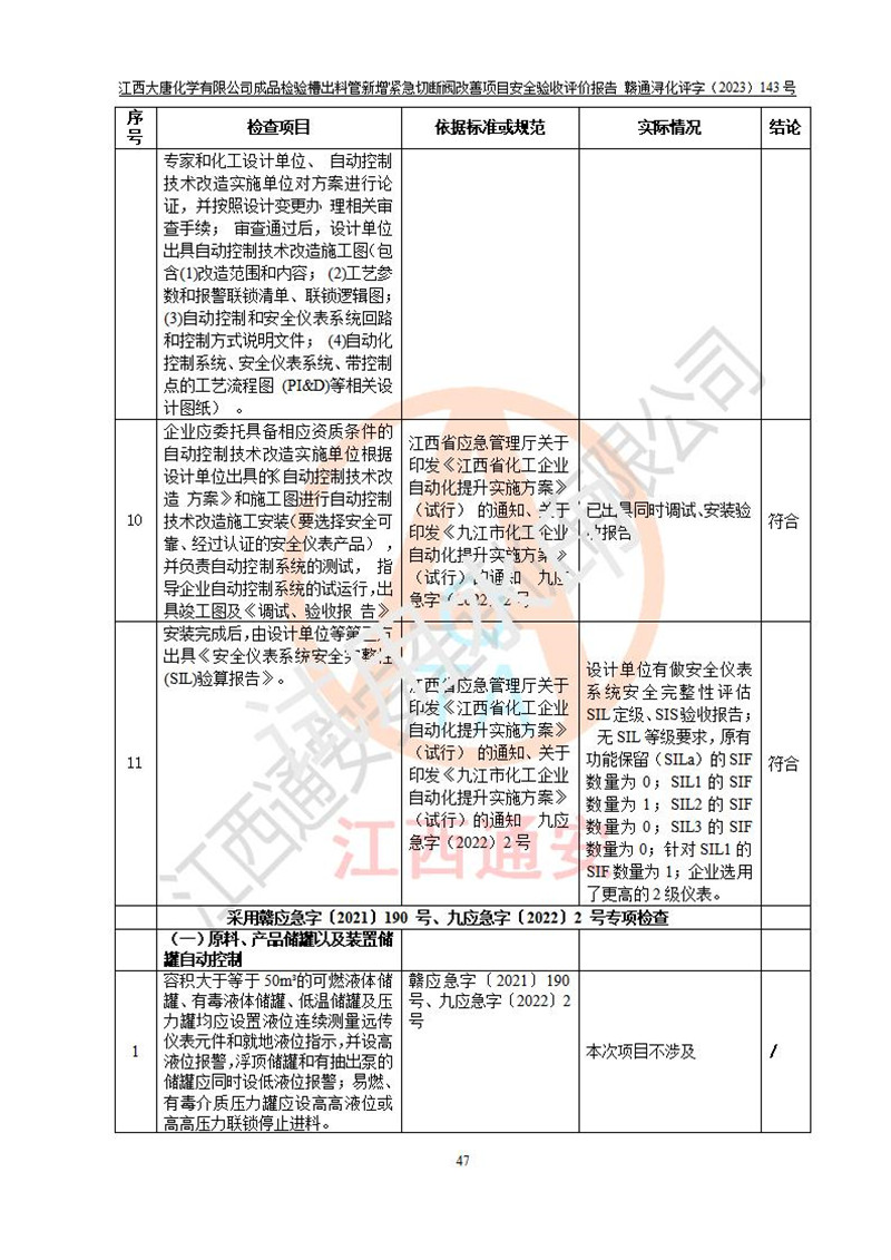 評價結(jié)論 | 江西大唐化學(xué)有限公司成品檢驗槽出料管新增緊急切斷閥改善項目已按設(shè)計要求得到落實,具備竣工安全驗收的條件。 | ||||