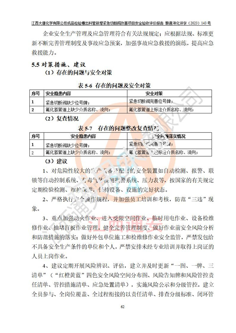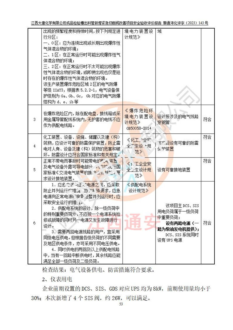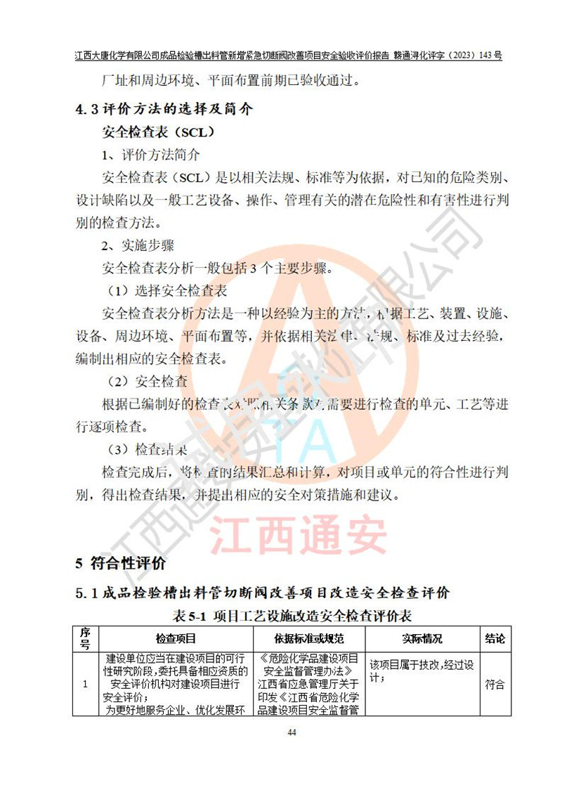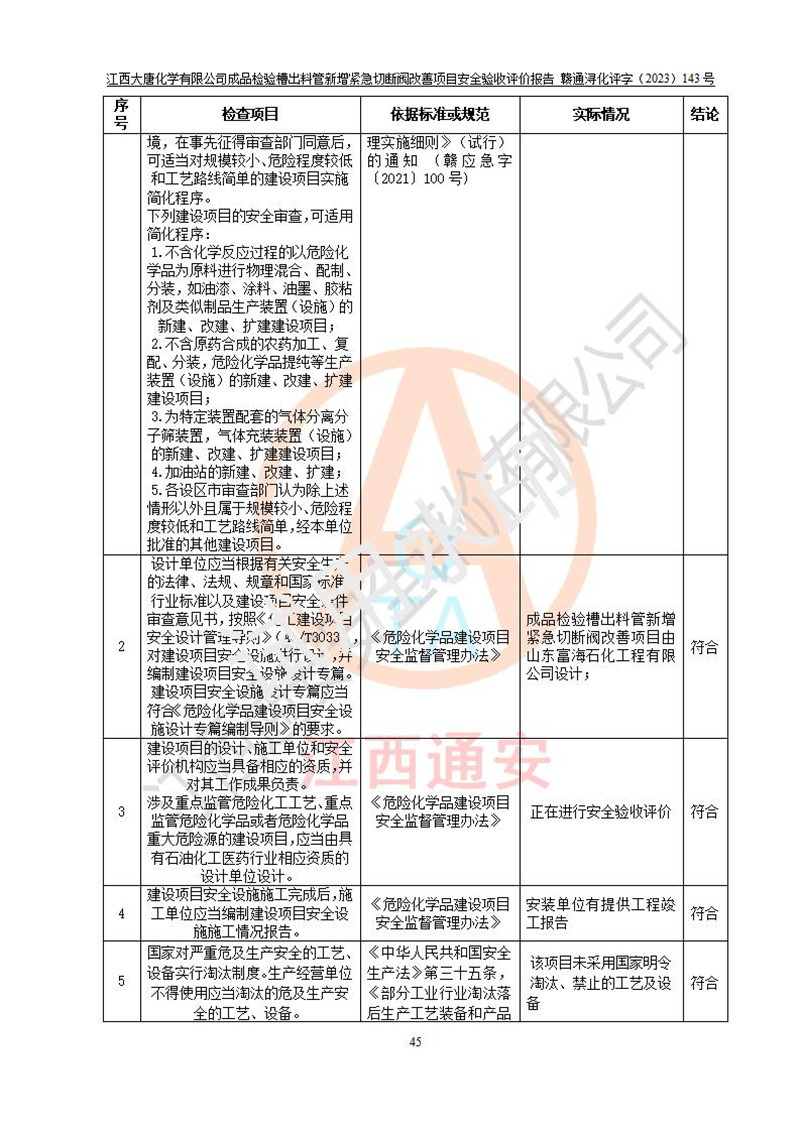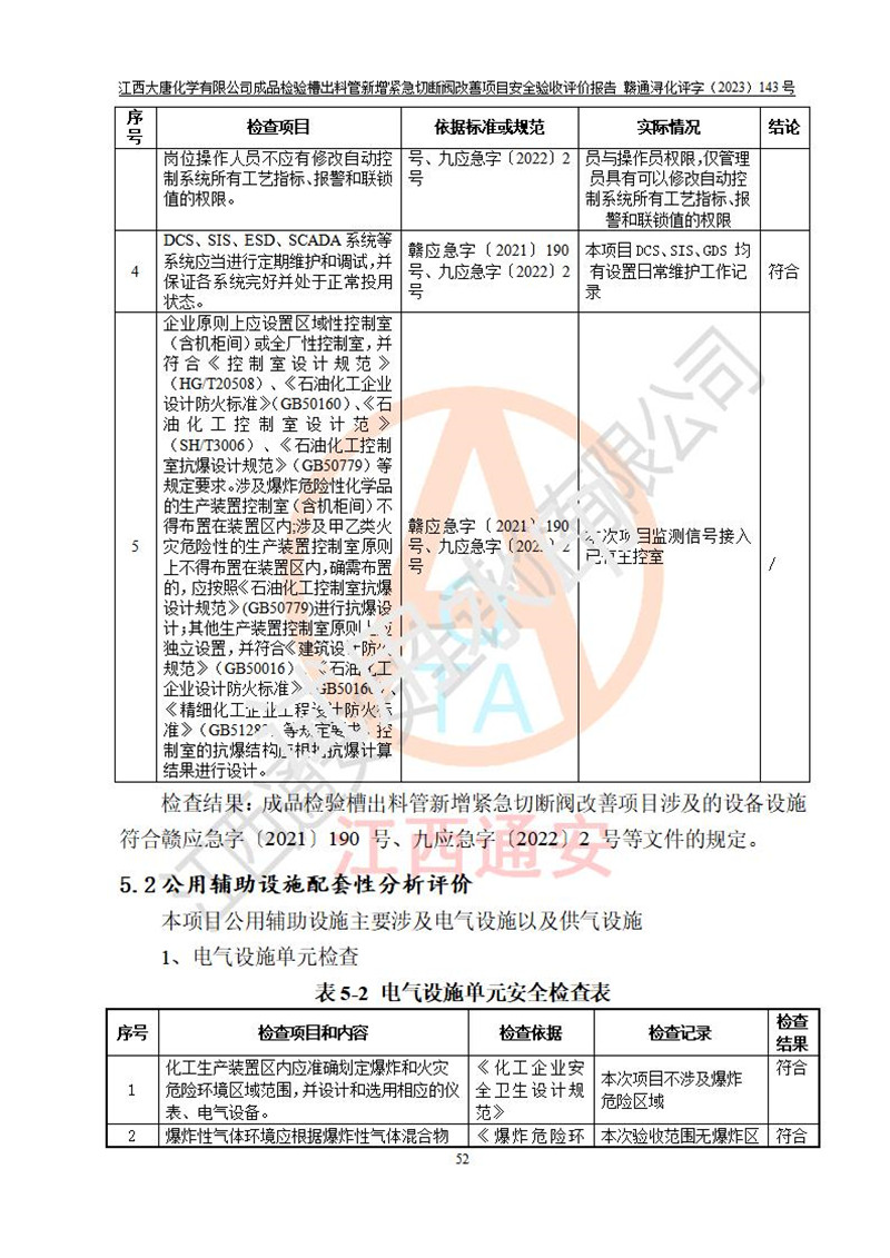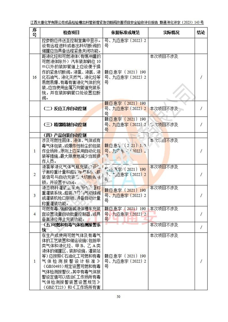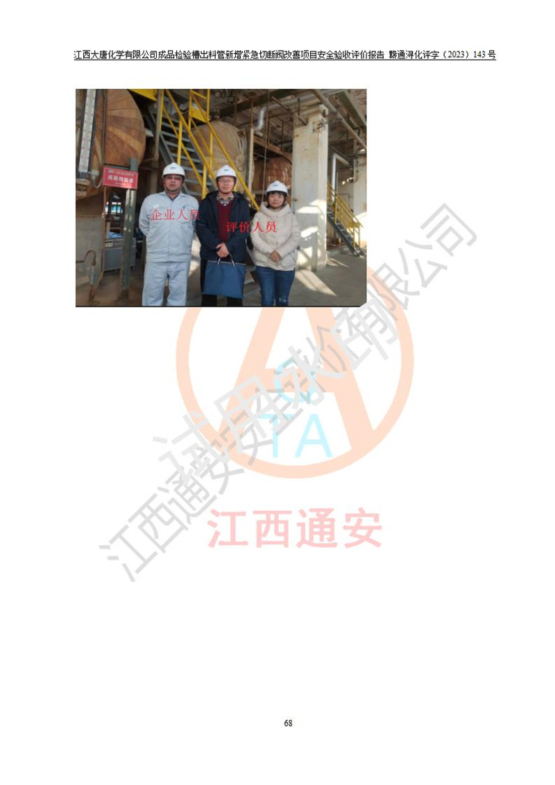 評價結(jié)論 | 江西大唐化學(xué)有限公司成品檢驗槽出料管新增緊急切斷閥改善項目已按設(shè)計要求得到落實,具備竣工安全驗收的條件。 | ||||