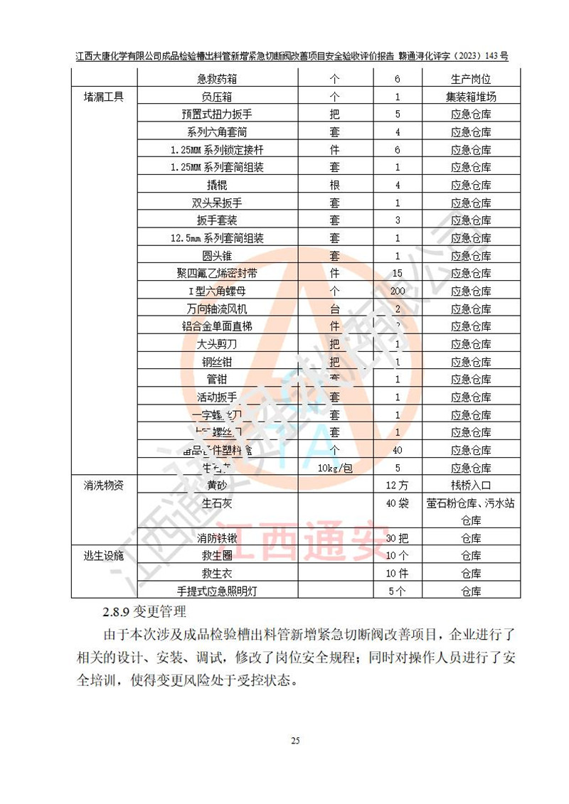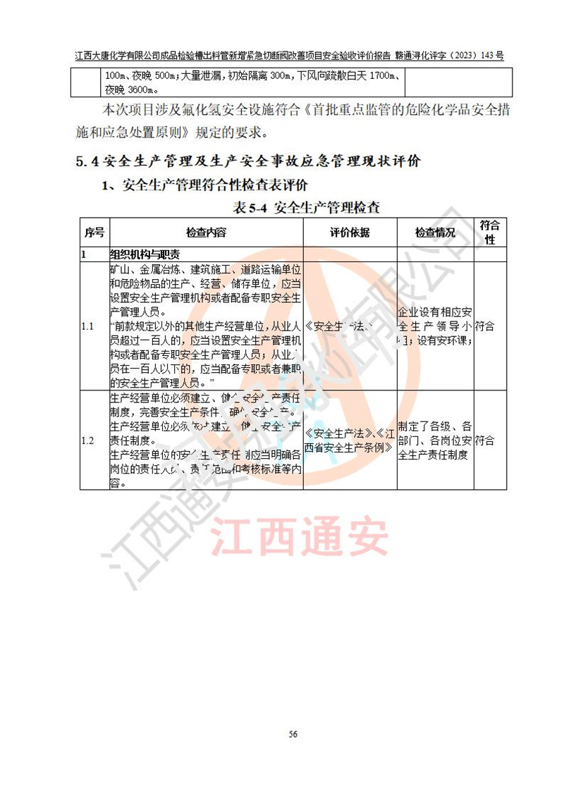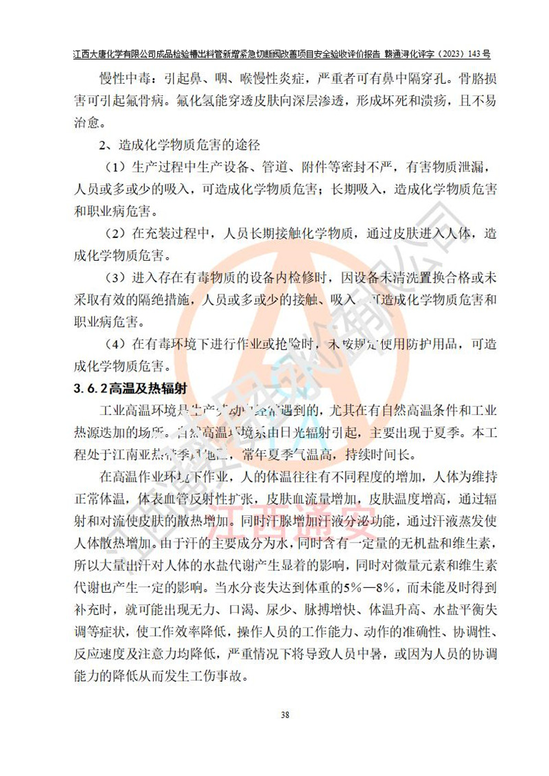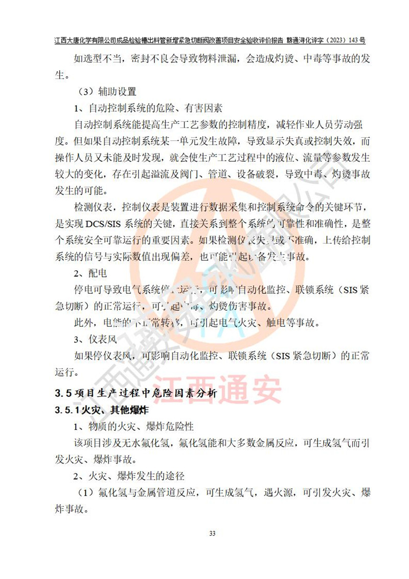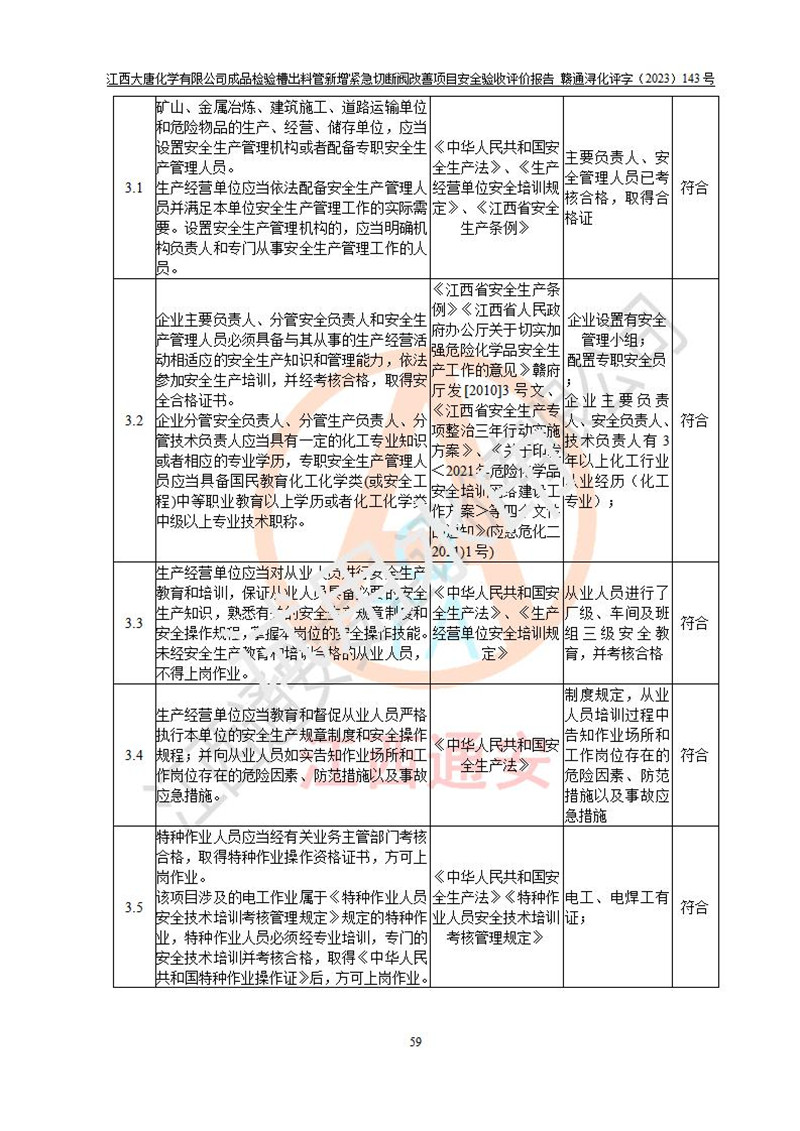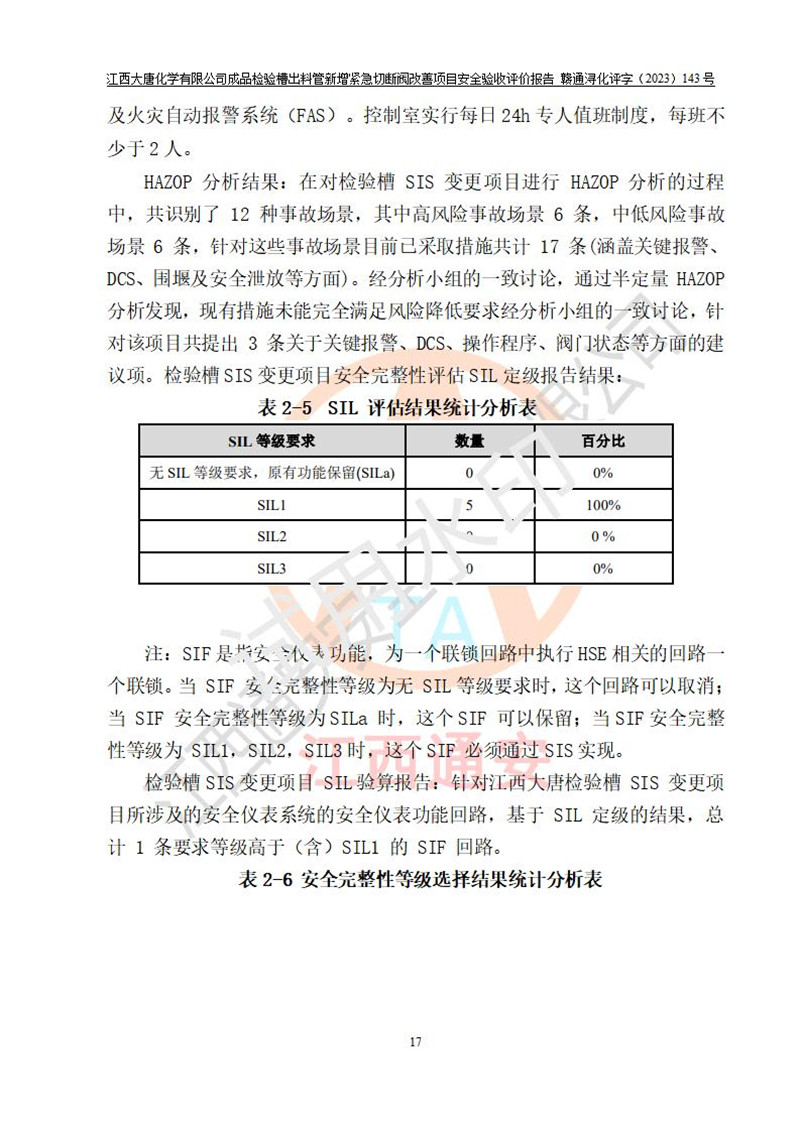 評價結(jié)論 | 江西大唐化學(xué)有限公司成品檢驗槽出料管新增緊急切斷閥改善項目已按設(shè)計要求得到落實,具備竣工安全驗收的條件。 | ||||