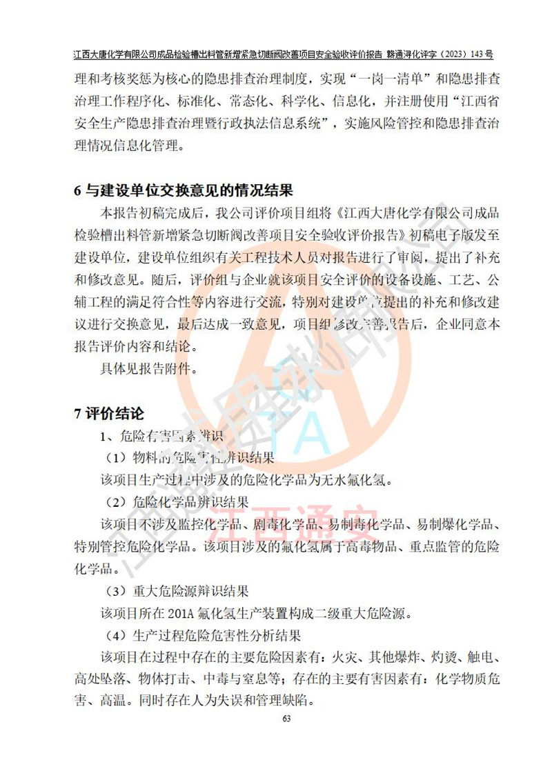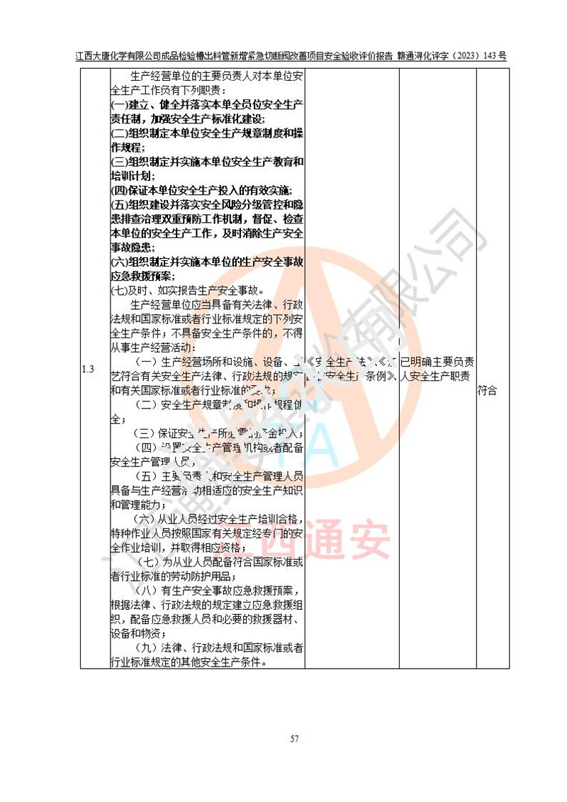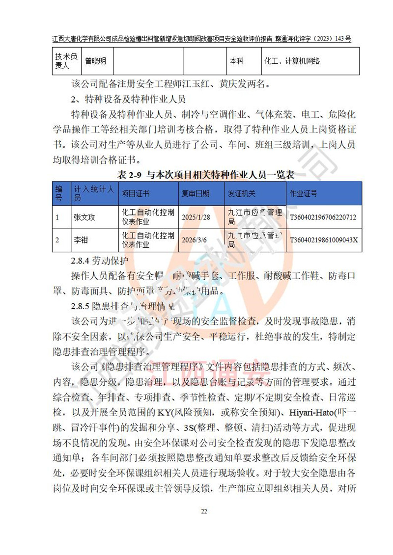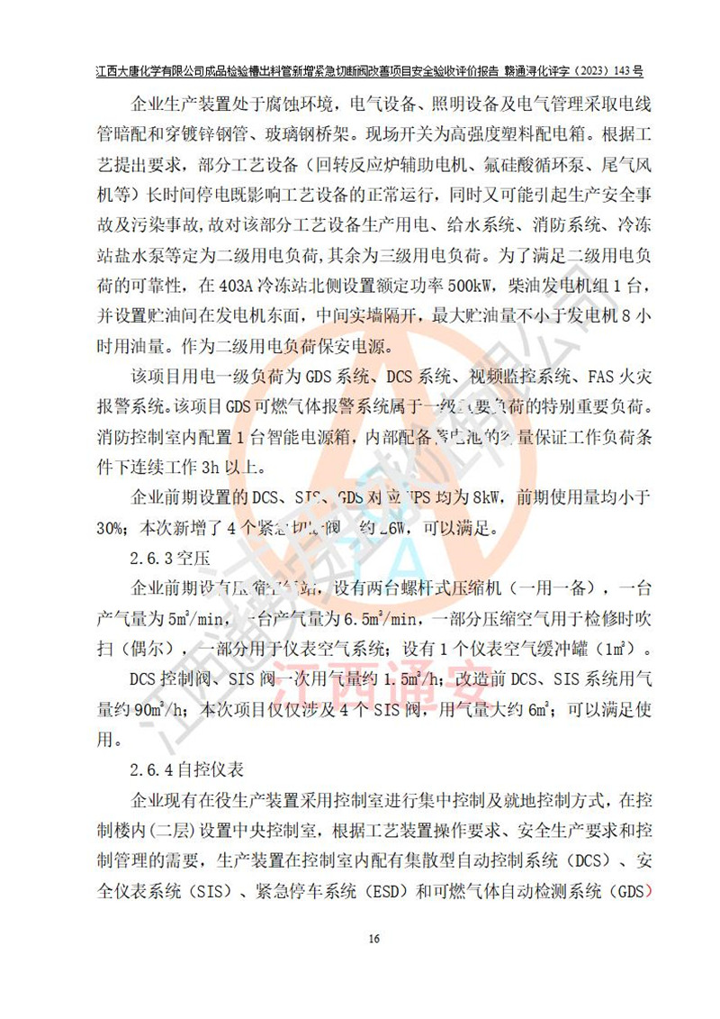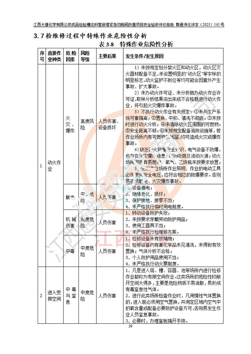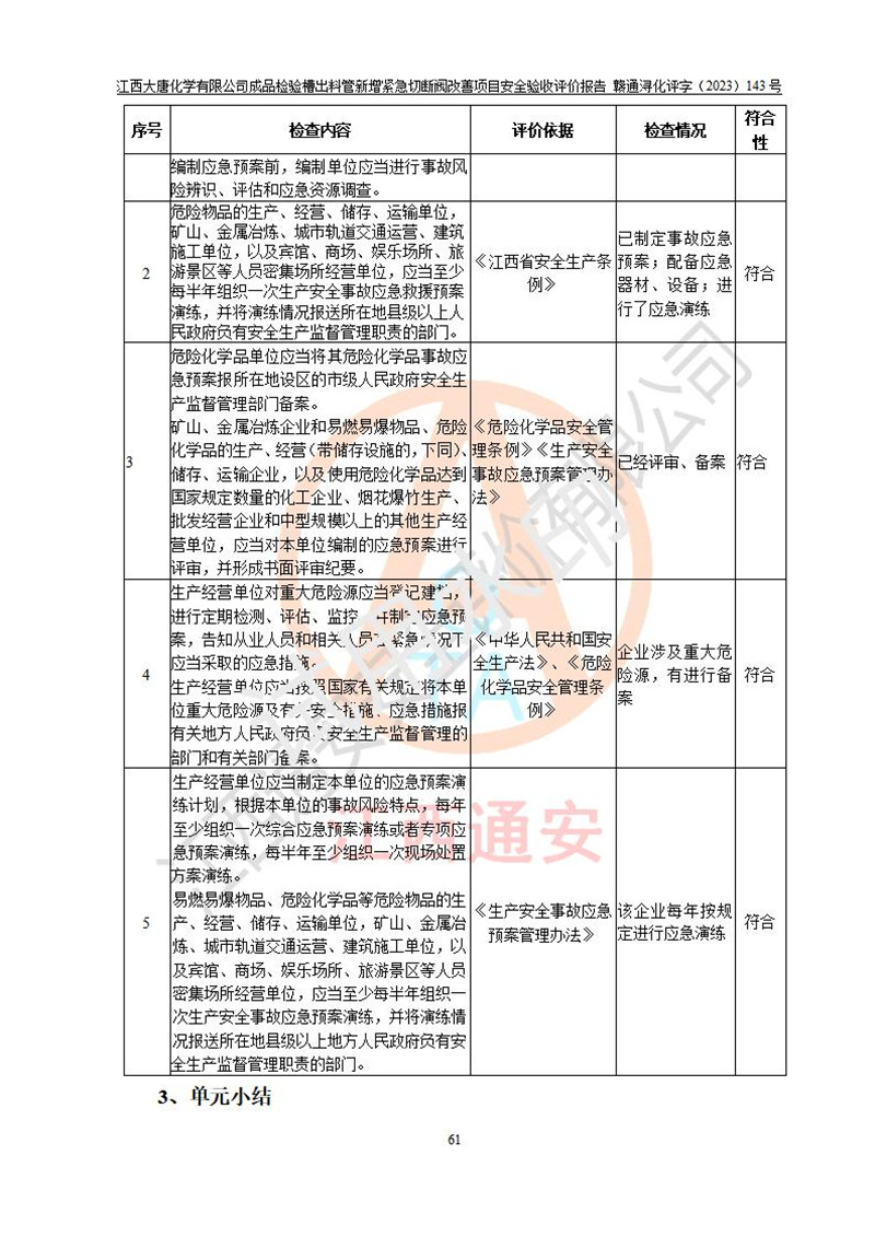 評價結(jié)論 | 江西大唐化學(xué)有限公司成品檢驗槽出料管新增緊急切斷閥改善項目已按設(shè)計要求得到落實,具備竣工安全驗收的條件。 | ||||