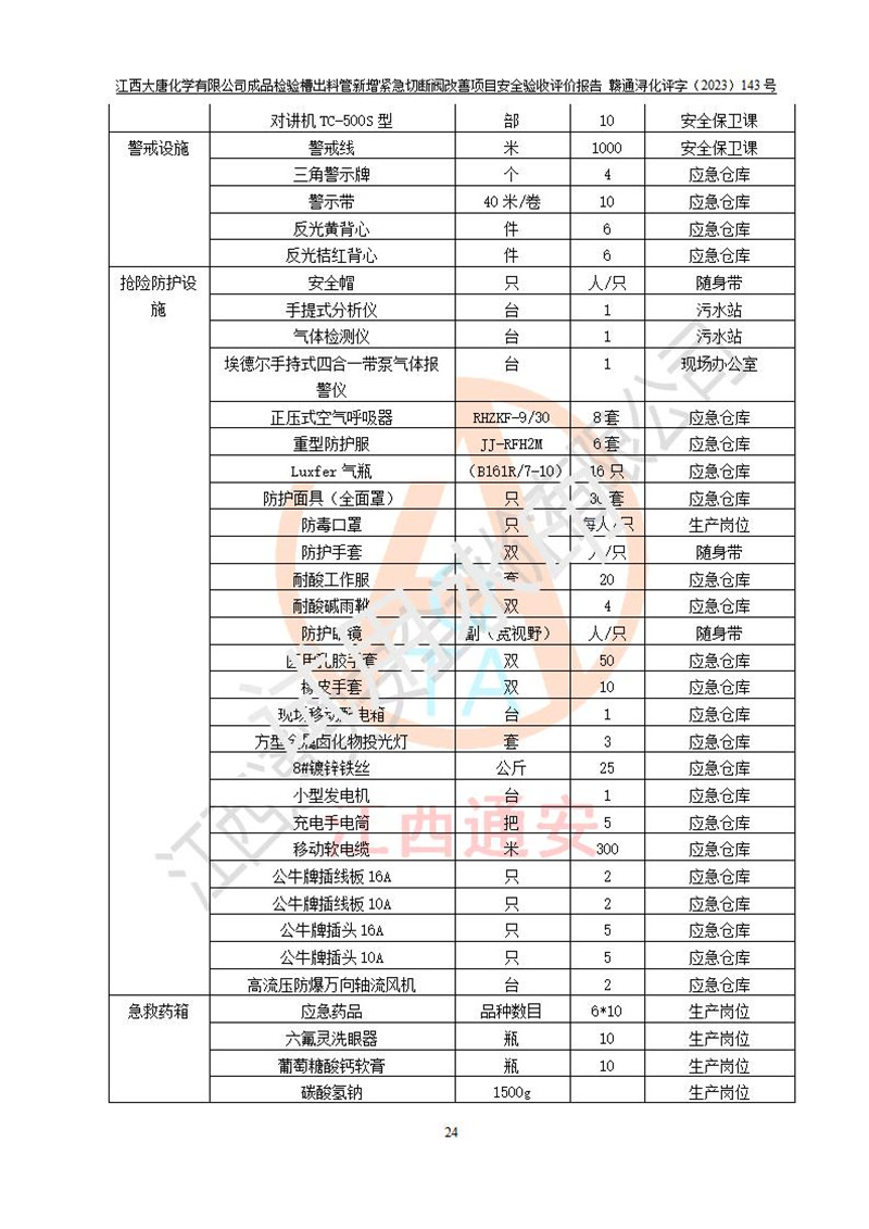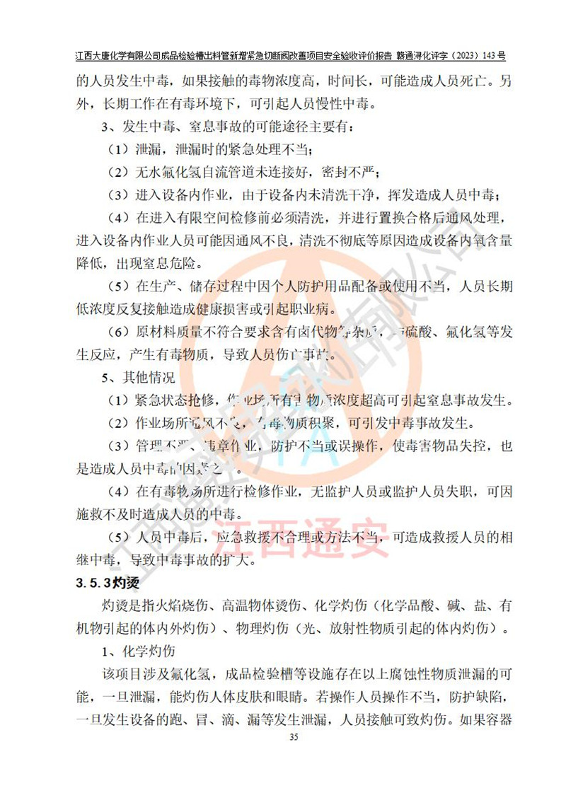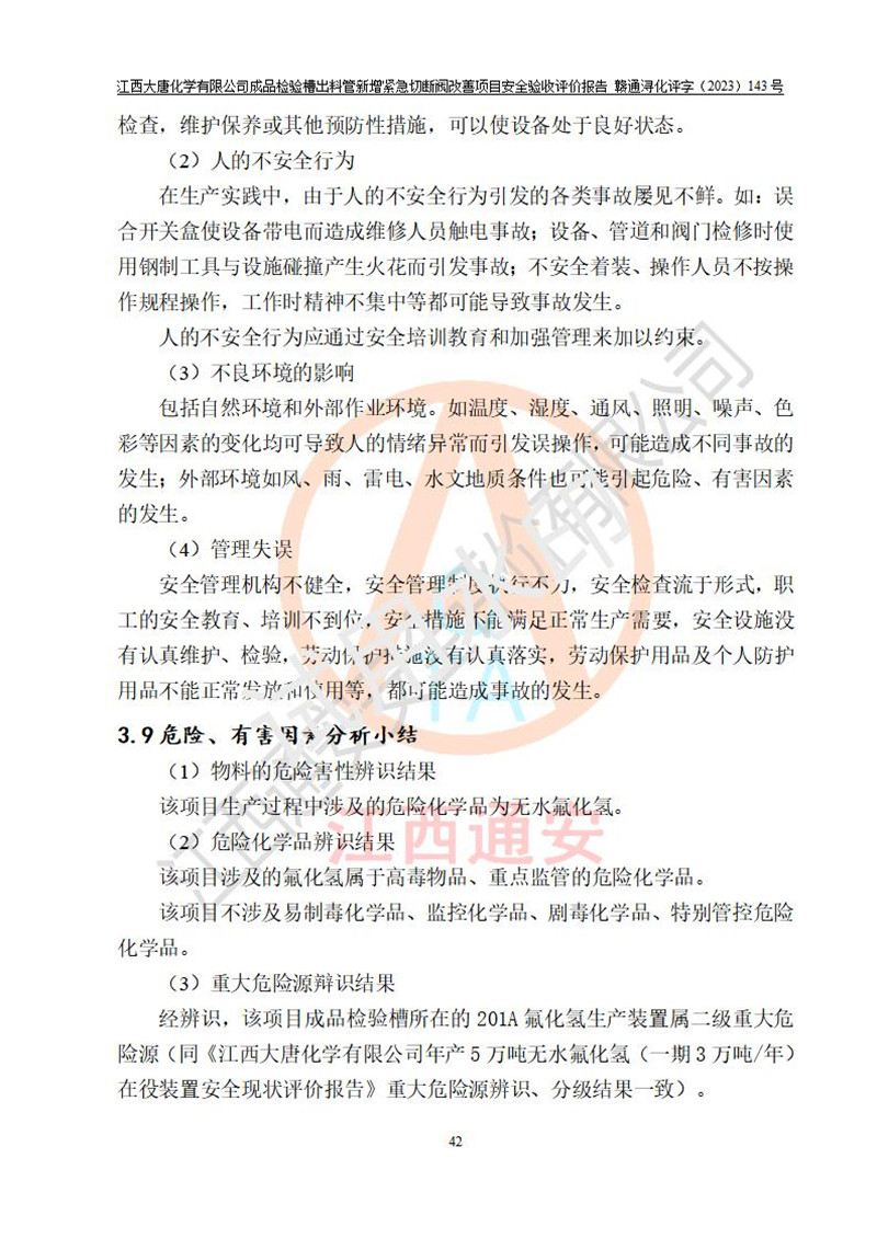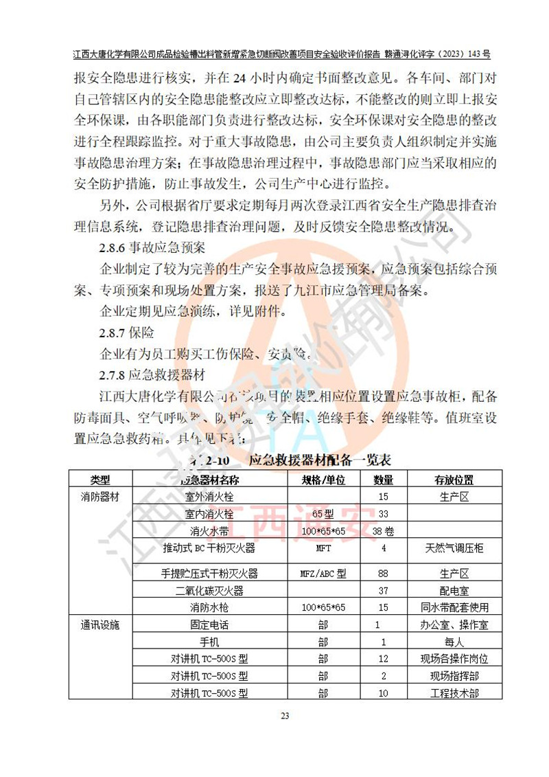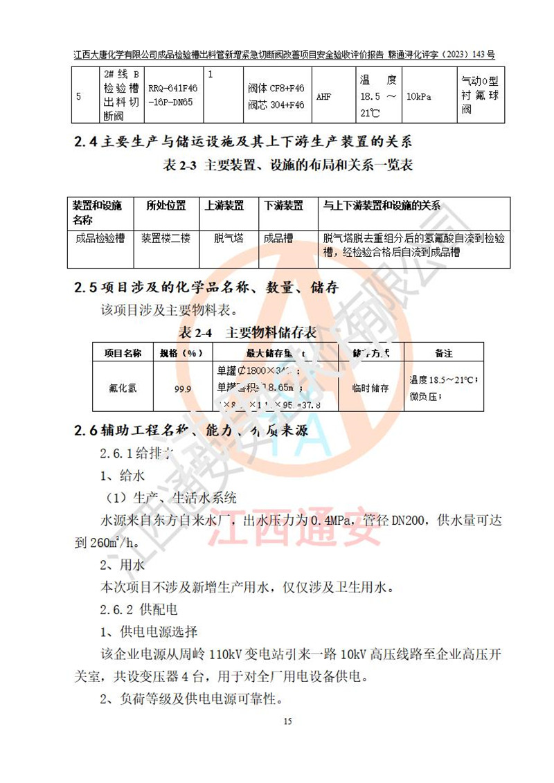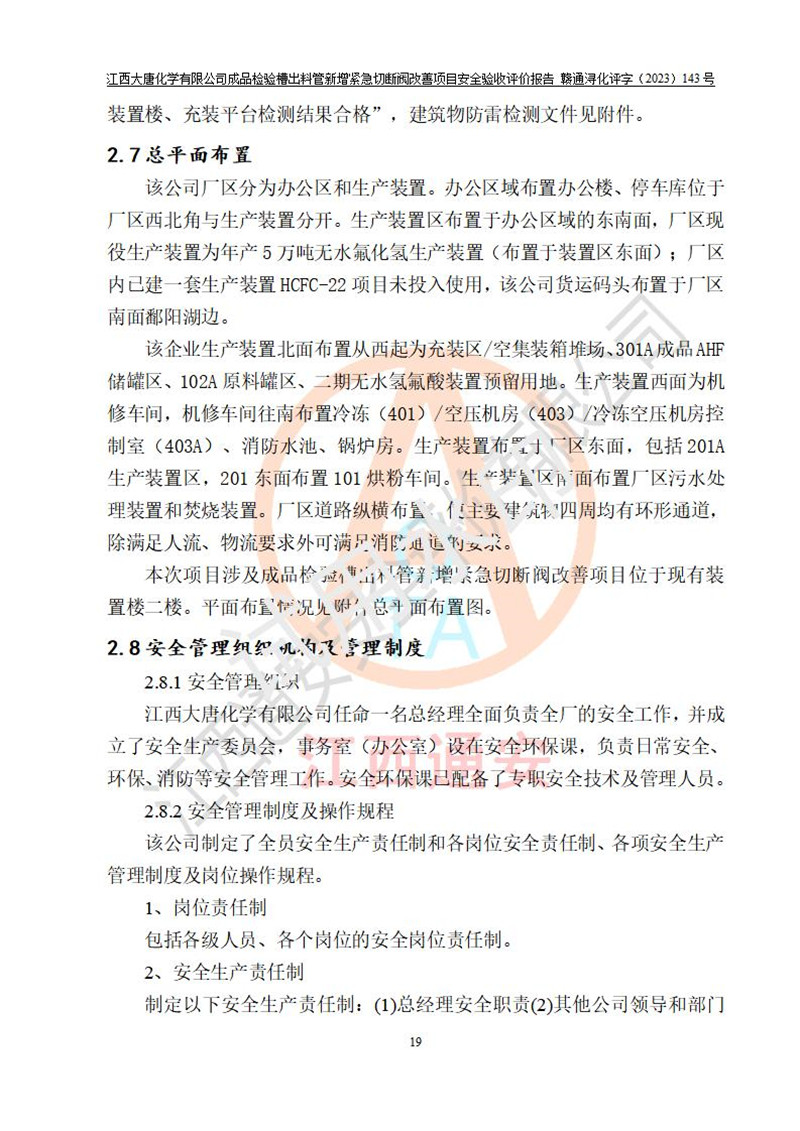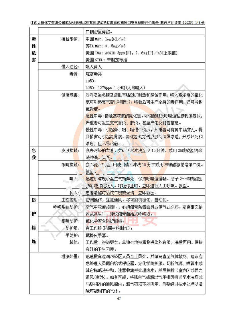 評價結(jié)論 | 江西大唐化學(xué)有限公司成品檢驗槽出料管新增緊急切斷閥改善項目已按設(shè)計要求得到落實,具備竣工安全驗收的條件。 | ||||