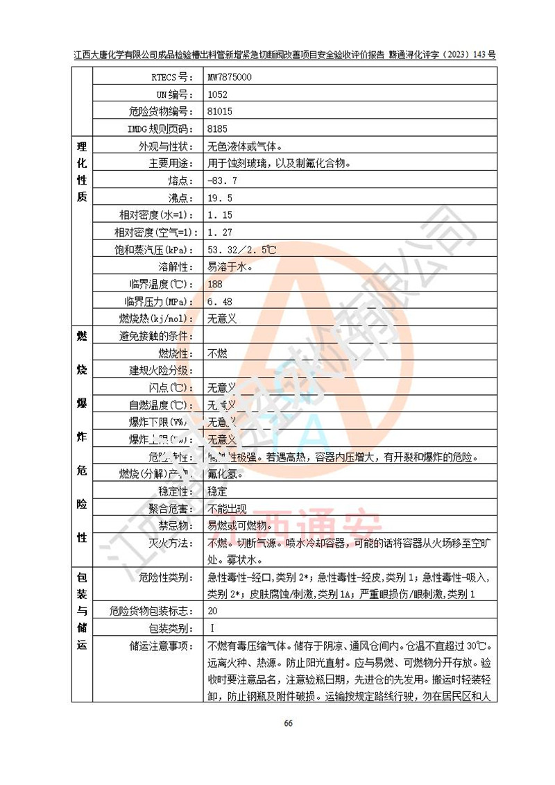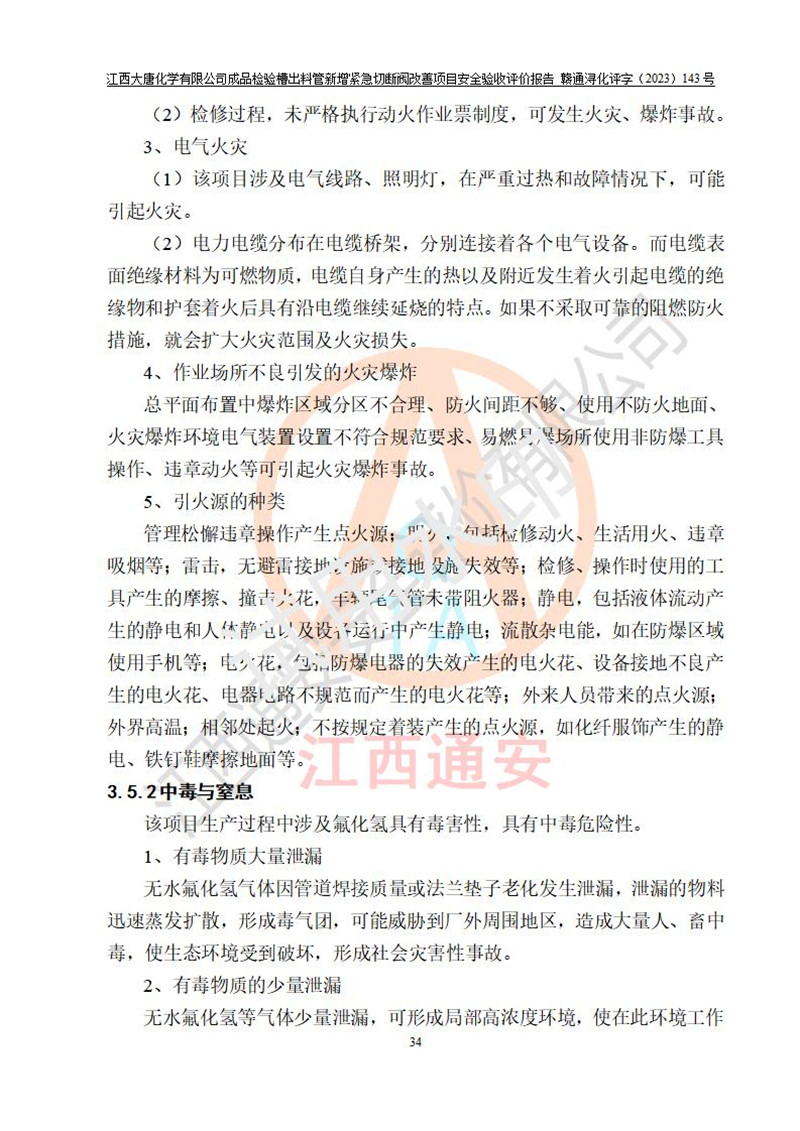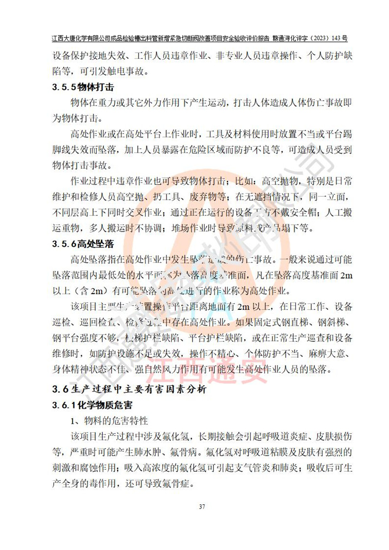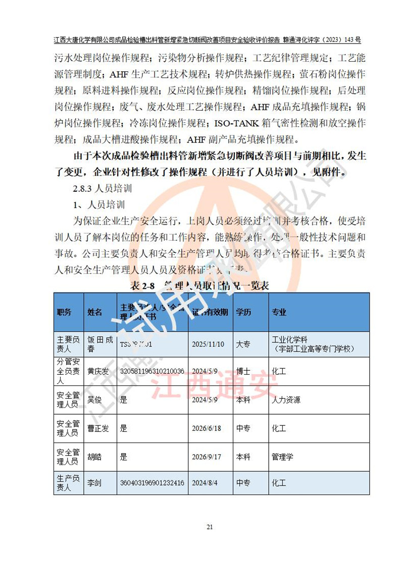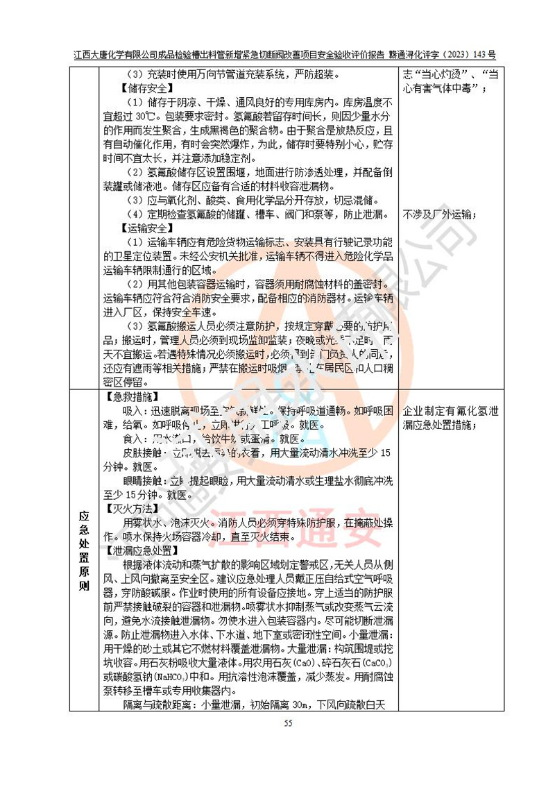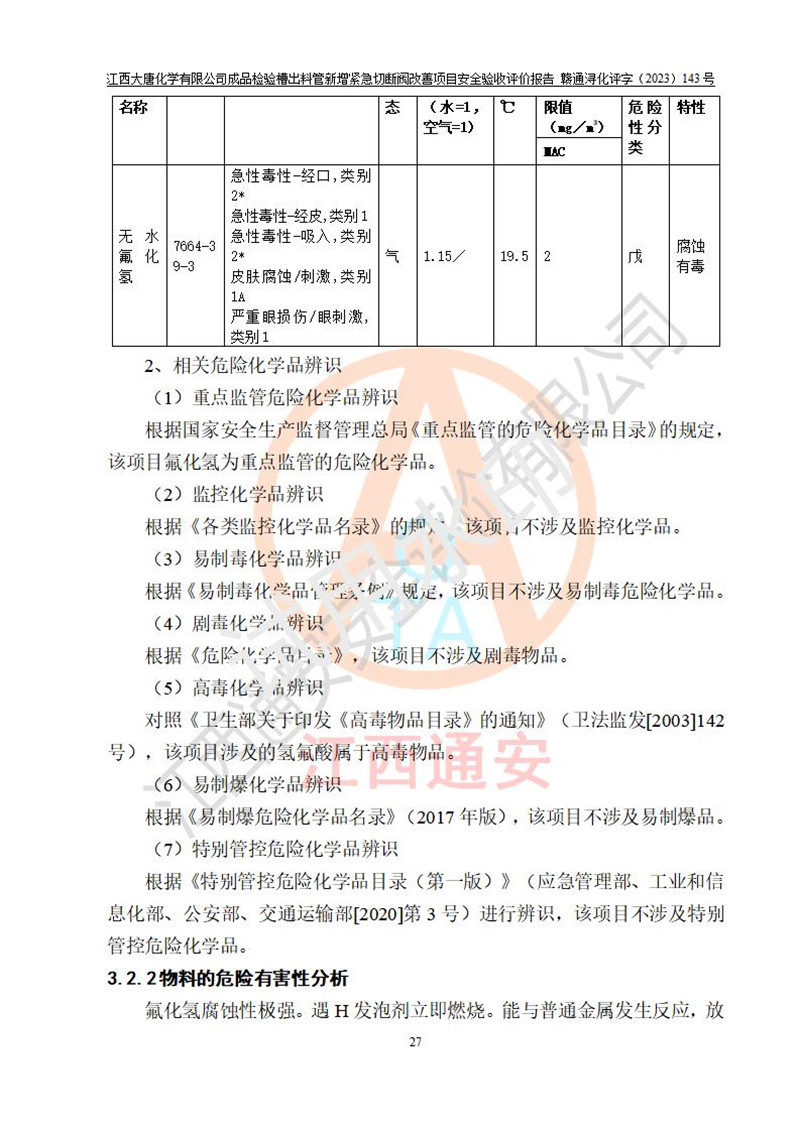 評價結(jié)論 | 江西大唐化學(xué)有限公司成品檢驗槽出料管新增緊急切斷閥改善項目已按設(shè)計要求得到落實,具備竣工安全驗收的條件。 | ||||