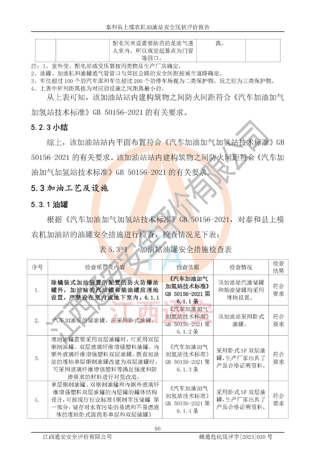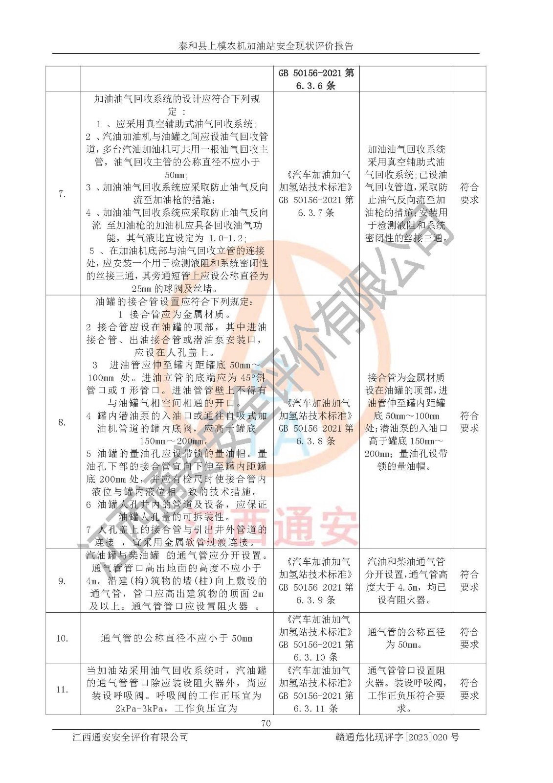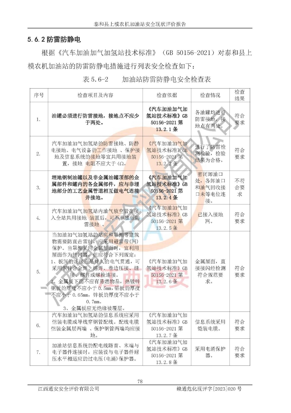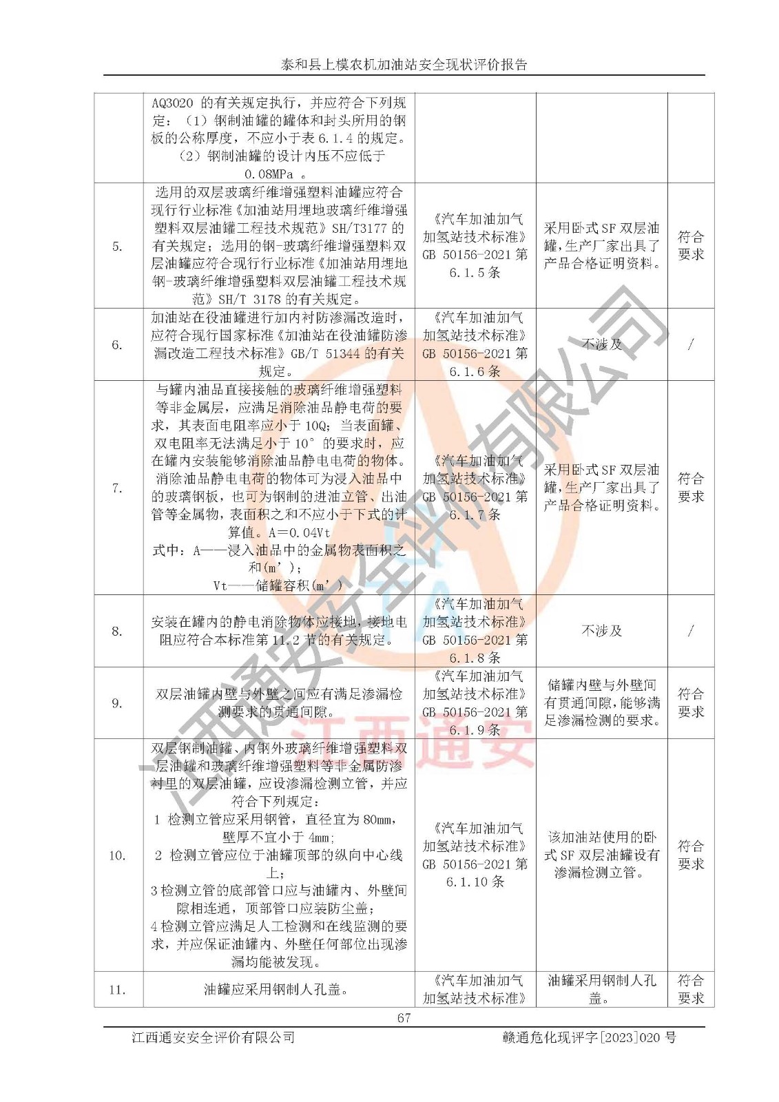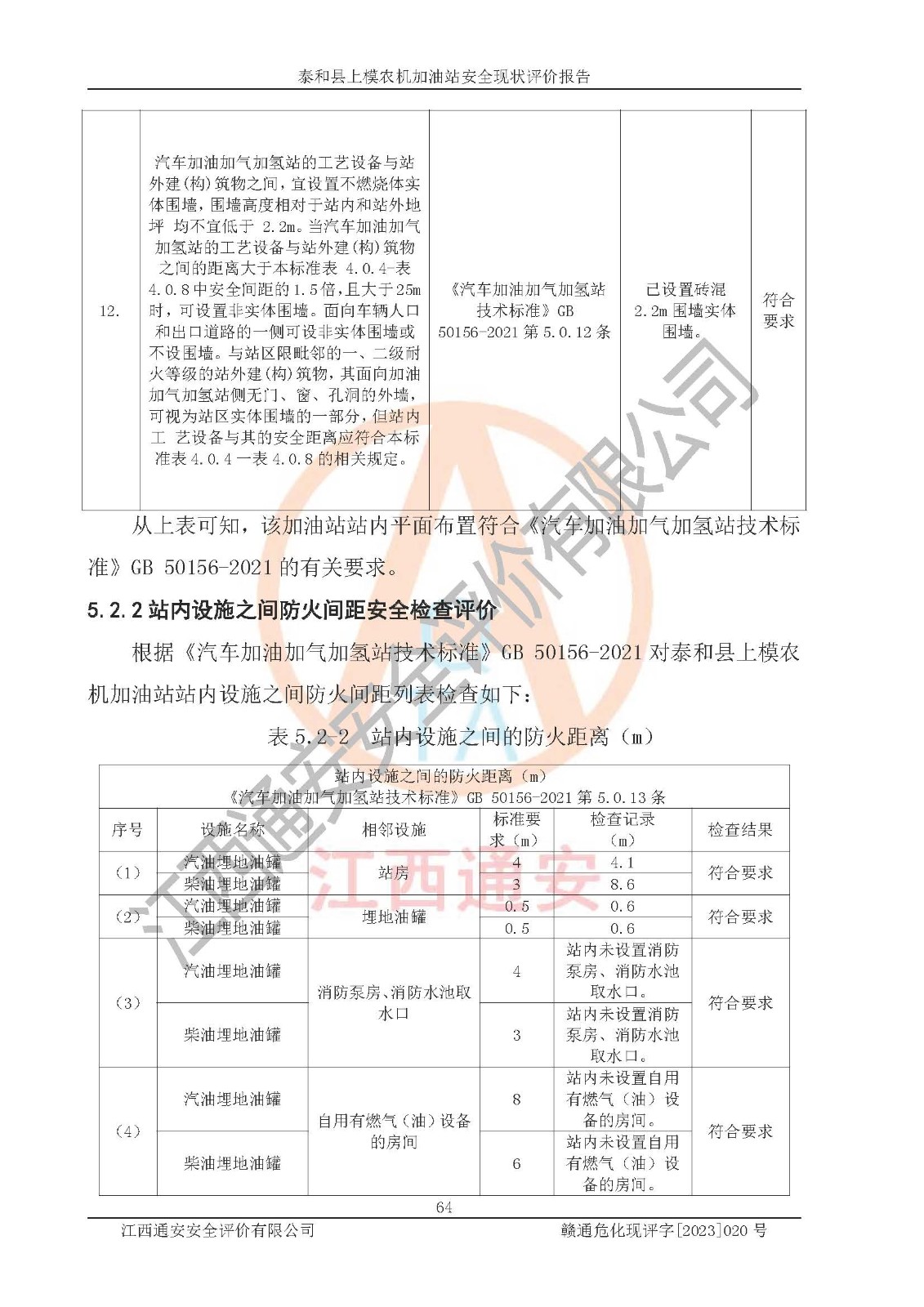 評(píng)價(jià)結(jié)論 | 泰和縣上模農(nóng)機(jī)加油站符合《汽車(chē)加油加氣加氫站技術(shù)標(biāo)準(zhǔn)》GB50156-2021等標(biāo)準(zhǔn)規(guī)范的要求,安全風(fēng)險(xiǎn)可控,滿足危險(xiǎn)化學(xué)品經(jīng)營(yíng)的安全條件。 | |||