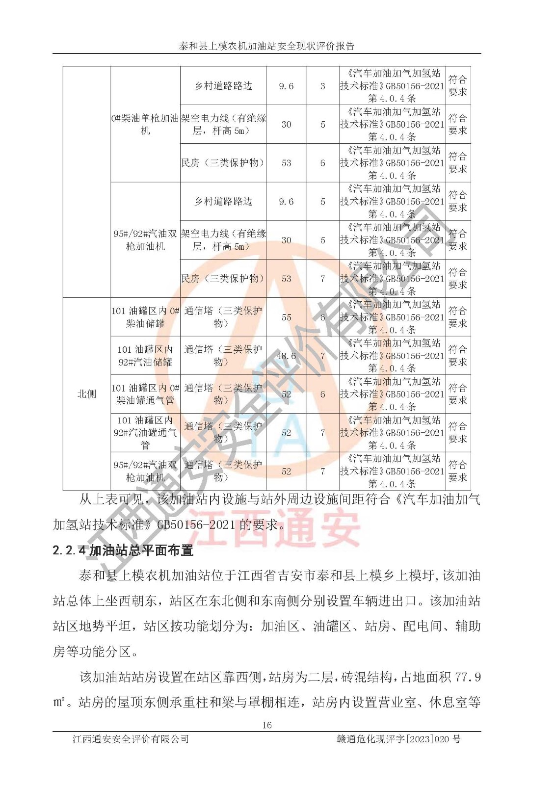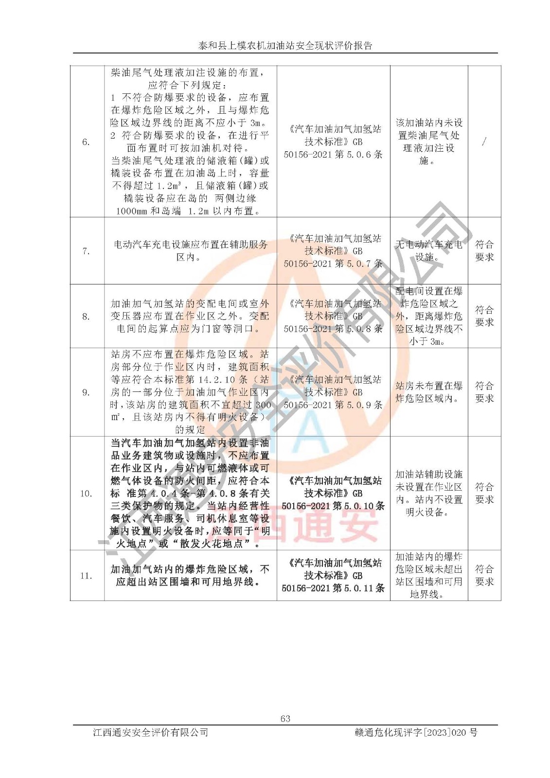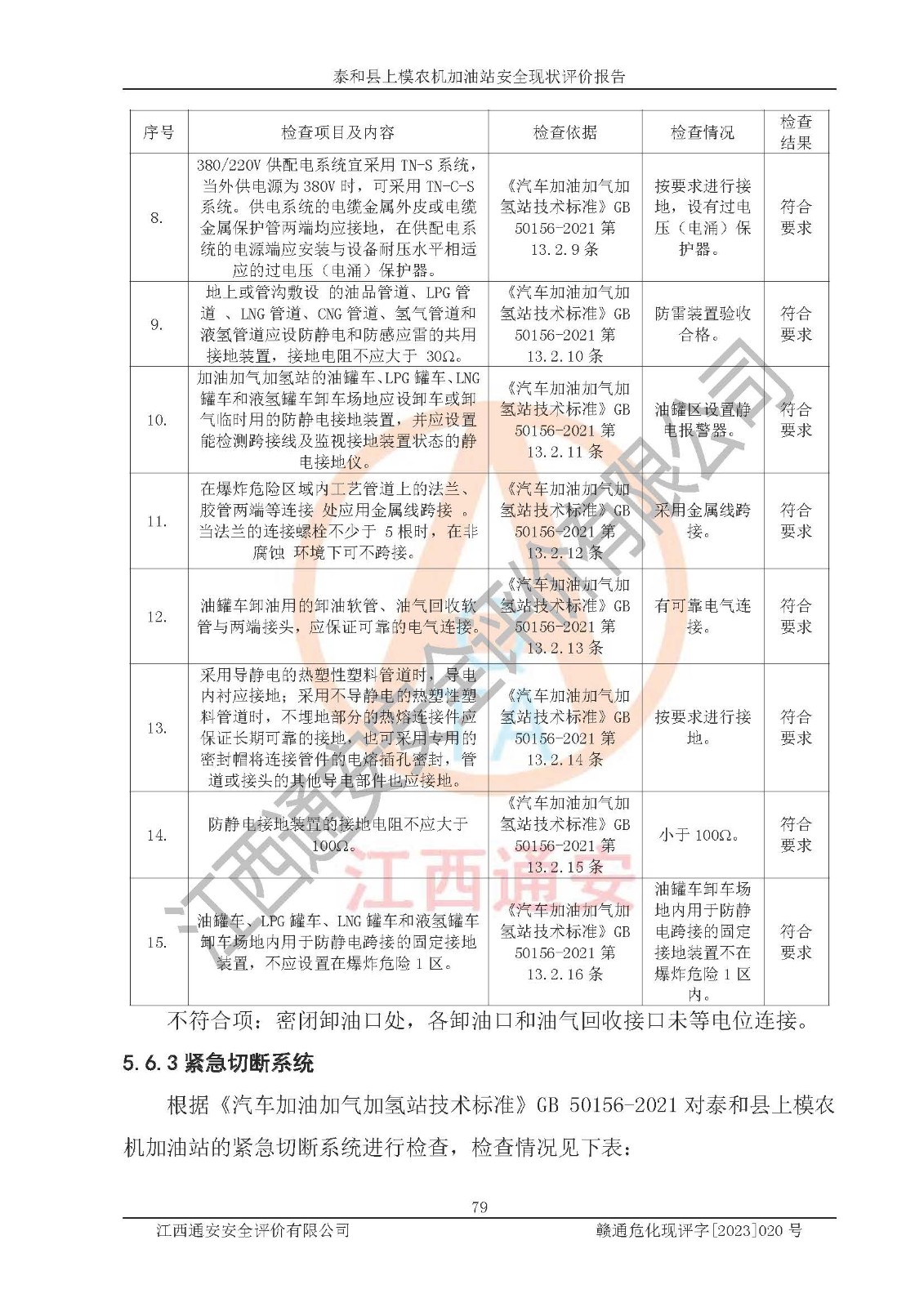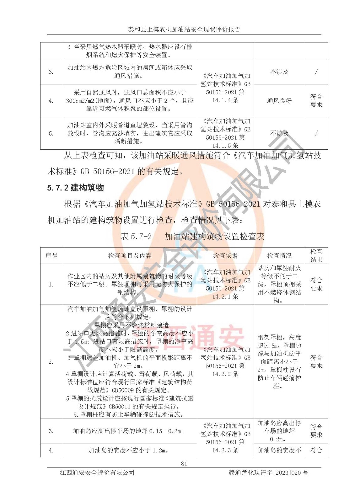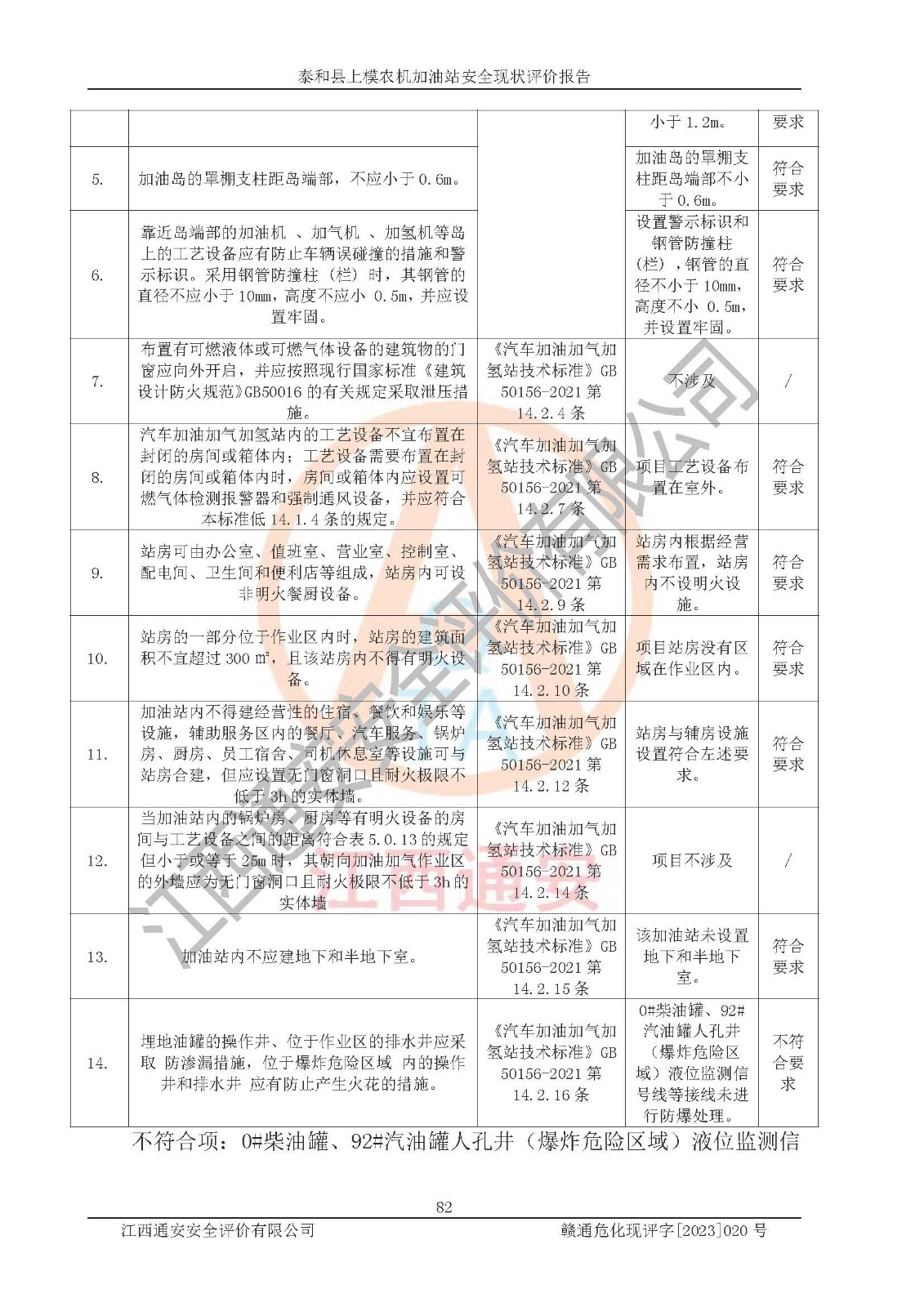 評(píng)價(jià)結(jié)論 | 泰和縣上模農(nóng)機(jī)加油站符合《汽車(chē)加油加氣加氫站技術(shù)標(biāo)準(zhǔn)》GB50156-2021等標(biāo)準(zhǔn)規(guī)范的要求,安全風(fēng)險(xiǎn)可控,滿足危險(xiǎn)化學(xué)品經(jīng)營(yíng)的安全條件。 | |||