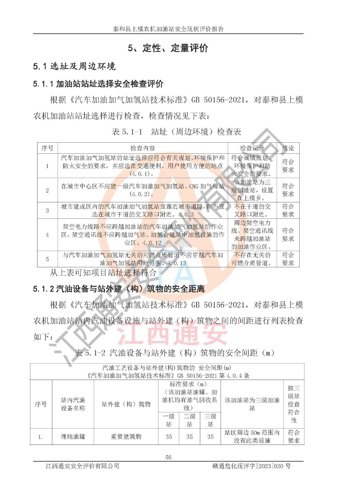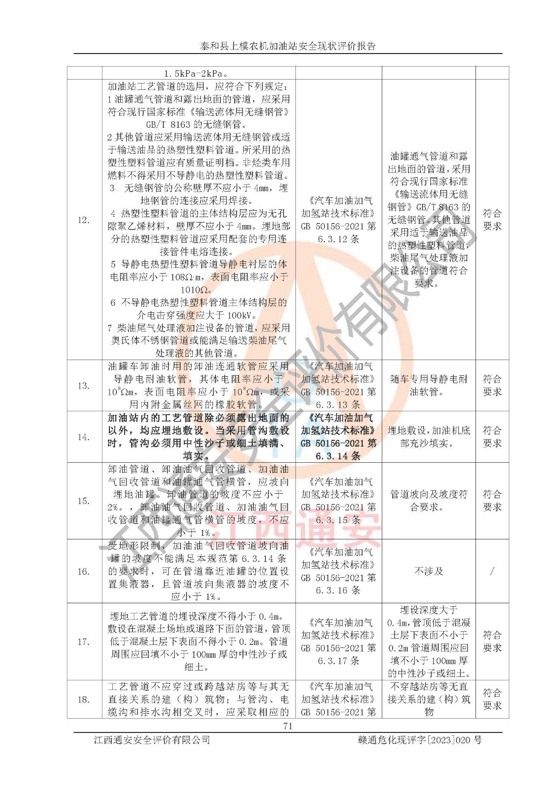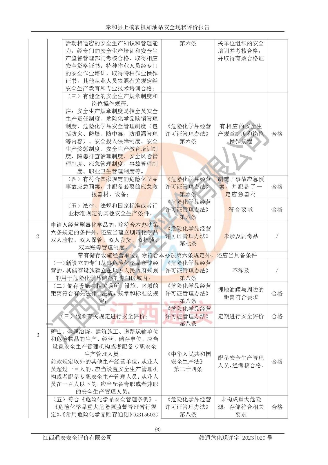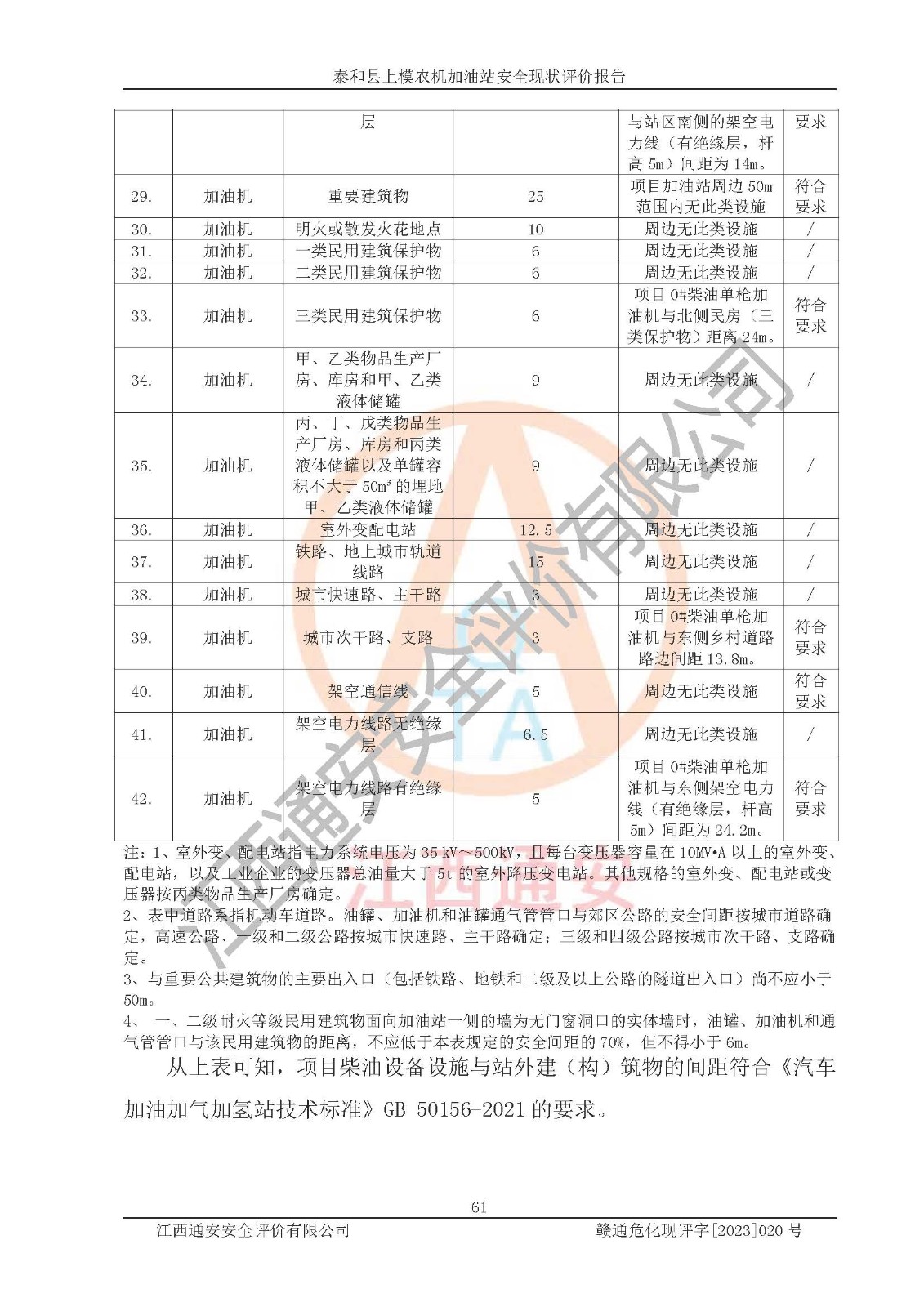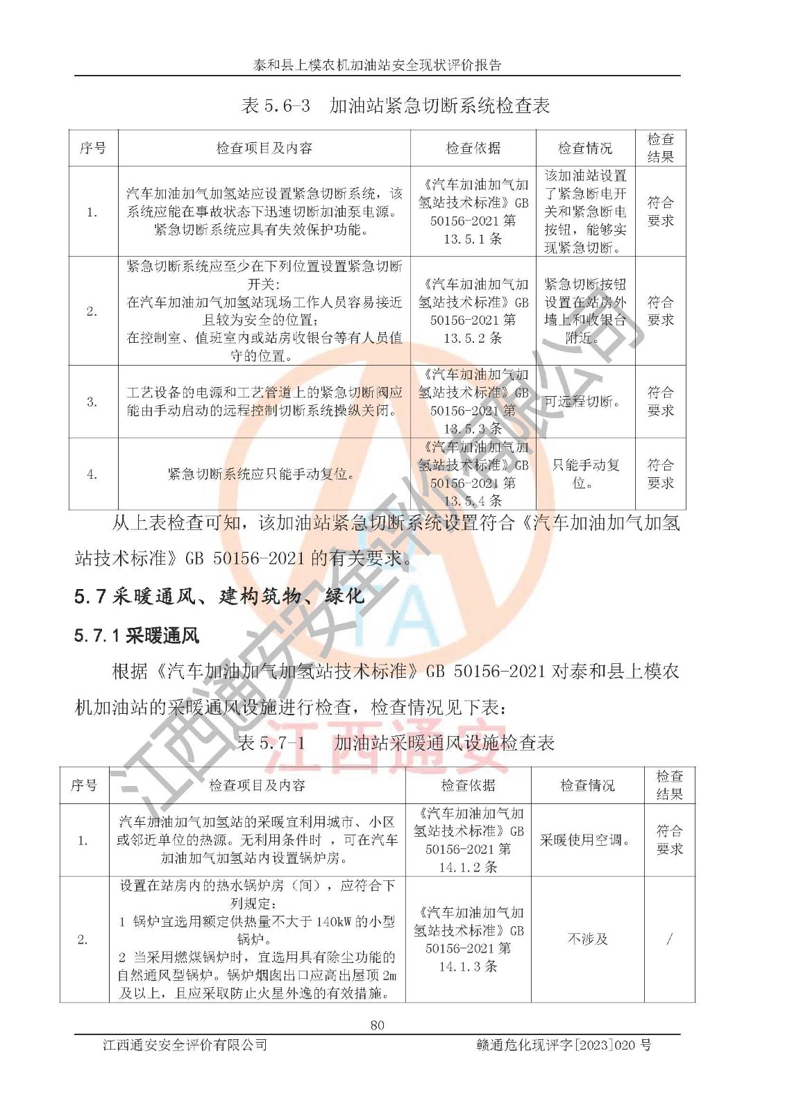 評(píng)價(jià)結(jié)論 | 泰和縣上模農(nóng)機(jī)加油站符合《汽車(chē)加油加氣加氫站技術(shù)標(biāo)準(zhǔn)》GB50156-2021等標(biāo)準(zhǔn)規(guī)范的要求,安全風(fēng)險(xiǎn)可控,滿足危險(xiǎn)化學(xué)品經(jīng)營(yíng)的安全條件。 | |||