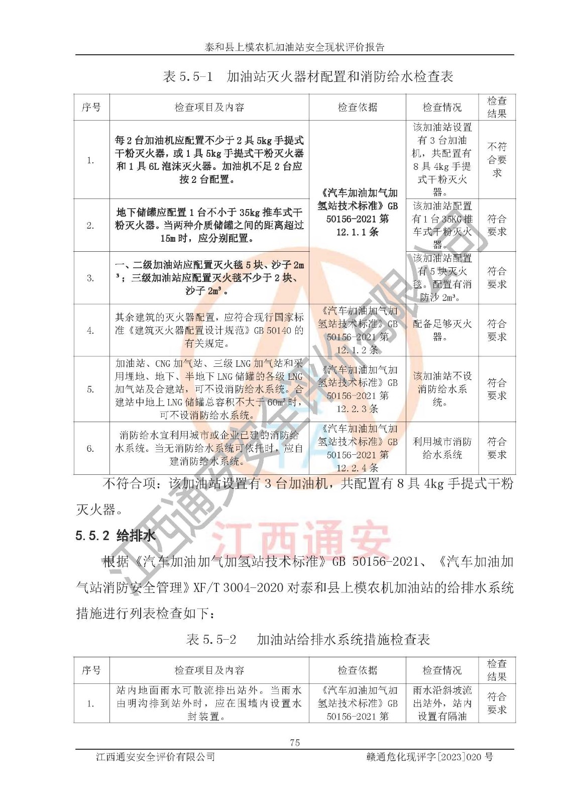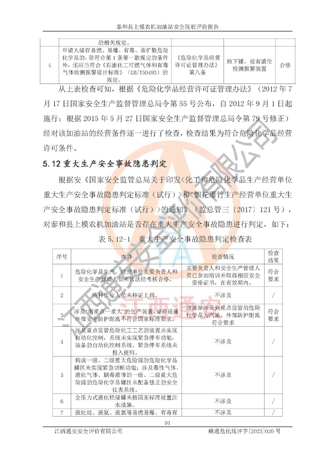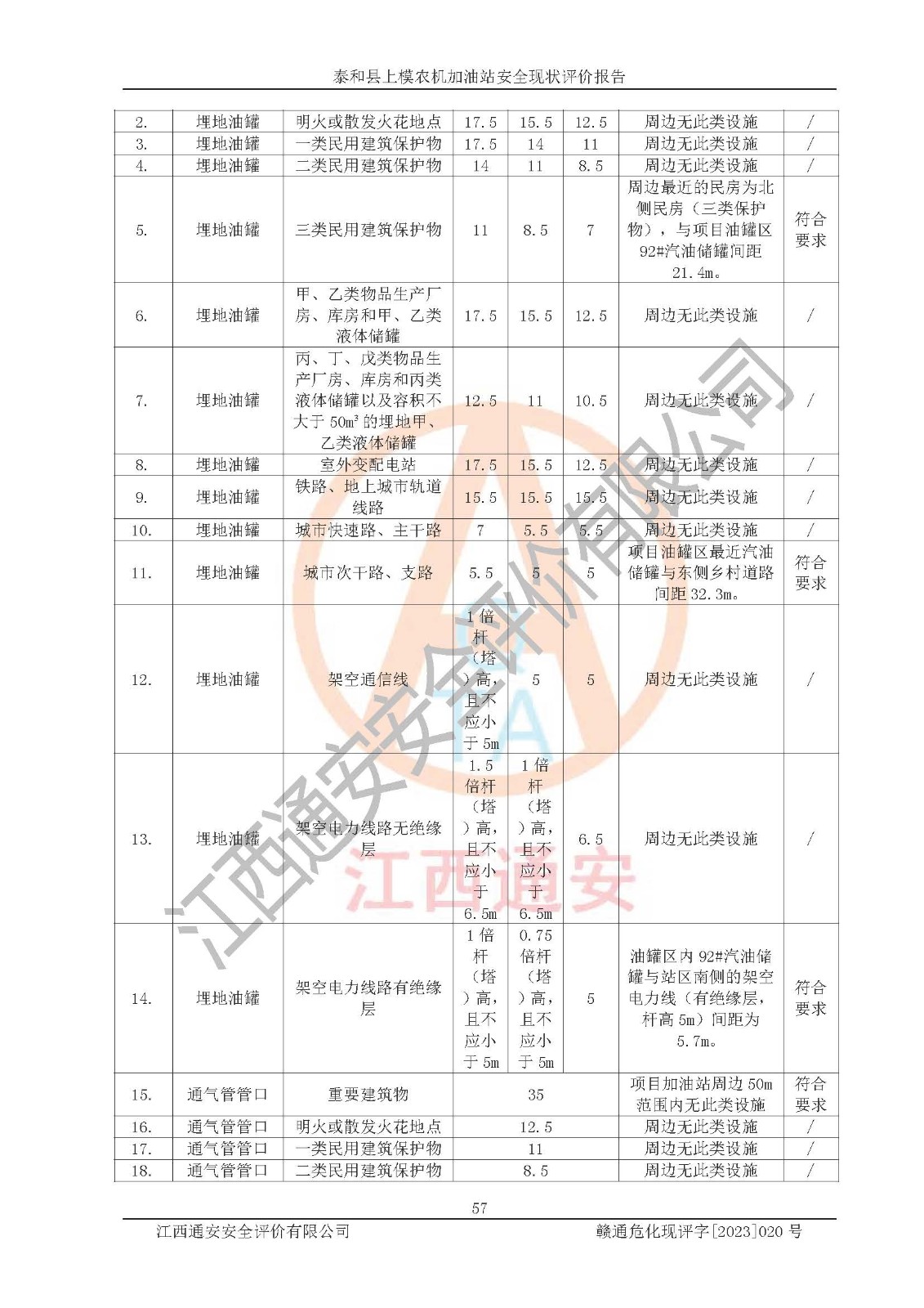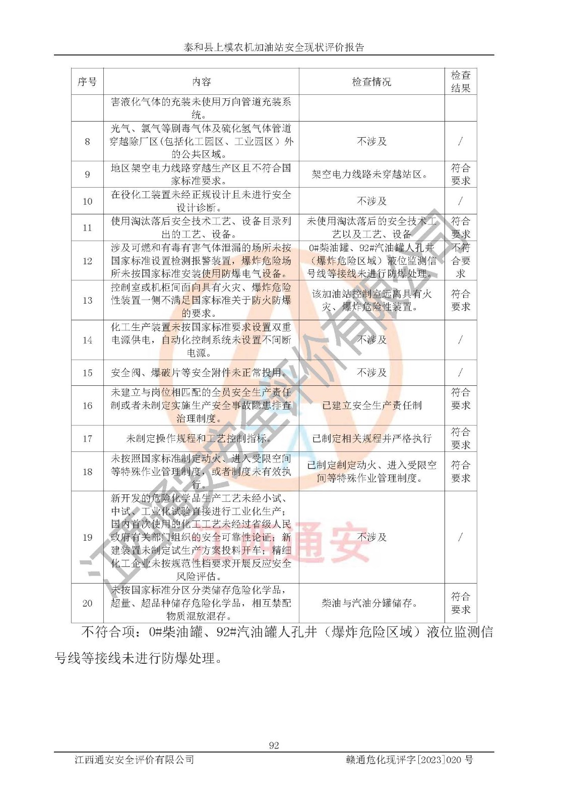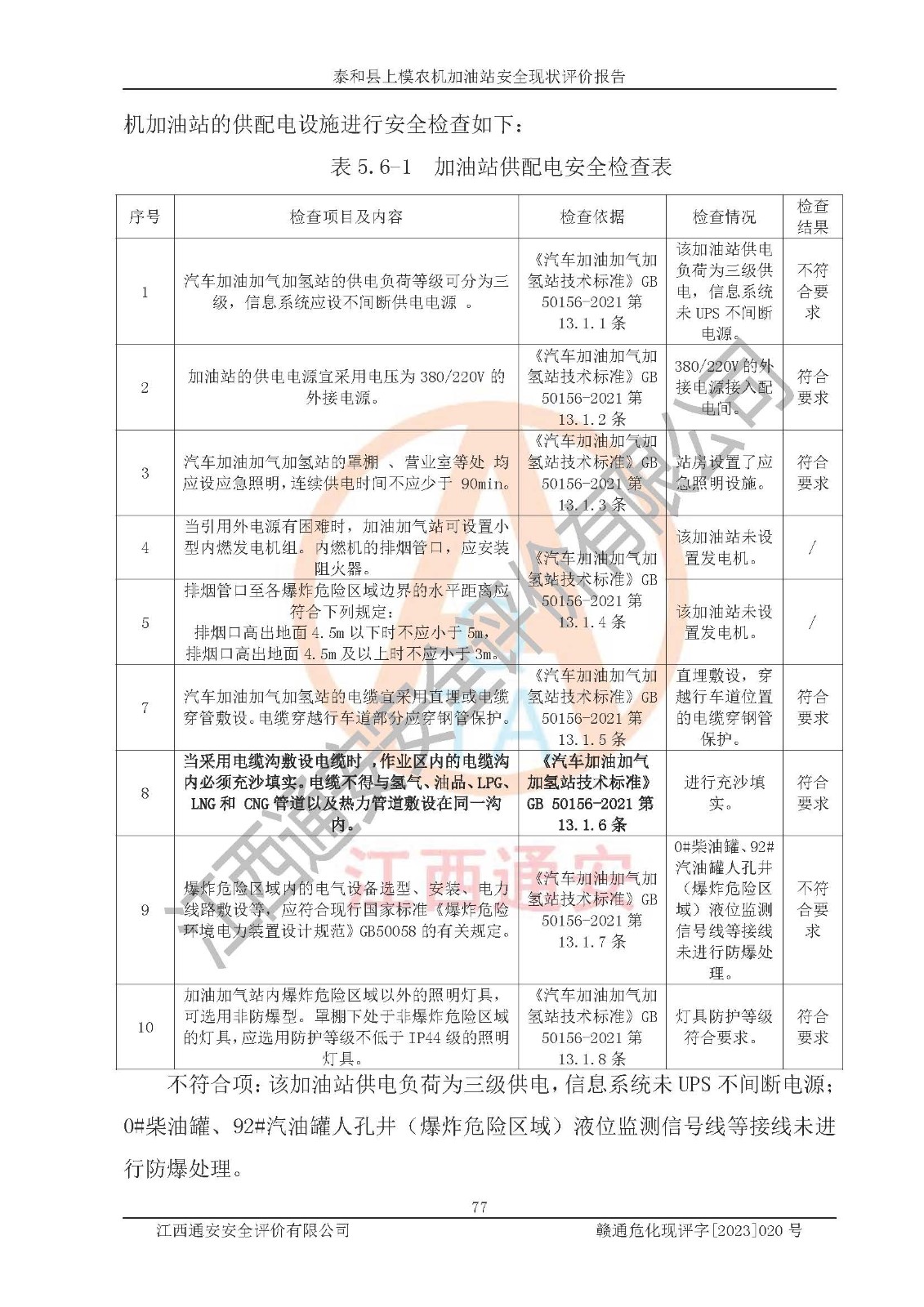 評(píng)價(jià)結(jié)論 | 泰和縣上模農(nóng)機(jī)加油站符合《汽車(chē)加油加氣加氫站技術(shù)標(biāo)準(zhǔn)》GB50156-2021等標(biāo)準(zhǔn)規(guī)范的要求,安全風(fēng)險(xiǎn)可控,滿足危險(xiǎn)化學(xué)品經(jīng)營(yíng)的安全條件。 | |||