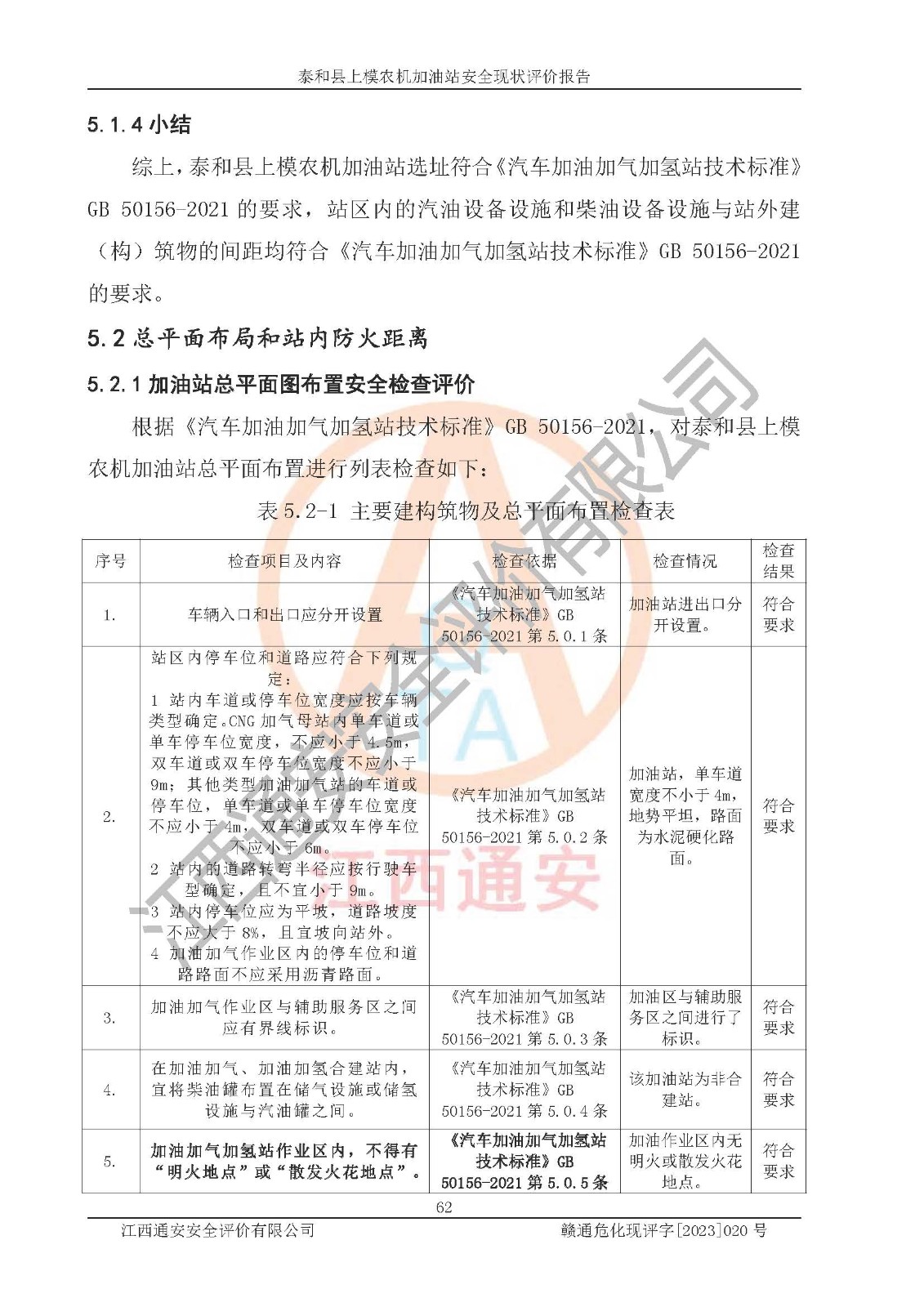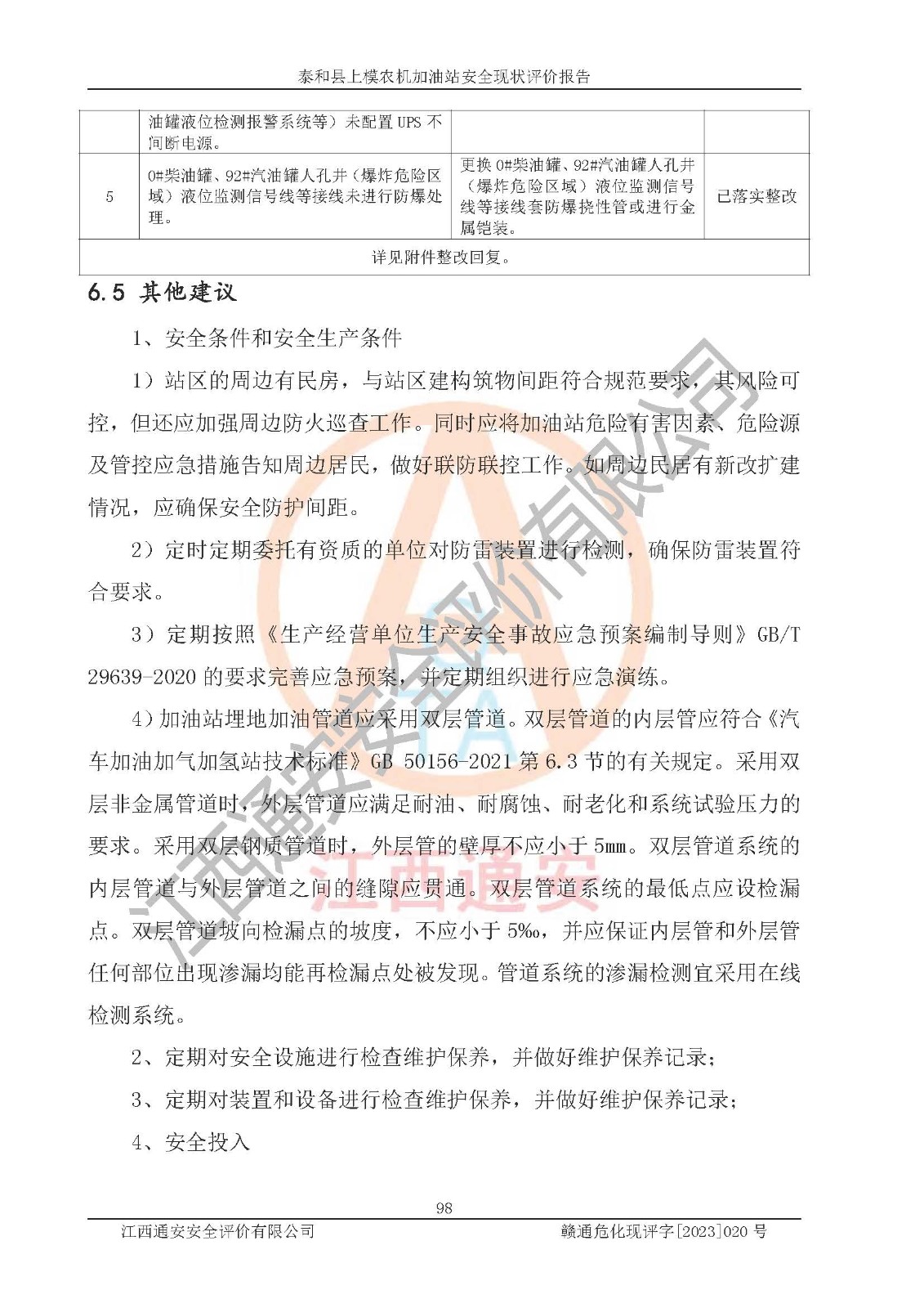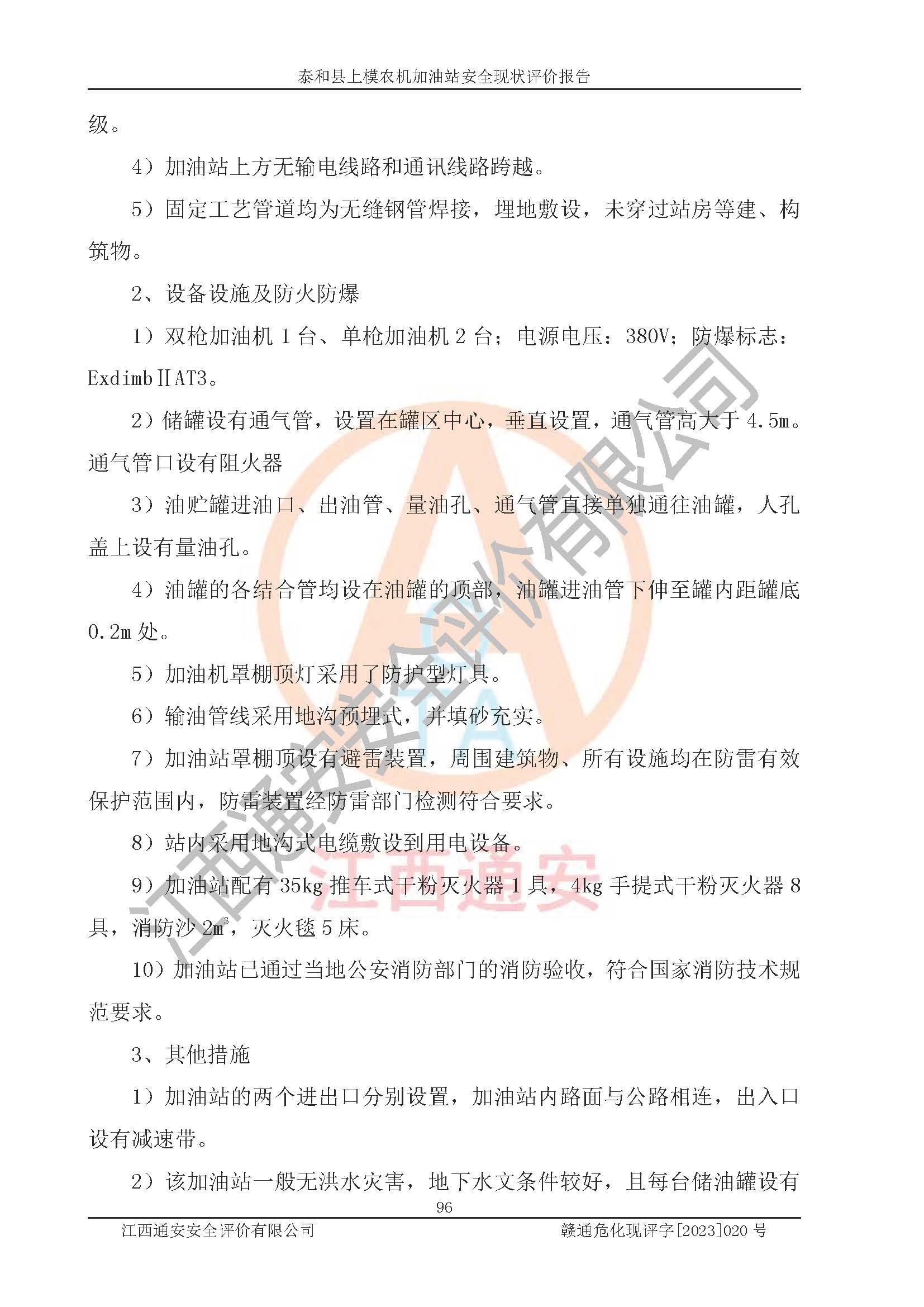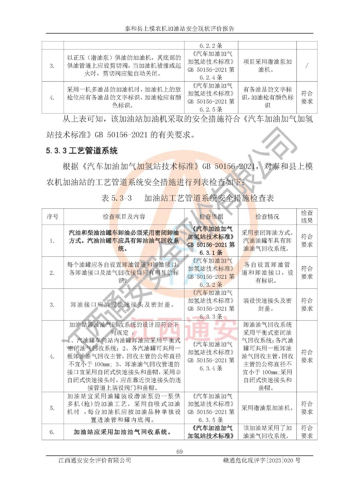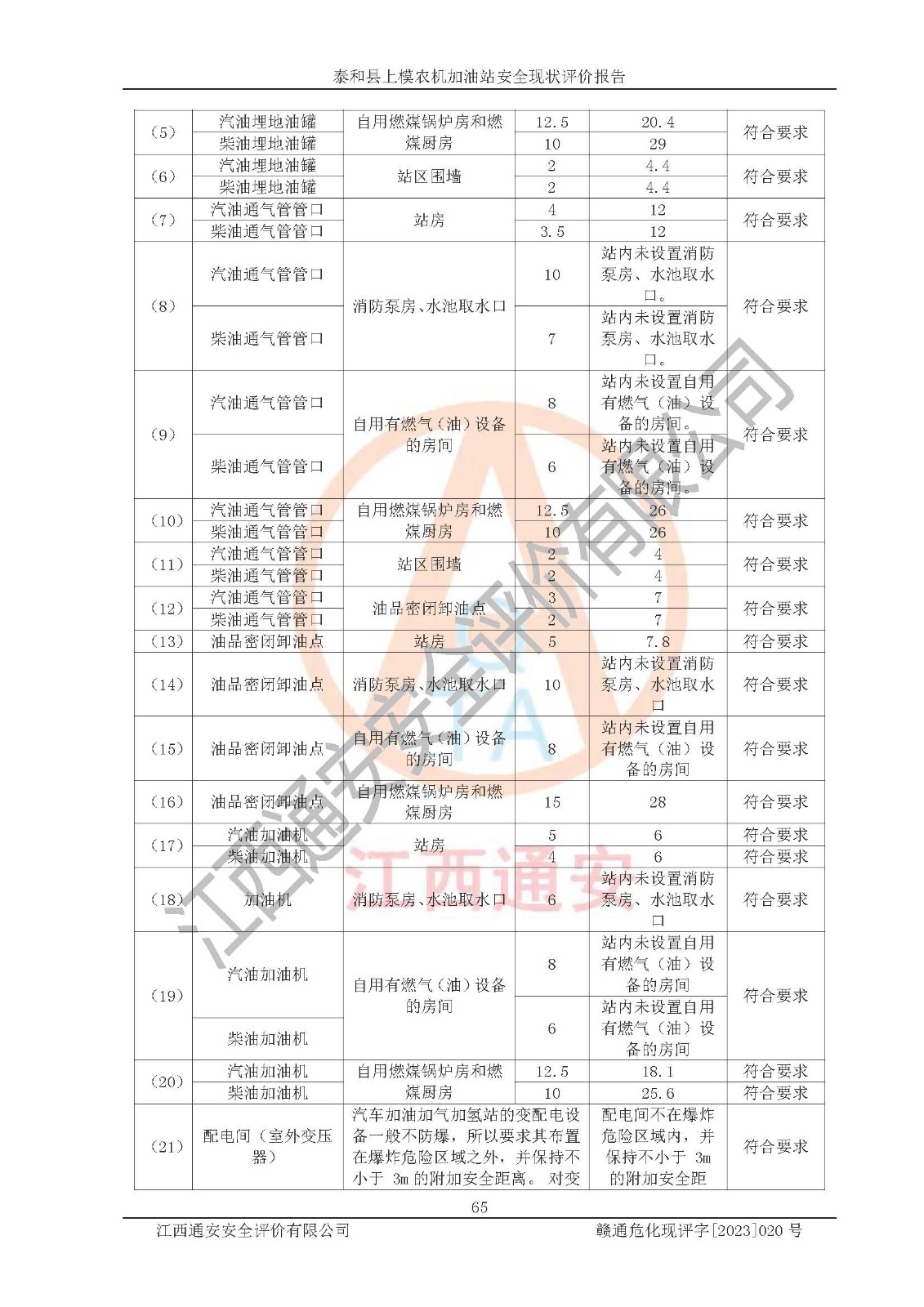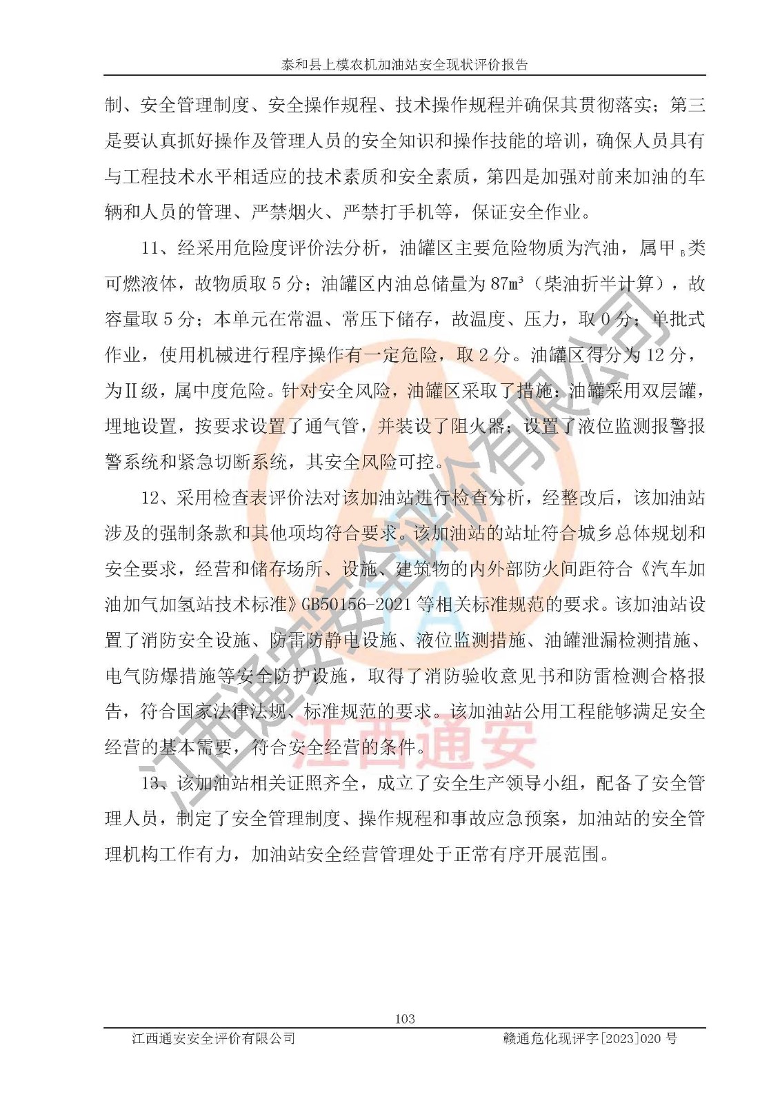 評(píng)價(jià)結(jié)論 | 泰和縣上模農(nóng)機(jī)加油站符合《汽車(chē)加油加氣加氫站技術(shù)標(biāo)準(zhǔn)》GB50156-2021等標(biāo)準(zhǔn)規(guī)范的要求,安全風(fēng)險(xiǎn)可控,滿足危險(xiǎn)化學(xué)品經(jīng)營(yíng)的安全條件。 | |||