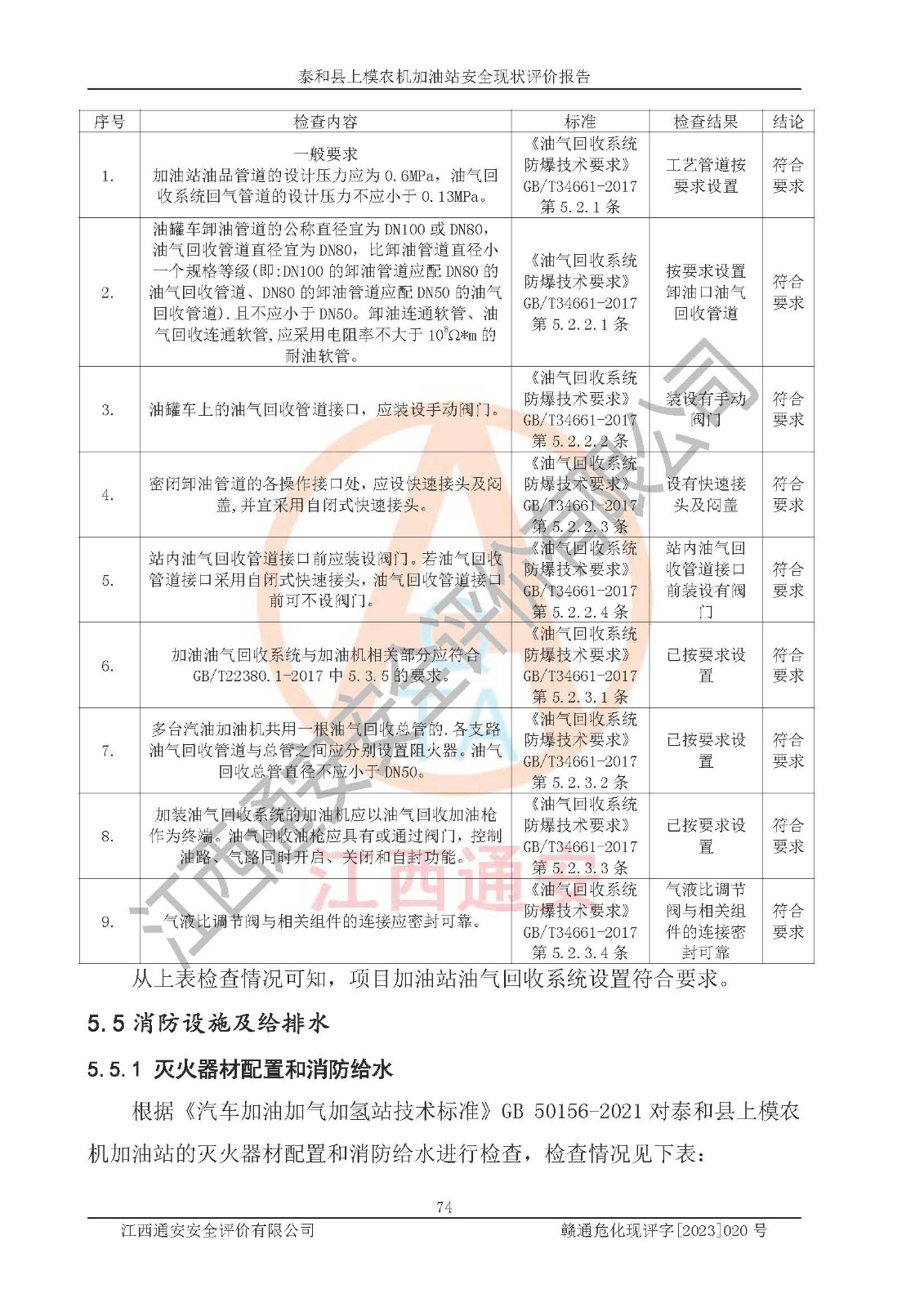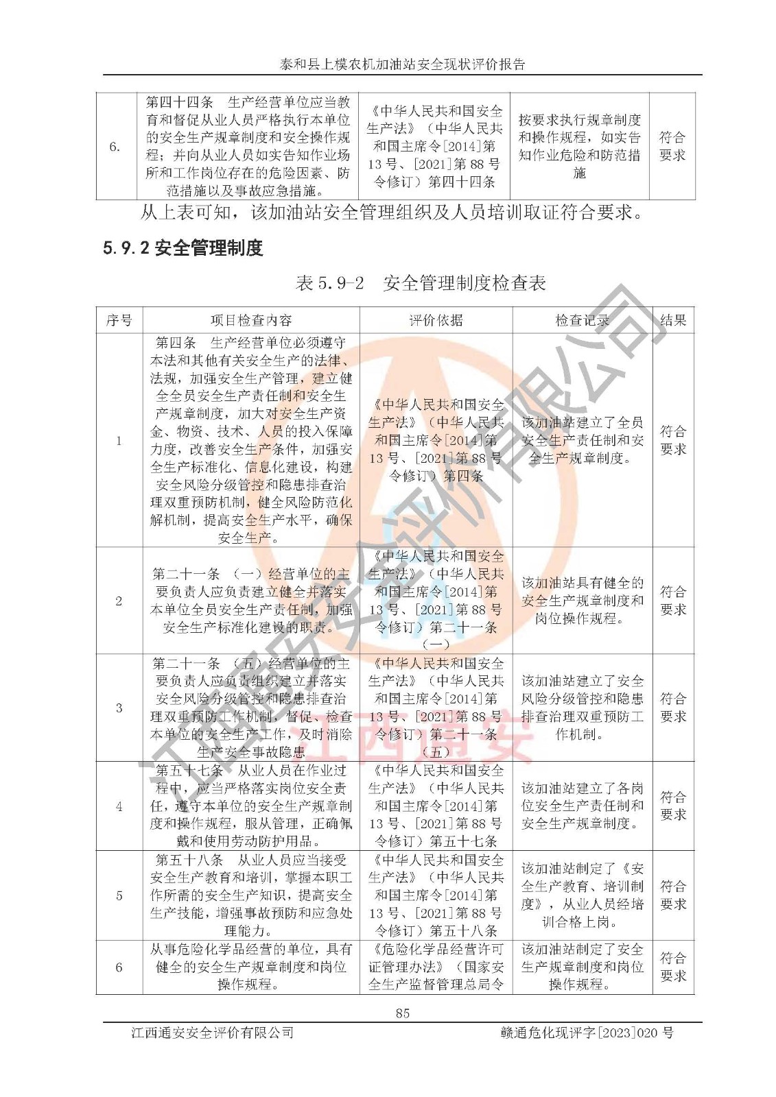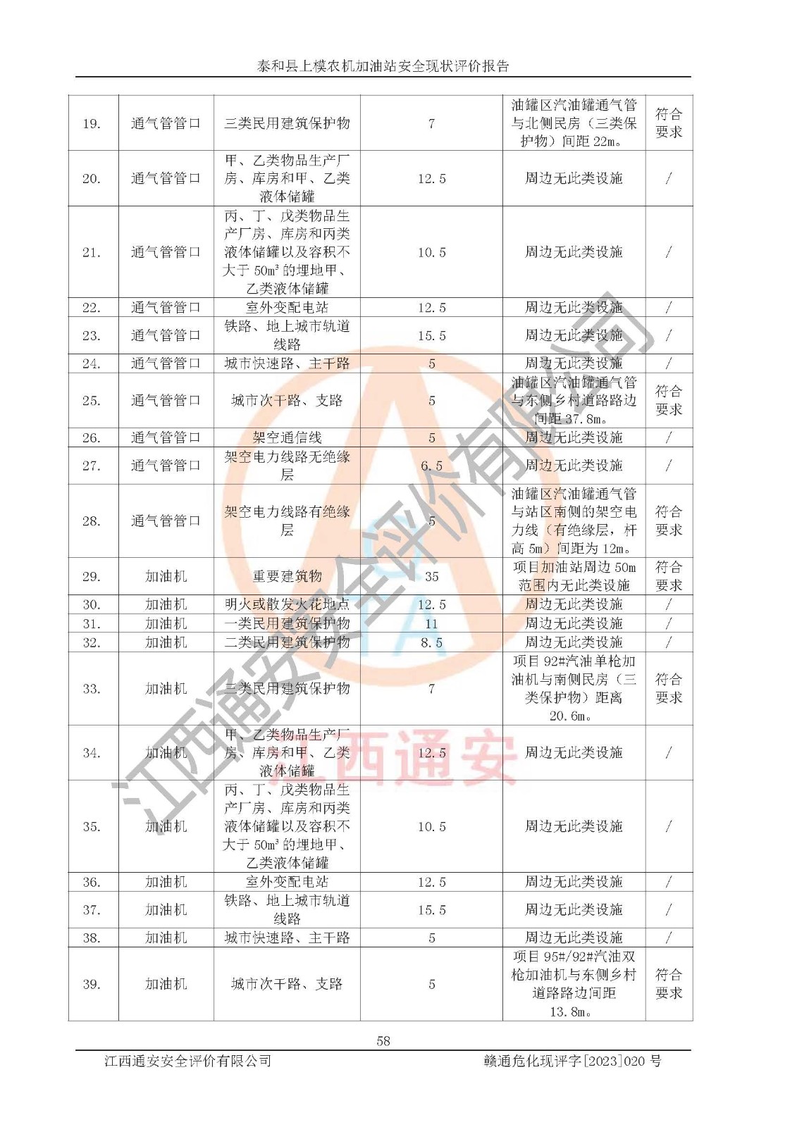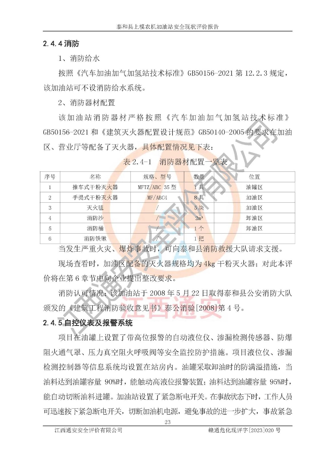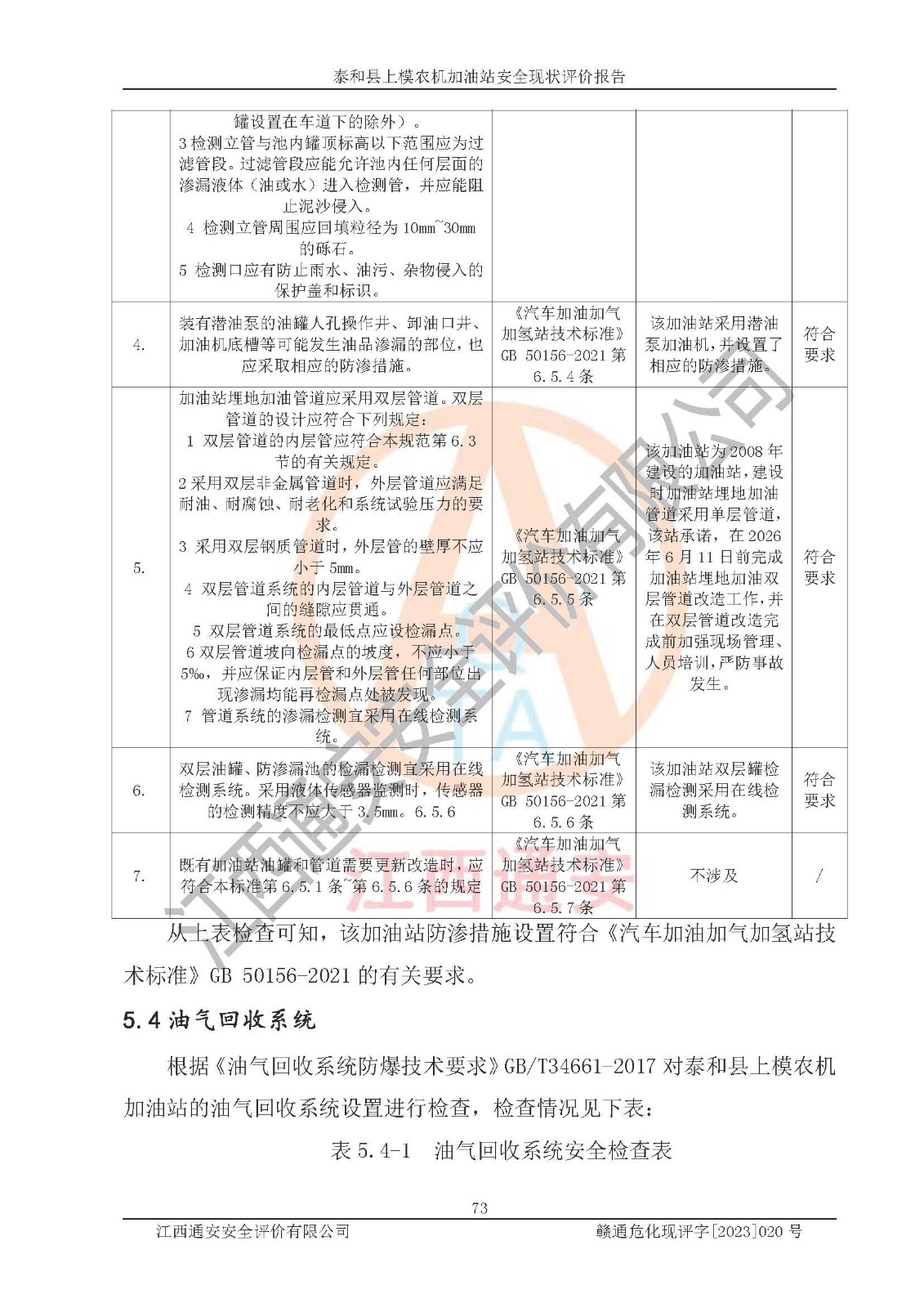 評(píng)價(jià)結(jié)論 | 泰和縣上模農(nóng)機(jī)加油站符合《汽車(chē)加油加氣加氫站技術(shù)標(biāo)準(zhǔn)》GB50156-2021等標(biāo)準(zhǔn)規(guī)范的要求,安全風(fēng)險(xiǎn)可控,滿足危險(xiǎn)化學(xué)品經(jīng)營(yíng)的安全條件。 | |||