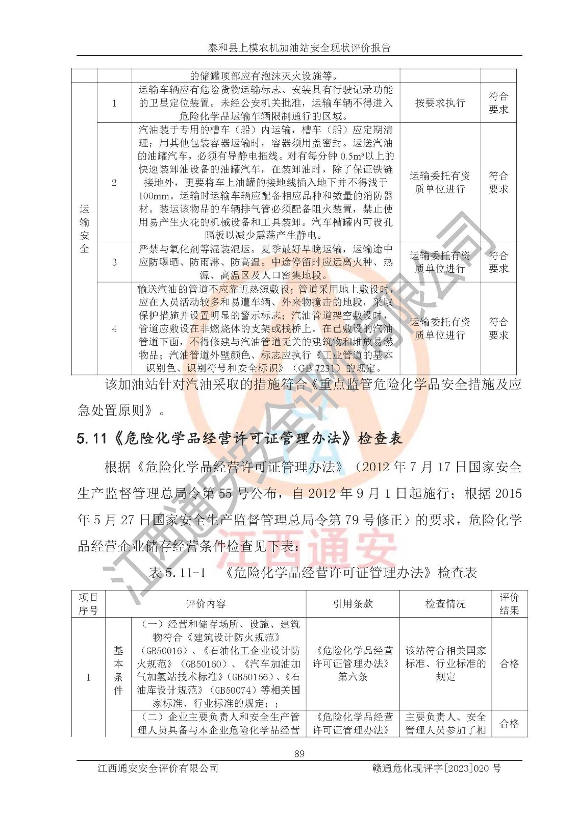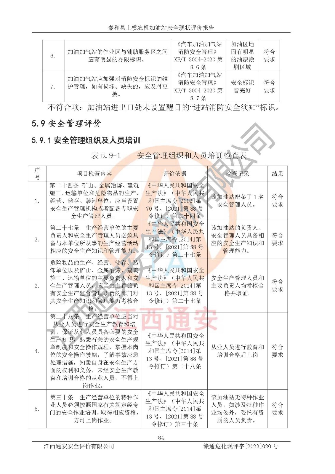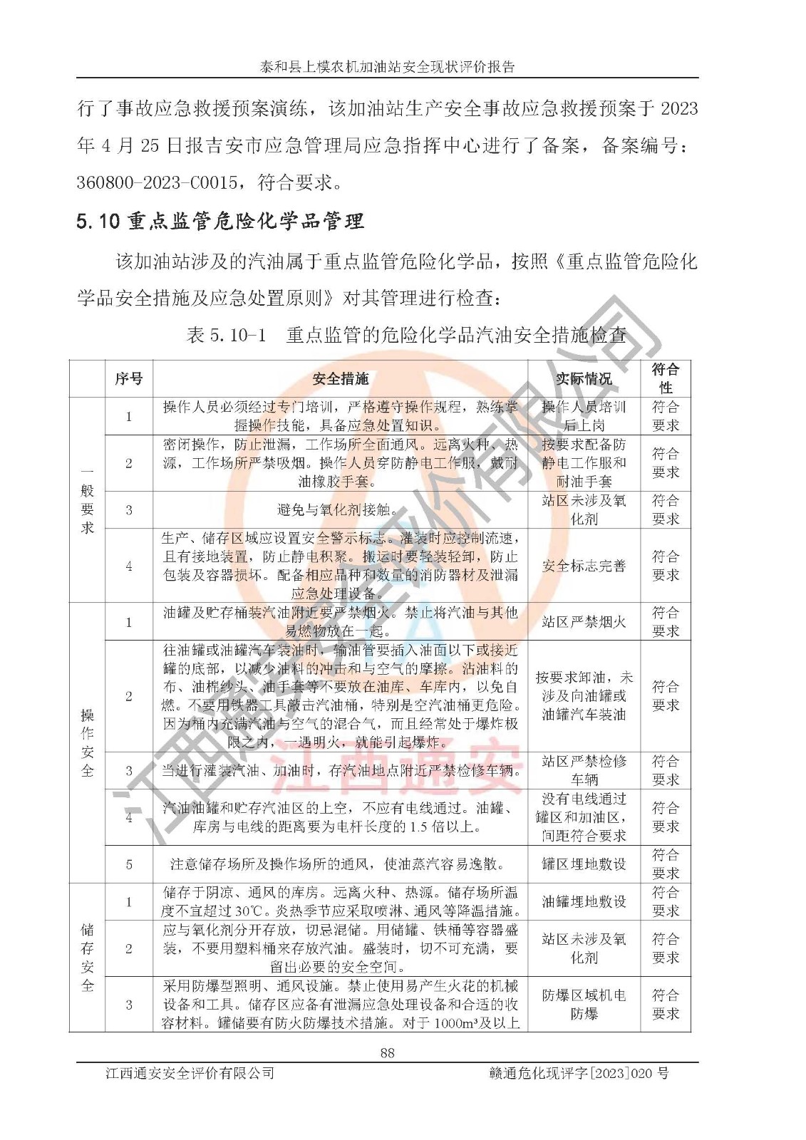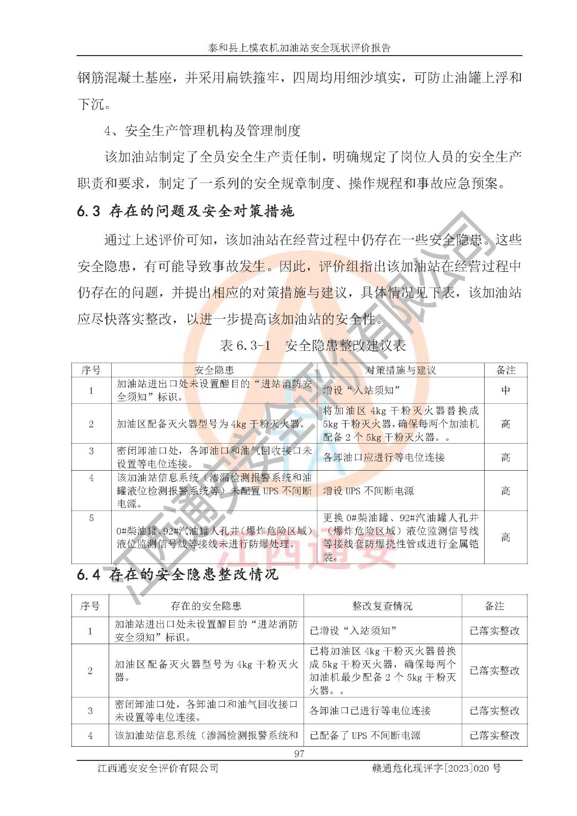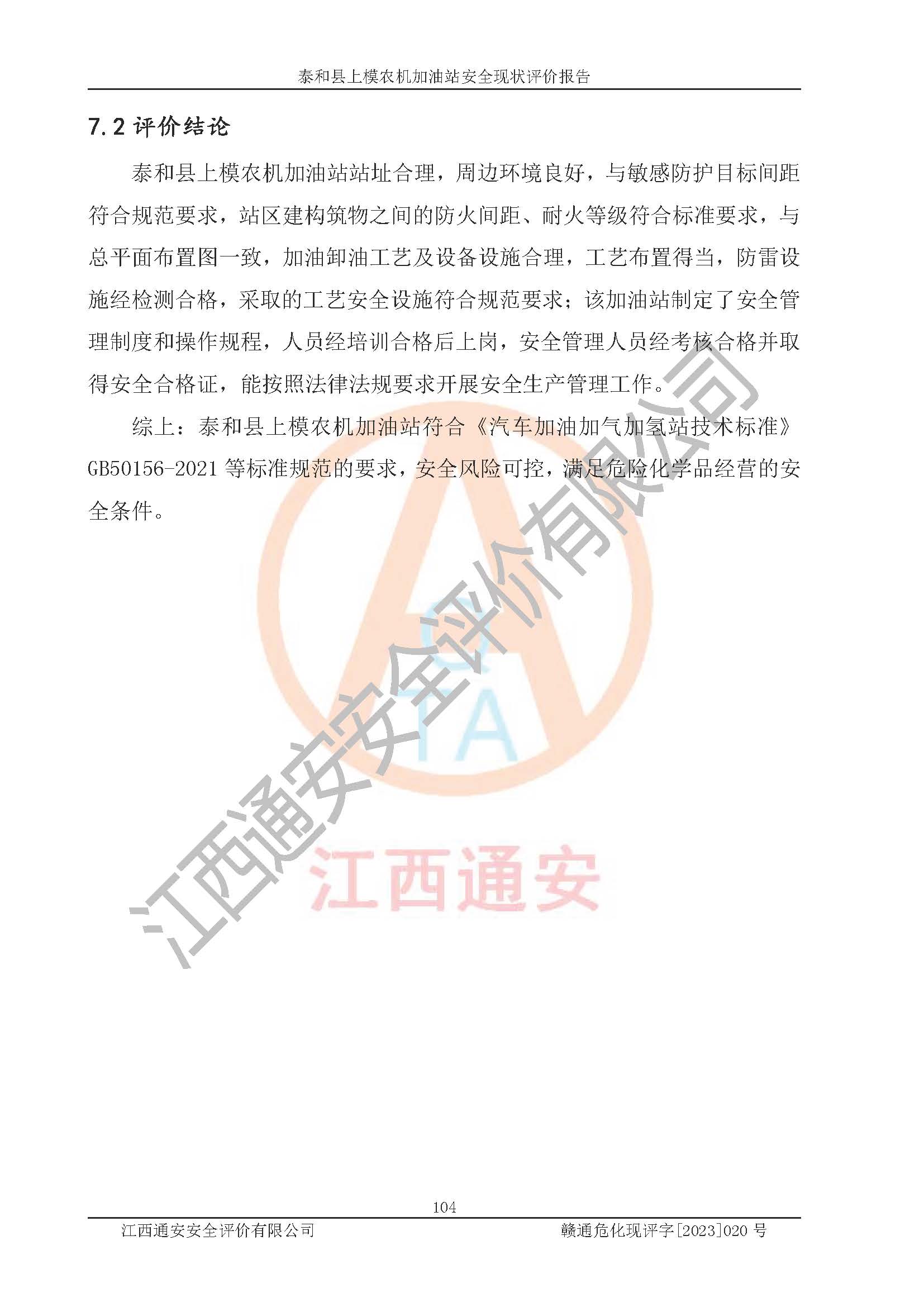 評(píng)價(jià)結(jié)論 | 泰和縣上模農(nóng)機(jī)加油站符合《汽車(chē)加油加氣加氫站技術(shù)標(biāo)準(zhǔn)》GB50156-2021等標(biāo)準(zhǔn)規(guī)范的要求,安全風(fēng)險(xiǎn)可控,滿足危險(xiǎn)化學(xué)品經(jīng)營(yíng)的安全條件。 | |||