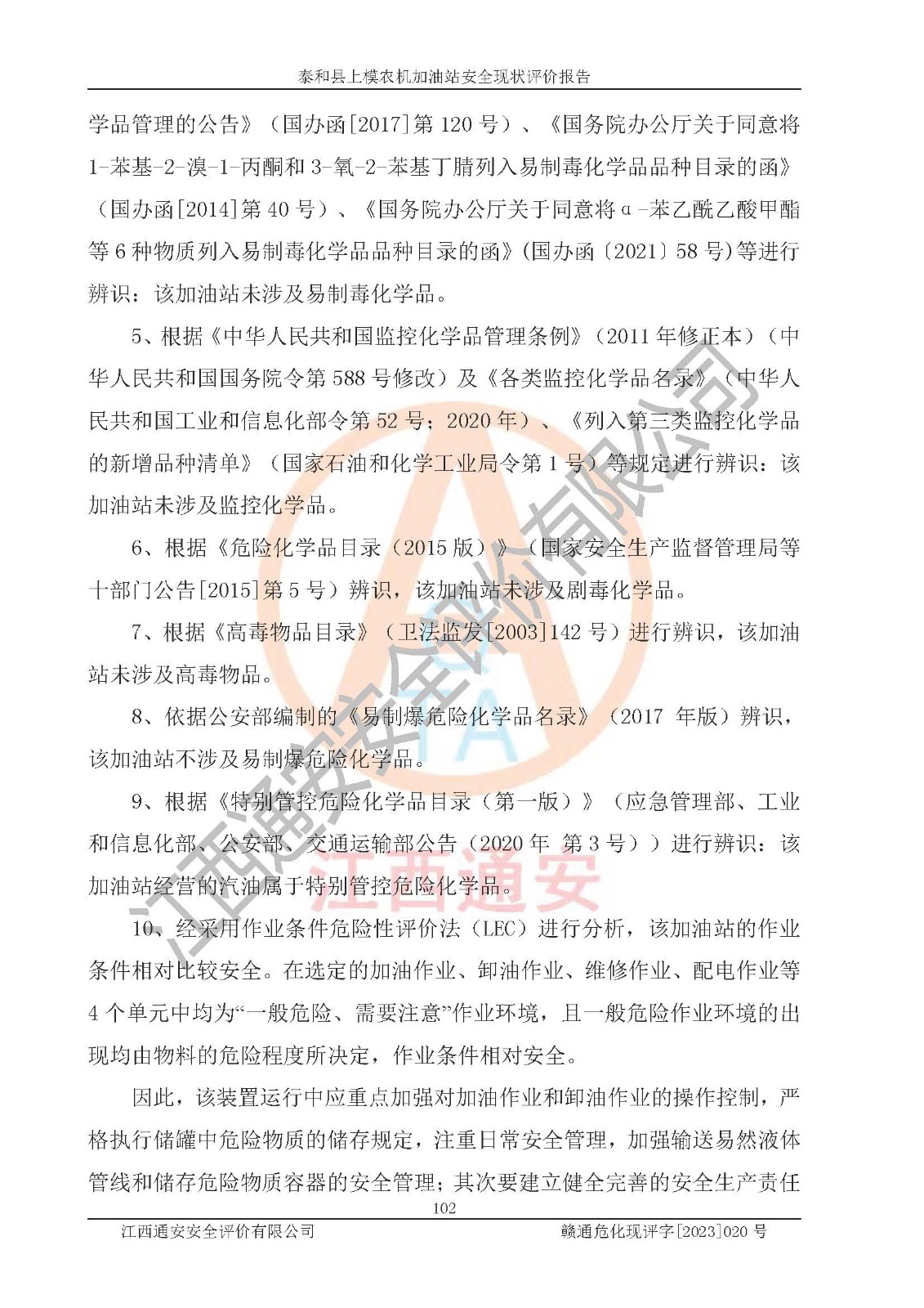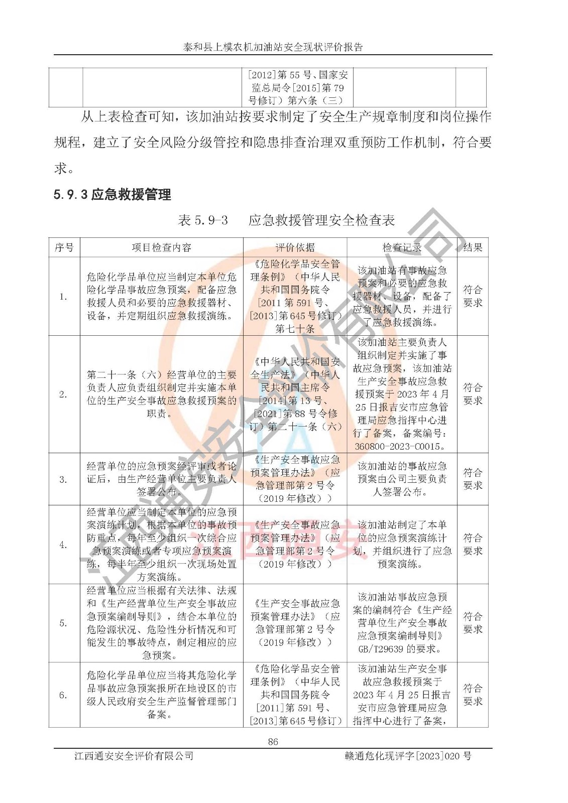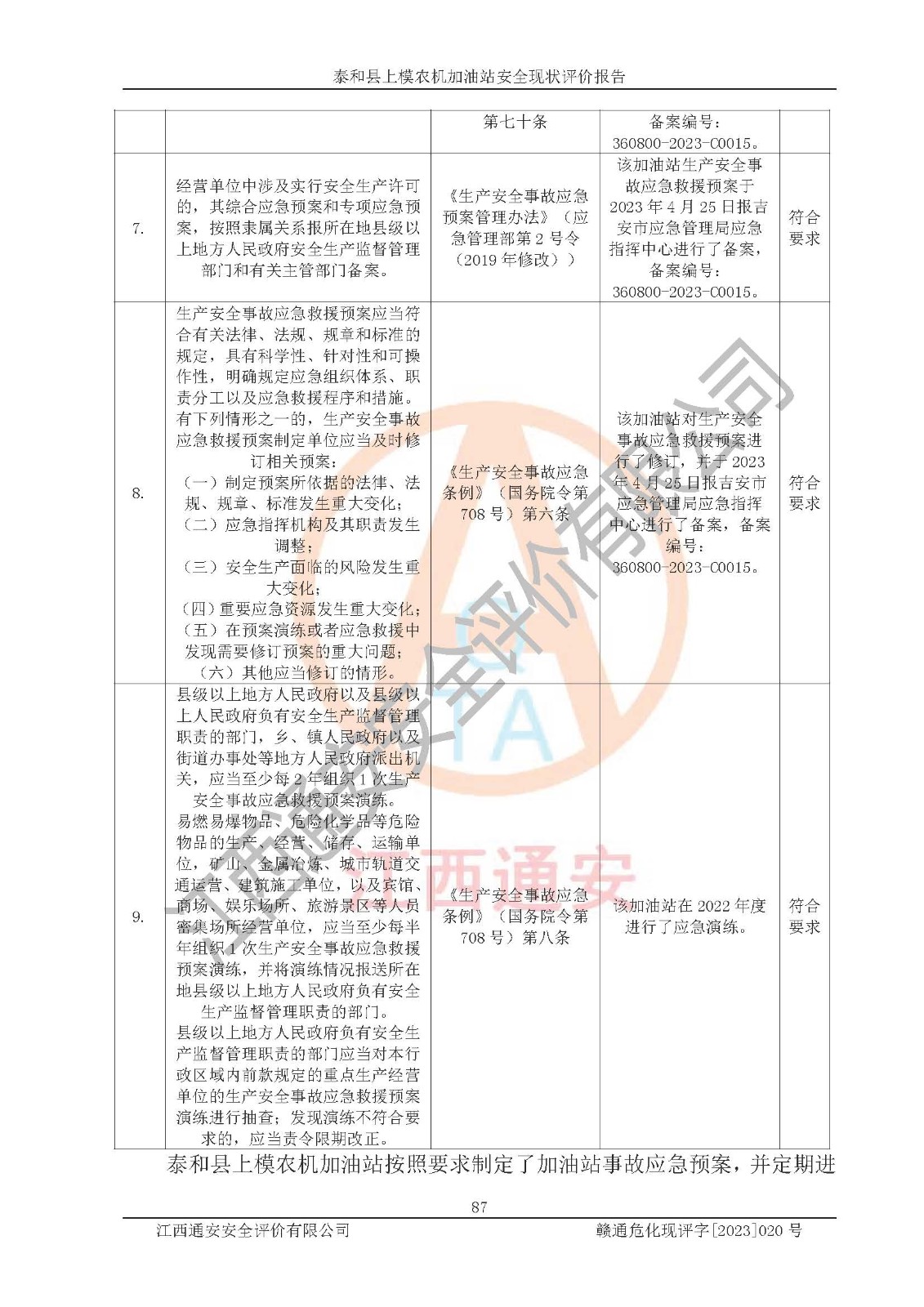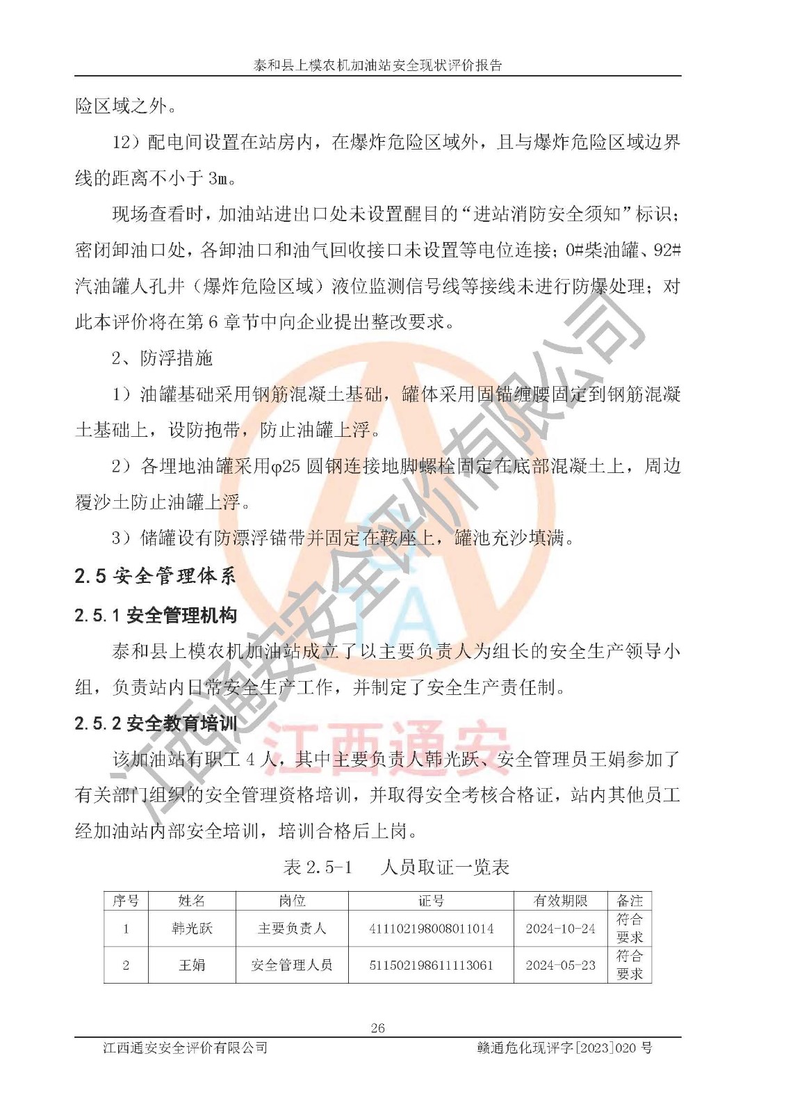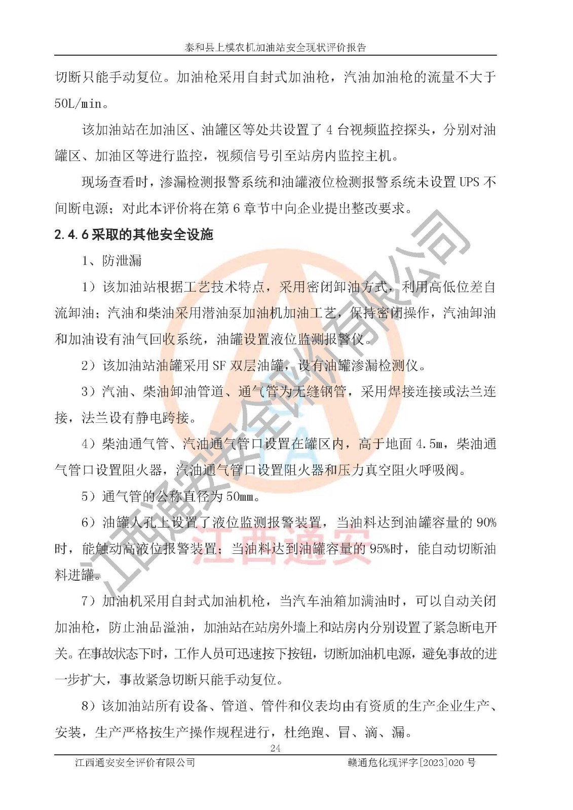 評(píng)價(jià)結(jié)論 | 泰和縣上模農(nóng)機(jī)加油站符合《汽車(chē)加油加氣加氫站技術(shù)標(biāo)準(zhǔn)》GB50156-2021等標(biāo)準(zhǔn)規(guī)范的要求,安全風(fēng)險(xiǎn)可控,滿足危險(xiǎn)化學(xué)品經(jīng)營(yíng)的安全條件。 | |||
