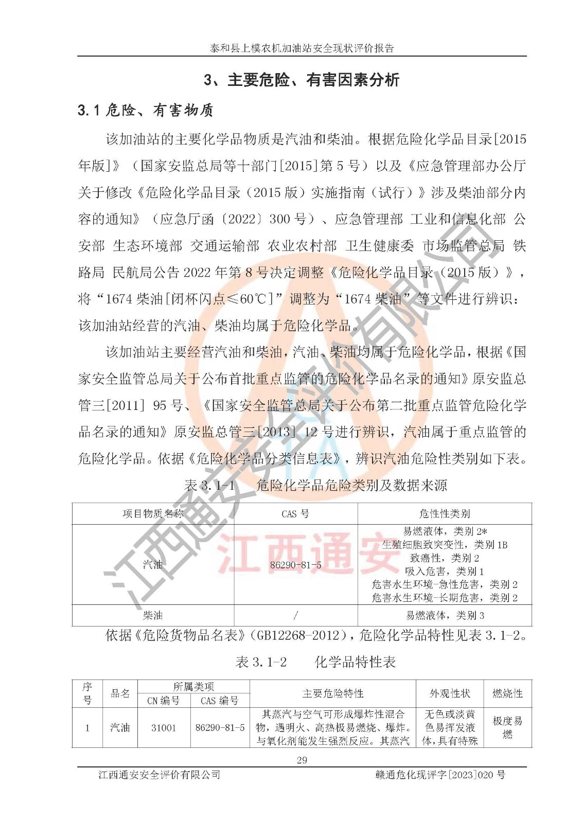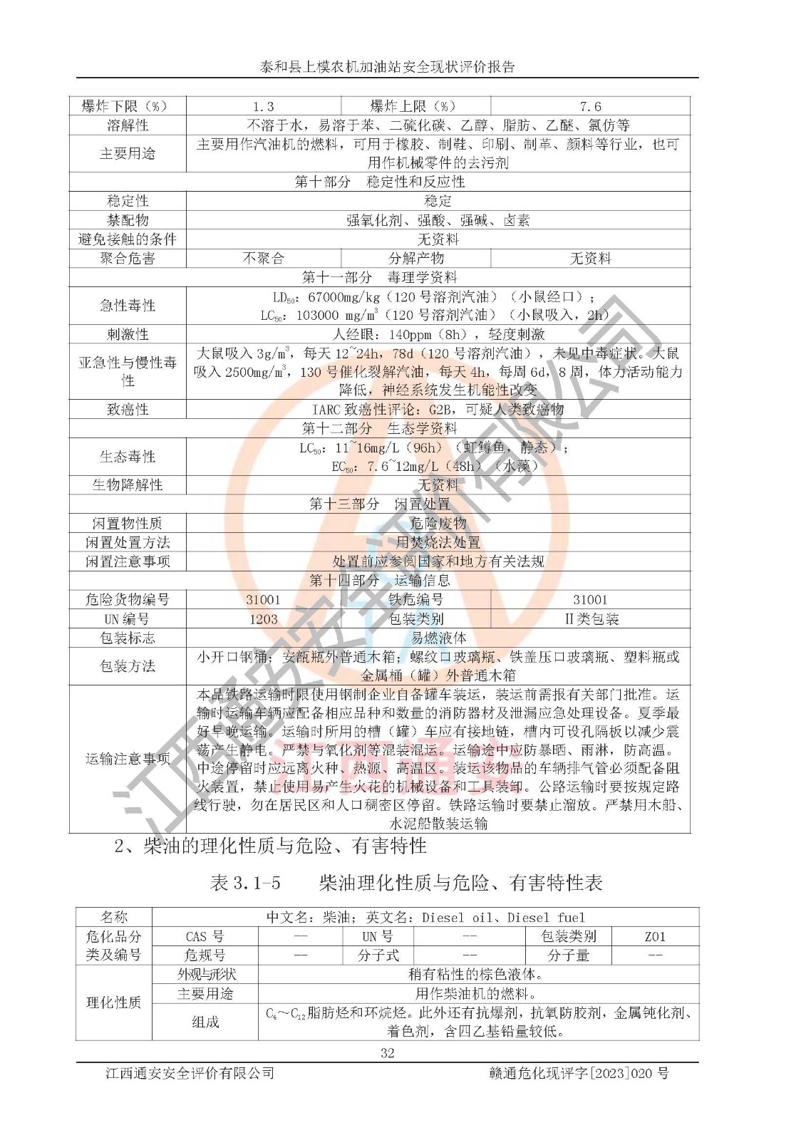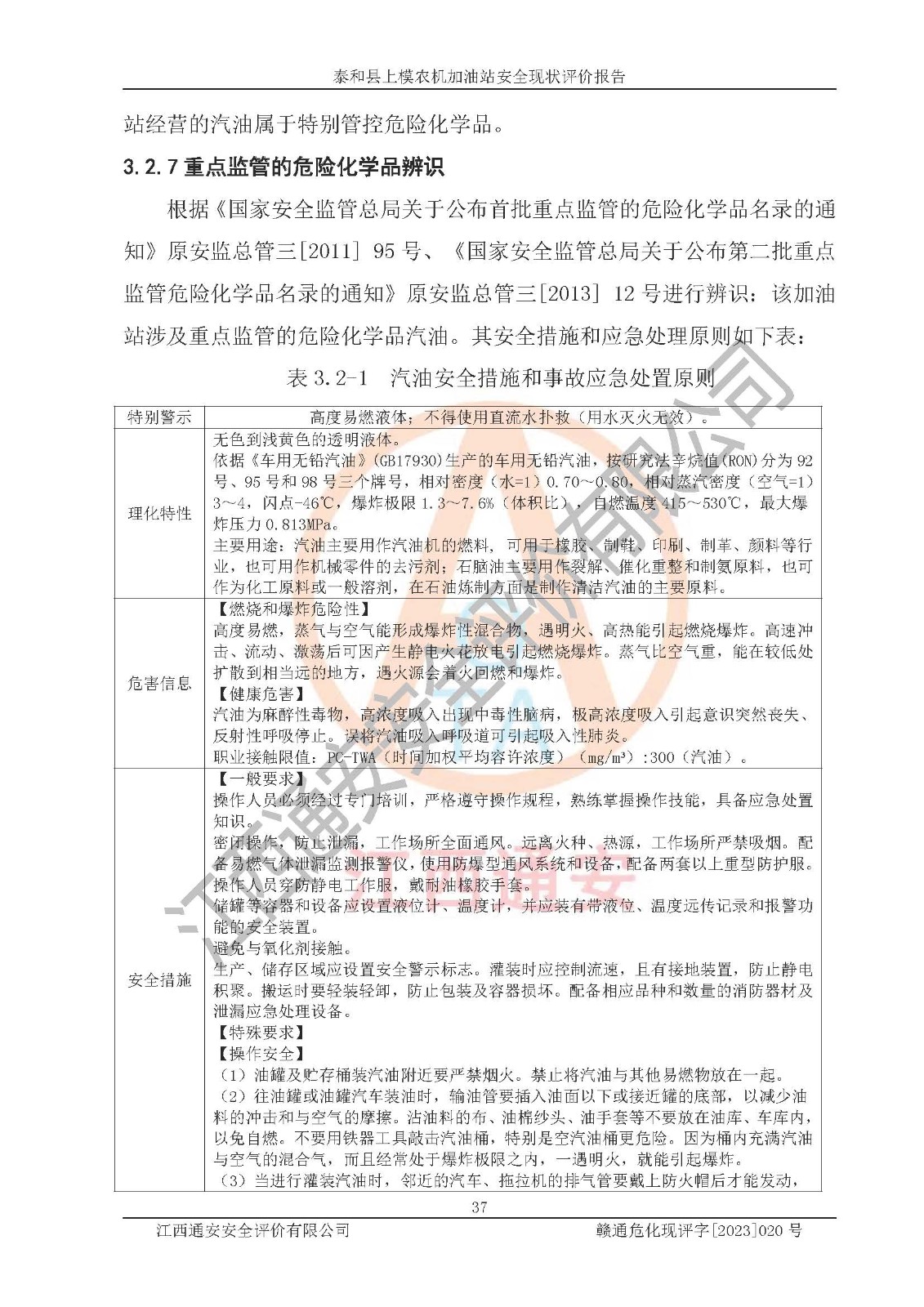 項(xiàng)目簡(jiǎn)介 | 泰和縣上模農(nóng)機(jī)加油站是一家從事成品油零售經(jīng)營(yíng)的企業(yè)。該加油站于2008年6月26日經(jīng)泰和縣市場(chǎng)監(jiān)督管理局核準(zhǔn)注冊(cè)成立,營(yíng)業(yè)場(chǎng)所位于江西省吉安市泰和縣上模鄉(xiāng)上模圩。該加油站屬于個(gè)人獨(dú)資企業(yè),負(fù)責(zé)人為肖喜桂,營(yíng)業(yè)執(zhí)照統(tǒng)一社會(huì)信用代碼為:91360826MA35TXGB7Q。營(yíng)業(yè)執(zhí)照核準(zhǔn)經(jīng)營(yíng)范圍:汽油、柴油(憑**許可證經(jīng)營(yíng))、潤(rùn)滑油零售;五金交電、民用建材、農(nóng)機(jī)配件零售;農(nóng)機(jī)件修理。(依法須經(jīng)批準(zhǔn)的項(xiàng)目,經(jīng)相關(guān)部門(mén)批準(zhǔn)后方可開(kāi)展經(jīng)營(yíng)活動(dòng)))。 泰和縣上模農(nóng)機(jī)加油站占地面積540㎡,加油站中設(shè)有1臺(tái)0#柴油單槍加油機(jī)、1臺(tái)92#汽油單槍加油機(jī)、1臺(tái)92#/95#汽油雙槍加油機(jī),1臺(tái)SF雙層50m3埋地臥式0#柴油罐、1臺(tái)SF雙層30m3埋地臥式92#汽油罐、1臺(tái)SF雙層20m3埋地臥式92#汽油儲(chǔ)罐、1臺(tái)SF雙層12m3埋地臥式95#汽油儲(chǔ)罐,油品*大儲(chǔ)存能力為87m3(柴油罐容積折半計(jì)入油罐總?cè)莘e),屬三級(jí)加油站,汽油卸油、加油設(shè)置了油氣回收系統(tǒng)。 泰和縣上模農(nóng)機(jī)加油站于2021年7月22日經(jīng)吉安市應(yīng)急管理局核準(zhǔn),換發(fā)了新的《危險(xiǎn)化學(xué)品經(jīng)營(yíng)許可證》,證書(shū)編號(hào):贛吉?;?jīng)字[2020]360800000036號(hào),許可經(jīng)營(yíng)范圍:成品油。**期2020年6月12日至2023年6月11日。 泰和縣上模農(nóng)機(jī)加油站2022年1月5日經(jīng)吉安市商務(wù)局核準(zhǔn),換取了新的《成品油零售經(jīng)營(yíng)批準(zhǔn)證書(shū)》,證書(shū)編號(hào):油零售證書(shū)第吉0172號(hào),批準(zhǔn)從事成品油(汽油、柴油)零售業(yè)務(wù)。證書(shū)**期至2022年1月5日至2027年1月4日。 項(xiàng)目生產(chǎn)過(guò)程中涉及的危險(xiǎn)化學(xué)品有:汽油、柴油等。 項(xiàng)目各生產(chǎn)和儲(chǔ)存單元均未構(gòu)成危險(xiǎn)化學(xué)品重大危險(xiǎn)源。 | |||