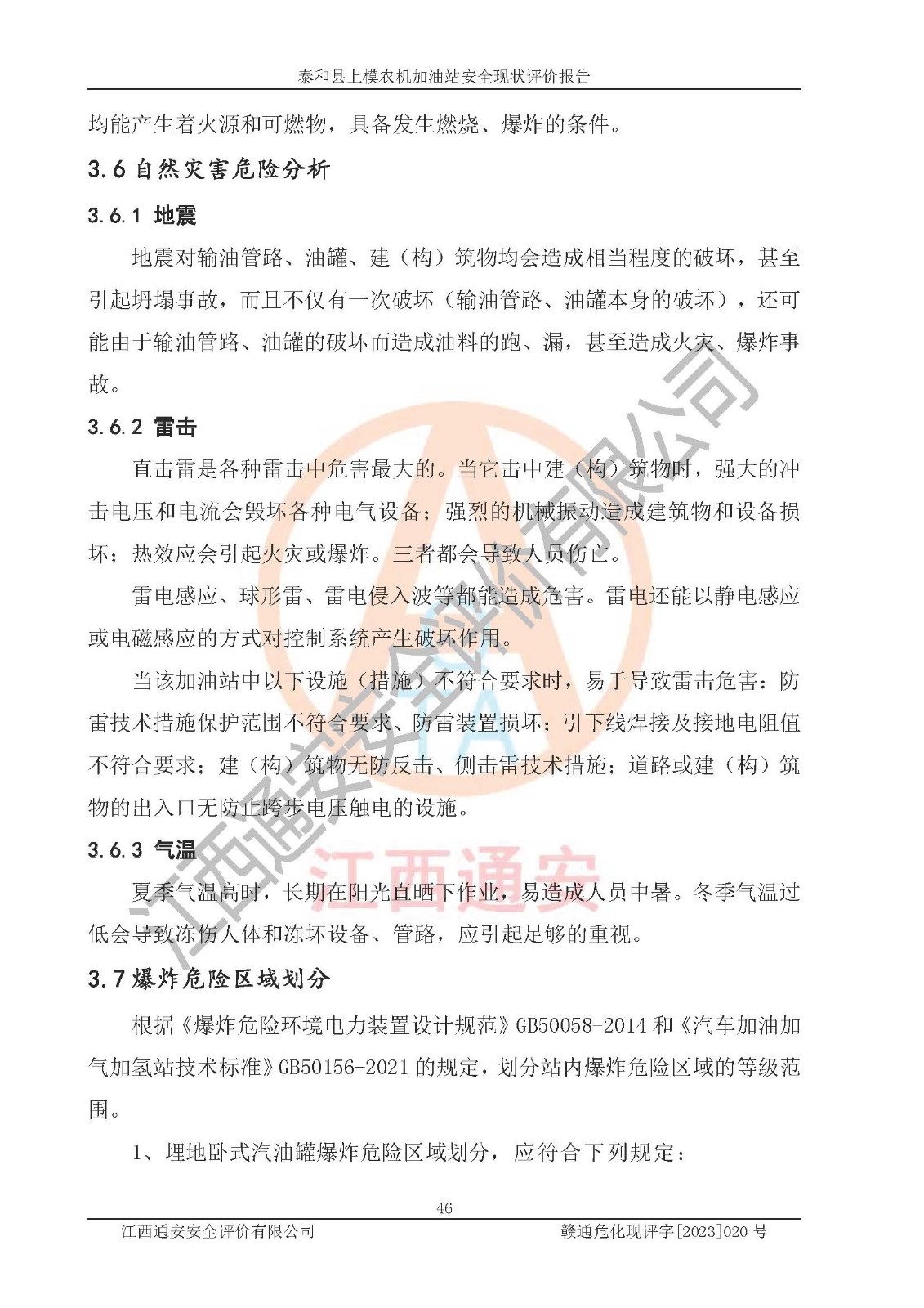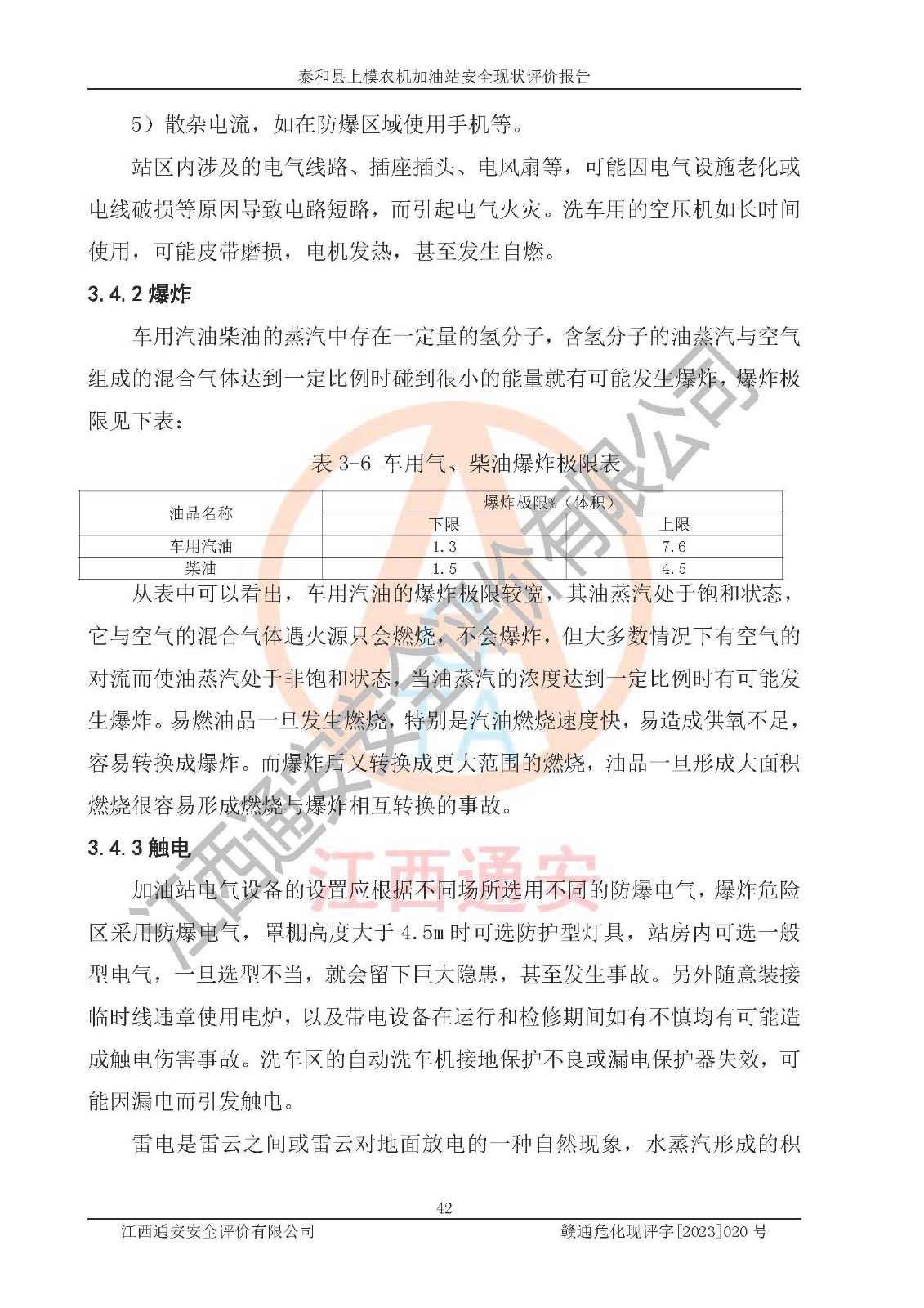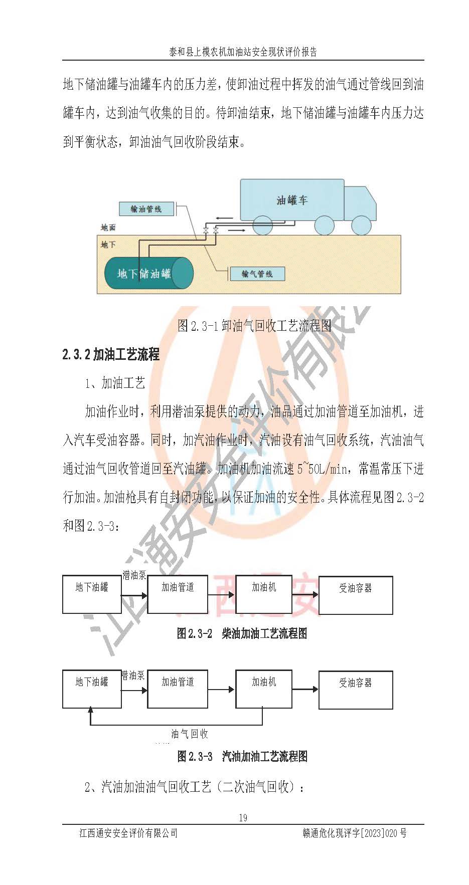 項(xiàng)目簡(jiǎn)介 | 泰和縣上模農(nóng)機(jī)加油站是一家從事成品油零售經(jīng)營(yíng)的企業(yè)。該加油站于2008年6月26日經(jīng)泰和縣市場(chǎng)監(jiān)督管理局核準(zhǔn)注冊(cè)成立,營(yíng)業(yè)場(chǎng)所位于江西省吉安市泰和縣上模鄉(xiāng)上模圩。該加油站屬于個(gè)人獨(dú)資企業(yè),負(fù)責(zé)人為肖喜桂,營(yíng)業(yè)執(zhí)照統(tǒng)一社會(huì)信用代碼為:91360826MA35TXGB7Q。營(yíng)業(yè)執(zhí)照核準(zhǔn)經(jīng)營(yíng)范圍:汽油、柴油(憑**許可證經(jīng)營(yíng))、潤(rùn)滑油零售;五金交電、民用建材、農(nóng)機(jī)配件零售;農(nóng)機(jī)件修理。(依法須經(jīng)批準(zhǔn)的項(xiàng)目,經(jīng)相關(guān)部門(mén)批準(zhǔn)后方可開(kāi)展經(jīng)營(yíng)活動(dòng)))。 泰和縣上模農(nóng)機(jī)加油站占地面積540㎡,加油站中設(shè)有1臺(tái)0#柴油單槍加油機(jī)、1臺(tái)92#汽油單槍加油機(jī)、1臺(tái)92#/95#汽油雙槍加油機(jī),1臺(tái)SF雙層50m3埋地臥式0#柴油罐、1臺(tái)SF雙層30m3埋地臥式92#汽油罐、1臺(tái)SF雙層20m3埋地臥式92#汽油儲(chǔ)罐、1臺(tái)SF雙層12m3埋地臥式95#汽油儲(chǔ)罐,油品*大儲(chǔ)存能力為87m3(柴油罐容積折半計(jì)入油罐總?cè)莘e),屬三級(jí)加油站,汽油卸油、加油設(shè)置了油氣回收系統(tǒng)。 泰和縣上模農(nóng)機(jī)加油站于2021年7月22日經(jīng)吉安市應(yīng)急管理局核準(zhǔn),換發(fā)了新的《危險(xiǎn)化學(xué)品經(jīng)營(yíng)許可證》,證書(shū)編號(hào):贛吉?;?jīng)字[2020]360800000036號(hào),許可經(jīng)營(yíng)范圍:成品油。**期2020年6月12日至2023年6月11日。 泰和縣上模農(nóng)機(jī)加油站2022年1月5日經(jīng)吉安市商務(wù)局核準(zhǔn),換取了新的《成品油零售經(jīng)營(yíng)批準(zhǔn)證書(shū)》,證書(shū)編號(hào):油零售證書(shū)第吉0172號(hào),批準(zhǔn)從事成品油(汽油、柴油)零售業(yè)務(wù)。證書(shū)**期至2022年1月5日至2027年1月4日。 項(xiàng)目生產(chǎn)過(guò)程中涉及的危險(xiǎn)化學(xué)品有:汽油、柴油等。 項(xiàng)目各生產(chǎn)和儲(chǔ)存單元均未構(gòu)成危險(xiǎn)化學(xué)品重大危險(xiǎn)源。 | |||