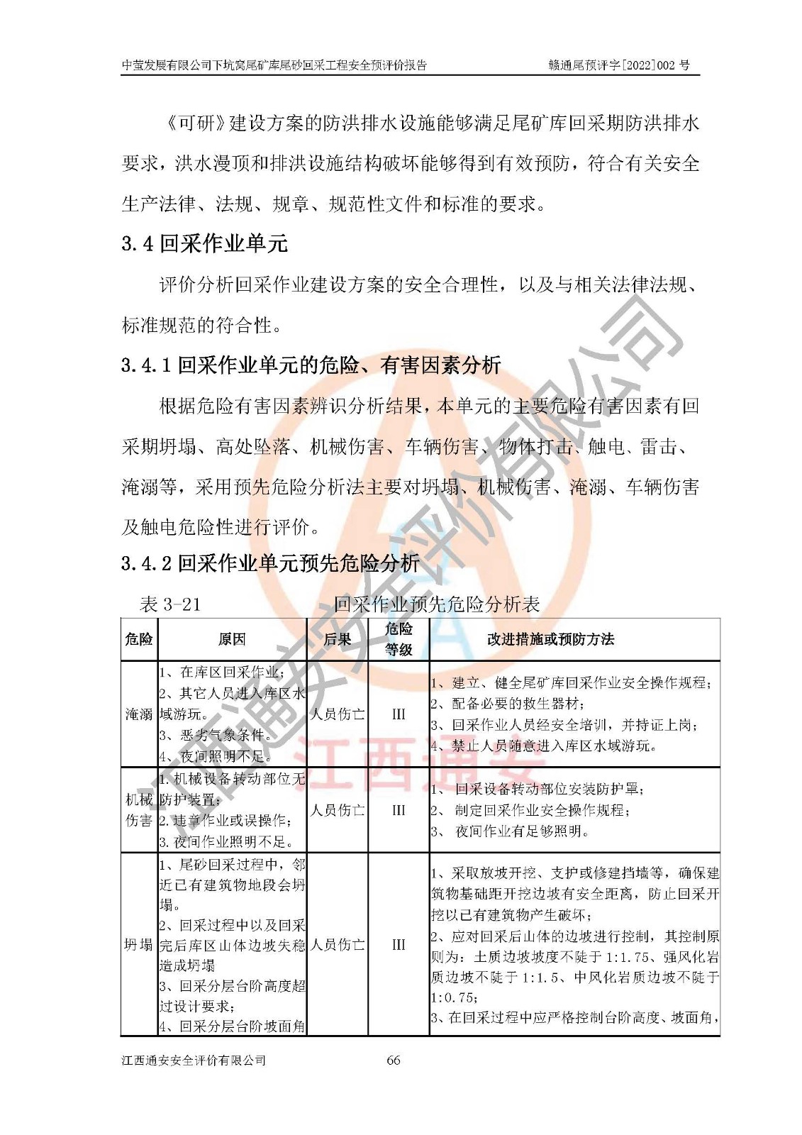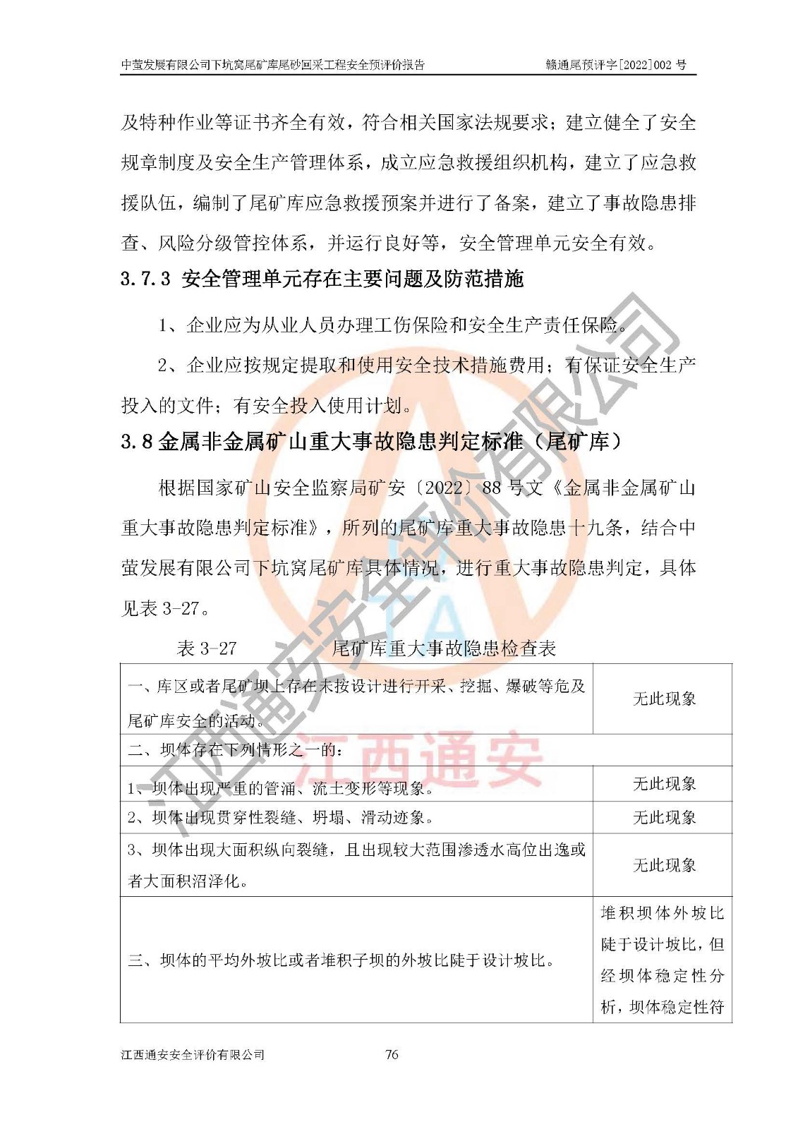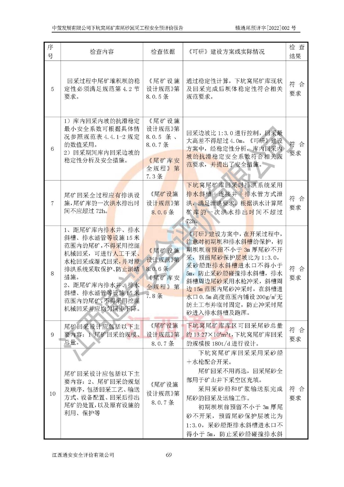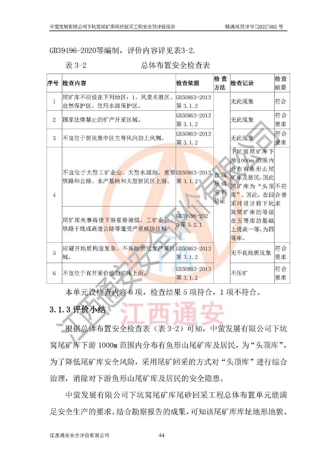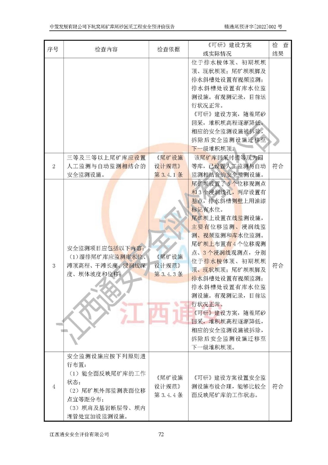 評價結(jié)論 | 建設(shè)單位依據(jù)《可研》建設(shè)方案,結(jié)合本報告提出的安全措施建議,進行中螢發(fā)展有限公司下坑窩尾礦庫尾砂回采工程后續(xù)設(shè)計、施工、生產(chǎn)、管理,則尾礦庫尾砂回采項目危險、有害因素的風險程度可以控制在可承受的范圍之內(nèi),下坑窩尾礦庫尾砂回采工程安全條件可滿足安全生產(chǎn)需要。 | |||