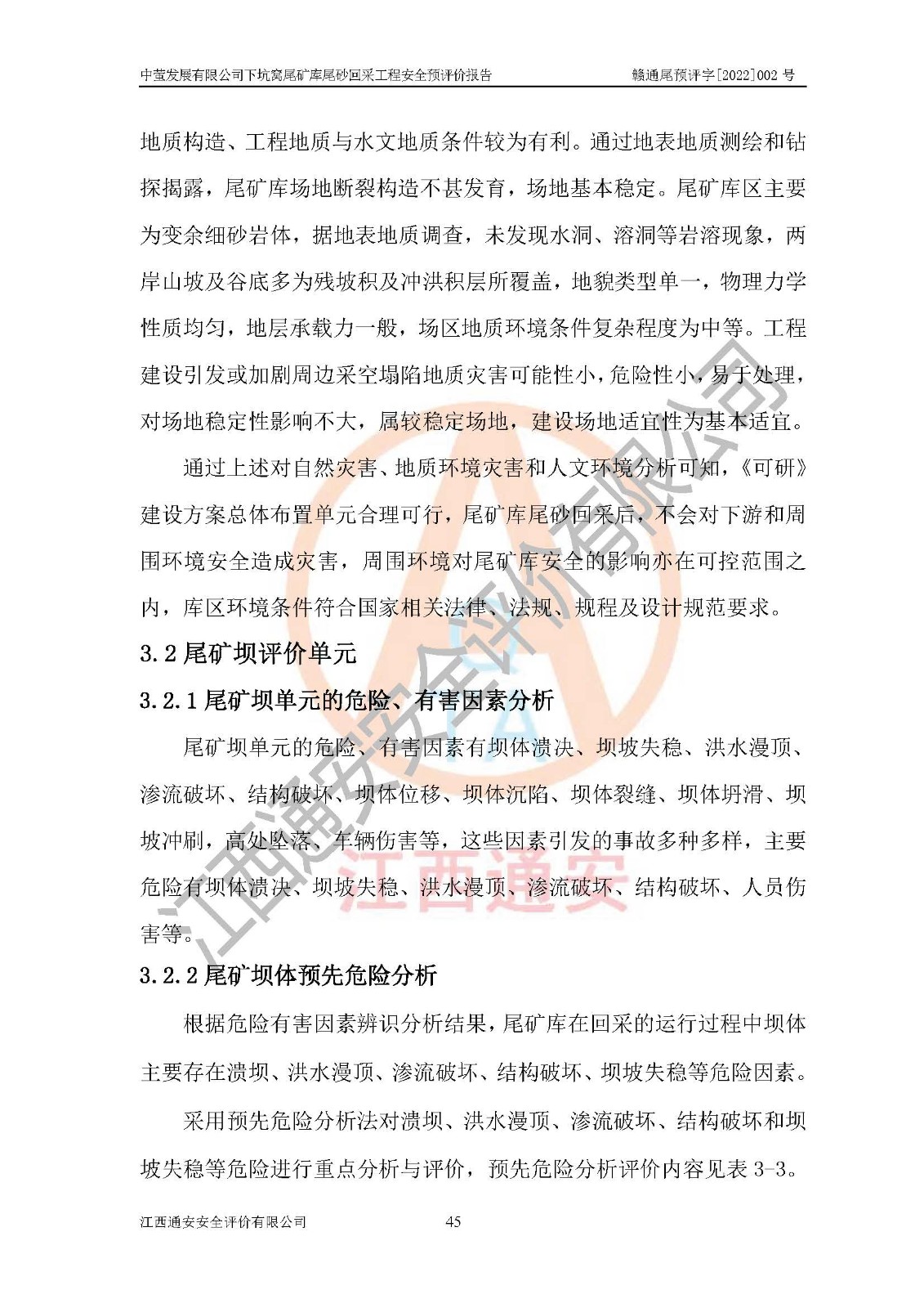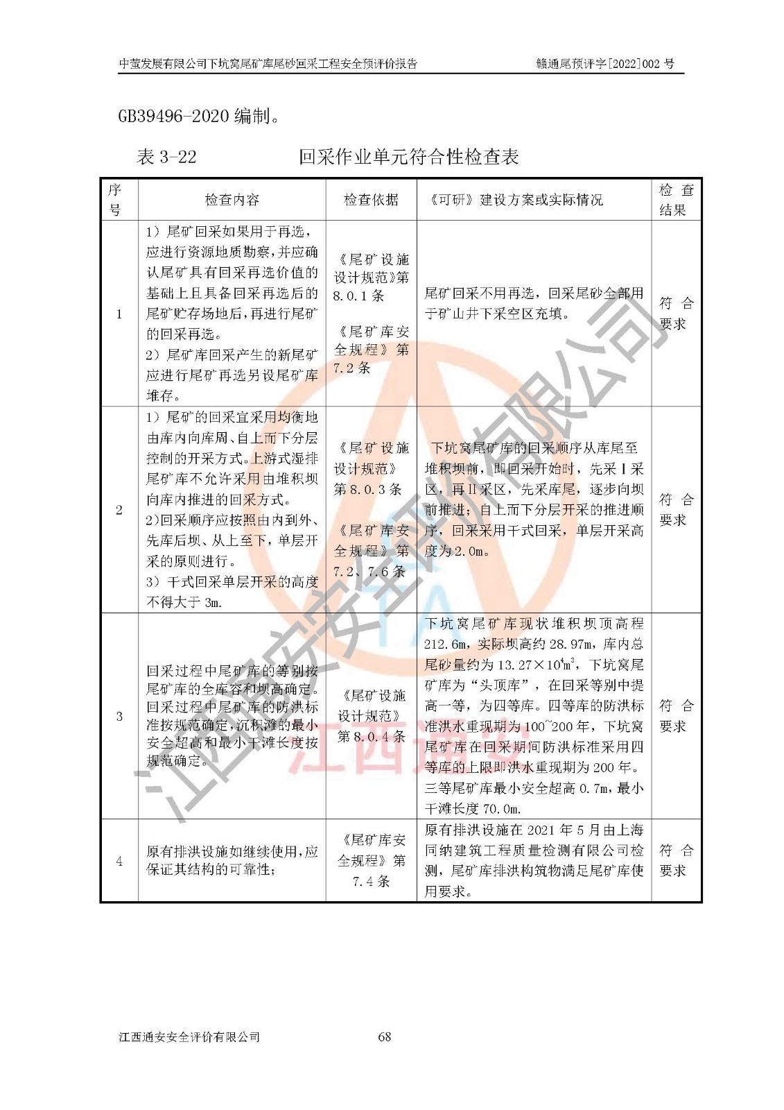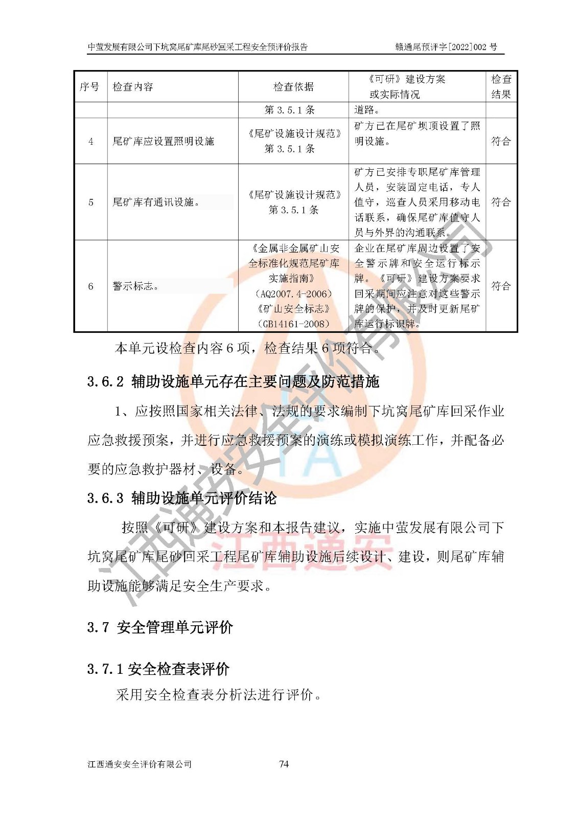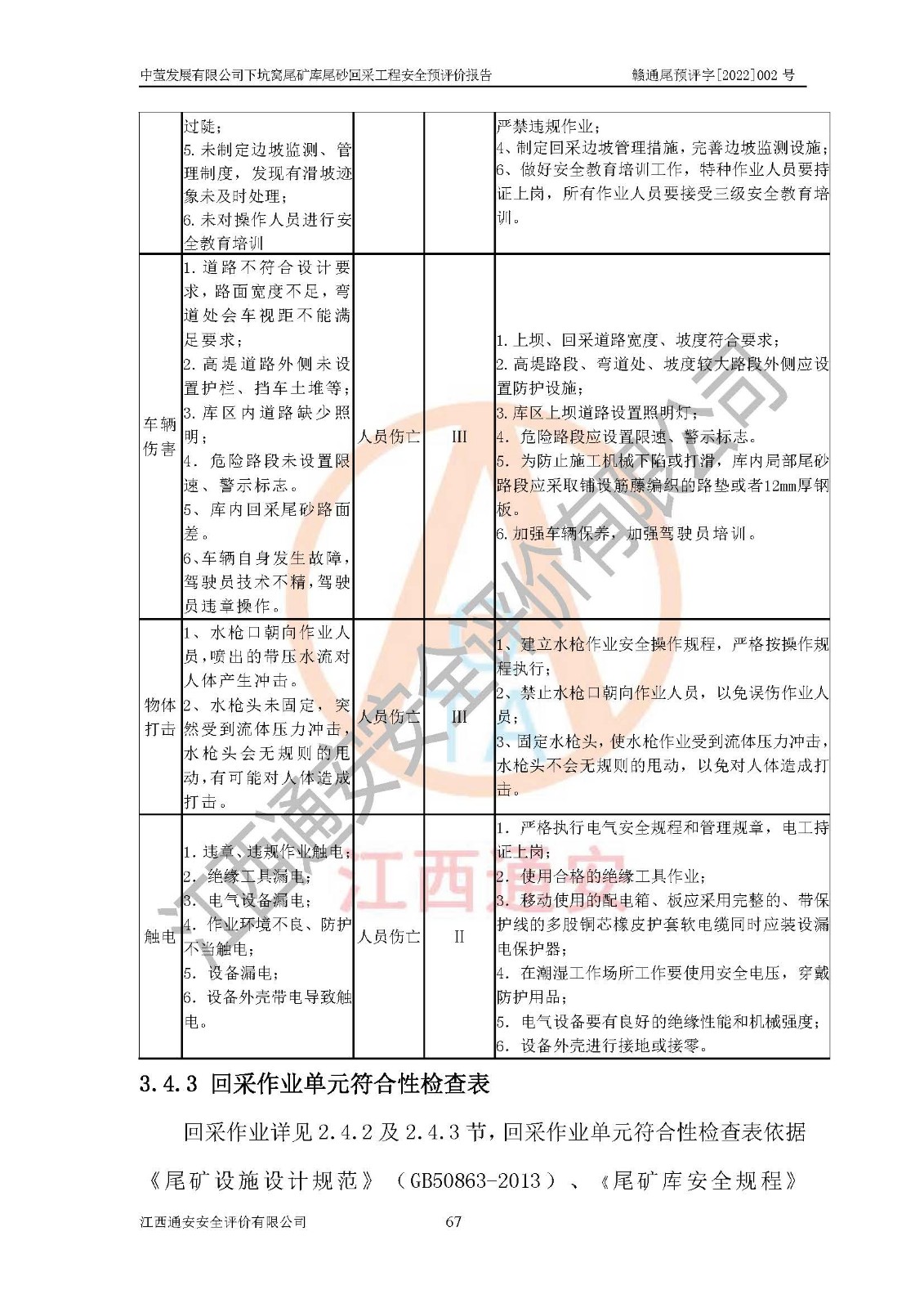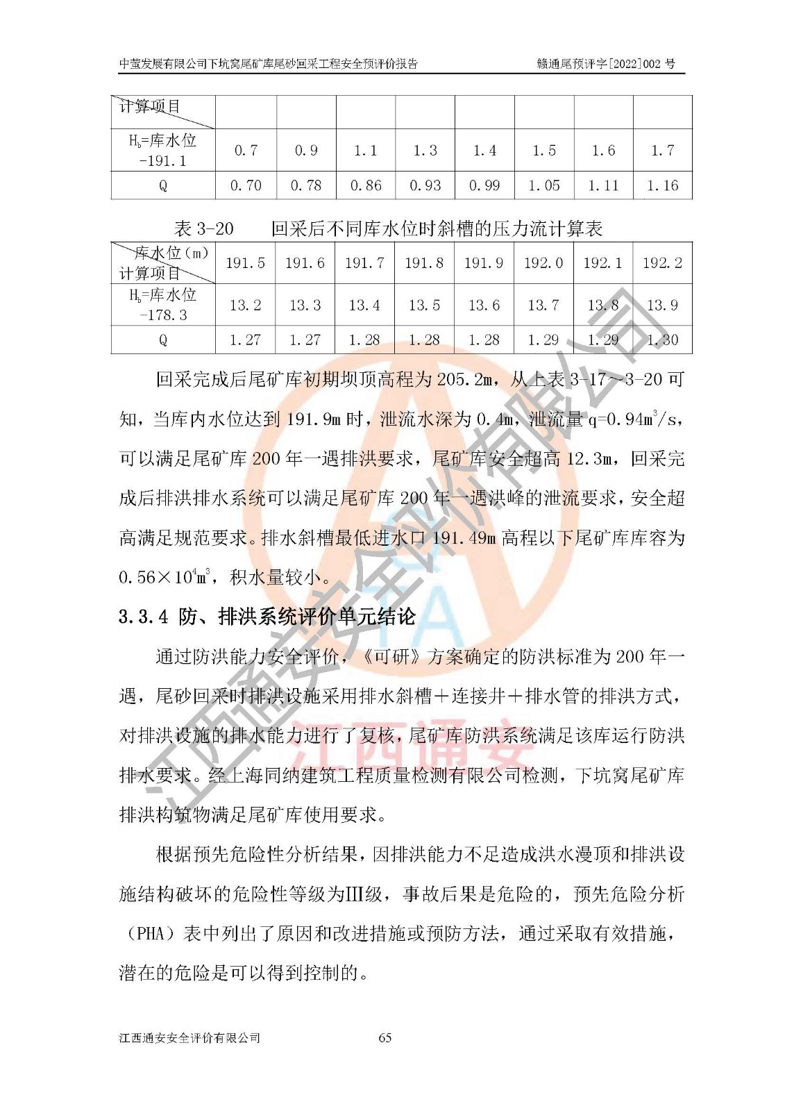 評價結(jié)論 | 建設(shè)單位依據(jù)《可研》建設(shè)方案,結(jié)合本報告提出的安全措施建議,進行中螢發(fā)展有限公司下坑窩尾礦庫尾砂回采工程后續(xù)設(shè)計、施工、生產(chǎn)、管理,則尾礦庫尾砂回采項目危險、有害因素的風險程度可以控制在可承受的范圍之內(nèi),下坑窩尾礦庫尾砂回采工程安全條件可滿足安全生產(chǎn)需要。 | |||