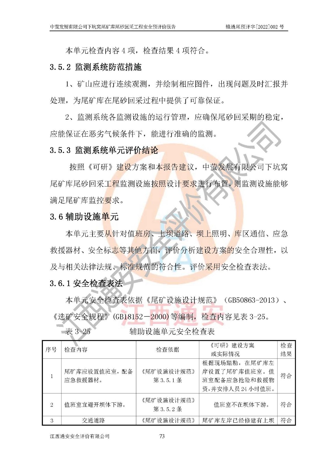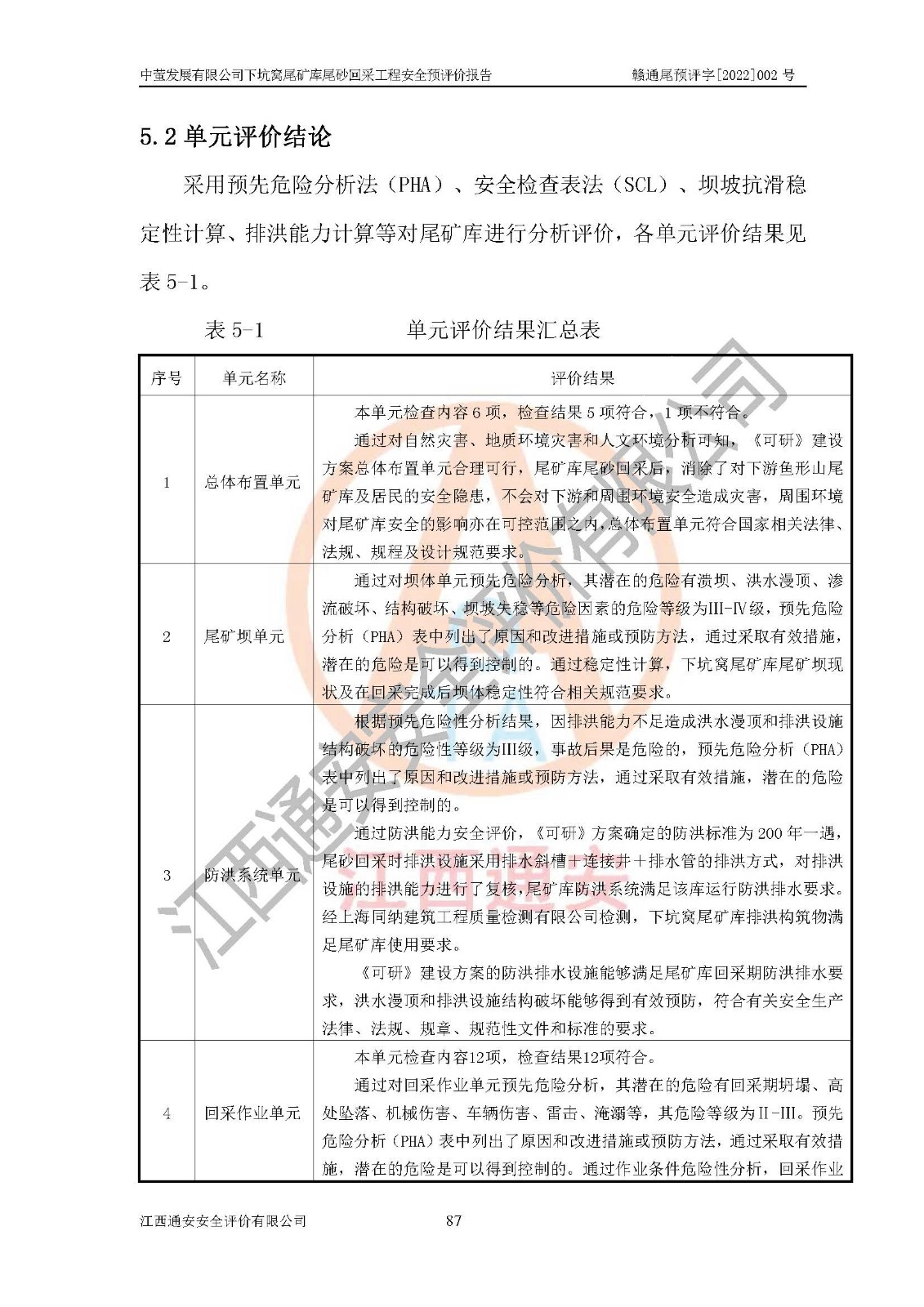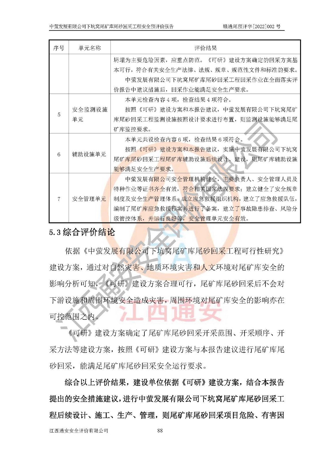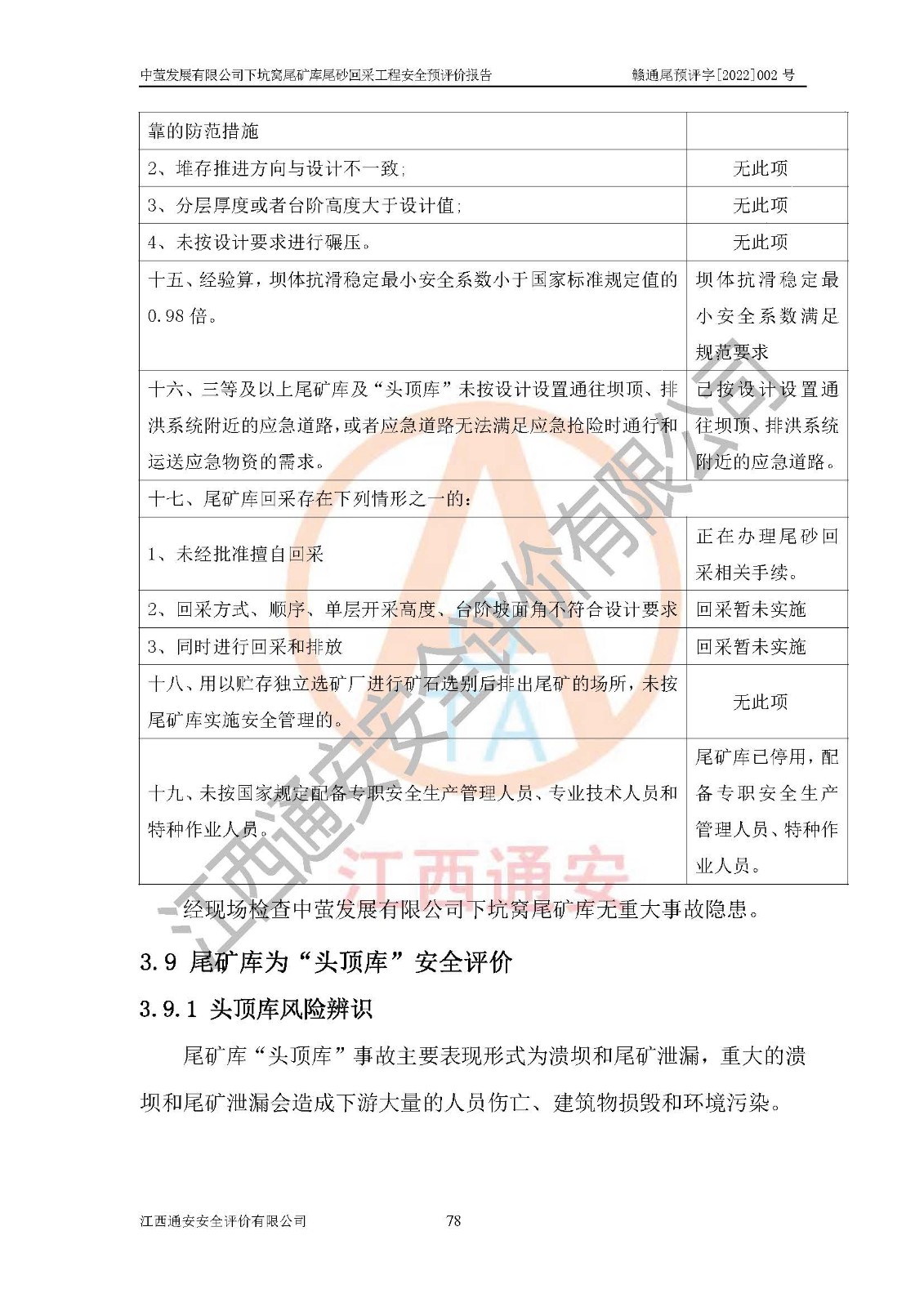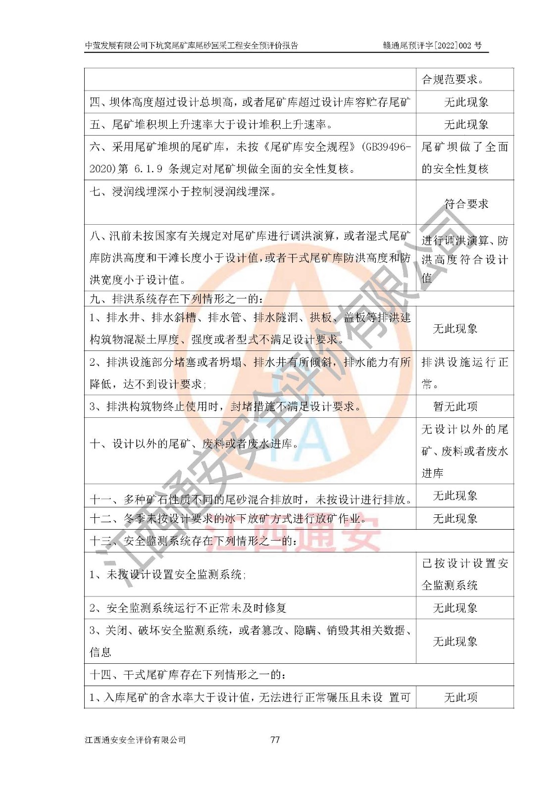 評價結(jié)論 | 建設(shè)單位依據(jù)《可研》建設(shè)方案,結(jié)合本報告提出的安全措施建議,進行中螢發(fā)展有限公司下坑窩尾礦庫尾砂回采工程后續(xù)設(shè)計、施工、生產(chǎn)、管理,則尾礦庫尾砂回采項目危險、有害因素的風險程度可以控制在可承受的范圍之內(nèi),下坑窩尾礦庫尾砂回采工程安全條件可滿足安全生產(chǎn)需要。 | |||
