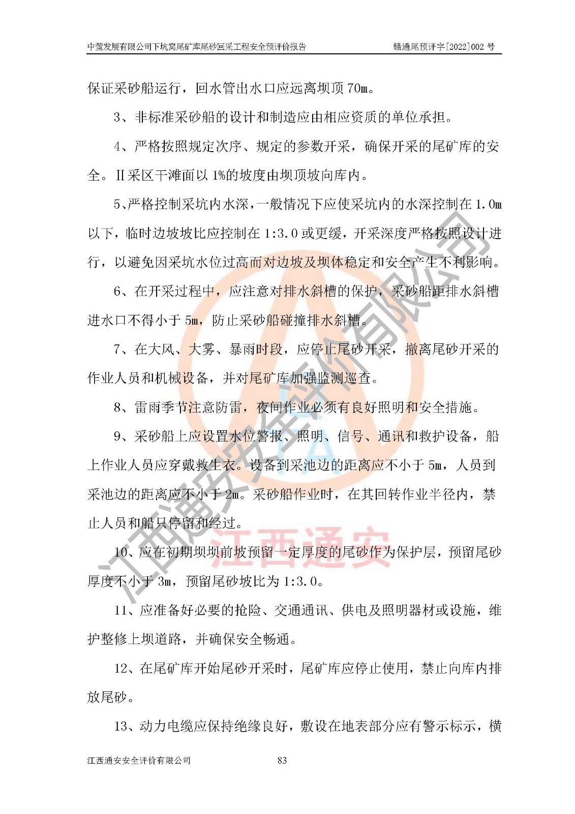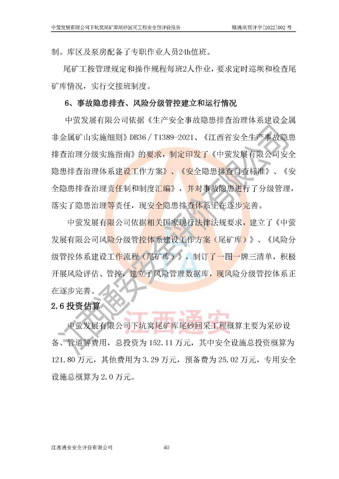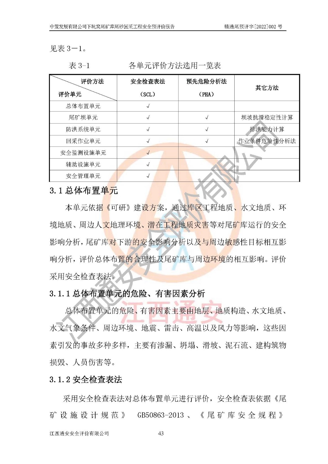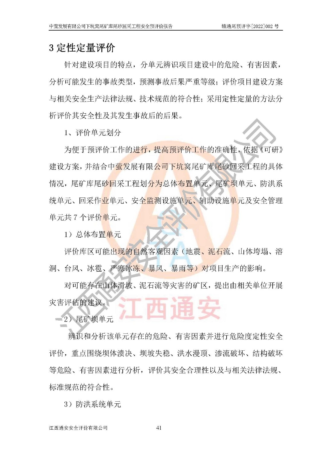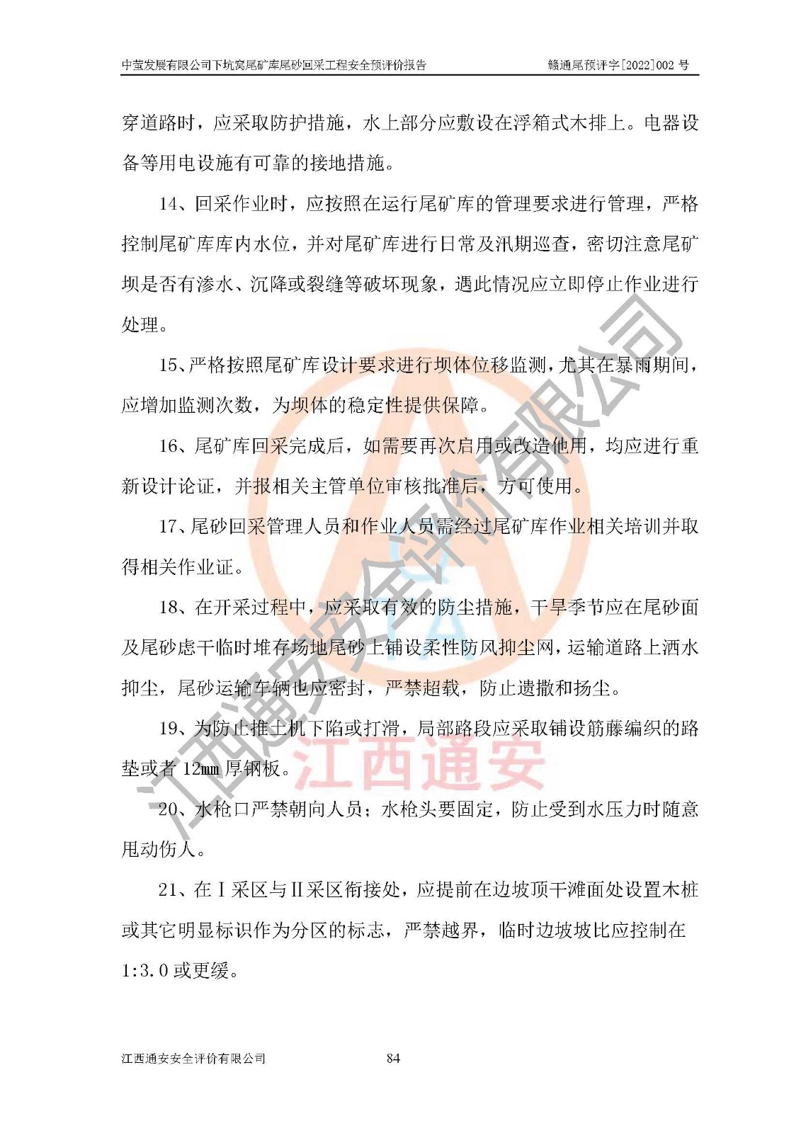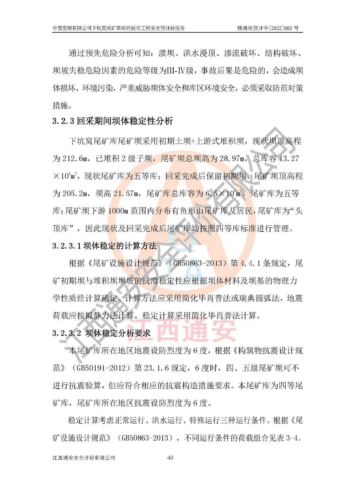 評價結(jié)論 | 建設(shè)單位依據(jù)《可研》建設(shè)方案,結(jié)合本報告提出的安全措施建議,進行中螢發(fā)展有限公司下坑窩尾礦庫尾砂回采工程后續(xù)設(shè)計、施工、生產(chǎn)、管理,則尾礦庫尾砂回采項目危險、有害因素的風險程度可以控制在可承受的范圍之內(nèi),下坑窩尾礦庫尾砂回采工程安全條件可滿足安全生產(chǎn)需要。 | |||