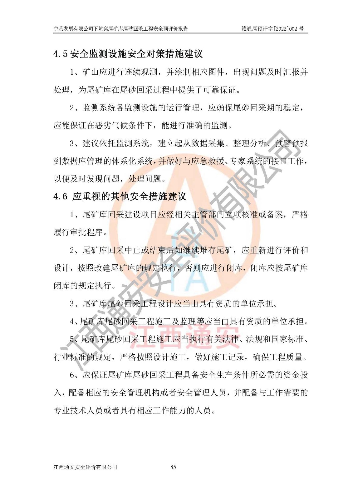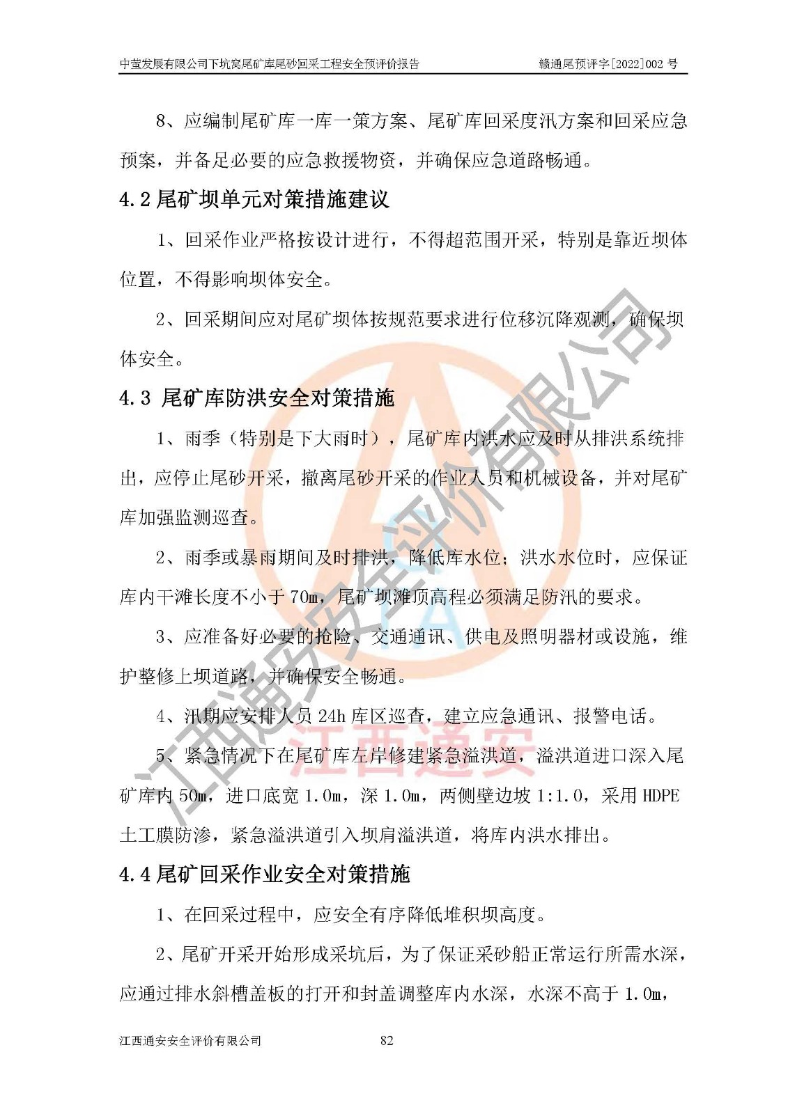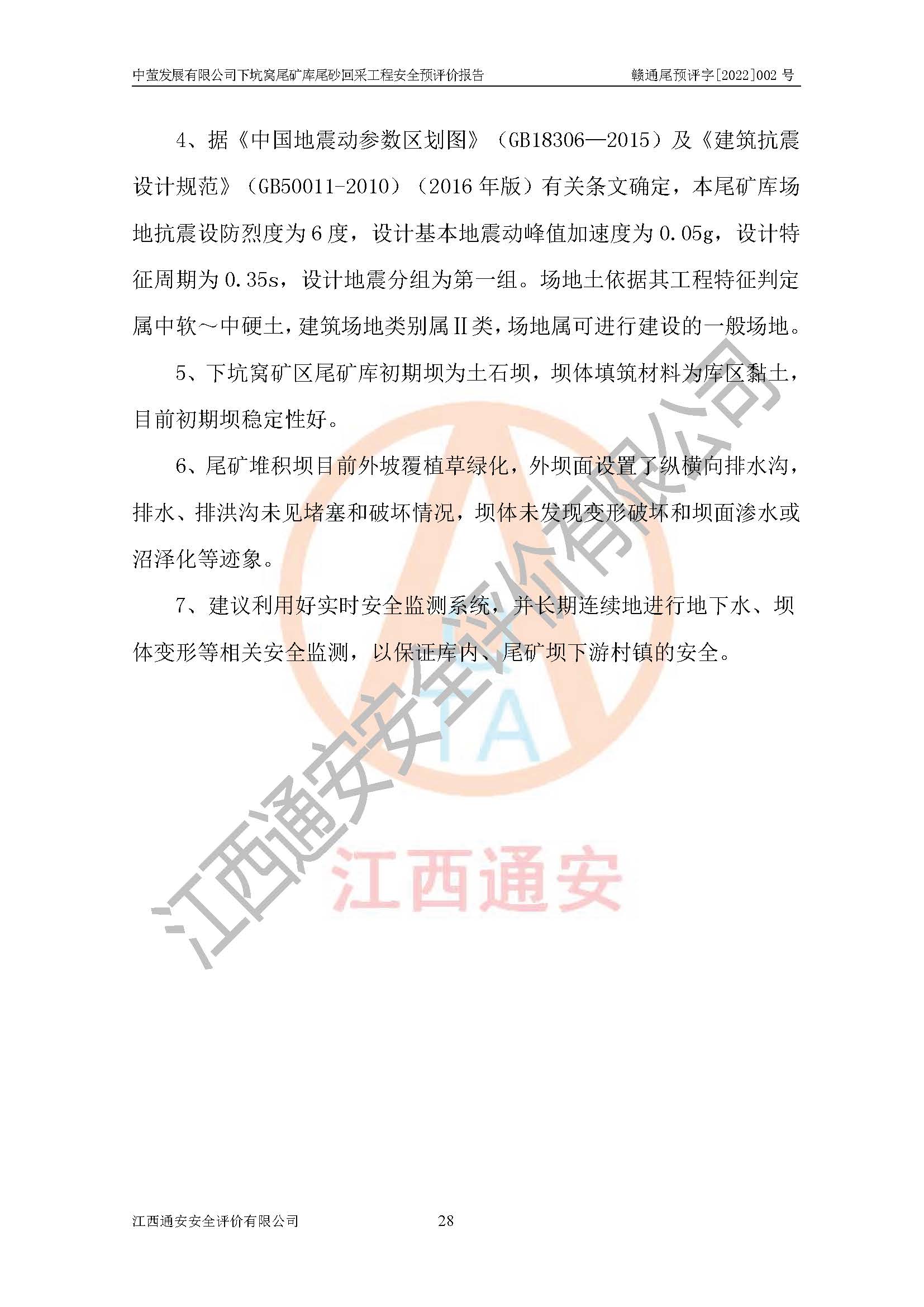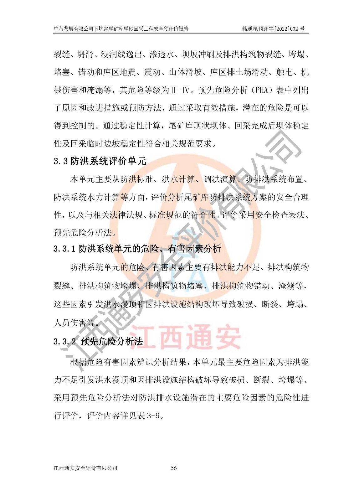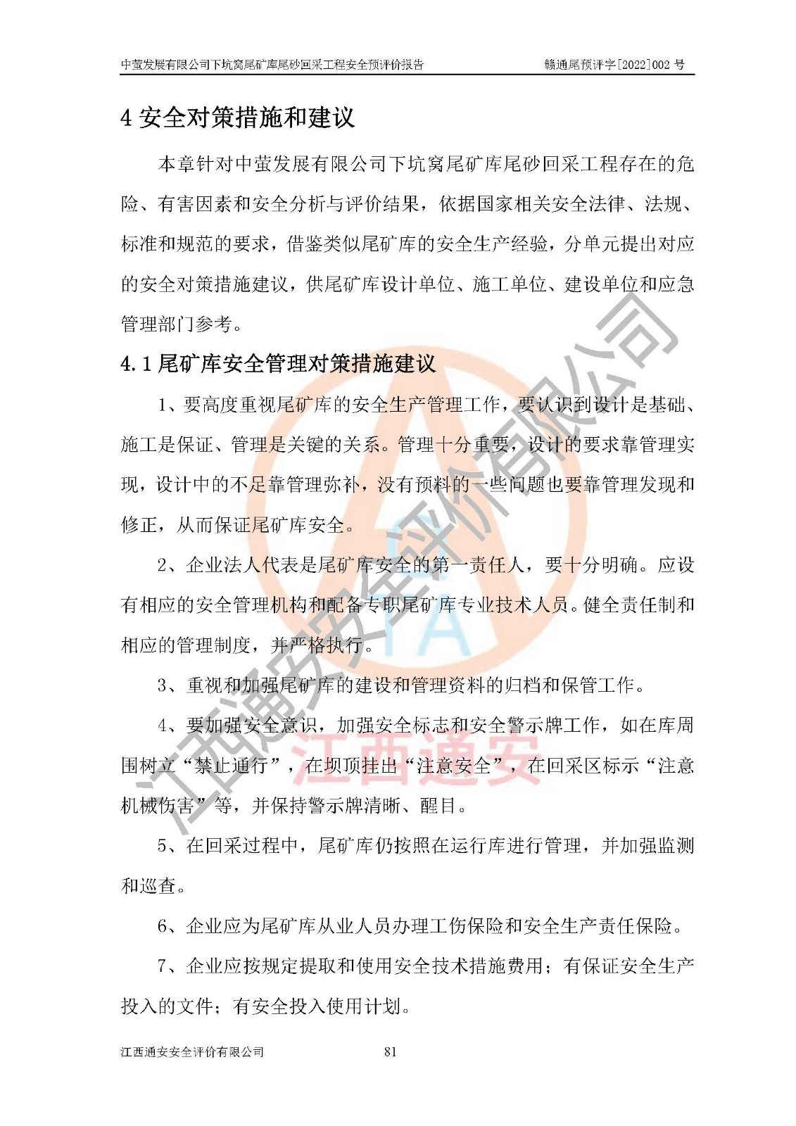 評價結(jié)論 | 建設(shè)單位依據(jù)《可研》建設(shè)方案,結(jié)合本報告提出的安全措施建議,進行中螢發(fā)展有限公司下坑窩尾礦庫尾砂回采工程后續(xù)設(shè)計、施工、生產(chǎn)、管理,則尾礦庫尾砂回采項目危險、有害因素的風險程度可以控制在可承受的范圍之內(nèi),下坑窩尾礦庫尾砂回采工程安全條件可滿足安全生產(chǎn)需要。 | |||