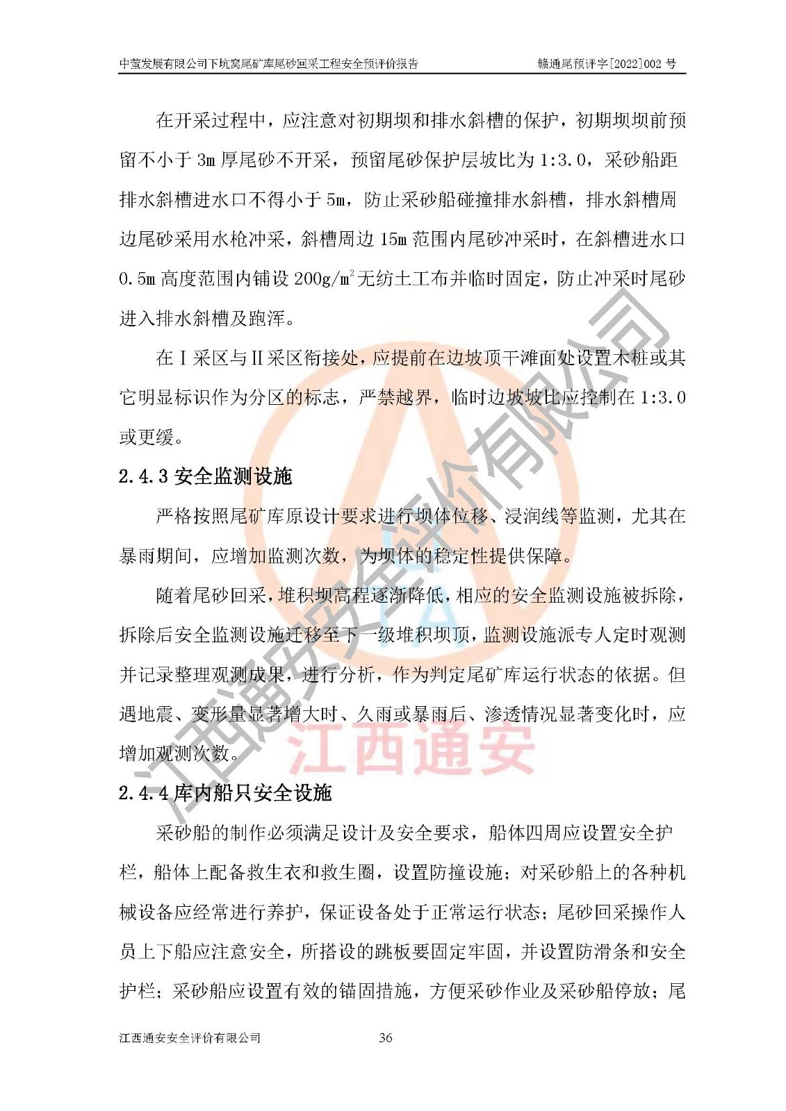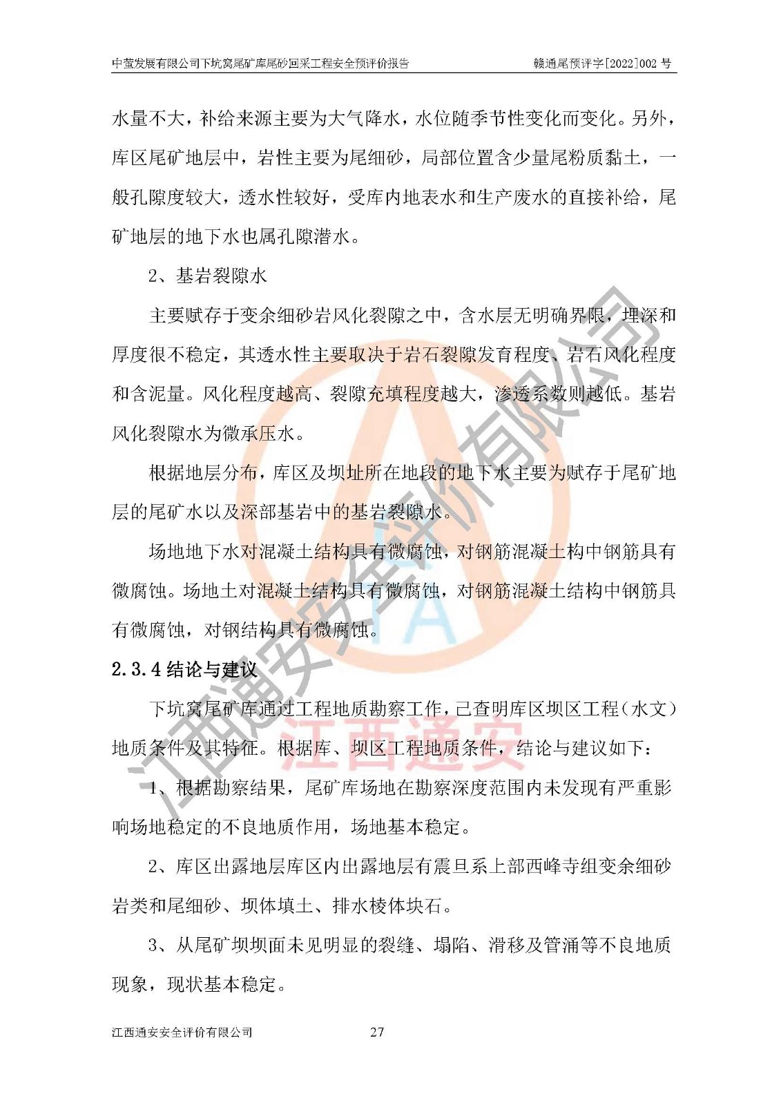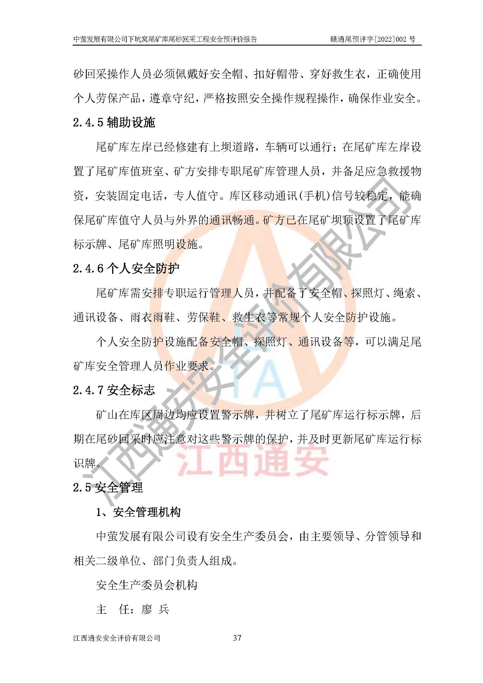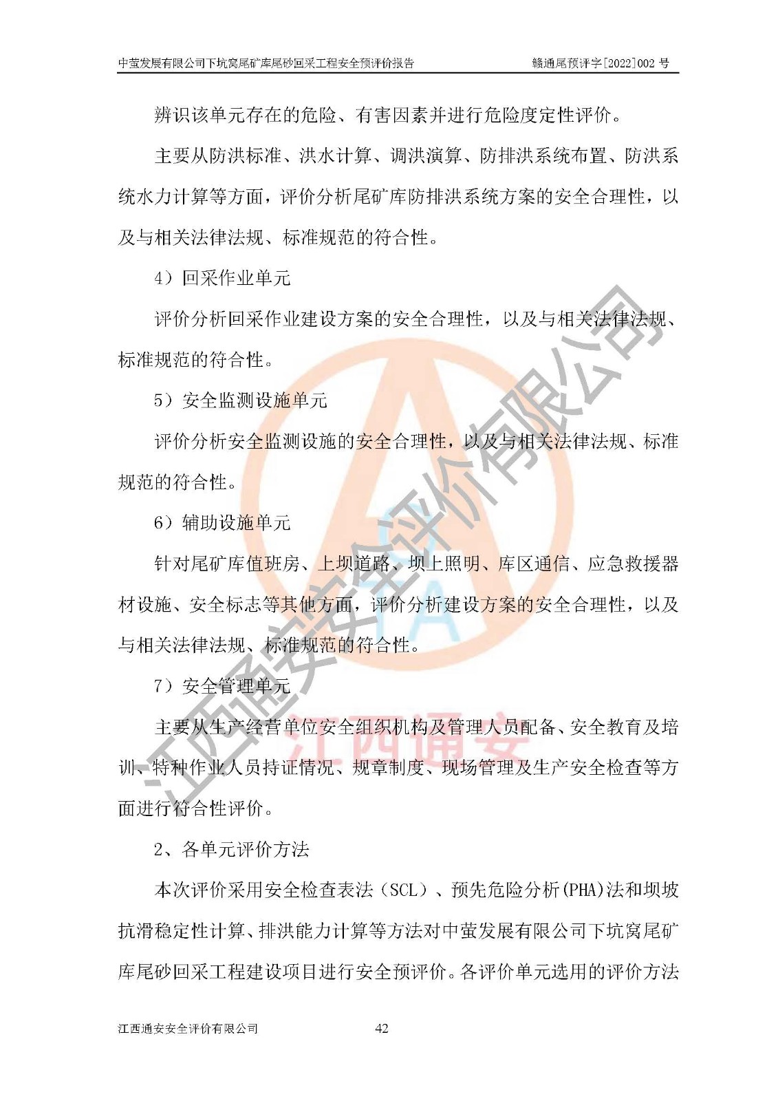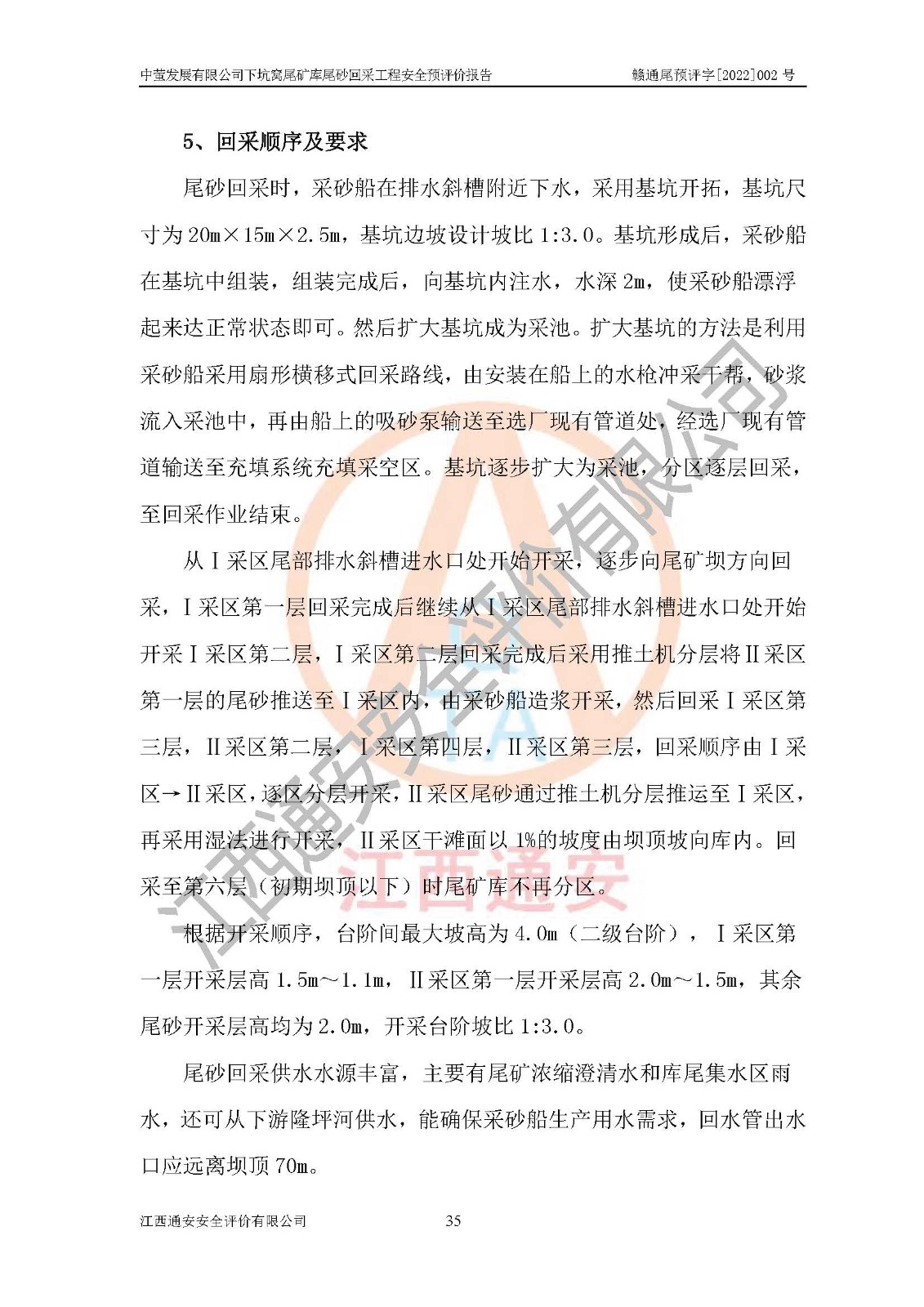 評價結(jié)論 | 建設(shè)單位依據(jù)《可研》建設(shè)方案,結(jié)合本報告提出的安全措施建議,進行中螢發(fā)展有限公司下坑窩尾礦庫尾砂回采工程后續(xù)設(shè)計、施工、生產(chǎn)、管理,則尾礦庫尾砂回采項目危險、有害因素的風險程度可以控制在可承受的范圍之內(nèi),下坑窩尾礦庫尾砂回采工程安全條件可滿足安全生產(chǎn)需要。 | |||