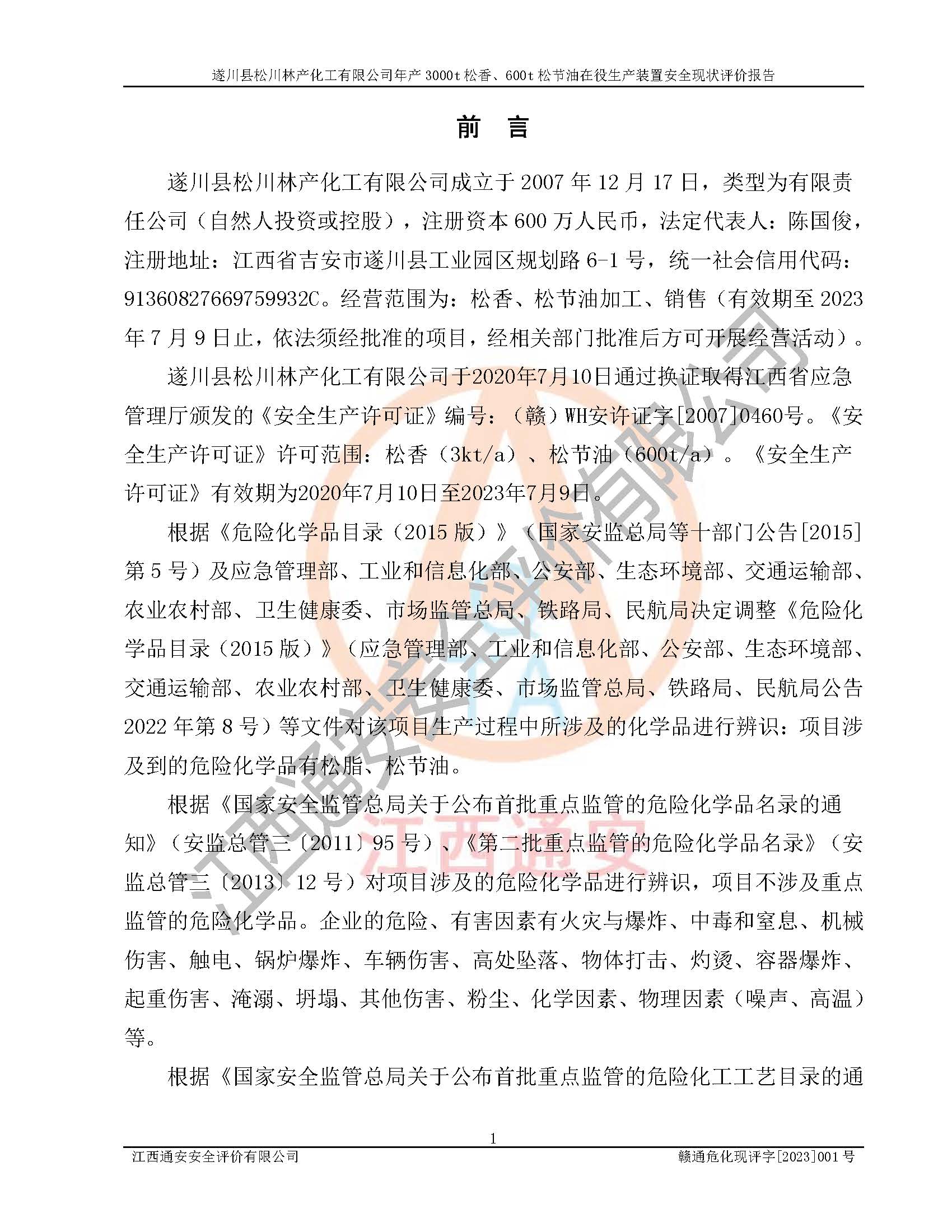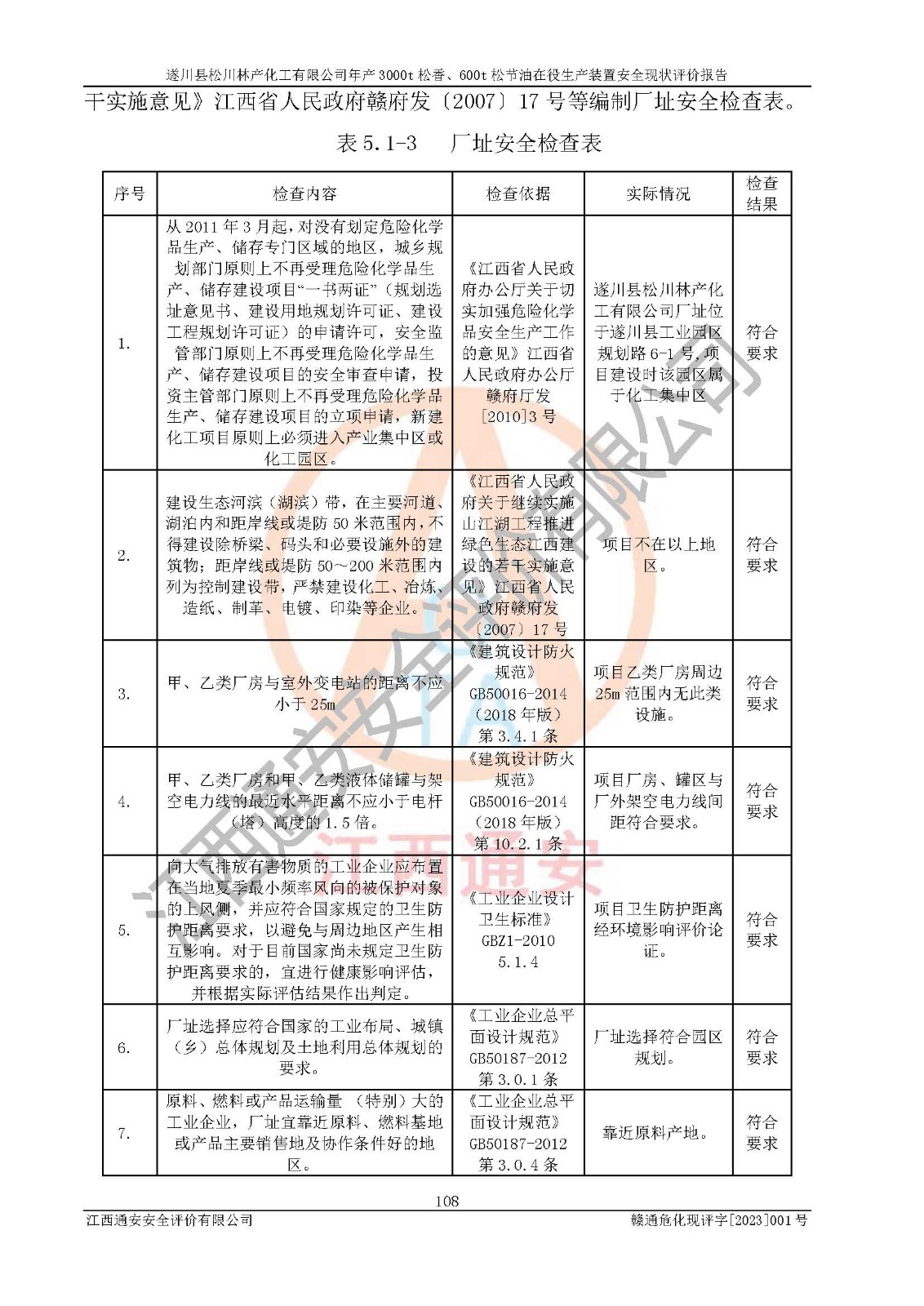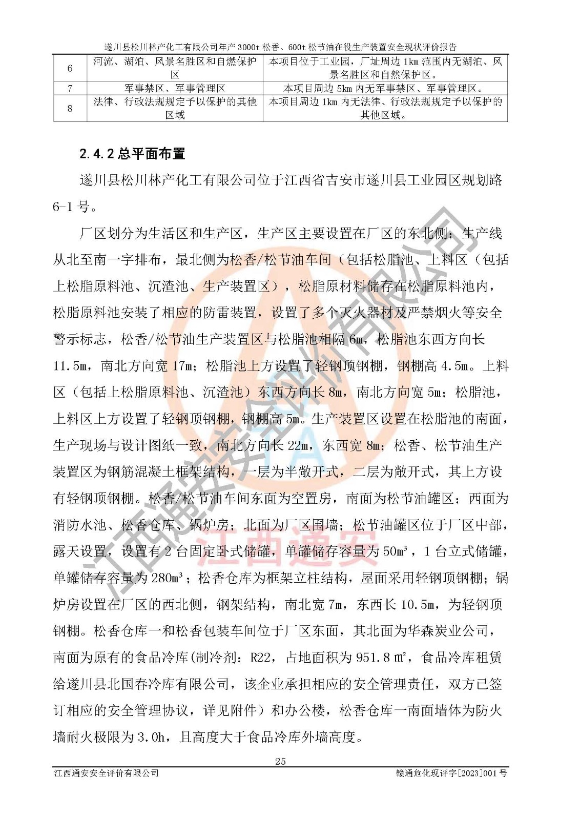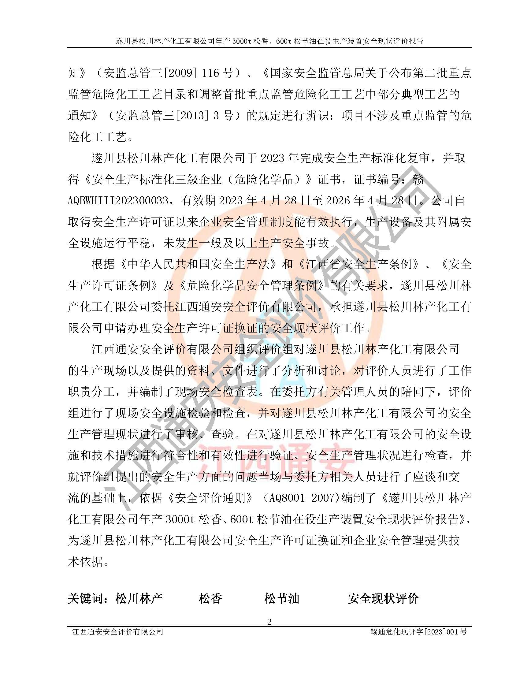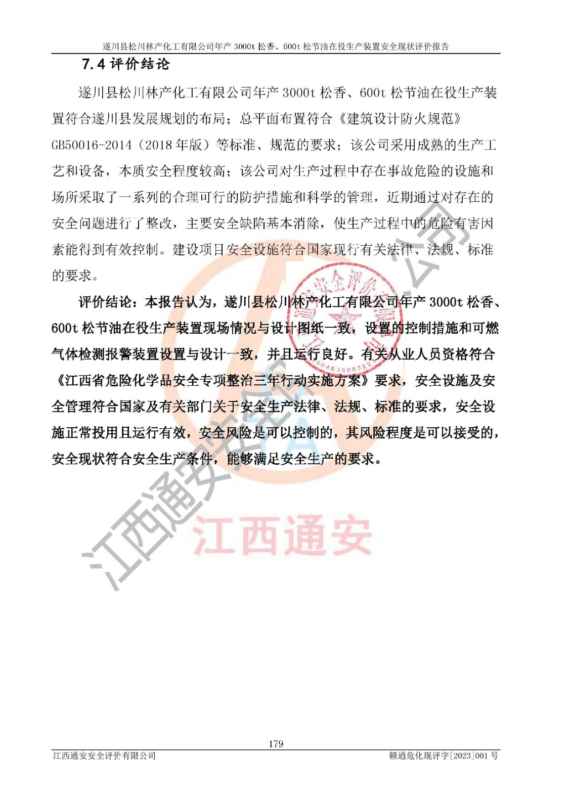 評價報告名稱 | 遂川縣松川林產(chǎn)化工有限公司年產(chǎn)3000t松香、600t松節(jié)油在役生產(chǎn)裝置安全現(xiàn)狀評價報告 | |||
