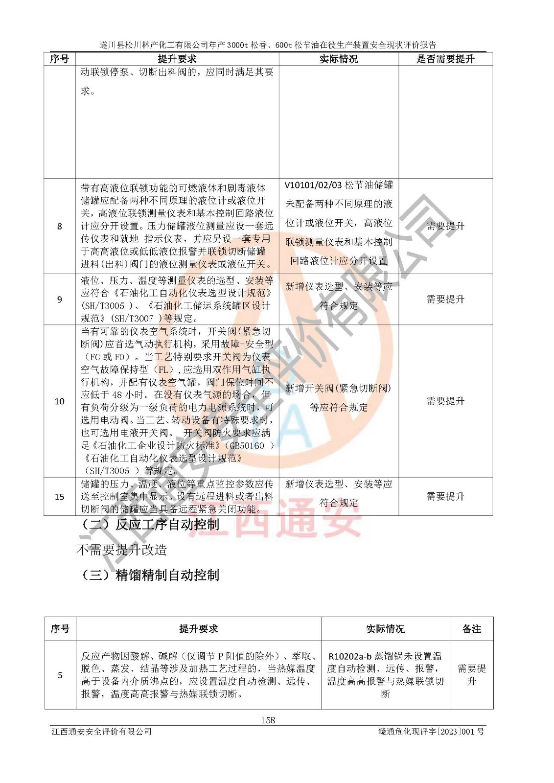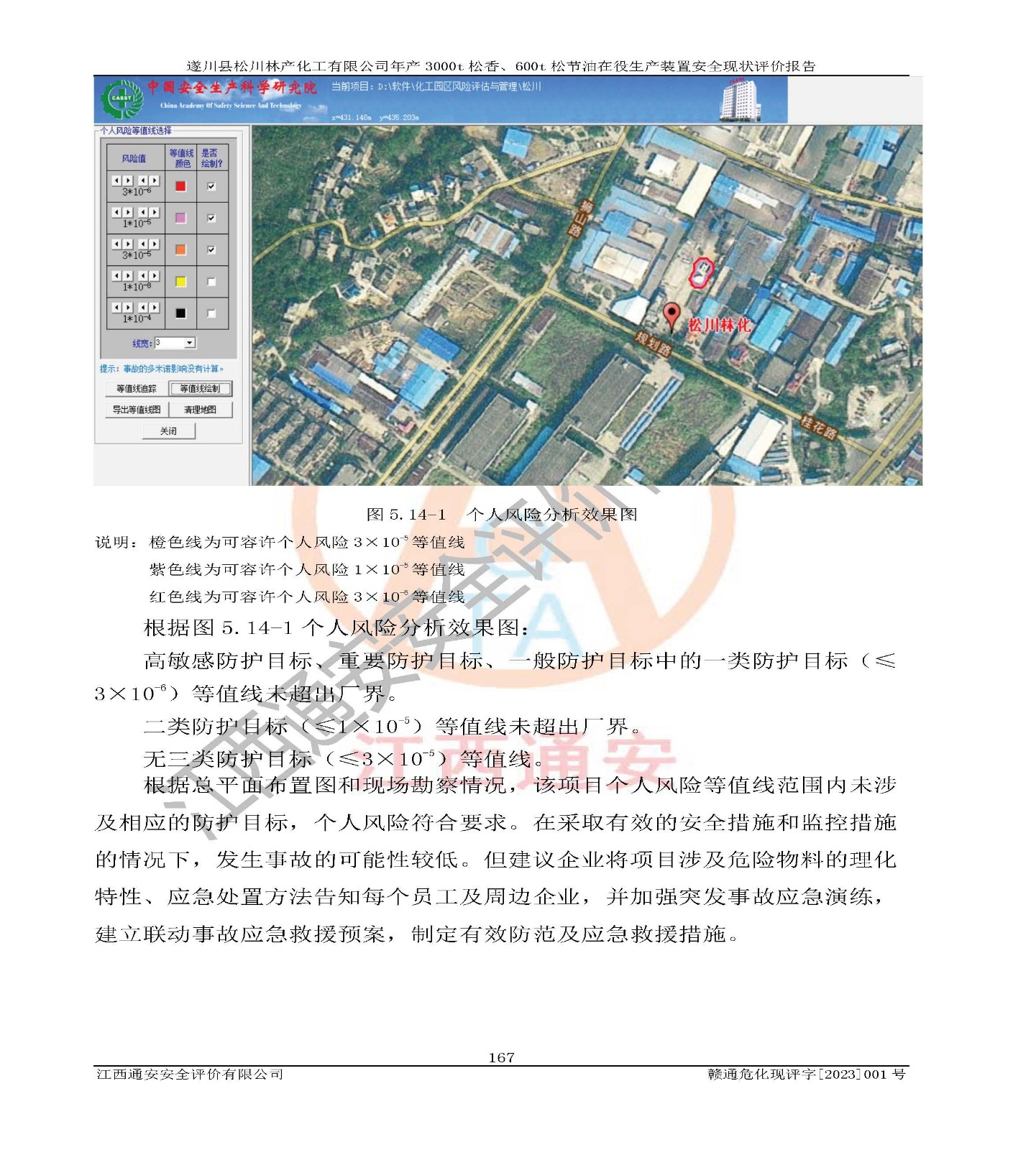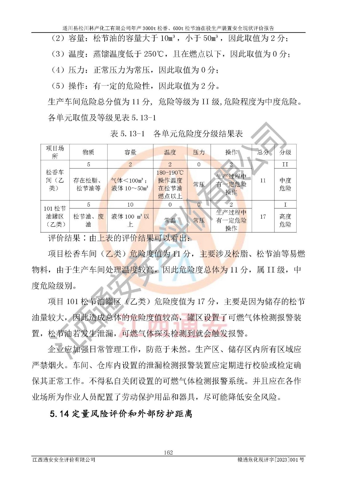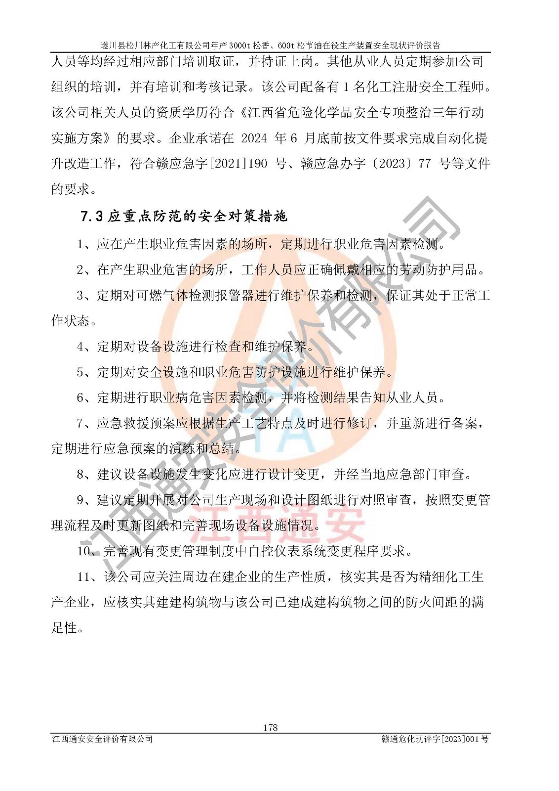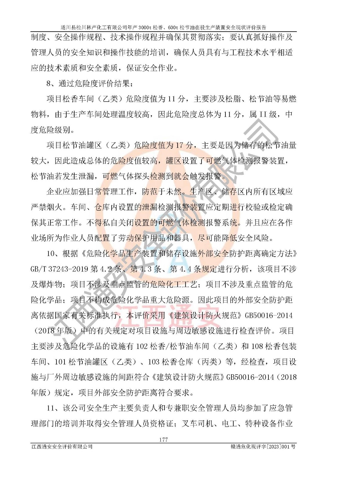 評價結(jié)論 | 本報告認為,遂川縣松川林產(chǎn)化工有限公司年產(chǎn)3000t松香、600t松節(jié)油在役生產(chǎn)裝置現(xiàn)場情況與設(shè)計圖紙一致,設(shè)置的控制措施和可燃氣體檢測報警裝置設(shè)置與設(shè)計一致,并且運行良好。有關(guān)從業(yè)人員資格符合《江西省危險化學品安全專項整治三年行動實施方案》要求,安全設(shè)施及安全管理符合**及有關(guān)部門關(guān)于安全生產(chǎn)法律、法規(guī)、標準的要求,安全設(shè)施正常投用且運行**,安全風險是可以控制的,其風險程度是可以接受的,安全現(xiàn)狀符合安全生產(chǎn)條件,能夠滿足安全生產(chǎn)的要求。。 | |||