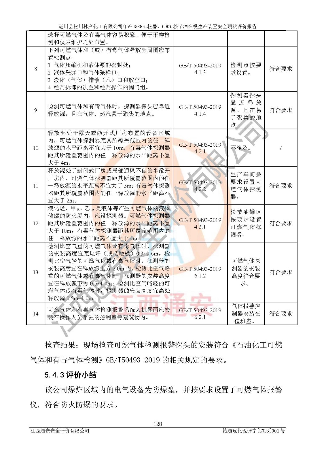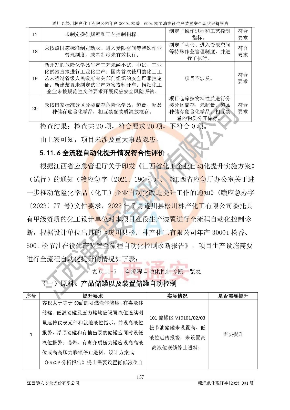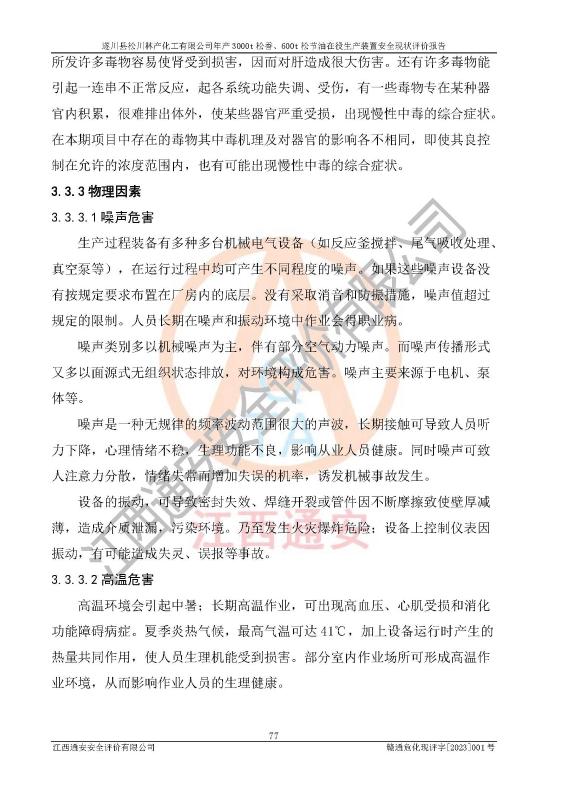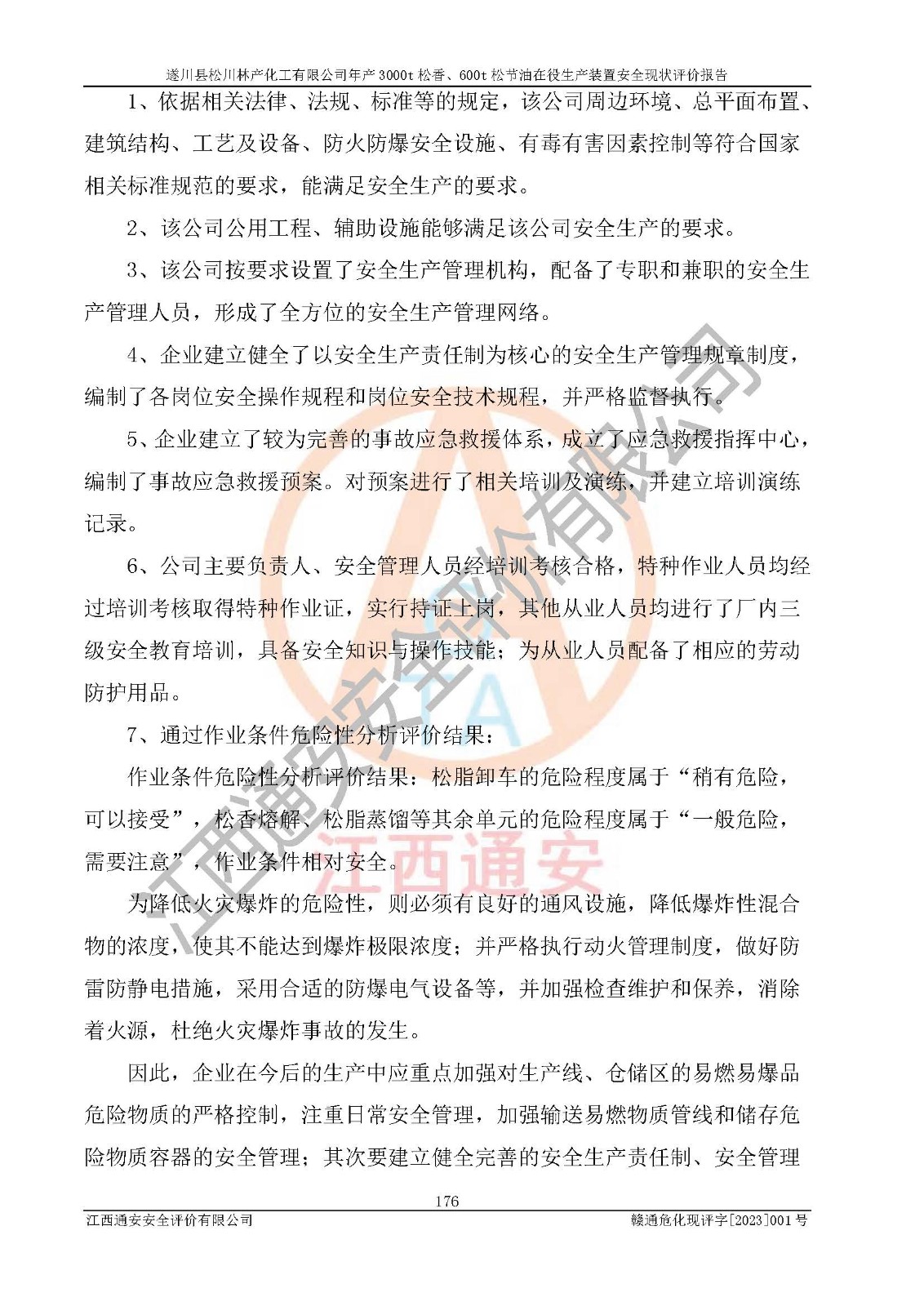 評價結(jié)論 | 本報告認為,遂川縣松川林產(chǎn)化工有限公司年產(chǎn)3000t松香、600t松節(jié)油在役生產(chǎn)裝置現(xiàn)場情況與設(shè)計圖紙一致,設(shè)置的控制措施和可燃氣體檢測報警裝置設(shè)置與設(shè)計一致,并且運行良好。有關(guān)從業(yè)人員資格符合《江西省危險化學品安全專項整治三年行動實施方案》要求,安全設(shè)施及安全管理符合**及有關(guān)部門關(guān)于安全生產(chǎn)法律、法規(guī)、標準的要求,安全設(shè)施正常投用且運行**,安全風險是可以控制的,其風險程度是可以接受的,安全現(xiàn)狀符合安全生產(chǎn)條件,能夠滿足安全生產(chǎn)的要求。。 | |||