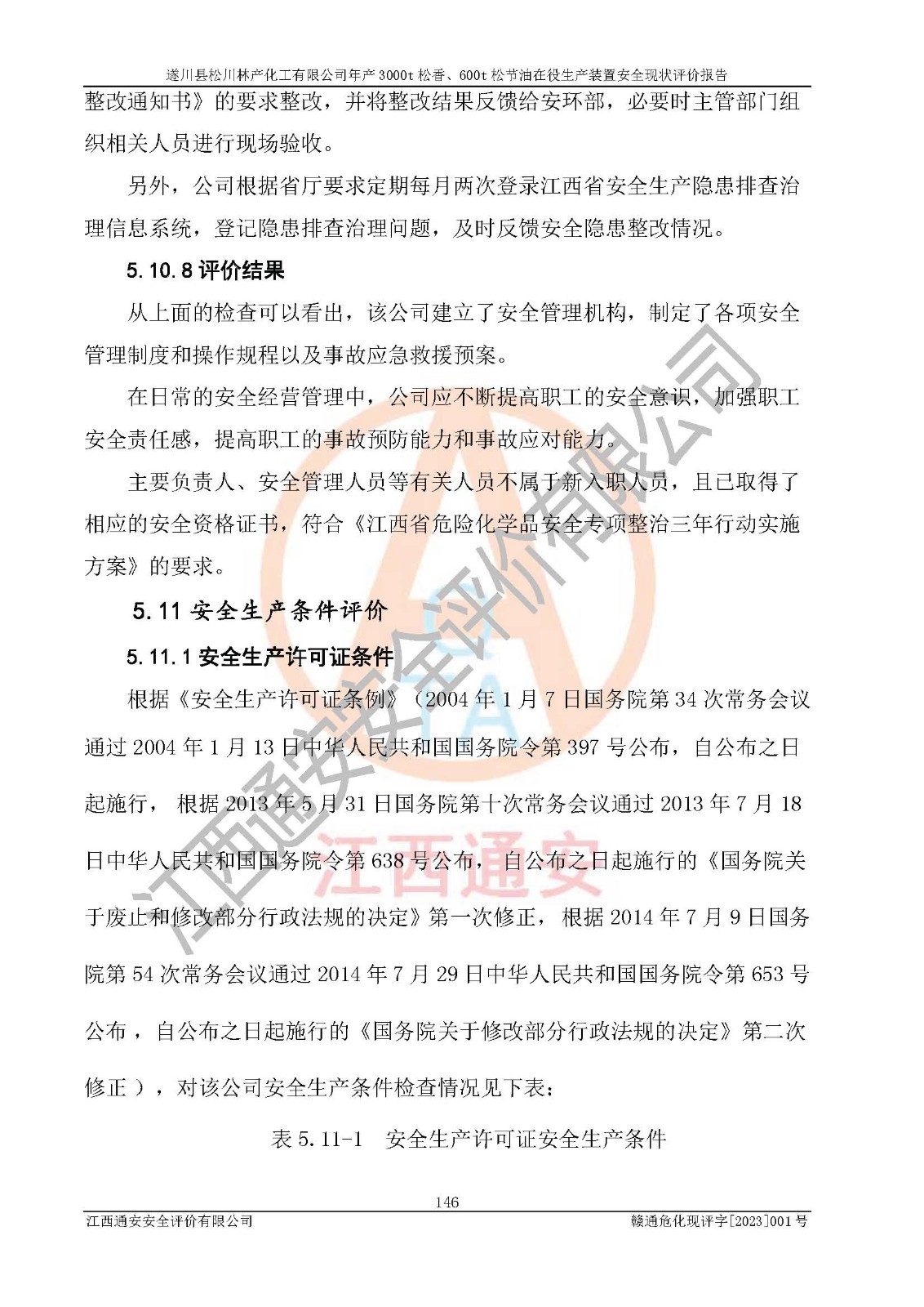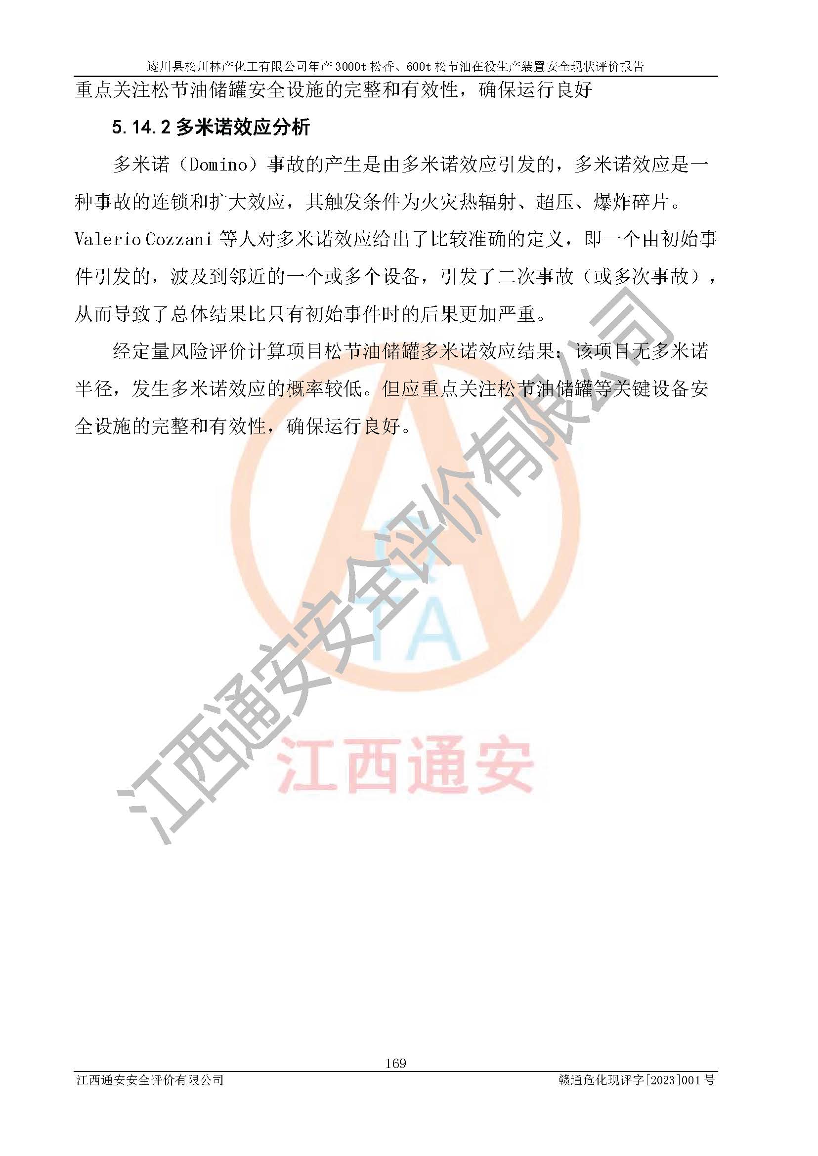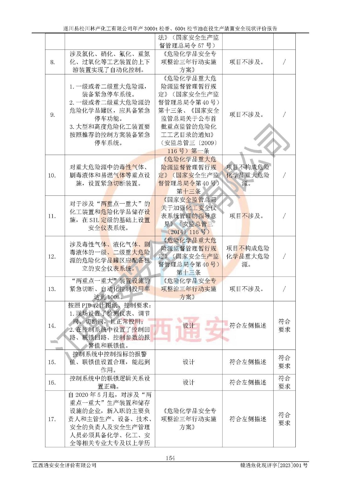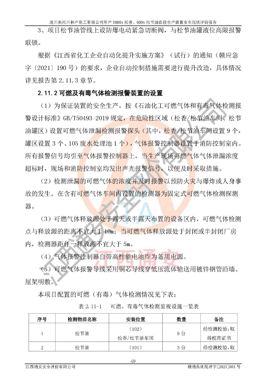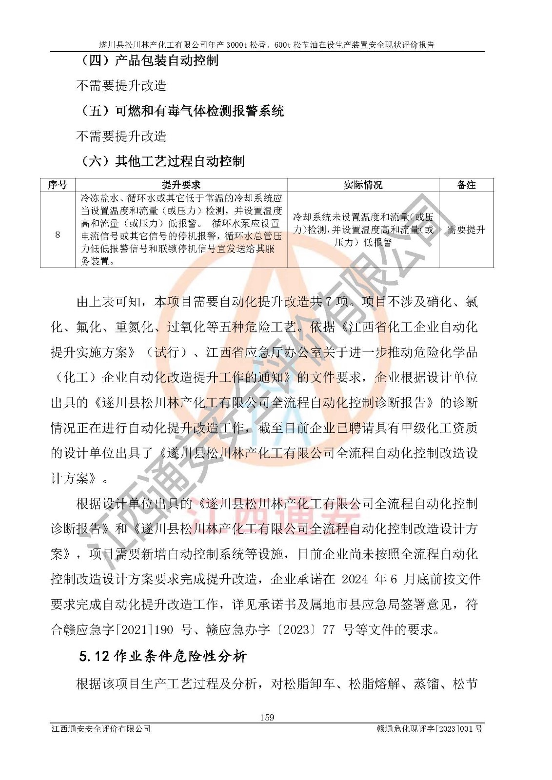 評價結(jié)論 | 本報告認為,遂川縣松川林產(chǎn)化工有限公司年產(chǎn)3000t松香、600t松節(jié)油在役生產(chǎn)裝置現(xiàn)場情況與設(shè)計圖紙一致,設(shè)置的控制措施和可燃氣體檢測報警裝置設(shè)置與設(shè)計一致,并且運行良好。有關(guān)從業(yè)人員資格符合《江西省危險化學品安全專項整治三年行動實施方案》要求,安全設(shè)施及安全管理符合**及有關(guān)部門關(guān)于安全生產(chǎn)法律、法規(guī)、標準的要求,安全設(shè)施正常投用且運行**,安全風險是可以控制的,其風險程度是可以接受的,安全現(xiàn)狀符合安全生產(chǎn)條件,能夠滿足安全生產(chǎn)的要求。。 | |||