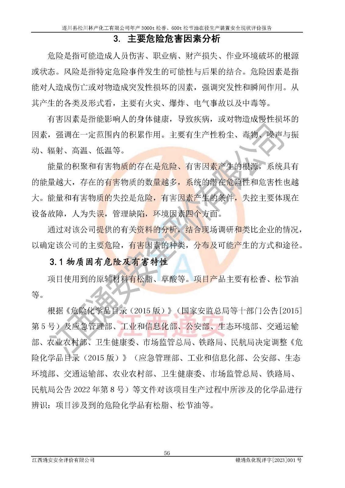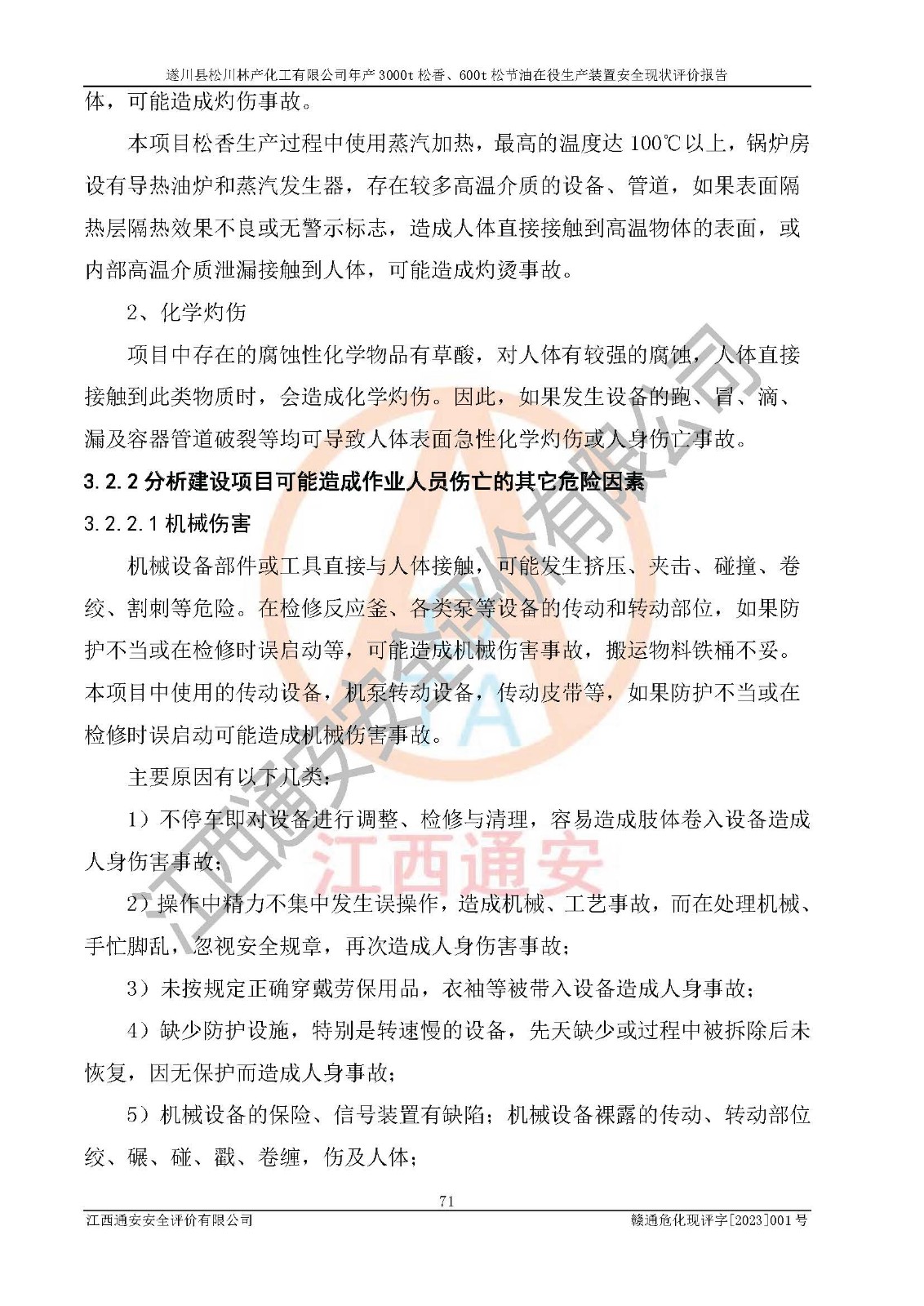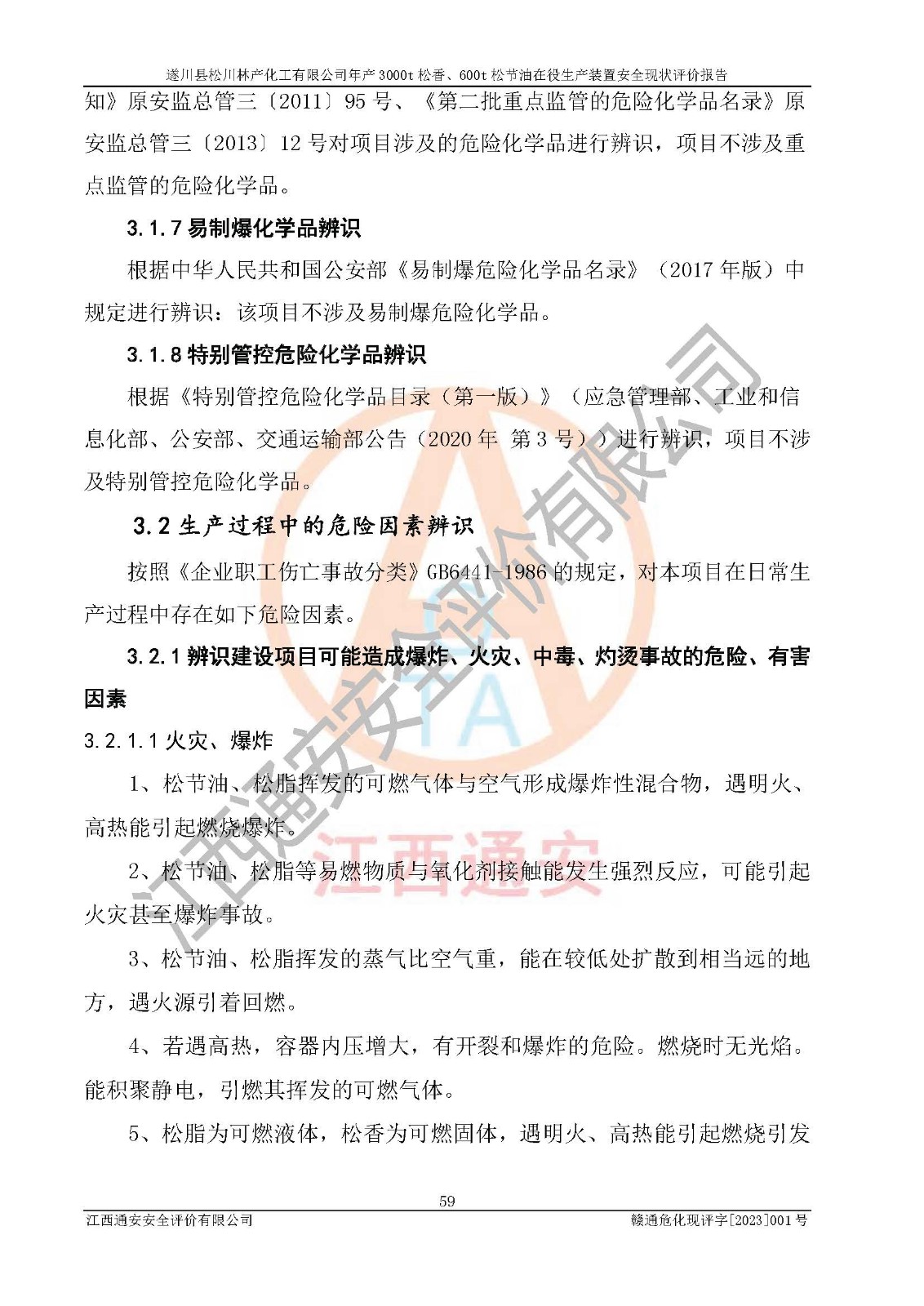 項目簡介 | 遂川縣松川林產(chǎn)化工有限公司成立于2007年12月17日,類型為有限責任公司(自然人投資或控股),注冊資本600萬人民幣,法定**人:陳國俊,注冊地址:江西省吉安市遂川縣工業(yè)園區(qū)規(guī)劃路6-1號,統(tǒng)一社會信用代碼:91360827669759932C。經(jīng)營范圍為:松香、松節(jié)油加工、銷售(**期至2023年7月9日止,依法須經(jīng)批準的項目,經(jīng)相關(guān)部門批準后方可開展經(jīng)營活動)。 遂川縣松川林產(chǎn)化工有限公司于2020年7月10日通過換證取得江西省應急管理廳頒發(fā)的《安全生產(chǎn)許可證》編號:(贛)WH安許證字[2007]0460號?!栋踩a(chǎn)許可證》許可范圍:松香(3kt/a)、松節(jié)油(600t/a)?!栋踩a(chǎn)許可證》**期為2020年7月10日至2023年7月9日。 根據(jù)《危險化學品目錄(2015版)》(**安監(jiān)總局等十部門公告[2015]第5號)及應急管理部、工業(yè)和信息化部、公安部、生態(tài)環(huán)境部、交通運輸部、農(nóng)業(yè)農(nóng)村部、衛(wèi)生健康委、市場監(jiān)管總局、鐵路局、民航局決定調(diào)整《危險化學品目錄(2015版)》(應急管理部、工業(yè)和信息化部、公安部、生態(tài)環(huán)境部、交通運輸部、農(nóng)業(yè)農(nóng)村部、衛(wèi)生健康委、市場監(jiān)管總局、鐵路局、民航局公告2022年第8號)等文件對該項目生產(chǎn)過程中所涉及的化學品進行辨識:項目涉及到的危險化學品有松脂、松節(jié)油。 根據(jù)《**安全監(jiān)管總局關(guān)于公布首批重點監(jiān)管的危險化學品名錄的通知》(安監(jiān)總管三〔2011〕95號)、《第二批重點監(jiān)管的危險化學品名錄》(安監(jiān)總管三〔2013〕12號)對項目涉及的危險化學品進行辨識,項目不涉及重點監(jiān)管的危險化學品。企業(yè)的危險、有害因素有火災與爆炸、中毒和窒息、機械傷害、觸電、鍋爐爆炸、**傷害、高處墜落、物體打擊、灼燙、容器爆炸、起重傷害、淹溺、坍塌、其他傷害、粉塵、化學因素、物理因素(噪聲、高溫)等。 根據(jù)《**安全監(jiān)管總局關(guān)于公布首批重點監(jiān)管的危險化工工藝目錄的通知》(安監(jiān)總管三[2009] 116號)、《**安全監(jiān)管總局關(guān)于公布第二批重點監(jiān)管危險化工工藝目錄和調(diào)整首批重點監(jiān)管危險化工工藝中部分典型工藝的通知》(安監(jiān)總管三[2013] 3號)的規(guī)定進行辨識:項目不涉及重點監(jiān)管的危險化工工藝。 遂川縣松川林產(chǎn)化工有限公司于2023年完成安全生產(chǎn)標準化復審,并取得《安全生產(chǎn)標準化三級企業(yè)(危險化學品)》證書,證書編號:贛AQBWHIII202300033,**期2023年4月28日至2026年4月28日。公司自取得安全生產(chǎn)許可證以來企業(yè)安全管理制度能**執(zhí)行,生產(chǎn)設(shè)備及其附屬安全設(shè)施運行平穩(wěn),未發(fā)生一般及以上生產(chǎn)安全事故。 | |||