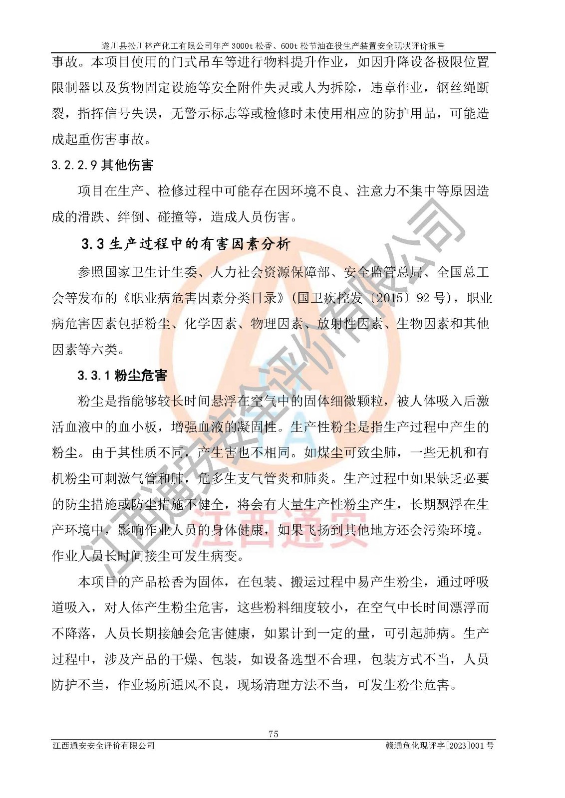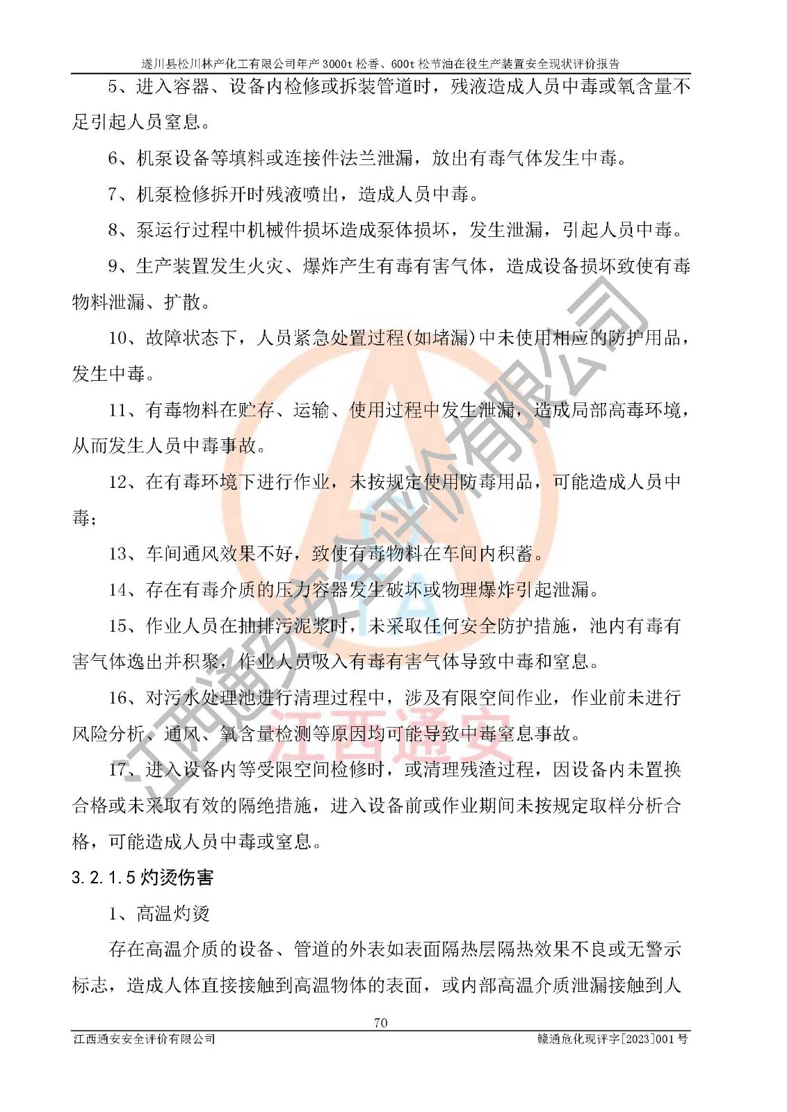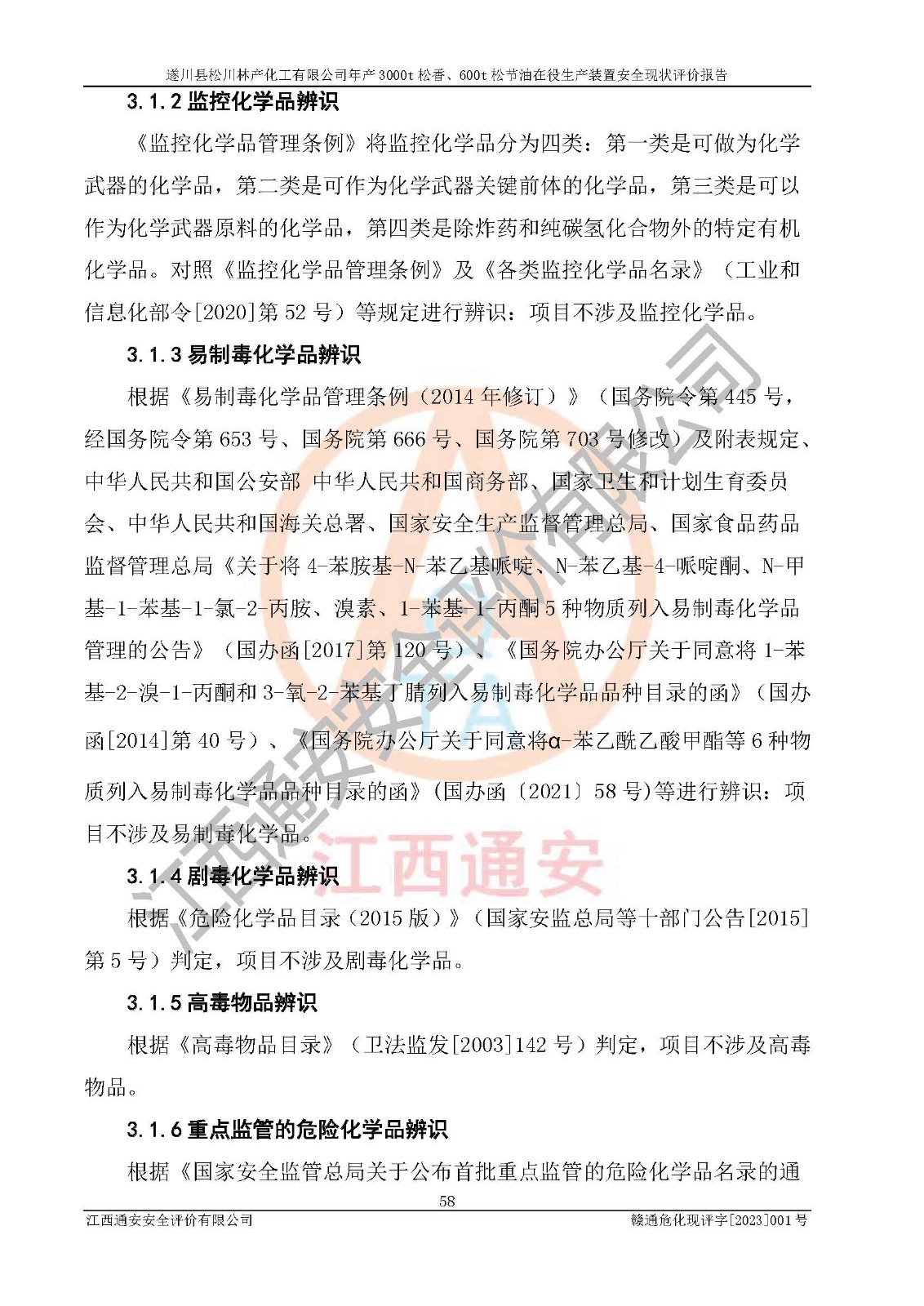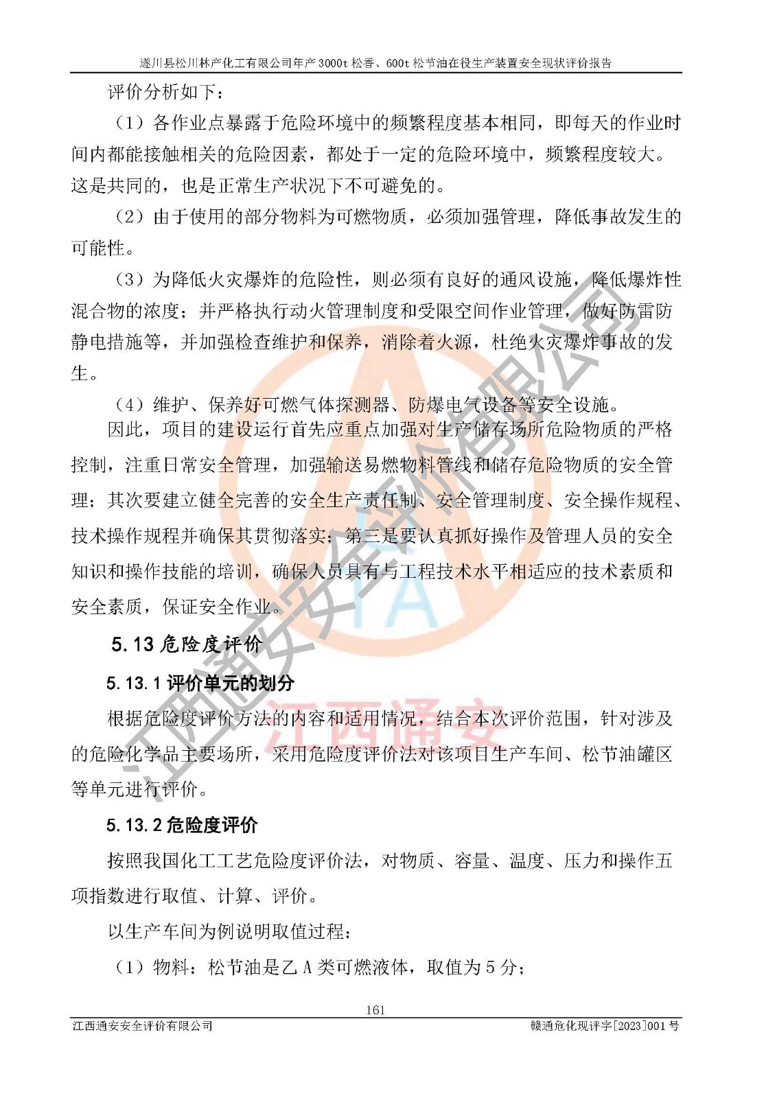 項目簡介 | 遂川縣松川林產(chǎn)化工有限公司成立于2007年12月17日,類型為有限責任公司(自然人投資或控股),注冊資本600萬人民幣,法定**人:陳國俊,注冊地址:江西省吉安市遂川縣工業(yè)園區(qū)規(guī)劃路6-1號,統(tǒng)一社會信用代碼:91360827669759932C。經(jīng)營范圍為:松香、松節(jié)油加工、銷售(**期至2023年7月9日止,依法須經(jīng)批準的項目,經(jīng)相關(guān)部門批準后方可開展經(jīng)營活動)。 遂川縣松川林產(chǎn)化工有限公司于2020年7月10日通過換證取得江西省應急管理廳頒發(fā)的《安全生產(chǎn)許可證》編號:(贛)WH安許證字[2007]0460號?!栋踩a(chǎn)許可證》許可范圍:松香(3kt/a)、松節(jié)油(600t/a)?!栋踩a(chǎn)許可證》**期為2020年7月10日至2023年7月9日。 根據(jù)《危險化學品目錄(2015版)》(**安監(jiān)總局等十部門公告[2015]第5號)及應急管理部、工業(yè)和信息化部、公安部、生態(tài)環(huán)境部、交通運輸部、農(nóng)業(yè)農(nóng)村部、衛(wèi)生健康委、市場監(jiān)管總局、鐵路局、民航局決定調(diào)整《危險化學品目錄(2015版)》(應急管理部、工業(yè)和信息化部、公安部、生態(tài)環(huán)境部、交通運輸部、農(nóng)業(yè)農(nóng)村部、衛(wèi)生健康委、市場監(jiān)管總局、鐵路局、民航局公告2022年第8號)等文件對該項目生產(chǎn)過程中所涉及的化學品進行辨識:項目涉及到的危險化學品有松脂、松節(jié)油。 根據(jù)《**安全監(jiān)管總局關(guān)于公布首批重點監(jiān)管的危險化學品名錄的通知》(安監(jiān)總管三〔2011〕95號)、《第二批重點監(jiān)管的危險化學品名錄》(安監(jiān)總管三〔2013〕12號)對項目涉及的危險化學品進行辨識,項目不涉及重點監(jiān)管的危險化學品。企業(yè)的危險、有害因素有火災與爆炸、中毒和窒息、機械傷害、觸電、鍋爐爆炸、**傷害、高處墜落、物體打擊、灼燙、容器爆炸、起重傷害、淹溺、坍塌、其他傷害、粉塵、化學因素、物理因素(噪聲、高溫)等。 根據(jù)《**安全監(jiān)管總局關(guān)于公布首批重點監(jiān)管的危險化工工藝目錄的通知》(安監(jiān)總管三[2009] 116號)、《**安全監(jiān)管總局關(guān)于公布第二批重點監(jiān)管危險化工工藝目錄和調(diào)整首批重點監(jiān)管危險化工工藝中部分典型工藝的通知》(安監(jiān)總管三[2013] 3號)的規(guī)定進行辨識:項目不涉及重點監(jiān)管的危險化工工藝。 遂川縣松川林產(chǎn)化工有限公司于2023年完成安全生產(chǎn)標準化復審,并取得《安全生產(chǎn)標準化三級企業(yè)(危險化學品)》證書,證書編號:贛AQBWHIII202300033,**期2023年4月28日至2026年4月28日。公司自取得安全生產(chǎn)許可證以來企業(yè)安全管理制度能**執(zhí)行,生產(chǎn)設(shè)備及其附屬安全設(shè)施運行平穩(wěn),未發(fā)生一般及以上生產(chǎn)安全事故。 | |||