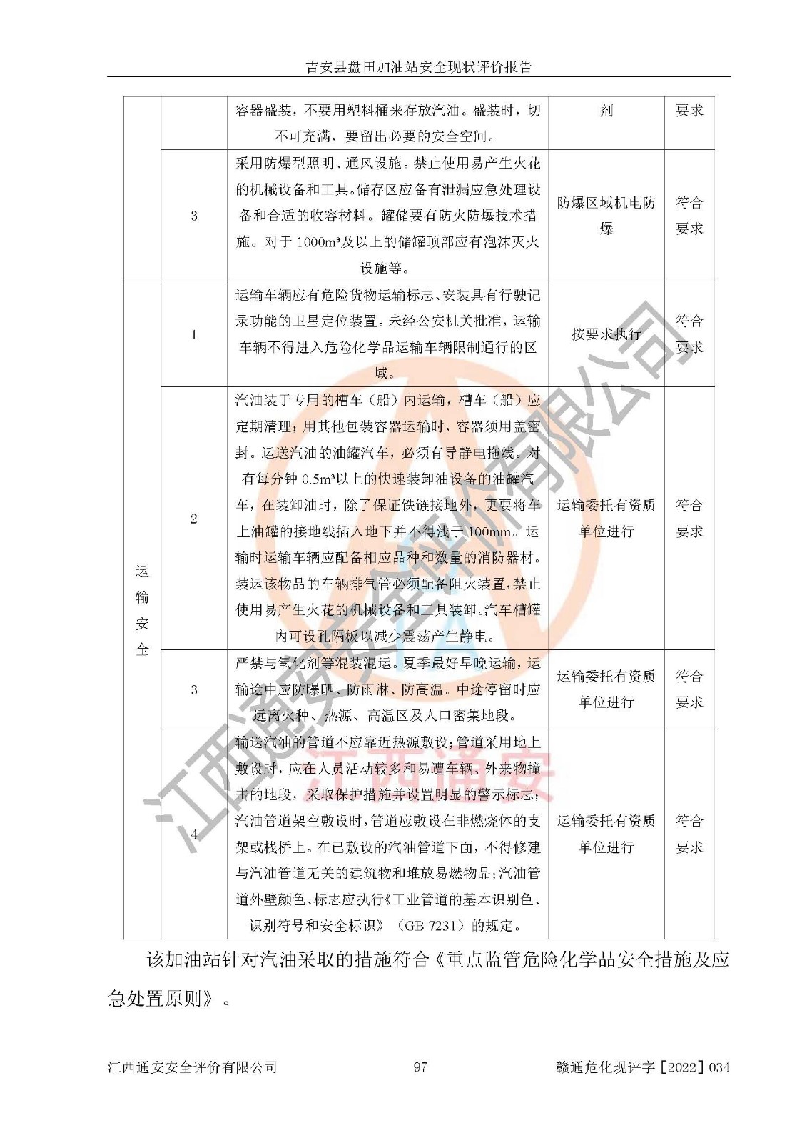 評價結(jié)論 | 吉安縣盤田加油站站址合理,周邊環(huán)境良好,與敏感防護(hù)目標(biāo)間距符合規(guī)范要求,站區(qū)建構(gòu)筑物之間的防火間距、耐火等級符合標(biāo)準(zhǔn)要求,與總平面布置圖一致,加油卸油工藝及設(shè)備設(shè)施合理,工藝布置得當(dāng),防雷設(shè)施經(jīng)檢測合格,采取的工藝安全設(shè)施符合規(guī)范要求;該加油站制定了安全管理制度和操作規(guī)程,人員經(jīng)培訓(xùn)合格后上崗,安全管理人員經(jīng)考核合格并取得安全合格證,能按照法律法規(guī)要求開展安全生產(chǎn)管理工作。 綜上:吉安縣盤田加油站符合《汽車加油加氣加氫站技術(shù)標(biāo)準(zhǔn)》GB50156-2021等標(biāo)準(zhǔn)規(guī)范的要求,安全風(fēng)險可控,滿足危險化學(xué)品經(jīng)營的安全條件。 | |||