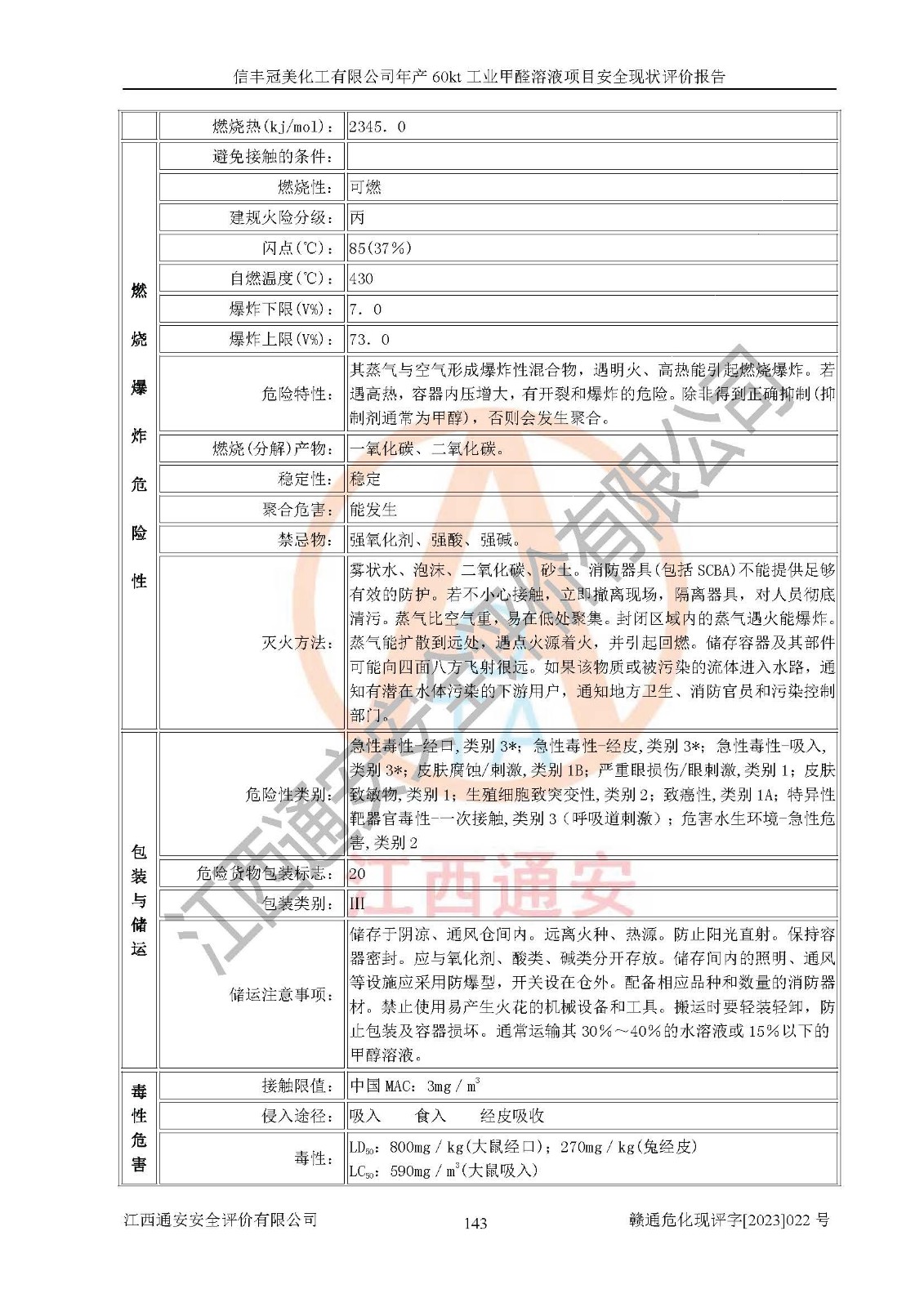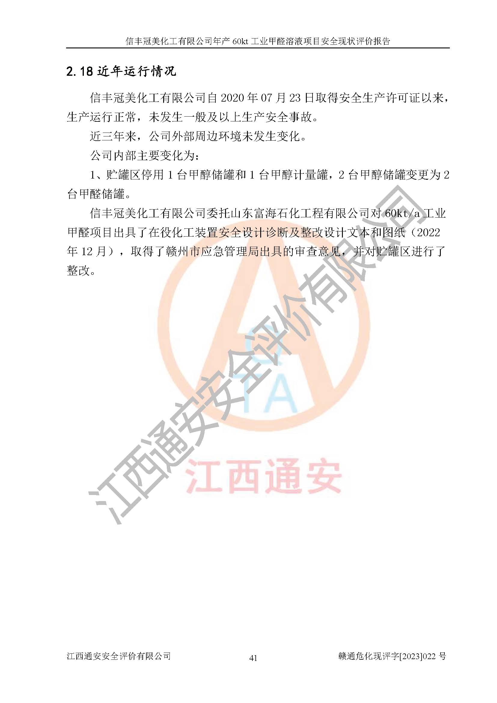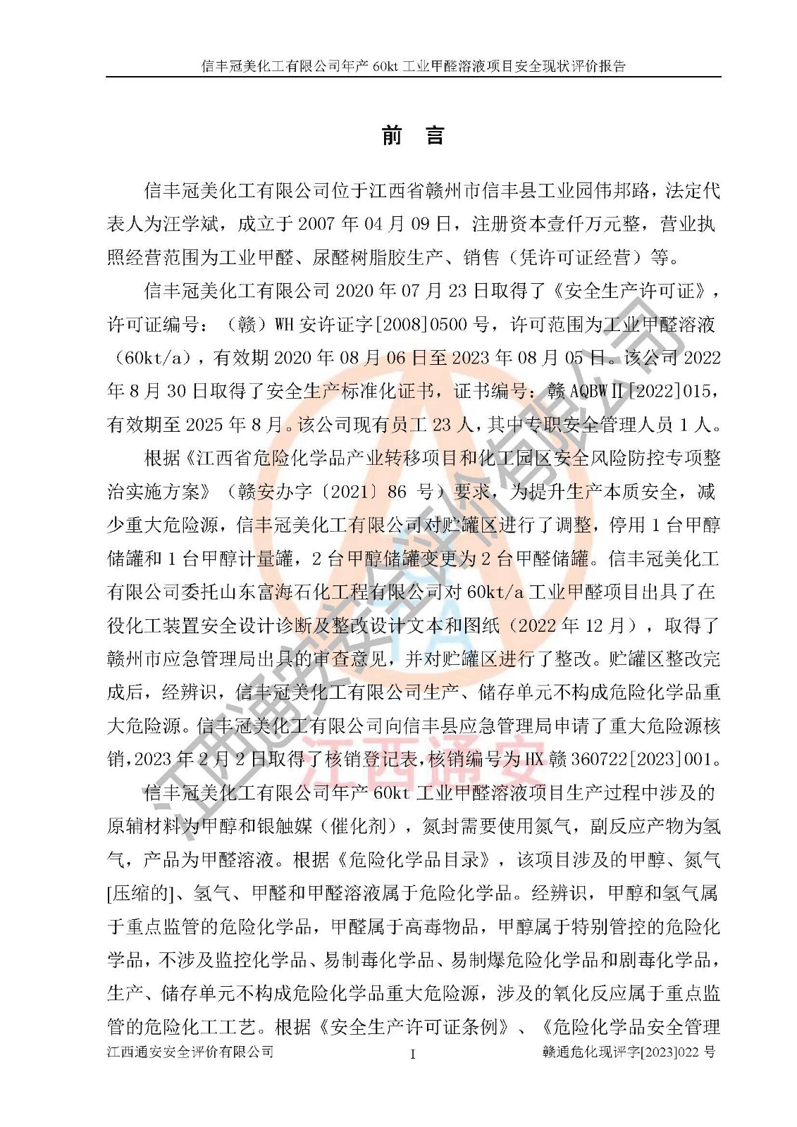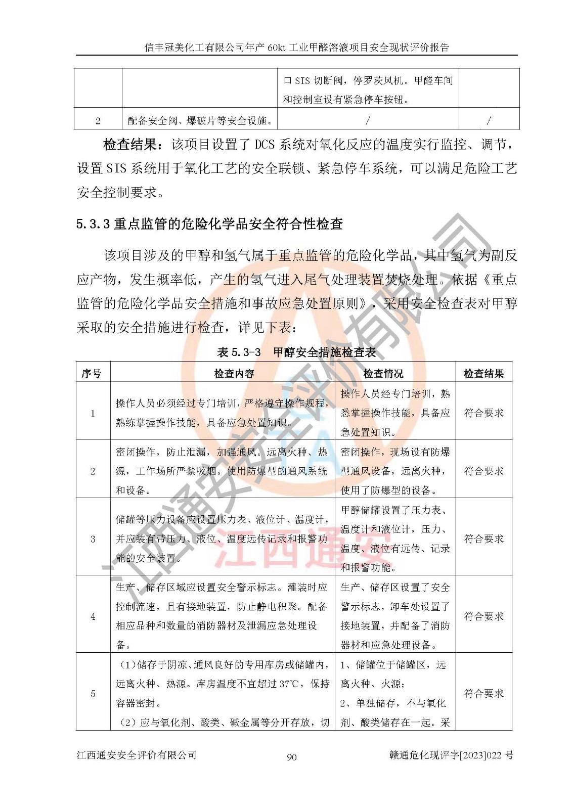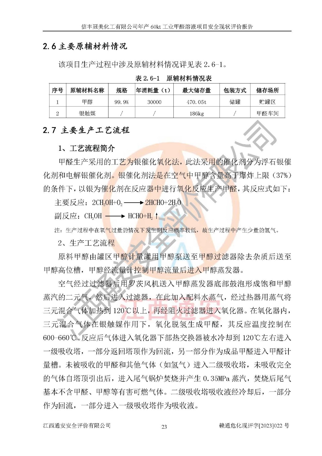 信豐冠美化工有限公司位于江西省贛州市信豐縣工業(yè)園偉邦路,法定**人為汪學斌,成立于2007年04月09日,注冊資本壹仟萬元整,營業(yè)執(zhí)照經營范圍為工業(yè)甲醛、尿醛樹脂膠生產、銷售(憑許可證經營)等。 信豐冠美化工有限公司2020年07月23日取得了《安全生產許可證》,許可證編號:(贛)WH安許證字[2008]0500號,許可范圍為工業(yè)甲醛溶液(60kt/a),**期2020年08月06日至2023年08月05日。該公司2022年8月30日取得了安全生產標準化證書,證書編號:贛AQBWⅡ[2022]015,**期至2025年8月。該公司現(xiàn)有員工23人,其中專職安全管理人員1人。 根據《江西省危險化學品產業(yè)轉移項目和化工園區(qū)安全風險防控專項整治實施方案》(贛安辦字〔2021〕86 號)要求,為提升生產本質安全,減少重大危險源,信豐冠美化工有限公司對貯罐區(qū)進行了調整,停用1臺甲醇儲罐和1臺甲醇計量罐,2臺甲醇儲罐變更為2臺甲醛儲罐。信豐冠美化工有限公司委托山東富海石化工程有限公司對60kt/a工業(yè)甲醛項目出具了在役化工裝置安全設計診斷及整改設計文本和圖紙(2022年12月),取得了贛州市應急管理局出具的審查意見,并對貯罐區(qū)進行了整改。貯罐區(qū)整改完成后,經辨識,信豐冠美化工有限公司生產、儲存單元不構成危險化學品重大危險源。信豐冠美化工有限公司向信豐縣應急管理局申請了重大危險源核銷,2023年2月2日取得了核銷登記表,核銷編號為HX贛360722[2023]001。 信豐冠美化工有限公司年產60kt工業(yè)甲醛溶液項目生產過程中涉及的原輔材料為甲醇和銀觸媒(催化劑),氮封需要使用氮氣,副反應產物為氫氣,產品為甲醛溶液。根據《危險化學品目錄》,該項目涉及的甲醇、氮氣[壓縮的]、氫氣、甲醛和甲醛溶液屬于危險化學品。經辨識,甲醇和氫氣屬于重點監(jiān)管的危險化學品,甲醛屬于高毒物品,甲醇屬于特別管控的危險化學品,不涉及監(jiān)控化學品、易制毒化學品、易制爆危險化學品和劇毒化學品,生產、儲存單元不構成危險化學品重大危險源,涉及的氧化反應屬于重點監(jiān)管的危險化工工藝。根據《安全生產許可證條例》、《危險化學品安全管理條例》和《危險化學品生產企業(yè)安全生產許可實施辦法》的相關規(guī)定,該項目甲醛溶液屬于危險化學品,需要辦理危險化學品安全生產許可證。根據生產工藝特點及物料的理化特性可知,該項目生產過程中存在火災與爆炸、中毒與窒息、觸電、機械傷害等危險有害因素。 該公司自2020年07月23日取得安全生產許可證以來,生產運行正常,未發(fā)生一般及以上生產安全事故。 |