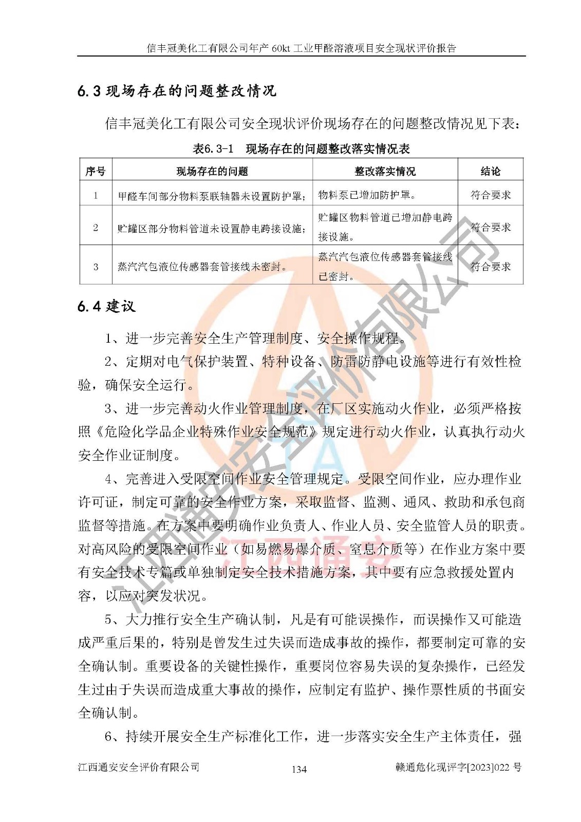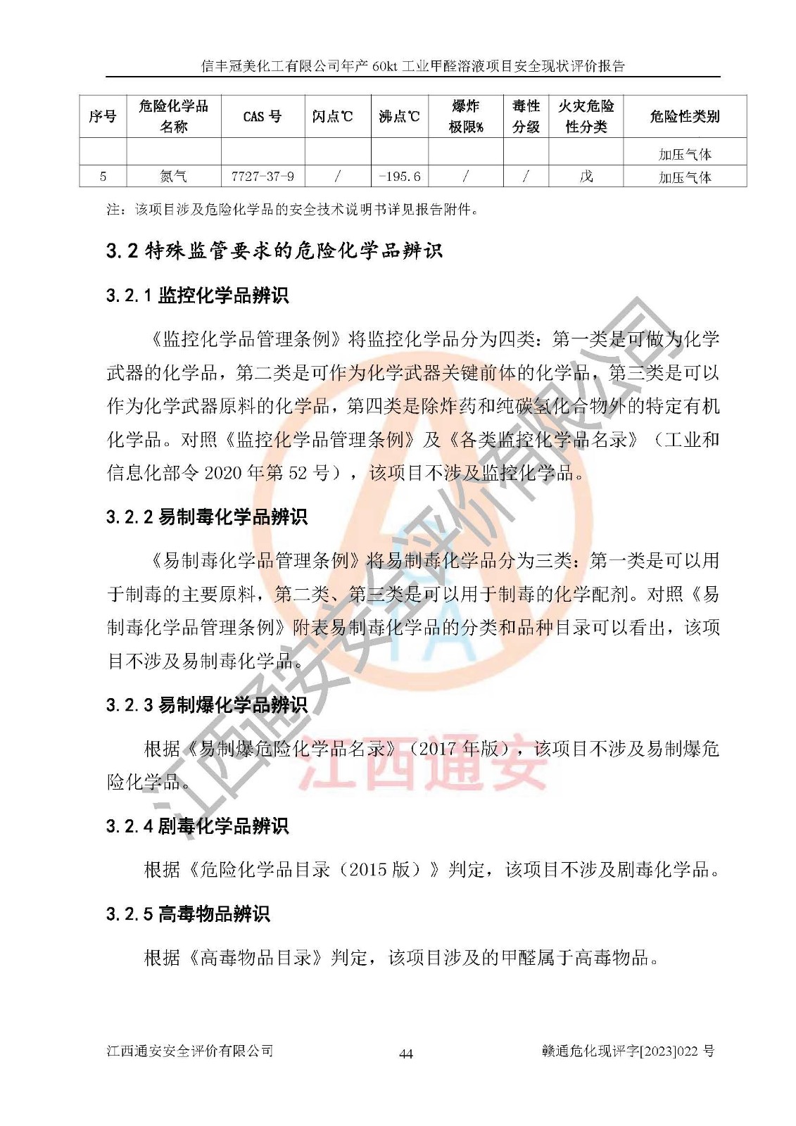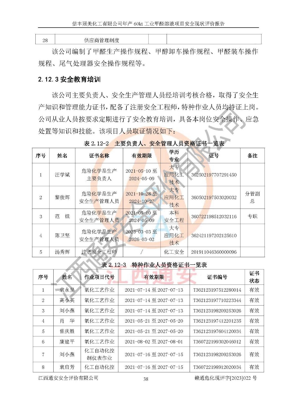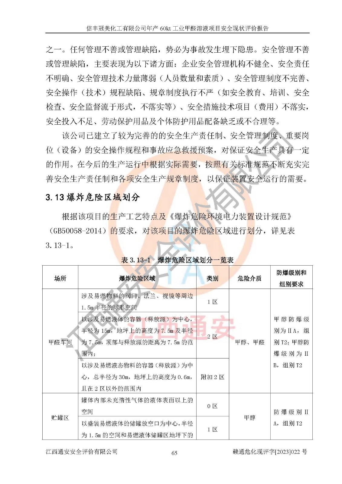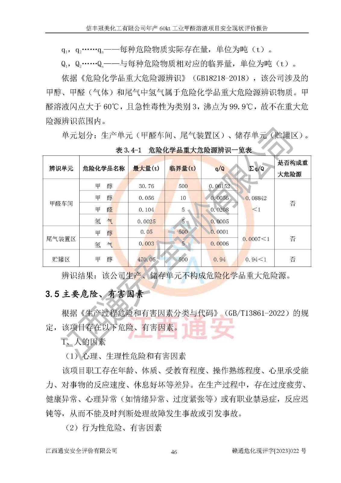 信豐冠美化工有限公司位于江西省贛州市信豐縣工業(yè)園偉邦路,法定**人為汪學斌,成立于2007年04月09日,注冊資本壹仟萬元整,營業(yè)執(zhí)照經營范圍為工業(yè)甲醛、尿醛樹脂膠生產、銷售(憑許可證經營)等。 信豐冠美化工有限公司2020年07月23日取得了《安全生產許可證》,許可證編號:(贛)WH安許證字[2008]0500號,許可范圍為工業(yè)甲醛溶液(60kt/a),**期2020年08月06日至2023年08月05日。該公司2022年8月30日取得了安全生產標準化證書,證書編號:贛AQBWⅡ[2022]015,**期至2025年8月。該公司現(xiàn)有員工23人,其中專職安全管理人員1人。 根據《江西省危險化學品產業(yè)轉移項目和化工園區(qū)安全風險防控專項整治實施方案》(贛安辦字〔2021〕86 號)要求,為提升生產本質安全,減少重大危險源,信豐冠美化工有限公司對貯罐區(qū)進行了調整,停用1臺甲醇儲罐和1臺甲醇計量罐,2臺甲醇儲罐變更為2臺甲醛儲罐。信豐冠美化工有限公司委托山東富海石化工程有限公司對60kt/a工業(yè)甲醛項目出具了在役化工裝置安全設計診斷及整改設計文本和圖紙(2022年12月),取得了贛州市應急管理局出具的審查意見,并對貯罐區(qū)進行了整改。貯罐區(qū)整改完成后,經辨識,信豐冠美化工有限公司生產、儲存單元不構成危險化學品重大危險源。信豐冠美化工有限公司向信豐縣應急管理局申請了重大危險源核銷,2023年2月2日取得了核銷登記表,核銷編號為HX贛360722[2023]001。 信豐冠美化工有限公司年產60kt工業(yè)甲醛溶液項目生產過程中涉及的原輔材料為甲醇和銀觸媒(催化劑),氮封需要使用氮氣,副反應產物為氫氣,產品為甲醛溶液。根據《危險化學品目錄》,該項目涉及的甲醇、氮氣[壓縮的]、氫氣、甲醛和甲醛溶液屬于危險化學品。經辨識,甲醇和氫氣屬于重點監(jiān)管的危險化學品,甲醛屬于高毒物品,甲醇屬于特別管控的危險化學品,不涉及監(jiān)控化學品、易制毒化學品、易制爆危險化學品和劇毒化學品,生產、儲存單元不構成危險化學品重大危險源,涉及的氧化反應屬于重點監(jiān)管的危險化工工藝。根據《安全生產許可證條例》、《危險化學品安全管理條例》和《危險化學品生產企業(yè)安全生產許可實施辦法》的相關規(guī)定,該項目甲醛溶液屬于危險化學品,需要辦理危險化學品安全生產許可證。根據生產工藝特點及物料的理化特性可知,該項目生產過程中存在火災與爆炸、中毒與窒息、觸電、機械傷害等危險有害因素。 該公司自2020年07月23日取得安全生產許可證以來,生產運行正常,未發(fā)生一般及以上生產安全事故。 |