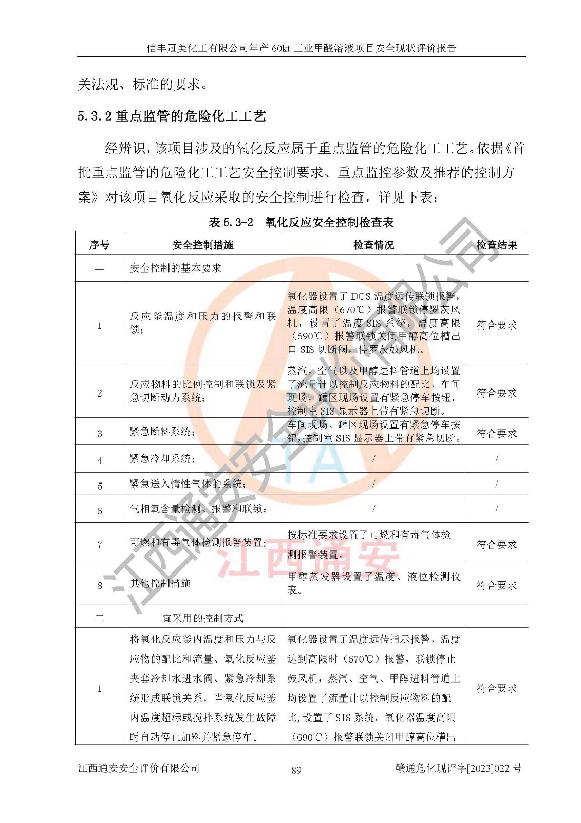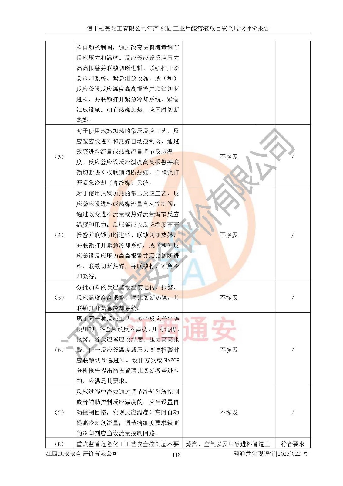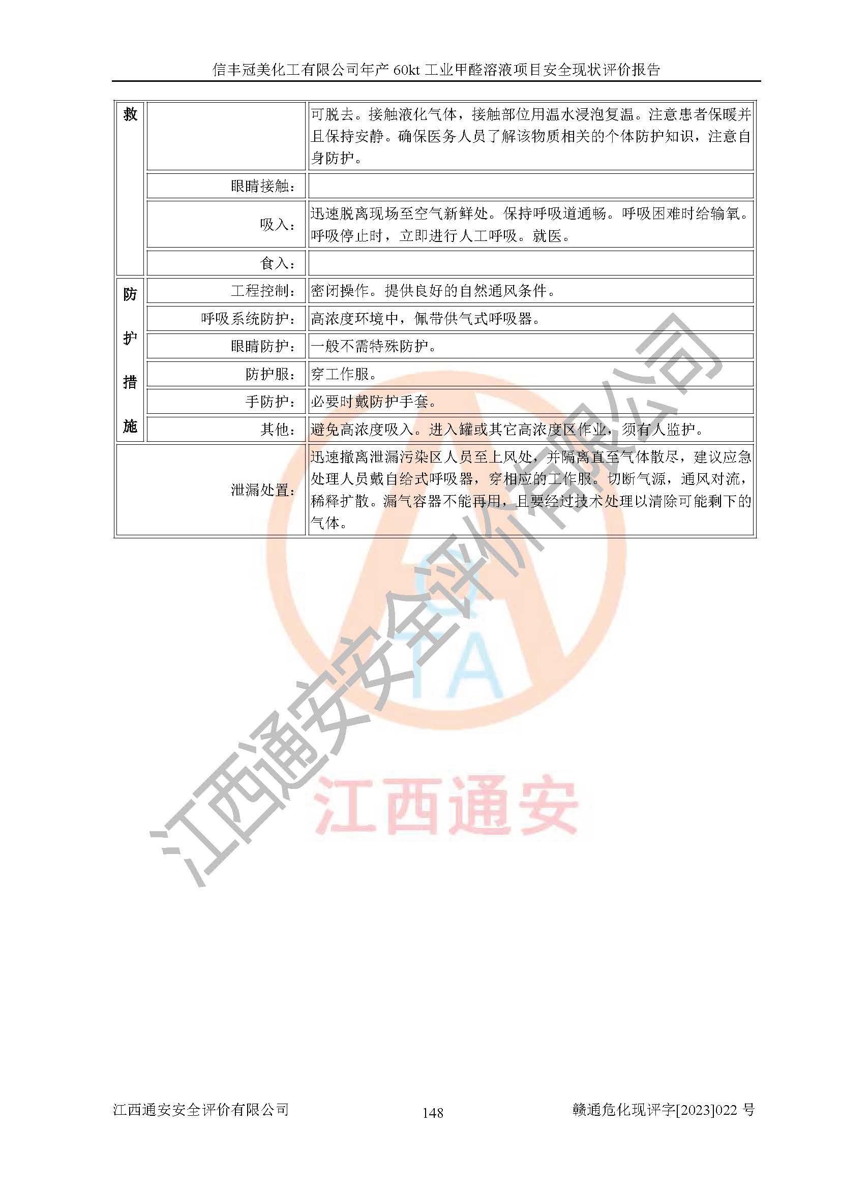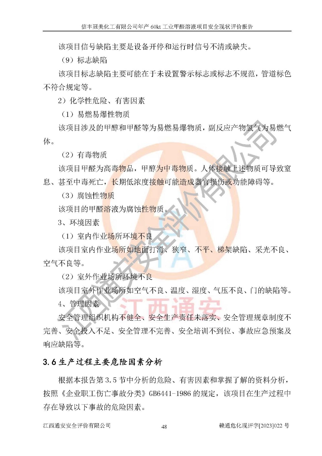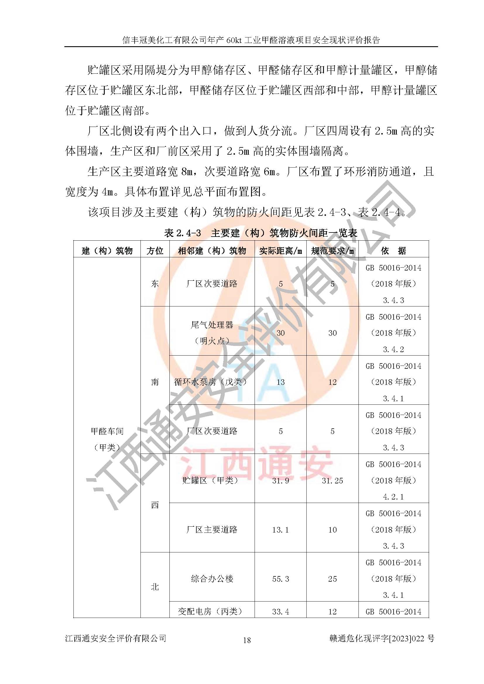 信豐冠美化工有限公司位于江西省贛州市信豐縣工業(yè)園偉邦路,法定**人為汪學斌,成立于2007年04月09日,注冊資本壹仟萬元整,營業(yè)執(zhí)照經營范圍為工業(yè)甲醛、尿醛樹脂膠生產、銷售(憑許可證經營)等。 信豐冠美化工有限公司2020年07月23日取得了《安全生產許可證》,許可證編號:(贛)WH安許證字[2008]0500號,許可范圍為工業(yè)甲醛溶液(60kt/a),**期2020年08月06日至2023年08月05日。該公司2022年8月30日取得了安全生產標準化證書,證書編號:贛AQBWⅡ[2022]015,**期至2025年8月。該公司現(xiàn)有員工23人,其中專職安全管理人員1人。 根據《江西省危險化學品產業(yè)轉移項目和化工園區(qū)安全風險防控專項整治實施方案》(贛安辦字〔2021〕86 號)要求,為提升生產本質安全,減少重大危險源,信豐冠美化工有限公司對貯罐區(qū)進行了調整,停用1臺甲醇儲罐和1臺甲醇計量罐,2臺甲醇儲罐變更為2臺甲醛儲罐。信豐冠美化工有限公司委托山東富海石化工程有限公司對60kt/a工業(yè)甲醛項目出具了在役化工裝置安全設計診斷及整改設計文本和圖紙(2022年12月),取得了贛州市應急管理局出具的審查意見,并對貯罐區(qū)進行了整改。貯罐區(qū)整改完成后,經辨識,信豐冠美化工有限公司生產、儲存單元不構成危險化學品重大危險源。信豐冠美化工有限公司向信豐縣應急管理局申請了重大危險源核銷,2023年2月2日取得了核銷登記表,核銷編號為HX贛360722[2023]001。 信豐冠美化工有限公司年產60kt工業(yè)甲醛溶液項目生產過程中涉及的原輔材料為甲醇和銀觸媒(催化劑),氮封需要使用氮氣,副反應產物為氫氣,產品為甲醛溶液。根據《危險化學品目錄》,該項目涉及的甲醇、氮氣[壓縮的]、氫氣、甲醛和甲醛溶液屬于危險化學品。經辨識,甲醇和氫氣屬于重點監(jiān)管的危險化學品,甲醛屬于高毒物品,甲醇屬于特別管控的危險化學品,不涉及監(jiān)控化學品、易制毒化學品、易制爆危險化學品和劇毒化學品,生產、儲存單元不構成危險化學品重大危險源,涉及的氧化反應屬于重點監(jiān)管的危險化工工藝。根據《安全生產許可證條例》、《危險化學品安全管理條例》和《危險化學品生產企業(yè)安全生產許可實施辦法》的相關規(guī)定,該項目甲醛溶液屬于危險化學品,需要辦理危險化學品安全生產許可證。根據生產工藝特點及物料的理化特性可知,該項目生產過程中存在火災與爆炸、中毒與窒息、觸電、機械傷害等危險有害因素。 該公司自2020年07月23日取得安全生產許可證以來,生產運行正常,未發(fā)生一般及以上生產安全事故。 |