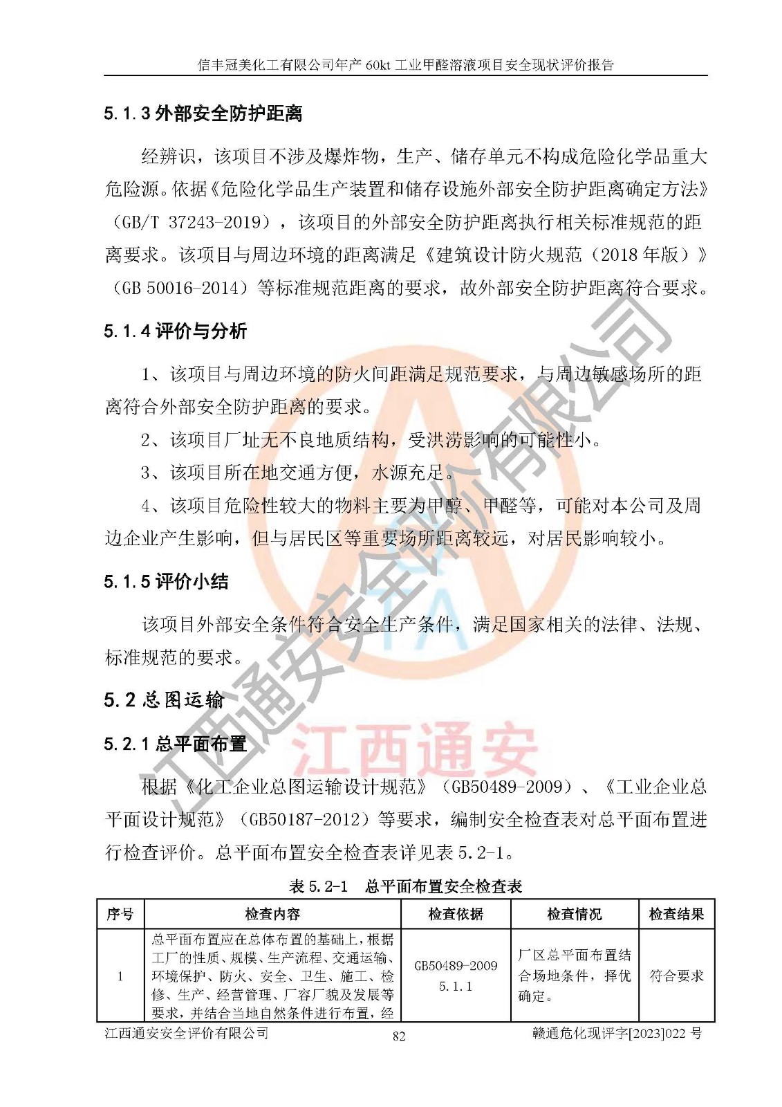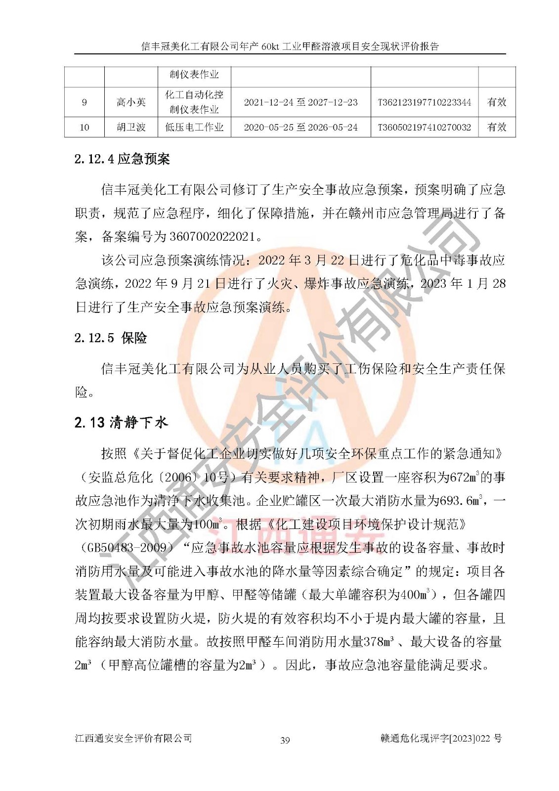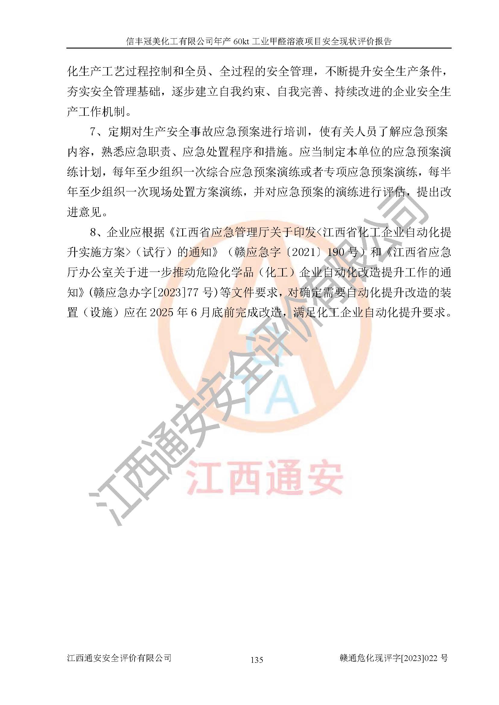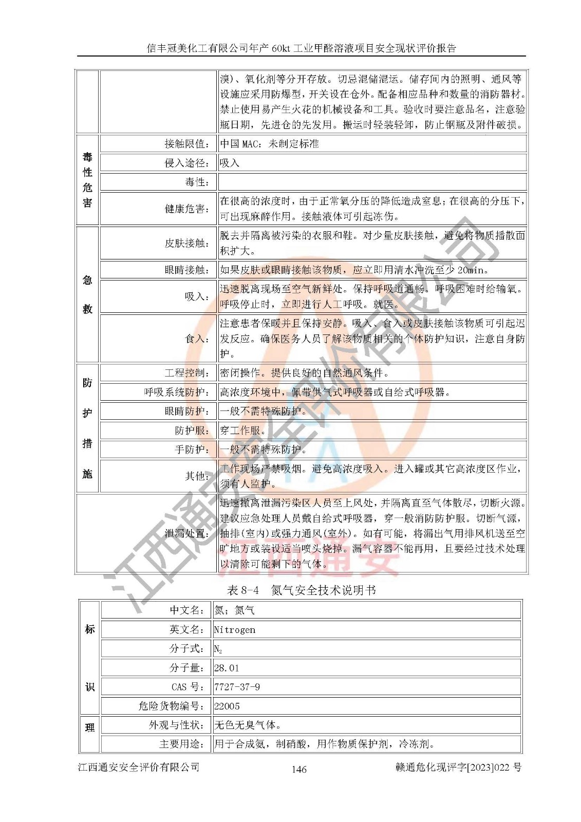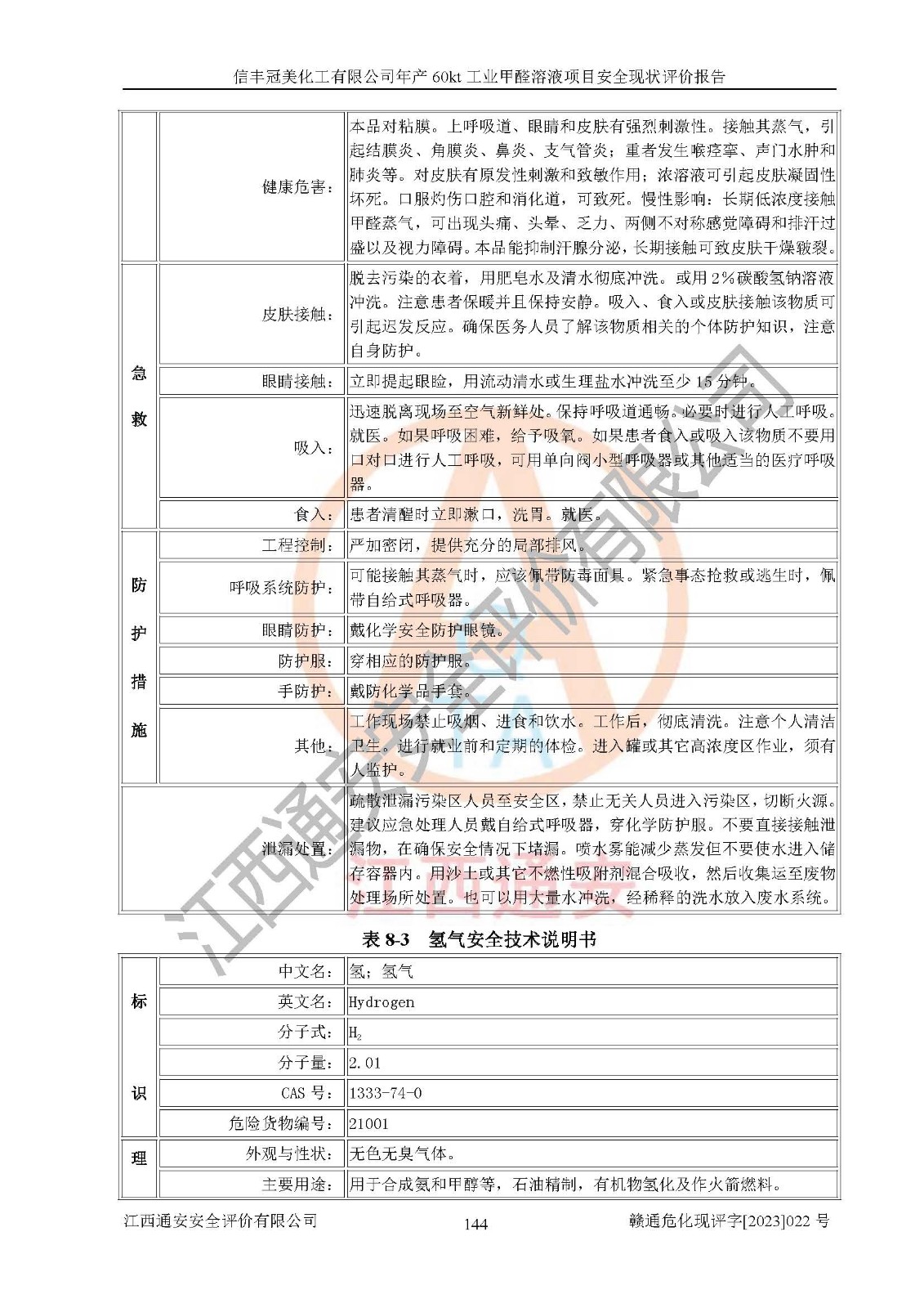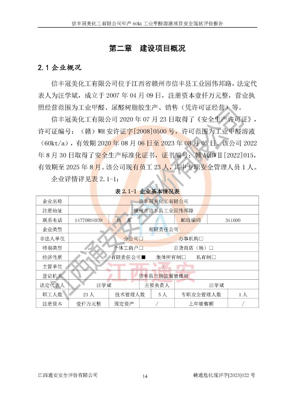 信豐冠美化工有限公司位于江西省贛州市信豐縣工業(yè)園偉邦路,法定**人為汪學斌,成立于2007年04月09日,注冊資本壹仟萬元整,營業(yè)執(zhí)照經營范圍為工業(yè)甲醛、尿醛樹脂膠生產、銷售(憑許可證經營)等。 信豐冠美化工有限公司2020年07月23日取得了《安全生產許可證》,許可證編號:(贛)WH安許證字[2008]0500號,許可范圍為工業(yè)甲醛溶液(60kt/a),**期2020年08月06日至2023年08月05日。該公司2022年8月30日取得了安全生產標準化證書,證書編號:贛AQBWⅡ[2022]015,**期至2025年8月。該公司現(xiàn)有員工23人,其中專職安全管理人員1人。 根據《江西省危險化學品產業(yè)轉移項目和化工園區(qū)安全風險防控專項整治實施方案》(贛安辦字〔2021〕86 號)要求,為提升生產本質安全,減少重大危險源,信豐冠美化工有限公司對貯罐區(qū)進行了調整,停用1臺甲醇儲罐和1臺甲醇計量罐,2臺甲醇儲罐變更為2臺甲醛儲罐。信豐冠美化工有限公司委托山東富海石化工程有限公司對60kt/a工業(yè)甲醛項目出具了在役化工裝置安全設計診斷及整改設計文本和圖紙(2022年12月),取得了贛州市應急管理局出具的審查意見,并對貯罐區(qū)進行了整改。貯罐區(qū)整改完成后,經辨識,信豐冠美化工有限公司生產、儲存單元不構成危險化學品重大危險源。信豐冠美化工有限公司向信豐縣應急管理局申請了重大危險源核銷,2023年2月2日取得了核銷登記表,核銷編號為HX贛360722[2023]001。 信豐冠美化工有限公司年產60kt工業(yè)甲醛溶液項目生產過程中涉及的原輔材料為甲醇和銀觸媒(催化劑),氮封需要使用氮氣,副反應產物為氫氣,產品為甲醛溶液。根據《危險化學品目錄》,該項目涉及的甲醇、氮氣[壓縮的]、氫氣、甲醛和甲醛溶液屬于危險化學品。經辨識,甲醇和氫氣屬于重點監(jiān)管的危險化學品,甲醛屬于高毒物品,甲醇屬于特別管控的危險化學品,不涉及監(jiān)控化學品、易制毒化學品、易制爆危險化學品和劇毒化學品,生產、儲存單元不構成危險化學品重大危險源,涉及的氧化反應屬于重點監(jiān)管的危險化工工藝。根據《安全生產許可證條例》、《危險化學品安全管理條例》和《危險化學品生產企業(yè)安全生產許可實施辦法》的相關規(guī)定,該項目甲醛溶液屬于危險化學品,需要辦理危險化學品安全生產許可證。根據生產工藝特點及物料的理化特性可知,該項目生產過程中存在火災與爆炸、中毒與窒息、觸電、機械傷害等危險有害因素。 該公司自2020年07月23日取得安全生產許可證以來,生產運行正常,未發(fā)生一般及以上生產安全事故。 |