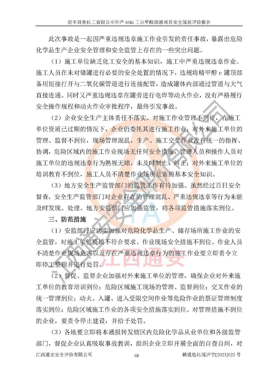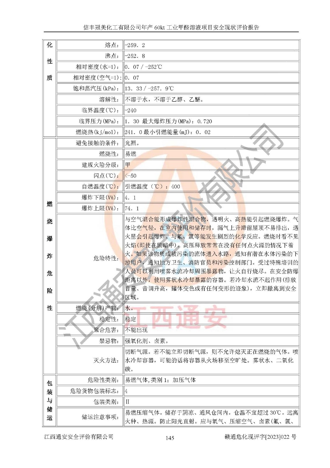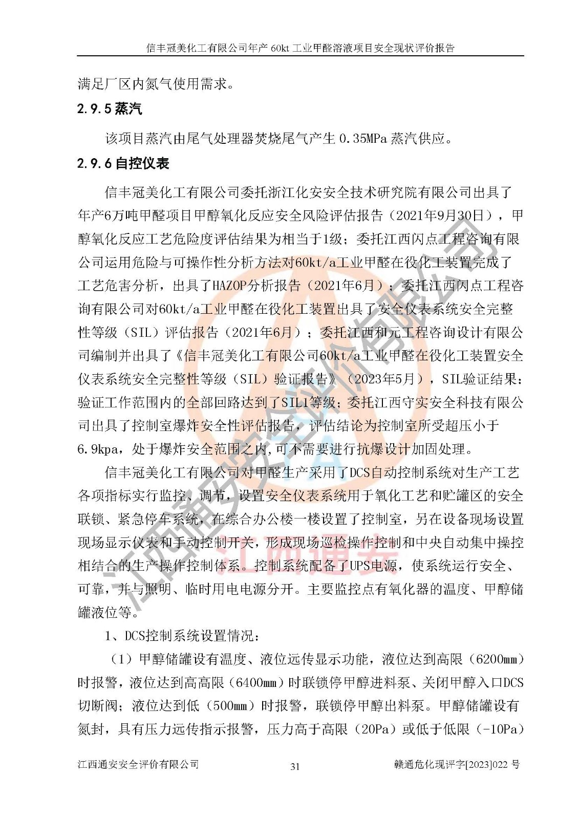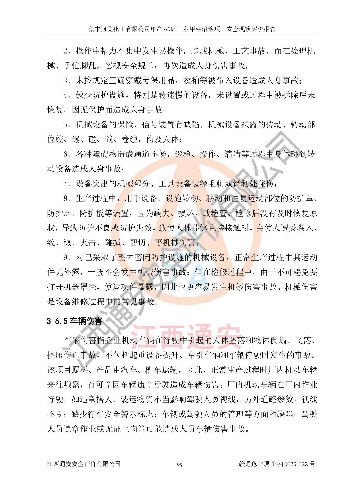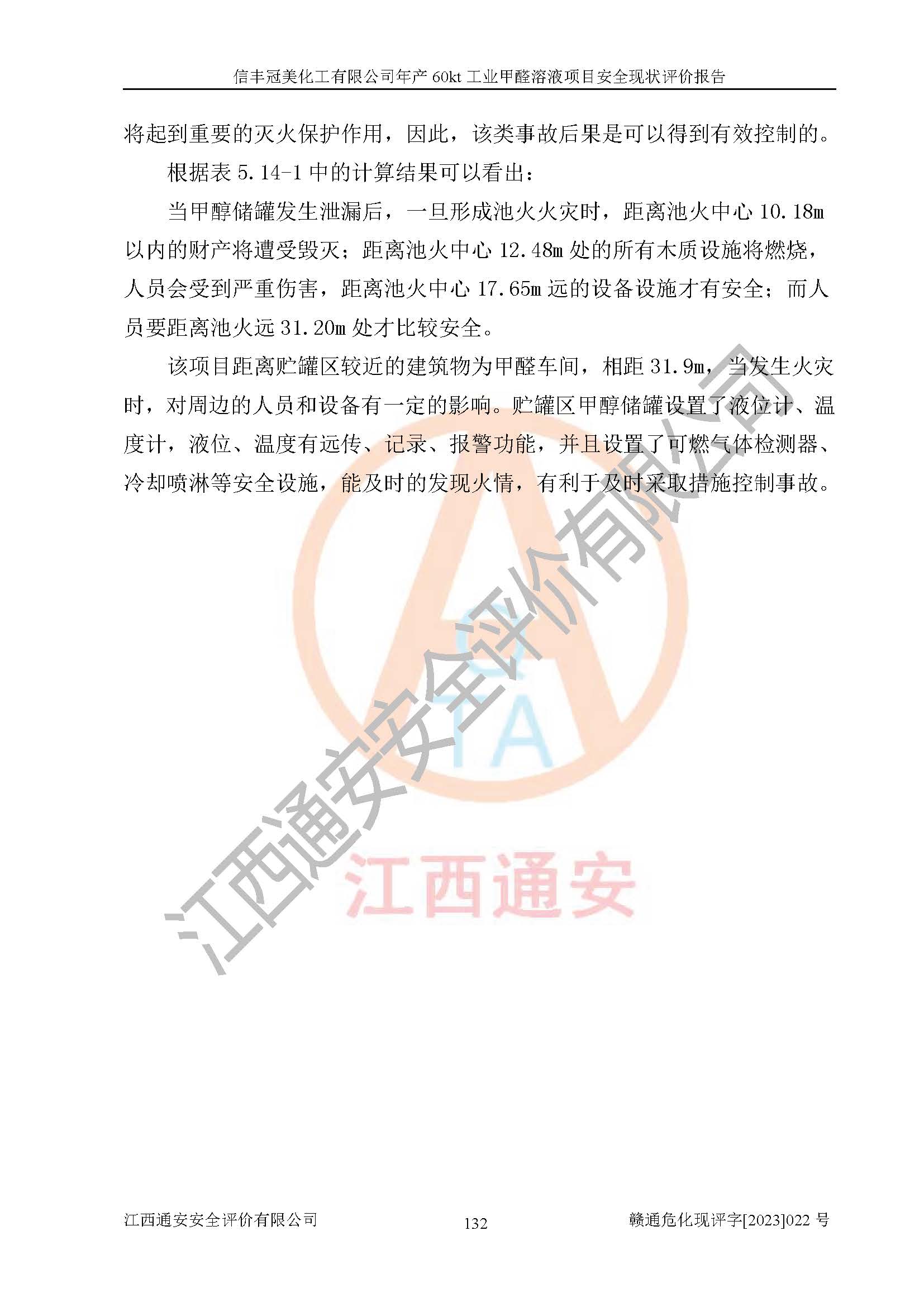信豐冠美化工有限公司位于江西省贛州市信豐縣工業(yè)園偉邦路,法定**人為汪學斌,成立于2007年04月09日,注冊資本壹仟萬元整,營業(yè)執(zhí)照經營范圍為工業(yè)甲醛、尿醛樹脂膠生產、銷售(憑許可證經營)等。 信豐冠美化工有限公司2020年07月23日取得了《安全生產許可證》,許可證編號:(贛)WH安許證字[2008]0500號,許可范圍為工業(yè)甲醛溶液(60kt/a),**期2020年08月06日至2023年08月05日。該公司2022年8月30日取得了安全生產標準化證書,證書編號:贛AQBWⅡ[2022]015,**期至2025年8月。該公司現(xiàn)有員工23人,其中專職安全管理人員1人。 根據《江西省危險化學品產業(yè)轉移項目和化工園區(qū)安全風險防控專項整治實施方案》(贛安辦字〔2021〕86 號)要求,為提升生產本質安全,減少重大危險源,信豐冠美化工有限公司對貯罐區(qū)進行了調整,停用1臺甲醇儲罐和1臺甲醇計量罐,2臺甲醇儲罐變更為2臺甲醛儲罐。信豐冠美化工有限公司委托山東富海石化工程有限公司對60kt/a工業(yè)甲醛項目出具了在役化工裝置安全設計診斷及整改設計文本和圖紙(2022年12月),取得了贛州市應急管理局出具的審查意見,并對貯罐區(qū)進行了整改。貯罐區(qū)整改完成后,經辨識,信豐冠美化工有限公司生產、儲存單元不構成危險化學品重大危險源。信豐冠美化工有限公司向信豐縣應急管理局申請了重大危險源核銷,2023年2月2日取得了核銷登記表,核銷編號為HX贛360722[2023]001。 信豐冠美化工有限公司年產60kt工業(yè)甲醛溶液項目生產過程中涉及的原輔材料為甲醇和銀觸媒(催化劑),氮封需要使用氮氣,副反應產物為氫氣,產品為甲醛溶液。根據《危險化學品目錄》,該項目涉及的甲醇、氮氣[壓縮的]、氫氣、甲醛和甲醛溶液屬于危險化學品。經辨識,甲醇和氫氣屬于重點監(jiān)管的危險化學品,甲醛屬于高毒物品,甲醇屬于特別管控的危險化學品,不涉及監(jiān)控化學品、易制毒化學品、易制爆危險化學品和劇毒化學品,生產、儲存單元不構成危險化學品重大危險源,涉及的氧化反應屬于重點監(jiān)管的危險化工工藝。根據《安全生產許可證條例》、《危險化學品安全管理條例》和《危險化學品生產企業(yè)安全生產許可實施辦法》的相關規(guī)定,該項目甲醛溶液屬于危險化學品,需要辦理危險化學品安全生產許可證。根據生產工藝特點及物料的理化特性可知,該項目生產過程中存在火災與爆炸、中毒與窒息、觸電、機械傷害等危險有害因素。 該公司自2020年07月23日取得安全生產許可證以來,生產運行正常,未發(fā)生一般及以上生產安全事故。 |