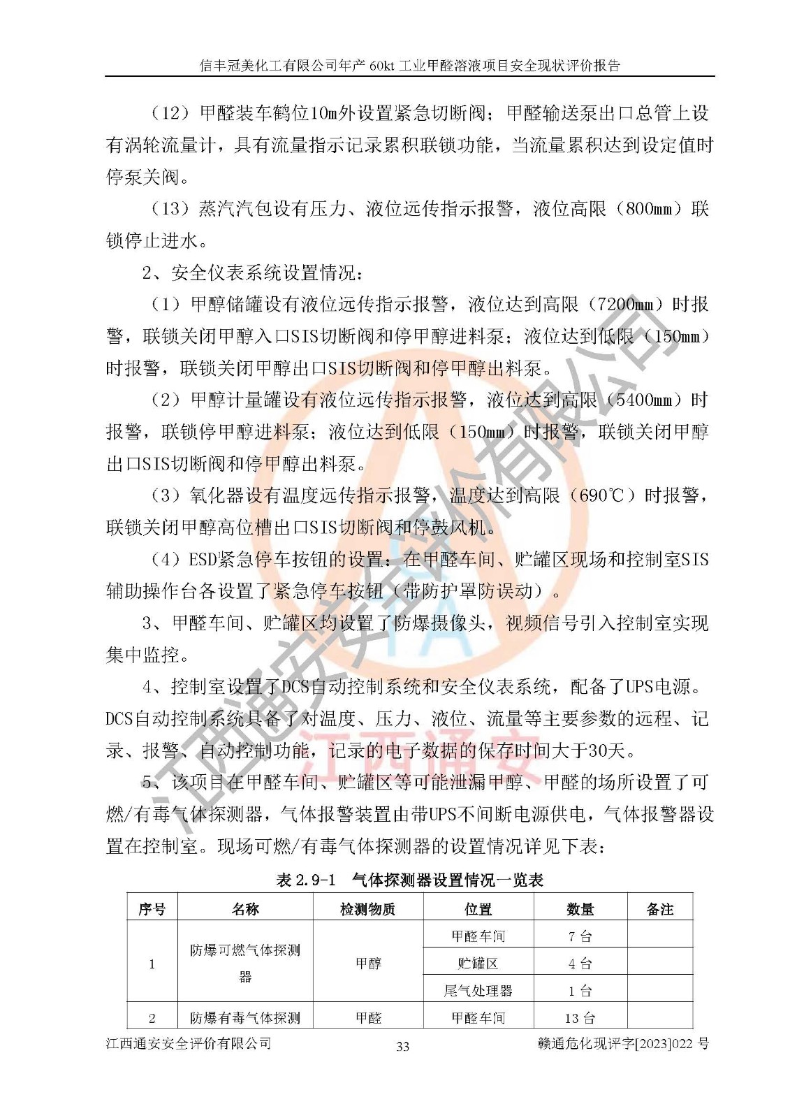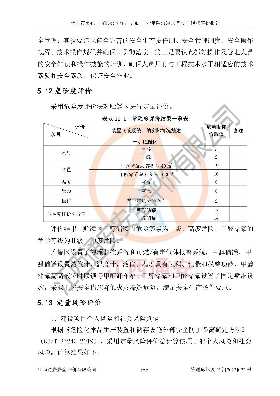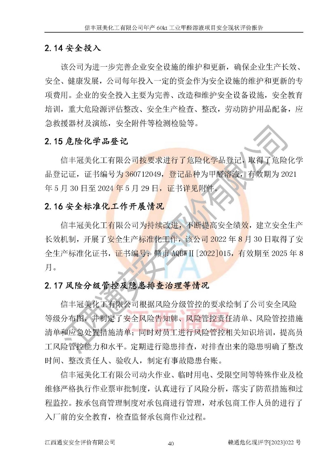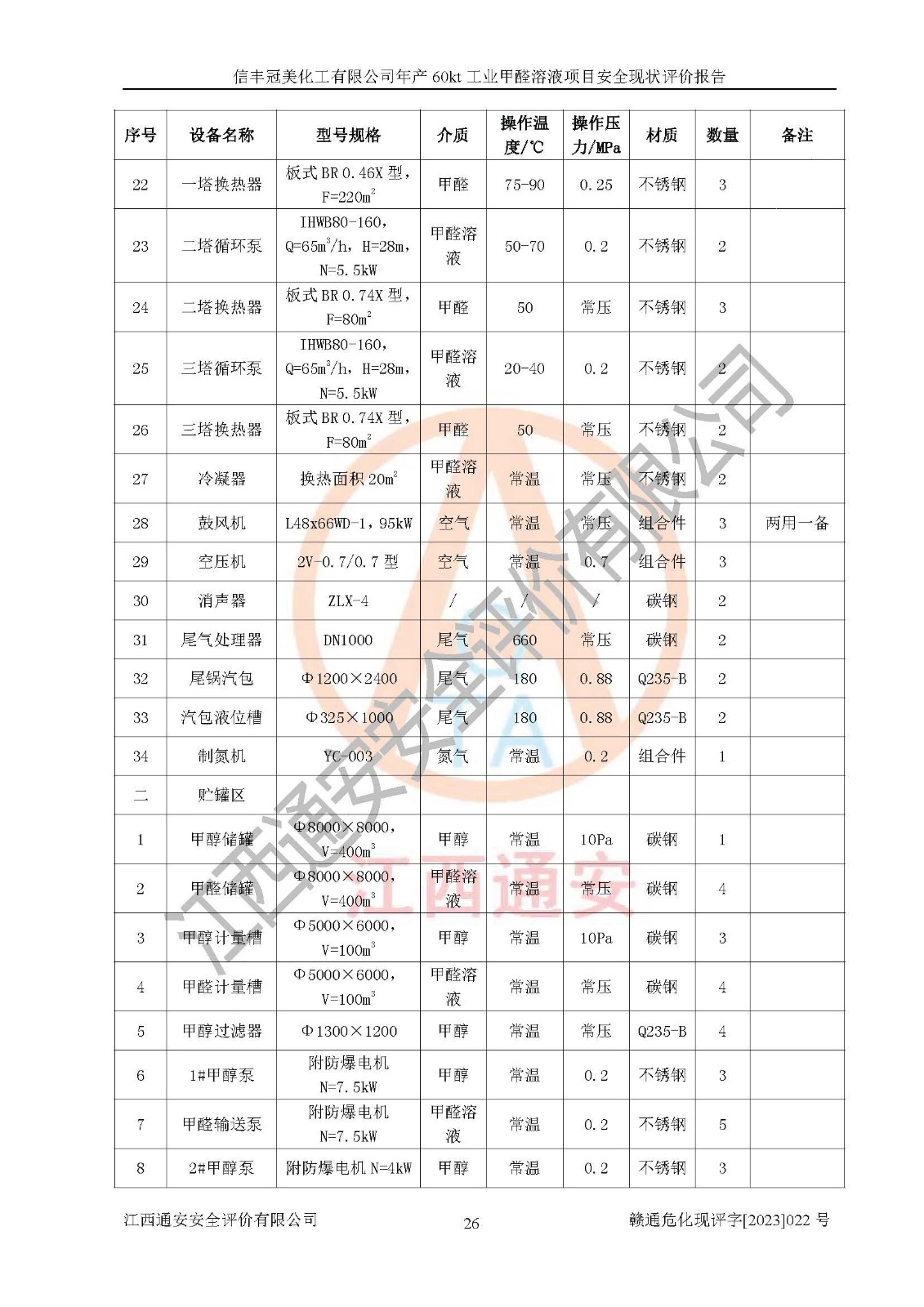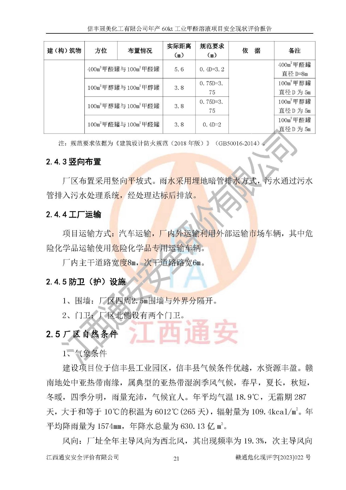 信豐冠美化工有限公司位于江西省贛州市信豐縣工業(yè)園偉邦路,法定**人為汪學斌,成立于2007年04月09日,注冊資本壹仟萬元整,營業(yè)執(zhí)照經營范圍為工業(yè)甲醛、尿醛樹脂膠生產、銷售(憑許可證經營)等。 信豐冠美化工有限公司2020年07月23日取得了《安全生產許可證》,許可證編號:(贛)WH安許證字[2008]0500號,許可范圍為工業(yè)甲醛溶液(60kt/a),**期2020年08月06日至2023年08月05日。該公司2022年8月30日取得了安全生產標準化證書,證書編號:贛AQBWⅡ[2022]015,**期至2025年8月。該公司現(xiàn)有員工23人,其中專職安全管理人員1人。 根據《江西省危險化學品產業(yè)轉移項目和化工園區(qū)安全風險防控專項整治實施方案》(贛安辦字〔2021〕86 號)要求,為提升生產本質安全,減少重大危險源,信豐冠美化工有限公司對貯罐區(qū)進行了調整,停用1臺甲醇儲罐和1臺甲醇計量罐,2臺甲醇儲罐變更為2臺甲醛儲罐。信豐冠美化工有限公司委托山東富海石化工程有限公司對60kt/a工業(yè)甲醛項目出具了在役化工裝置安全設計診斷及整改設計文本和圖紙(2022年12月),取得了贛州市應急管理局出具的審查意見,并對貯罐區(qū)進行了整改。貯罐區(qū)整改完成后,經辨識,信豐冠美化工有限公司生產、儲存單元不構成危險化學品重大危險源。信豐冠美化工有限公司向信豐縣應急管理局申請了重大危險源核銷,2023年2月2日取得了核銷登記表,核銷編號為HX贛360722[2023]001。 信豐冠美化工有限公司年產60kt工業(yè)甲醛溶液項目生產過程中涉及的原輔材料為甲醇和銀觸媒(催化劑),氮封需要使用氮氣,副反應產物為氫氣,產品為甲醛溶液。根據《危險化學品目錄》,該項目涉及的甲醇、氮氣[壓縮的]、氫氣、甲醛和甲醛溶液屬于危險化學品。經辨識,甲醇和氫氣屬于重點監(jiān)管的危險化學品,甲醛屬于高毒物品,甲醇屬于特別管控的危險化學品,不涉及監(jiān)控化學品、易制毒化學品、易制爆危險化學品和劇毒化學品,生產、儲存單元不構成危險化學品重大危險源,涉及的氧化反應屬于重點監(jiān)管的危險化工工藝。根據《安全生產許可證條例》、《危險化學品安全管理條例》和《危險化學品生產企業(yè)安全生產許可實施辦法》的相關規(guī)定,該項目甲醛溶液屬于危險化學品,需要辦理危險化學品安全生產許可證。根據生產工藝特點及物料的理化特性可知,該項目生產過程中存在火災與爆炸、中毒與窒息、觸電、機械傷害等危險有害因素。 該公司自2020年07月23日取得安全生產許可證以來,生產運行正常,未發(fā)生一般及以上生產安全事故。 |