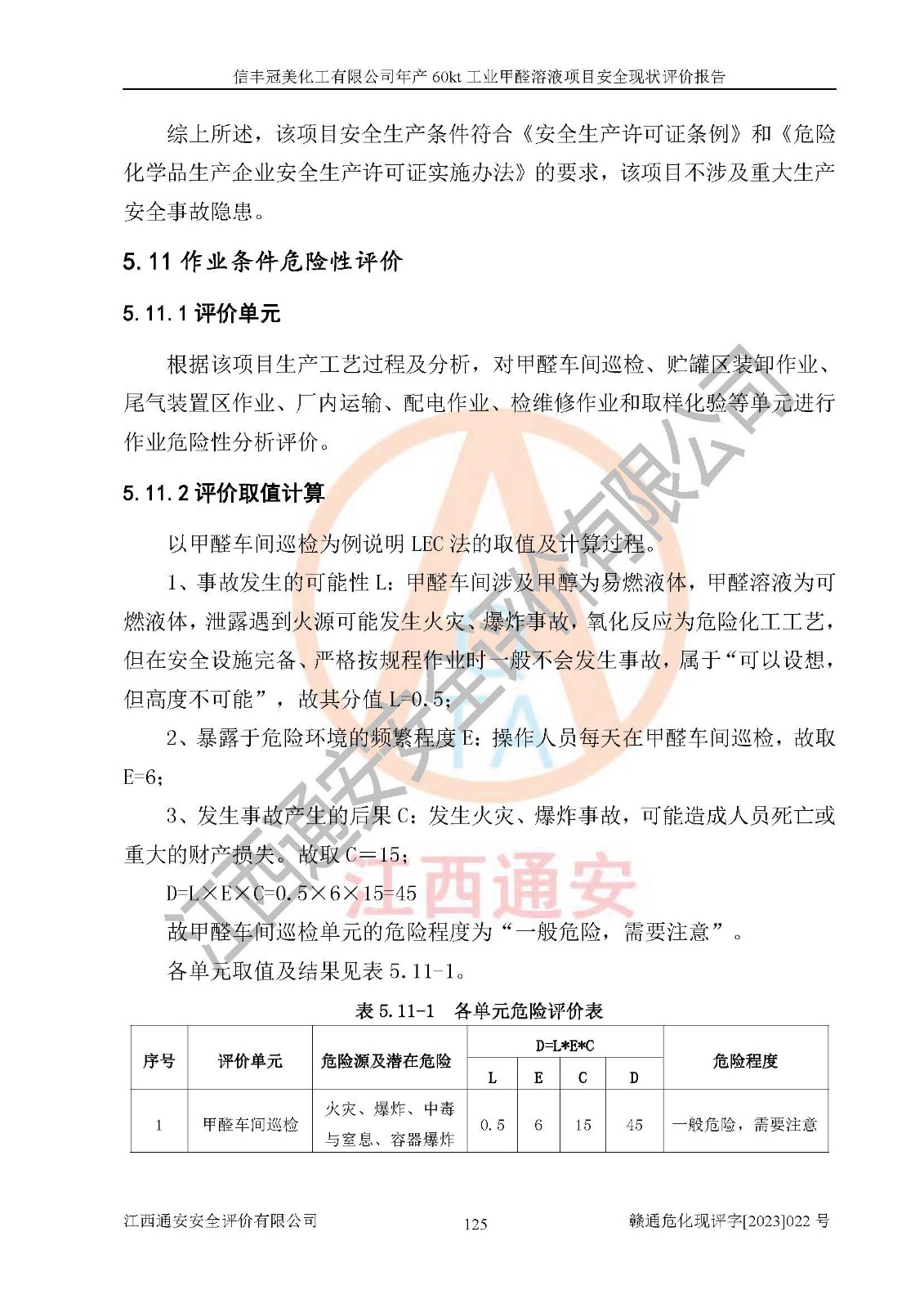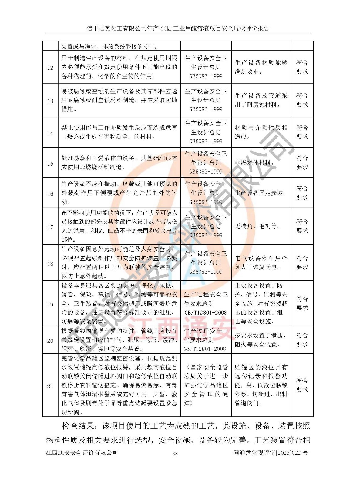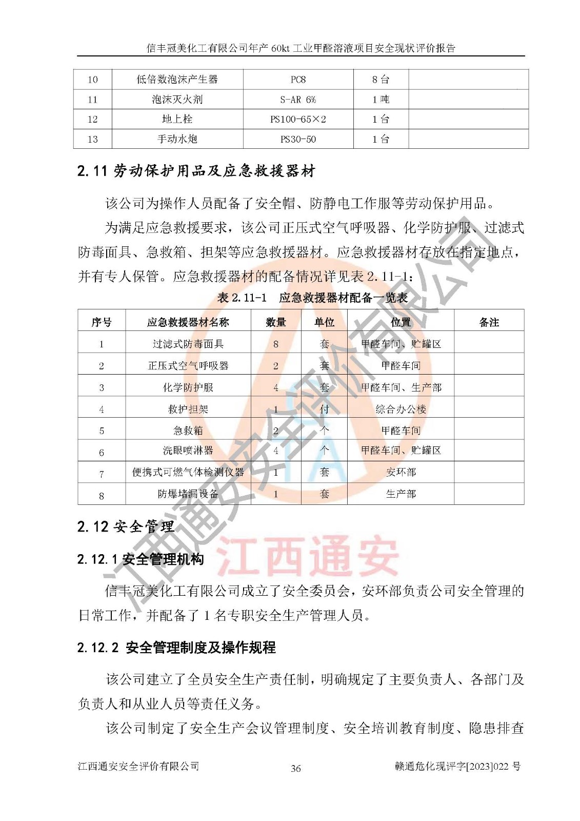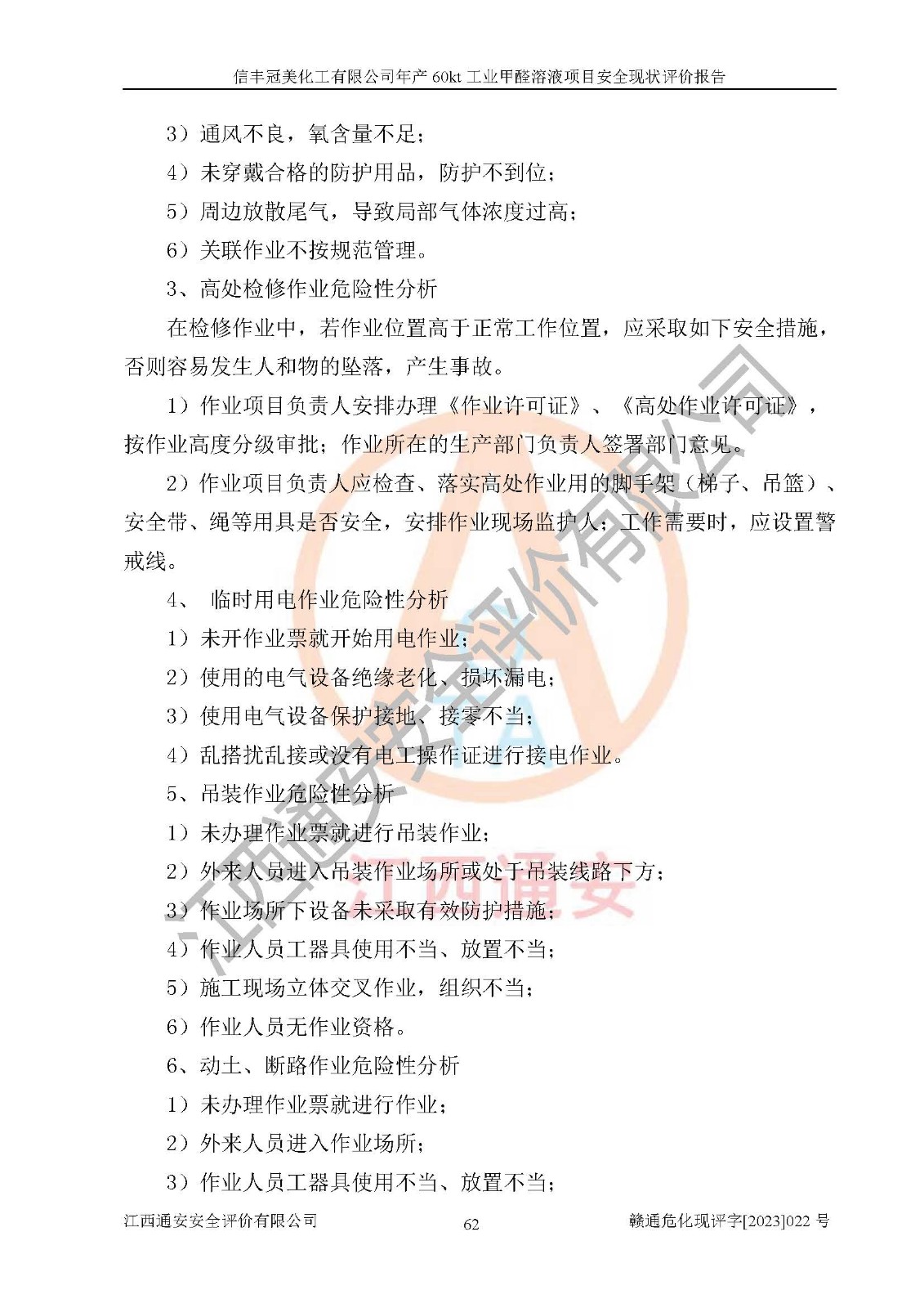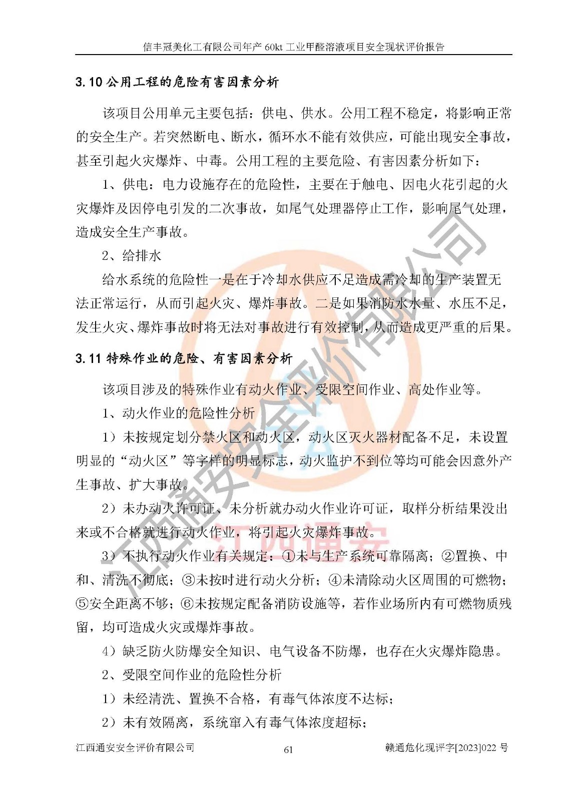 信豐冠美化工有限公司位于江西省贛州市信豐縣工業(yè)園偉邦路,法定**人為汪學斌,成立于2007年04月09日,注冊資本壹仟萬元整,營業(yè)執(zhí)照經營范圍為工業(yè)甲醛、尿醛樹脂膠生產、銷售(憑許可證經營)等。 信豐冠美化工有限公司2020年07月23日取得了《安全生產許可證》,許可證編號:(贛)WH安許證字[2008]0500號,許可范圍為工業(yè)甲醛溶液(60kt/a),**期2020年08月06日至2023年08月05日。該公司2022年8月30日取得了安全生產標準化證書,證書編號:贛AQBWⅡ[2022]015,**期至2025年8月。該公司現(xiàn)有員工23人,其中專職安全管理人員1人。 根據《江西省危險化學品產業(yè)轉移項目和化工園區(qū)安全風險防控專項整治實施方案》(贛安辦字〔2021〕86 號)要求,為提升生產本質安全,減少重大危險源,信豐冠美化工有限公司對貯罐區(qū)進行了調整,停用1臺甲醇儲罐和1臺甲醇計量罐,2臺甲醇儲罐變更為2臺甲醛儲罐。信豐冠美化工有限公司委托山東富海石化工程有限公司對60kt/a工業(yè)甲醛項目出具了在役化工裝置安全設計診斷及整改設計文本和圖紙(2022年12月),取得了贛州市應急管理局出具的審查意見,并對貯罐區(qū)進行了整改。貯罐區(qū)整改完成后,經辨識,信豐冠美化工有限公司生產、儲存單元不構成危險化學品重大危險源。信豐冠美化工有限公司向信豐縣應急管理局申請了重大危險源核銷,2023年2月2日取得了核銷登記表,核銷編號為HX贛360722[2023]001。 信豐冠美化工有限公司年產60kt工業(yè)甲醛溶液項目生產過程中涉及的原輔材料為甲醇和銀觸媒(催化劑),氮封需要使用氮氣,副反應產物為氫氣,產品為甲醛溶液。根據《危險化學品目錄》,該項目涉及的甲醇、氮氣[壓縮的]、氫氣、甲醛和甲醛溶液屬于危險化學品。經辨識,甲醇和氫氣屬于重點監(jiān)管的危險化學品,甲醛屬于高毒物品,甲醇屬于特別管控的危險化學品,不涉及監(jiān)控化學品、易制毒化學品、易制爆危險化學品和劇毒化學品,生產、儲存單元不構成危險化學品重大危險源,涉及的氧化反應屬于重點監(jiān)管的危險化工工藝。根據《安全生產許可證條例》、《危險化學品安全管理條例》和《危險化學品生產企業(yè)安全生產許可實施辦法》的相關規(guī)定,該項目甲醛溶液屬于危險化學品,需要辦理危險化學品安全生產許可證。根據生產工藝特點及物料的理化特性可知,該項目生產過程中存在火災與爆炸、中毒與窒息、觸電、機械傷害等危險有害因素。 該公司自2020年07月23日取得安全生產許可證以來,生產運行正常,未發(fā)生一般及以上生產安全事故。 |