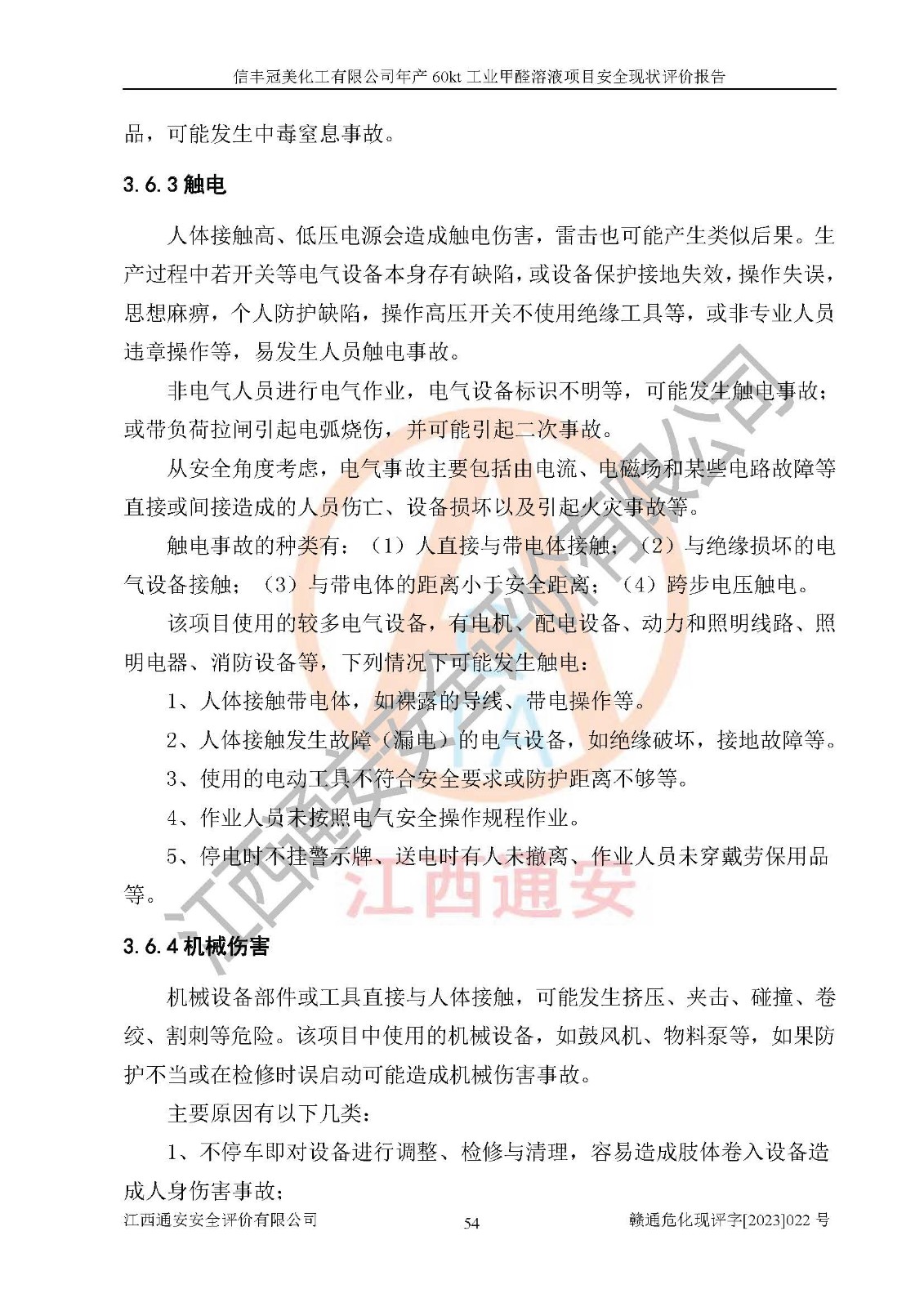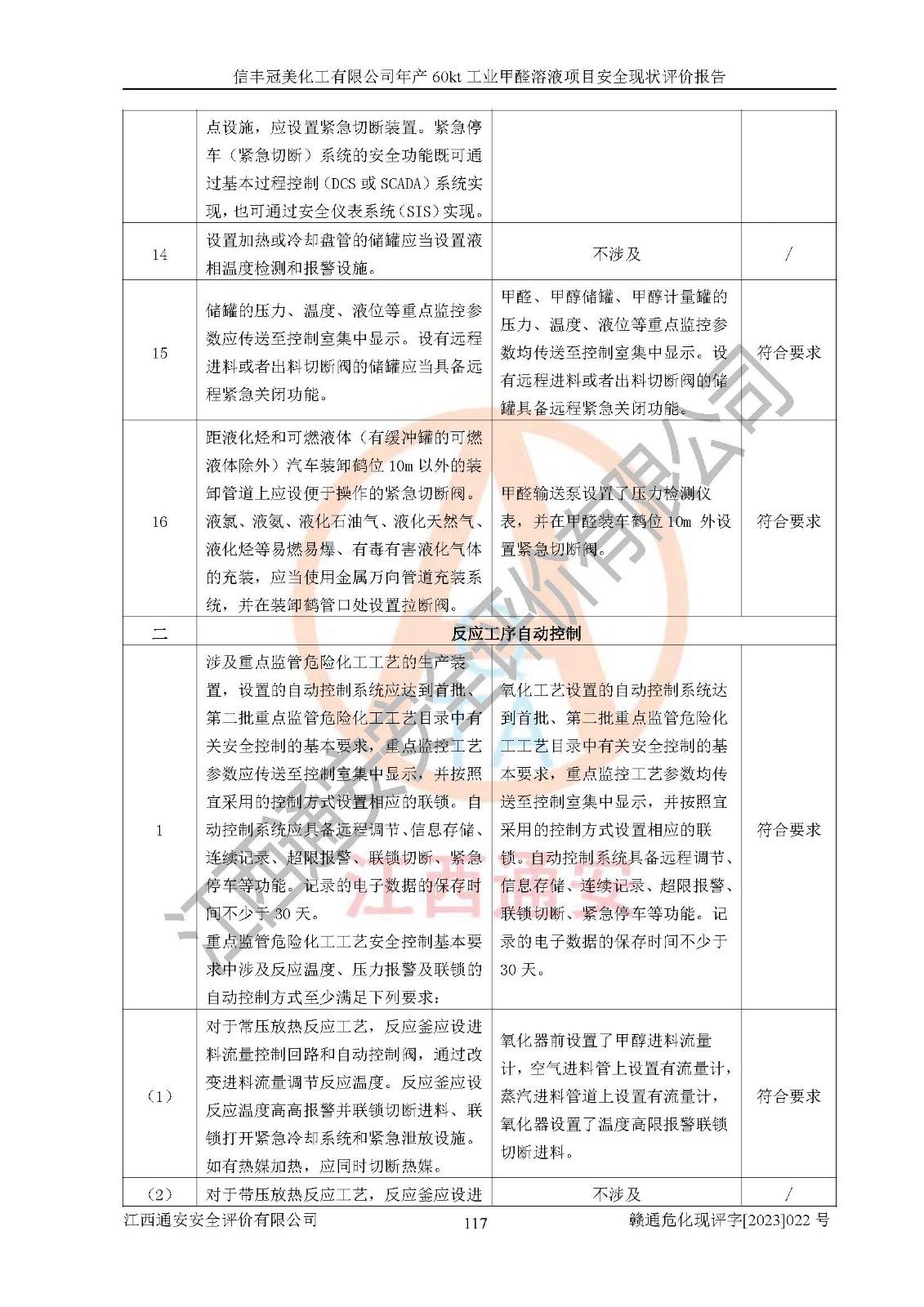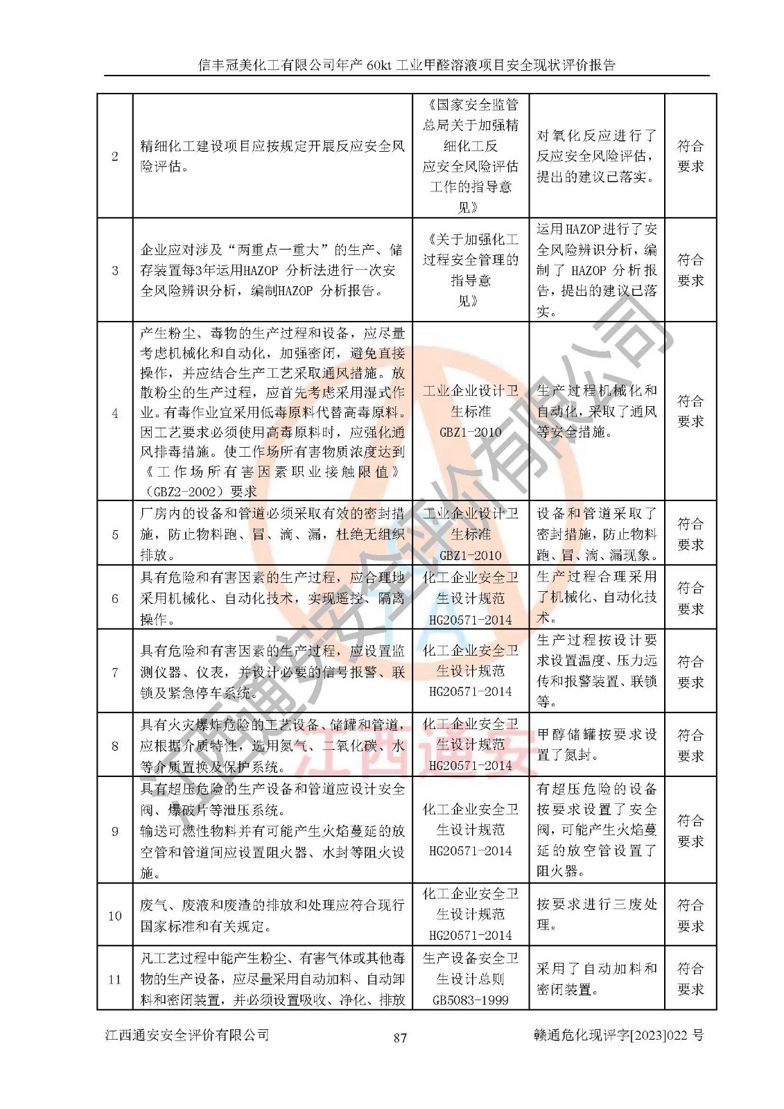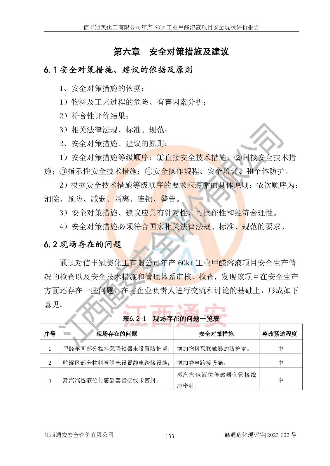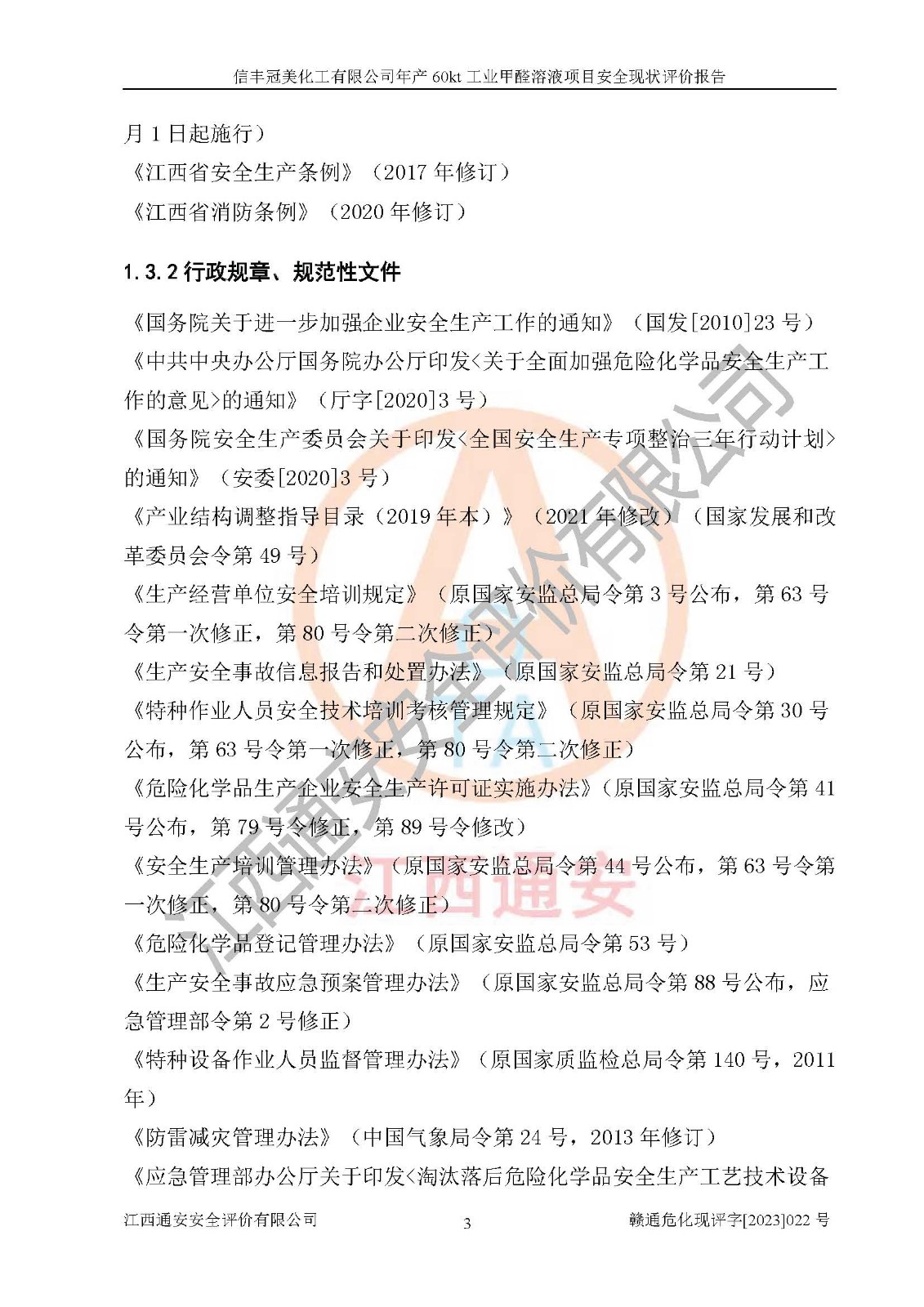 信豐冠美化工有限公司位于江西省贛州市信豐縣工業(yè)園偉邦路,法定**人為汪學斌,成立于2007年04月09日,注冊資本壹仟萬元整,營業(yè)執(zhí)照經營范圍為工業(yè)甲醛、尿醛樹脂膠生產、銷售(憑許可證經營)等。 信豐冠美化工有限公司2020年07月23日取得了《安全生產許可證》,許可證編號:(贛)WH安許證字[2008]0500號,許可范圍為工業(yè)甲醛溶液(60kt/a),**期2020年08月06日至2023年08月05日。該公司2022年8月30日取得了安全生產標準化證書,證書編號:贛AQBWⅡ[2022]015,**期至2025年8月。該公司現(xiàn)有員工23人,其中專職安全管理人員1人。 根據《江西省危險化學品產業(yè)轉移項目和化工園區(qū)安全風險防控專項整治實施方案》(贛安辦字〔2021〕86 號)要求,為提升生產本質安全,減少重大危險源,信豐冠美化工有限公司對貯罐區(qū)進行了調整,停用1臺甲醇儲罐和1臺甲醇計量罐,2臺甲醇儲罐變更為2臺甲醛儲罐。信豐冠美化工有限公司委托山東富海石化工程有限公司對60kt/a工業(yè)甲醛項目出具了在役化工裝置安全設計診斷及整改設計文本和圖紙(2022年12月),取得了贛州市應急管理局出具的審查意見,并對貯罐區(qū)進行了整改。貯罐區(qū)整改完成后,經辨識,信豐冠美化工有限公司生產、儲存單元不構成危險化學品重大危險源。信豐冠美化工有限公司向信豐縣應急管理局申請了重大危險源核銷,2023年2月2日取得了核銷登記表,核銷編號為HX贛360722[2023]001。 信豐冠美化工有限公司年產60kt工業(yè)甲醛溶液項目生產過程中涉及的原輔材料為甲醇和銀觸媒(催化劑),氮封需要使用氮氣,副反應產物為氫氣,產品為甲醛溶液。根據《危險化學品目錄》,該項目涉及的甲醇、氮氣[壓縮的]、氫氣、甲醛和甲醛溶液屬于危險化學品。經辨識,甲醇和氫氣屬于重點監(jiān)管的危險化學品,甲醛屬于高毒物品,甲醇屬于特別管控的危險化學品,不涉及監(jiān)控化學品、易制毒化學品、易制爆危險化學品和劇毒化學品,生產、儲存單元不構成危險化學品重大危險源,涉及的氧化反應屬于重點監(jiān)管的危險化工工藝。根據《安全生產許可證條例》、《危險化學品安全管理條例》和《危險化學品生產企業(yè)安全生產許可實施辦法》的相關規(guī)定,該項目甲醛溶液屬于危險化學品,需要辦理危險化學品安全生產許可證。根據生產工藝特點及物料的理化特性可知,該項目生產過程中存在火災與爆炸、中毒與窒息、觸電、機械傷害等危險有害因素。 該公司自2020年07月23日取得安全生產許可證以來,生產運行正常,未發(fā)生一般及以上生產安全事故。 |