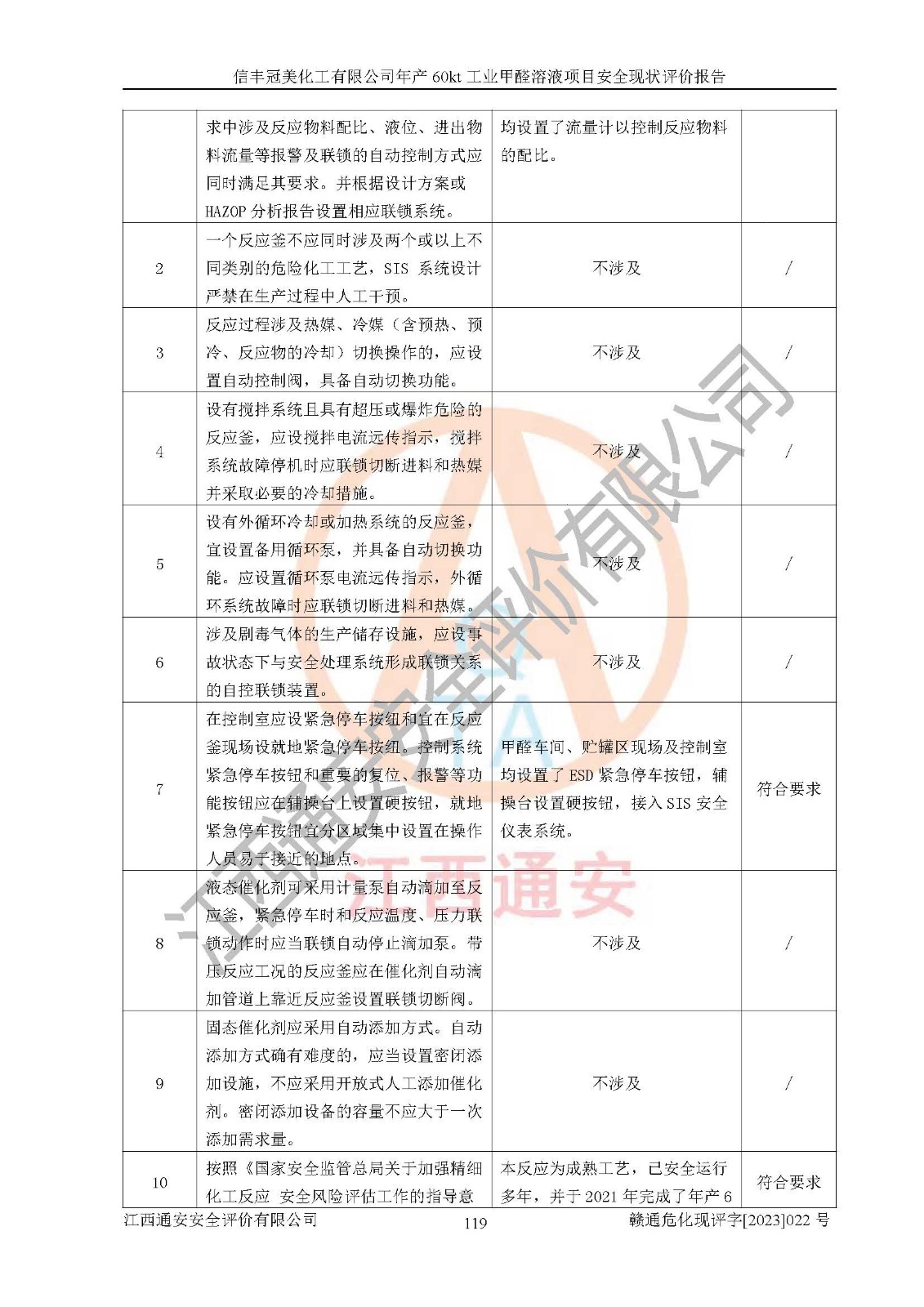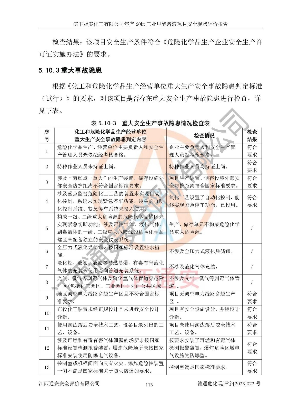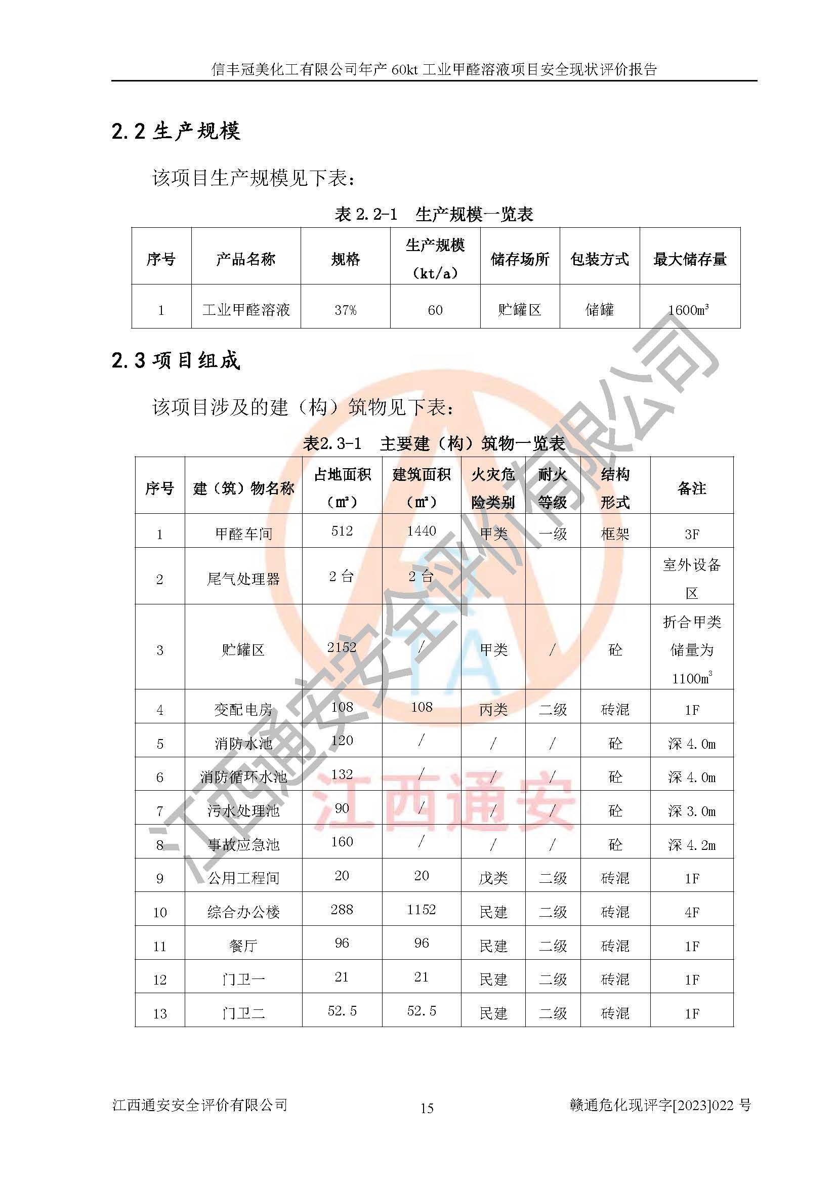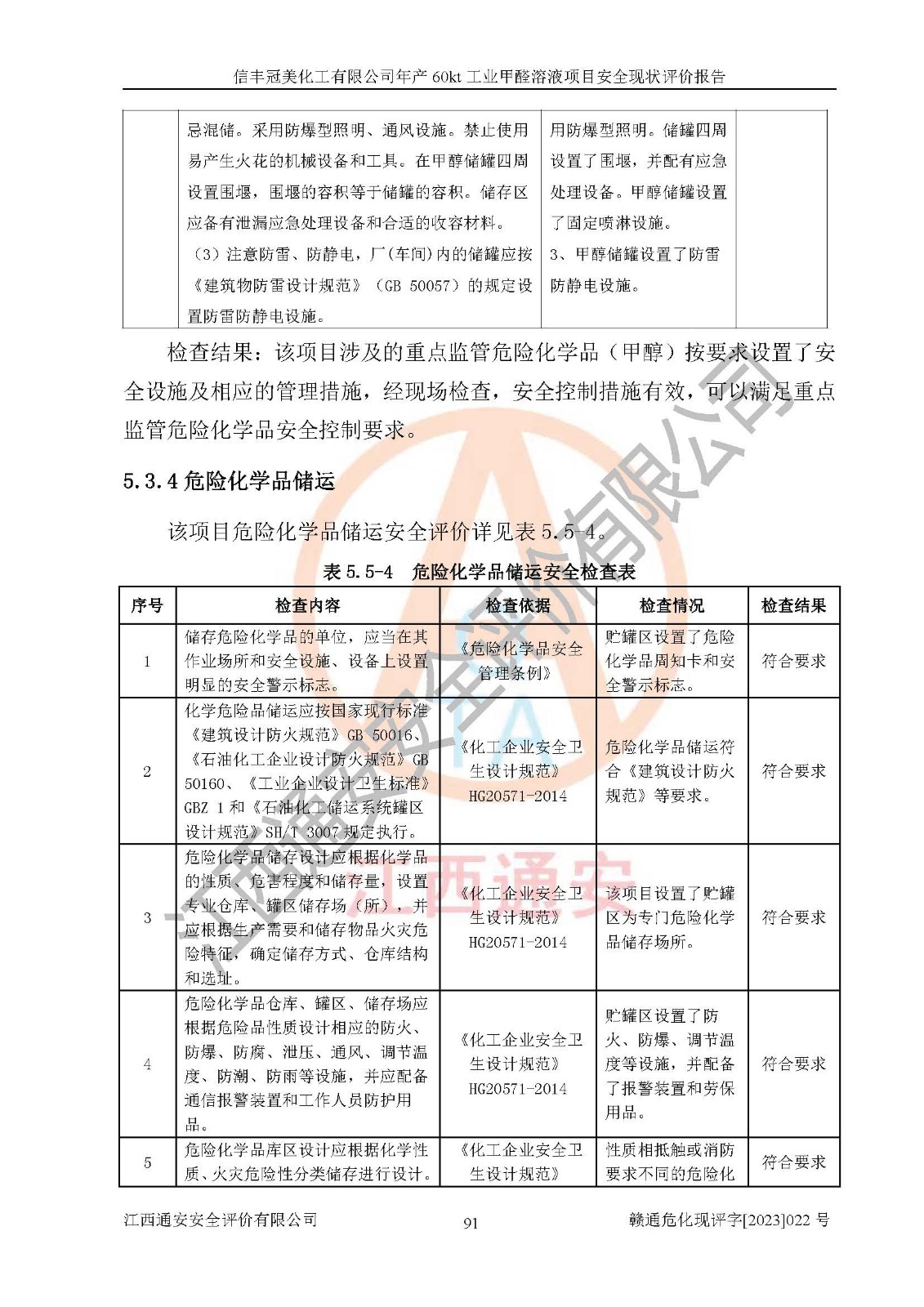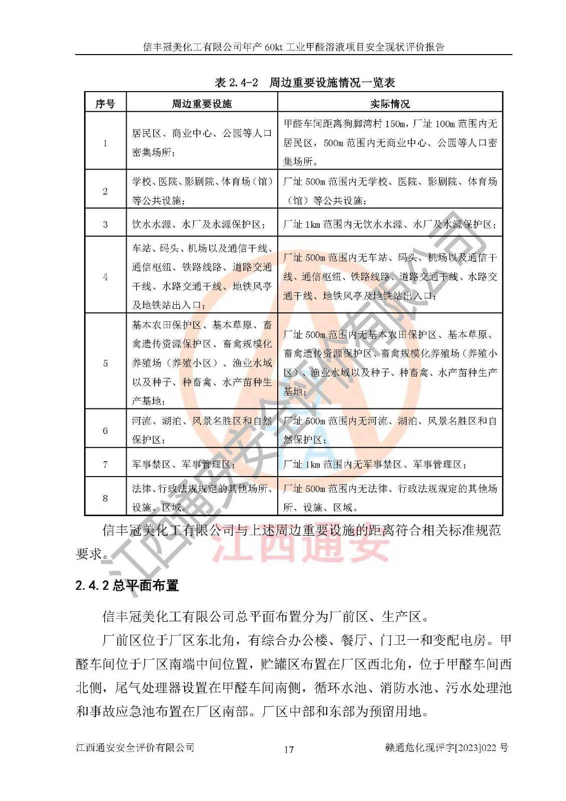 信豐冠美化工有限公司位于江西省贛州市信豐縣工業(yè)園偉邦路,法定**人為汪學斌,成立于2007年04月09日,注冊資本壹仟萬元整,營業(yè)執(zhí)照經營范圍為工業(yè)甲醛、尿醛樹脂膠生產、銷售(憑許可證經營)等。 信豐冠美化工有限公司2020年07月23日取得了《安全生產許可證》,許可證編號:(贛)WH安許證字[2008]0500號,許可范圍為工業(yè)甲醛溶液(60kt/a),**期2020年08月06日至2023年08月05日。該公司2022年8月30日取得了安全生產標準化證書,證書編號:贛AQBWⅡ[2022]015,**期至2025年8月。該公司現(xiàn)有員工23人,其中專職安全管理人員1人。 根據《江西省危險化學品產業(yè)轉移項目和化工園區(qū)安全風險防控專項整治實施方案》(贛安辦字〔2021〕86 號)要求,為提升生產本質安全,減少重大危險源,信豐冠美化工有限公司對貯罐區(qū)進行了調整,停用1臺甲醇儲罐和1臺甲醇計量罐,2臺甲醇儲罐變更為2臺甲醛儲罐。信豐冠美化工有限公司委托山東富海石化工程有限公司對60kt/a工業(yè)甲醛項目出具了在役化工裝置安全設計診斷及整改設計文本和圖紙(2022年12月),取得了贛州市應急管理局出具的審查意見,并對貯罐區(qū)進行了整改。貯罐區(qū)整改完成后,經辨識,信豐冠美化工有限公司生產、儲存單元不構成危險化學品重大危險源。信豐冠美化工有限公司向信豐縣應急管理局申請了重大危險源核銷,2023年2月2日取得了核銷登記表,核銷編號為HX贛360722[2023]001。 信豐冠美化工有限公司年產60kt工業(yè)甲醛溶液項目生產過程中涉及的原輔材料為甲醇和銀觸媒(催化劑),氮封需要使用氮氣,副反應產物為氫氣,產品為甲醛溶液。根據《危險化學品目錄》,該項目涉及的甲醇、氮氣[壓縮的]、氫氣、甲醛和甲醛溶液屬于危險化學品。經辨識,甲醇和氫氣屬于重點監(jiān)管的危險化學品,甲醛屬于高毒物品,甲醇屬于特別管控的危險化學品,不涉及監(jiān)控化學品、易制毒化學品、易制爆危險化學品和劇毒化學品,生產、儲存單元不構成危險化學品重大危險源,涉及的氧化反應屬于重點監(jiān)管的危險化工工藝。根據《安全生產許可證條例》、《危險化學品安全管理條例》和《危險化學品生產企業(yè)安全生產許可實施辦法》的相關規(guī)定,該項目甲醛溶液屬于危險化學品,需要辦理危險化學品安全生產許可證。根據生產工藝特點及物料的理化特性可知,該項目生產過程中存在火災與爆炸、中毒與窒息、觸電、機械傷害等危險有害因素。 該公司自2020年07月23日取得安全生產許可證以來,生產運行正常,未發(fā)生一般及以上生產安全事故。 |