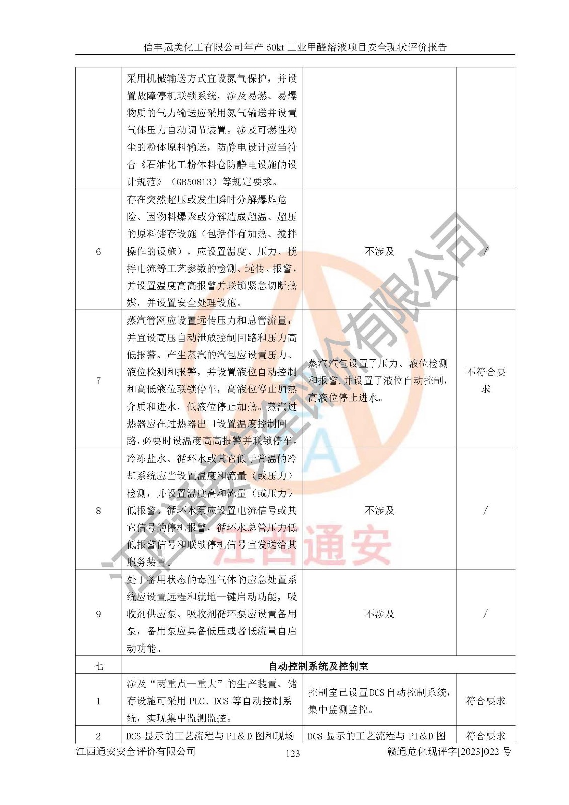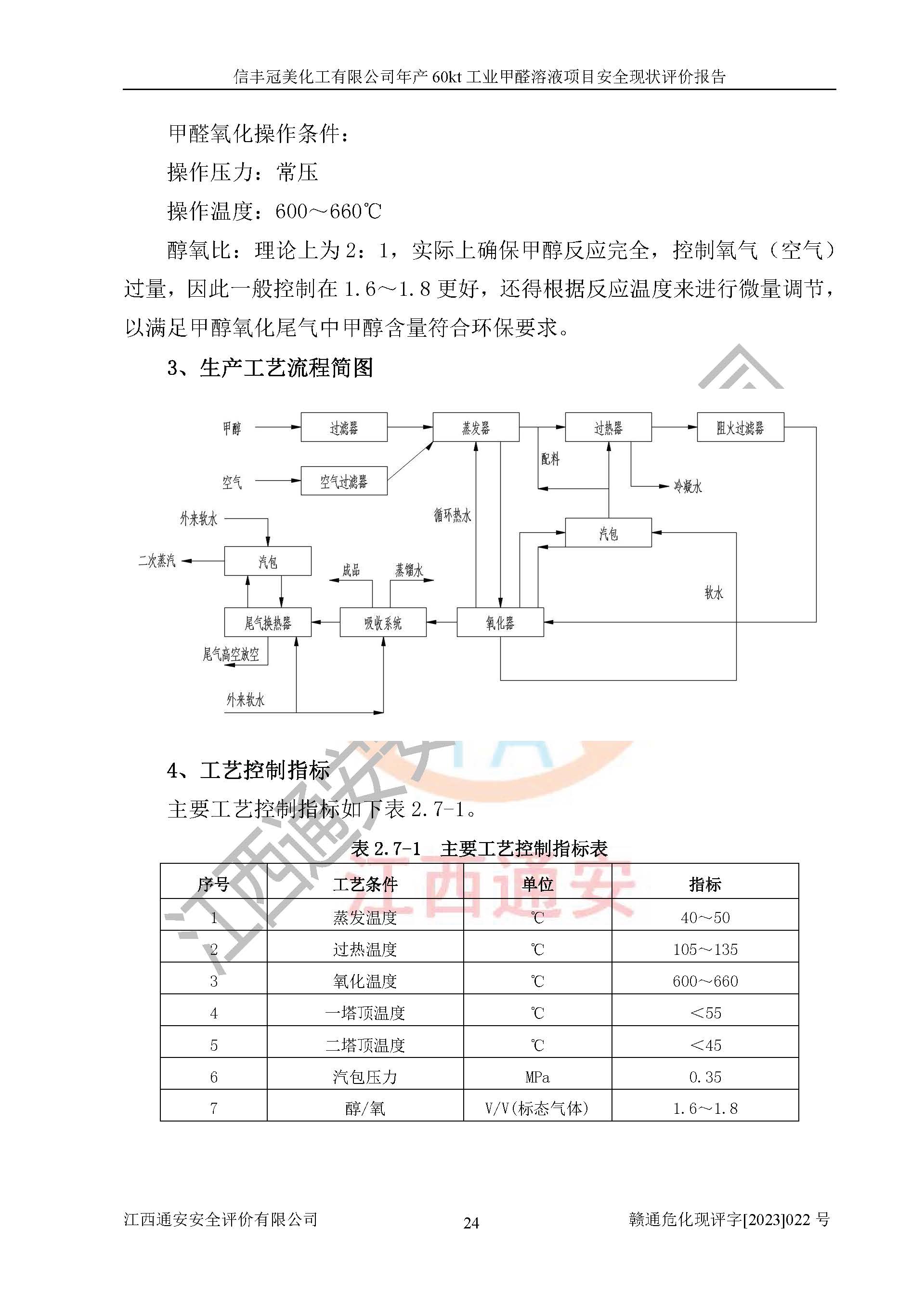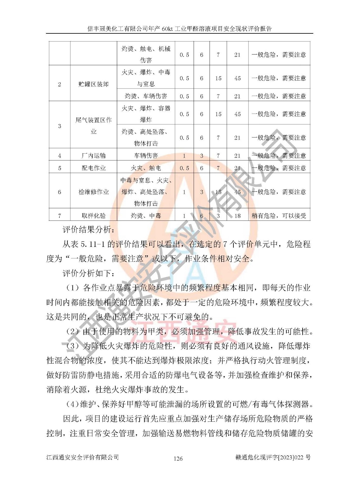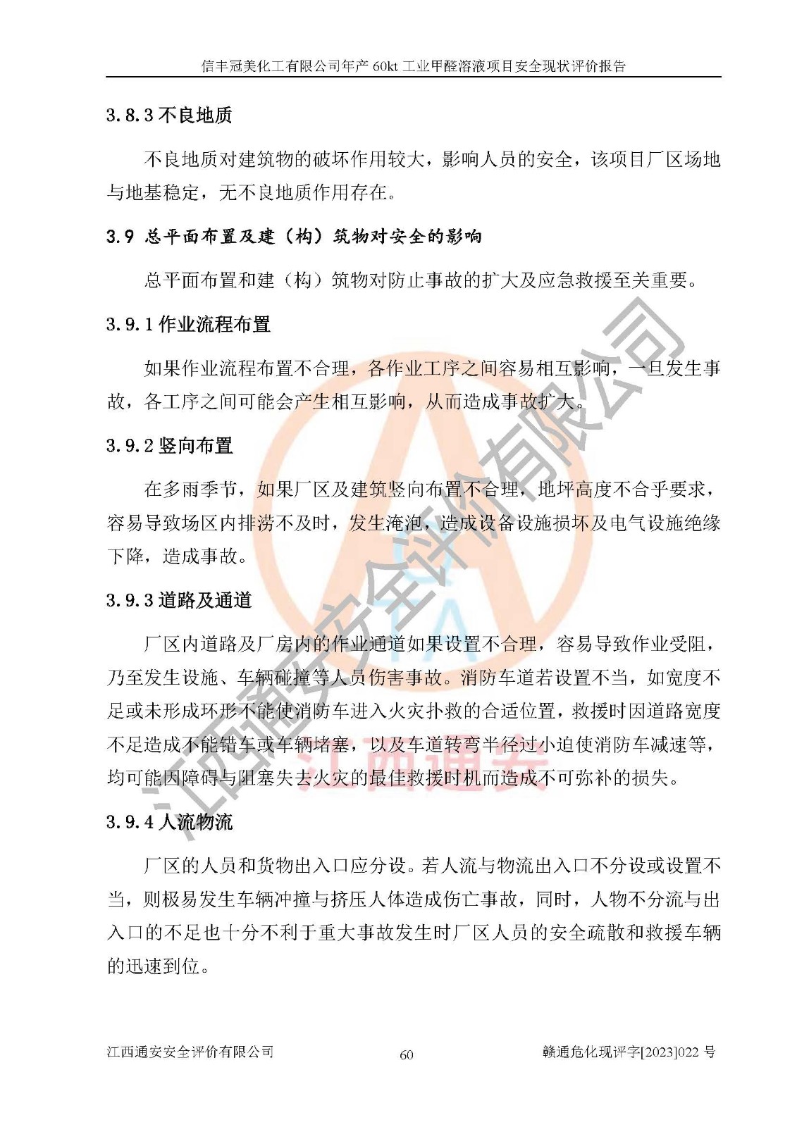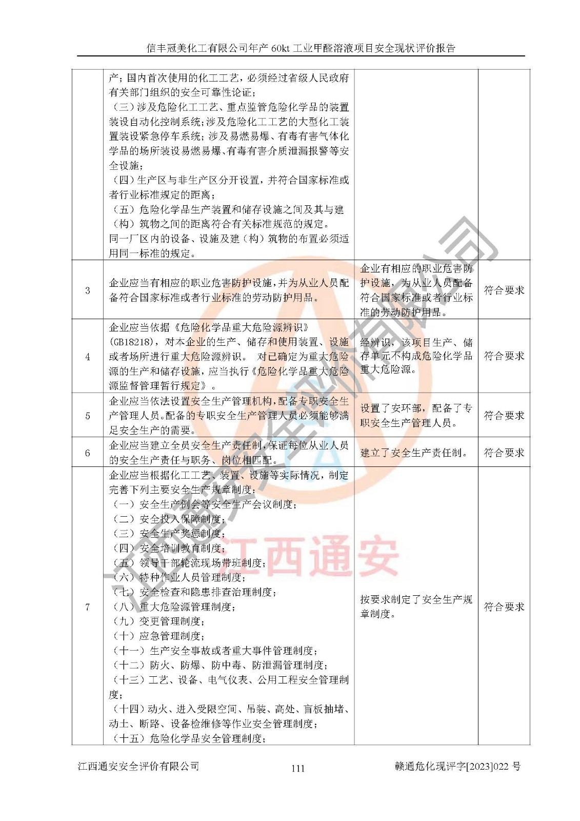 信豐冠美化工有限公司位于江西省贛州市信豐縣工業(yè)園偉邦路,法定**人為汪學斌,成立于2007年04月09日,注冊資本壹仟萬元整,營業(yè)執(zhí)照經營范圍為工業(yè)甲醛、尿醛樹脂膠生產、銷售(憑許可證經營)等。 信豐冠美化工有限公司2020年07月23日取得了《安全生產許可證》,許可證編號:(贛)WH安許證字[2008]0500號,許可范圍為工業(yè)甲醛溶液(60kt/a),**期2020年08月06日至2023年08月05日。該公司2022年8月30日取得了安全生產標準化證書,證書編號:贛AQBWⅡ[2022]015,**期至2025年8月。該公司現(xiàn)有員工23人,其中專職安全管理人員1人。 根據《江西省危險化學品產業(yè)轉移項目和化工園區(qū)安全風險防控專項整治實施方案》(贛安辦字〔2021〕86 號)要求,為提升生產本質安全,減少重大危險源,信豐冠美化工有限公司對貯罐區(qū)進行了調整,停用1臺甲醇儲罐和1臺甲醇計量罐,2臺甲醇儲罐變更為2臺甲醛儲罐。信豐冠美化工有限公司委托山東富海石化工程有限公司對60kt/a工業(yè)甲醛項目出具了在役化工裝置安全設計診斷及整改設計文本和圖紙(2022年12月),取得了贛州市應急管理局出具的審查意見,并對貯罐區(qū)進行了整改。貯罐區(qū)整改完成后,經辨識,信豐冠美化工有限公司生產、儲存單元不構成危險化學品重大危險源。信豐冠美化工有限公司向信豐縣應急管理局申請了重大危險源核銷,2023年2月2日取得了核銷登記表,核銷編號為HX贛360722[2023]001。 信豐冠美化工有限公司年產60kt工業(yè)甲醛溶液項目生產過程中涉及的原輔材料為甲醇和銀觸媒(催化劑),氮封需要使用氮氣,副反應產物為氫氣,產品為甲醛溶液。根據《危險化學品目錄》,該項目涉及的甲醇、氮氣[壓縮的]、氫氣、甲醛和甲醛溶液屬于危險化學品。經辨識,甲醇和氫氣屬于重點監(jiān)管的危險化學品,甲醛屬于高毒物品,甲醇屬于特別管控的危險化學品,不涉及監(jiān)控化學品、易制毒化學品、易制爆危險化學品和劇毒化學品,生產、儲存單元不構成危險化學品重大危險源,涉及的氧化反應屬于重點監(jiān)管的危險化工工藝。根據《安全生產許可證條例》、《危險化學品安全管理條例》和《危險化學品生產企業(yè)安全生產許可實施辦法》的相關規(guī)定,該項目甲醛溶液屬于危險化學品,需要辦理危險化學品安全生產許可證。根據生產工藝特點及物料的理化特性可知,該項目生產過程中存在火災與爆炸、中毒與窒息、觸電、機械傷害等危險有害因素。 該公司自2020年07月23日取得安全生產許可證以來,生產運行正常,未發(fā)生一般及以上生產安全事故。 |